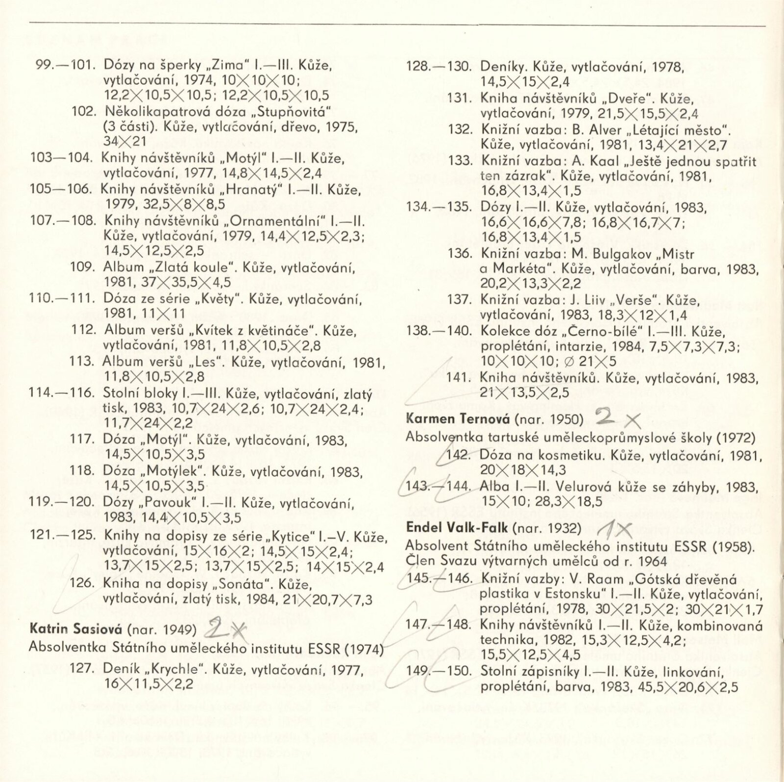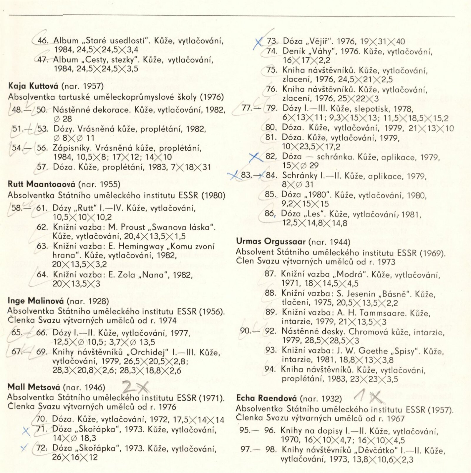 Umělecké zpracování kůže v Tarttu (ESSR). Užité umění: Dům umění města Brna 23. 11. 1984 – 1. 1. 1985 / Text: Lea Mechilaneová. – Brno: DUmB, 1984. – 16 s., obr., DU 787. – MZK; MG; MMB