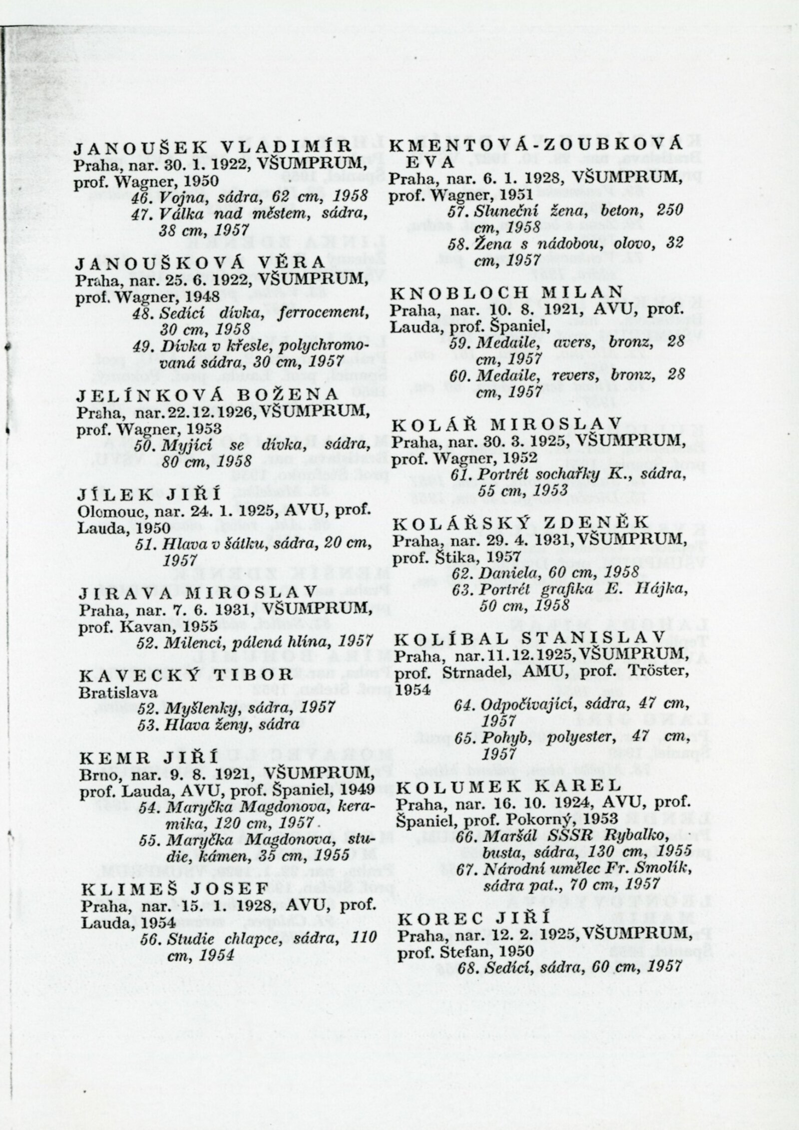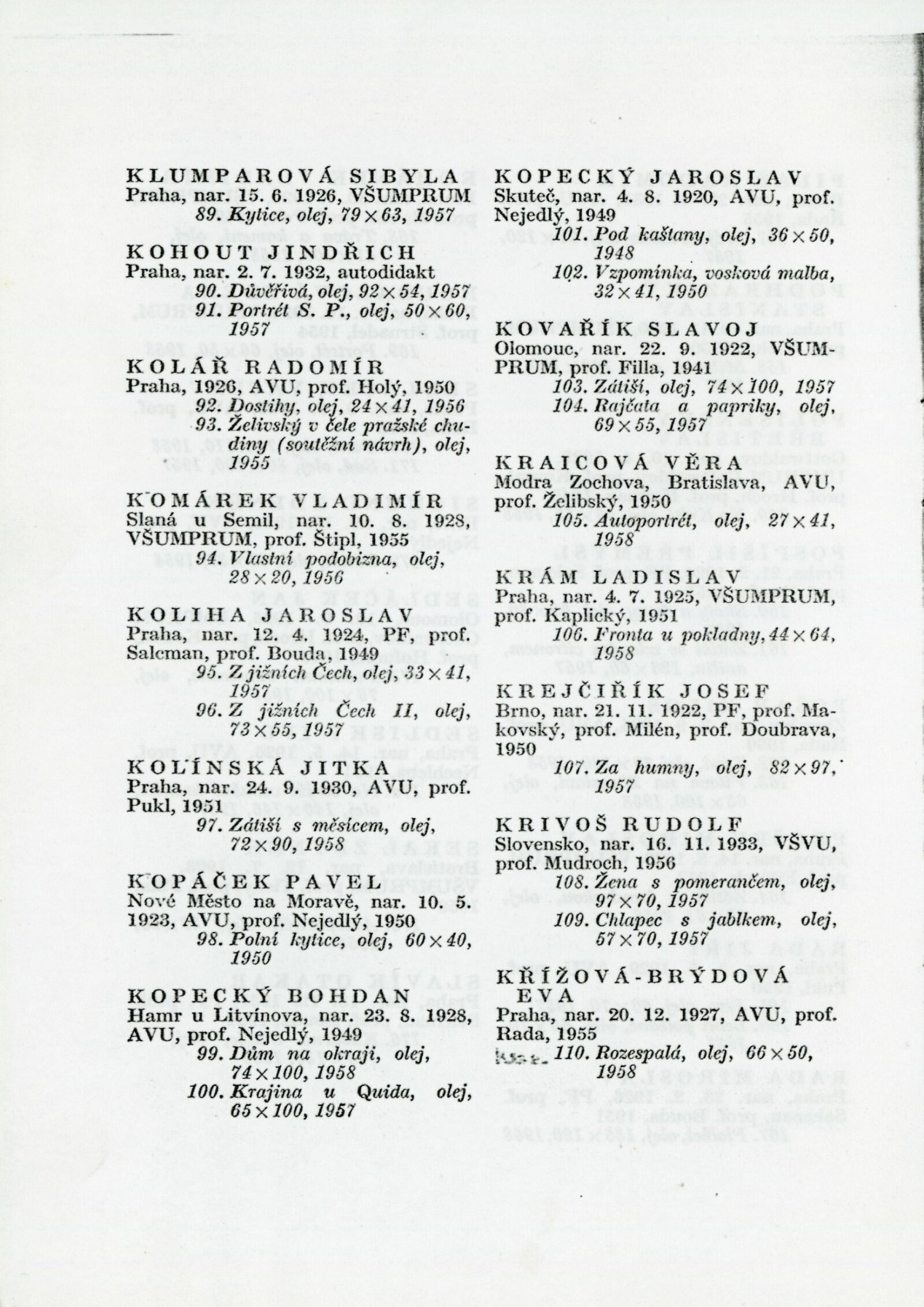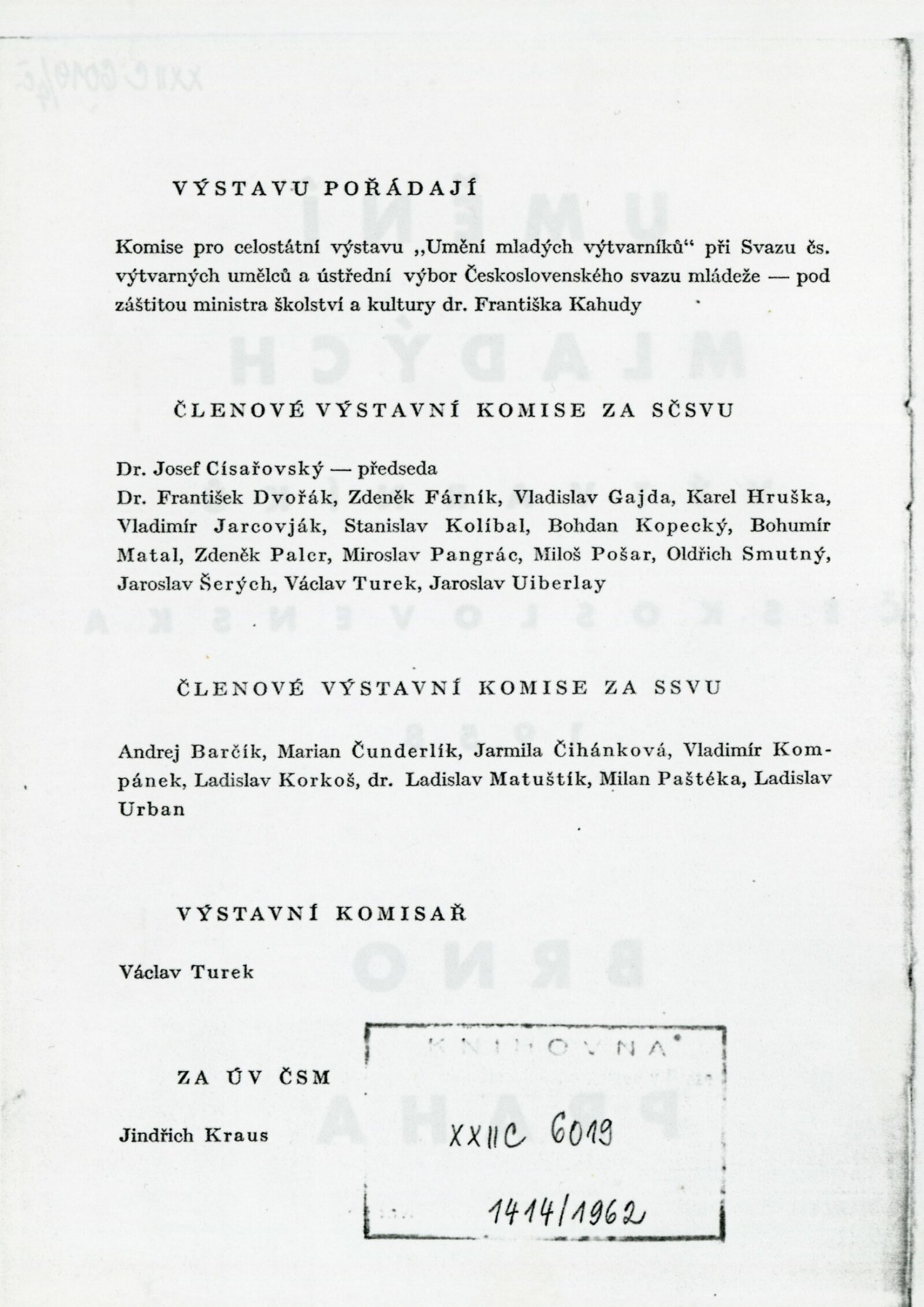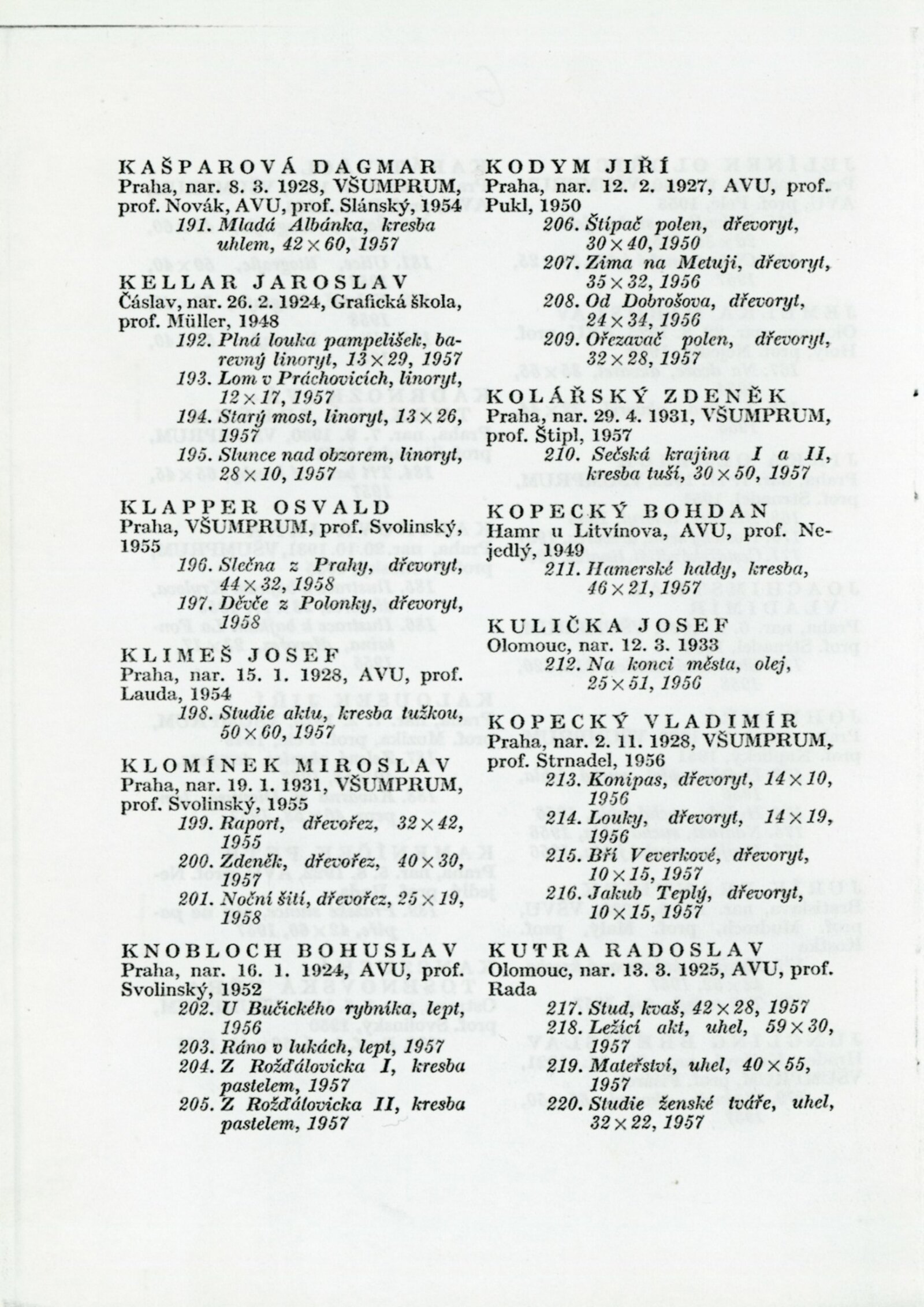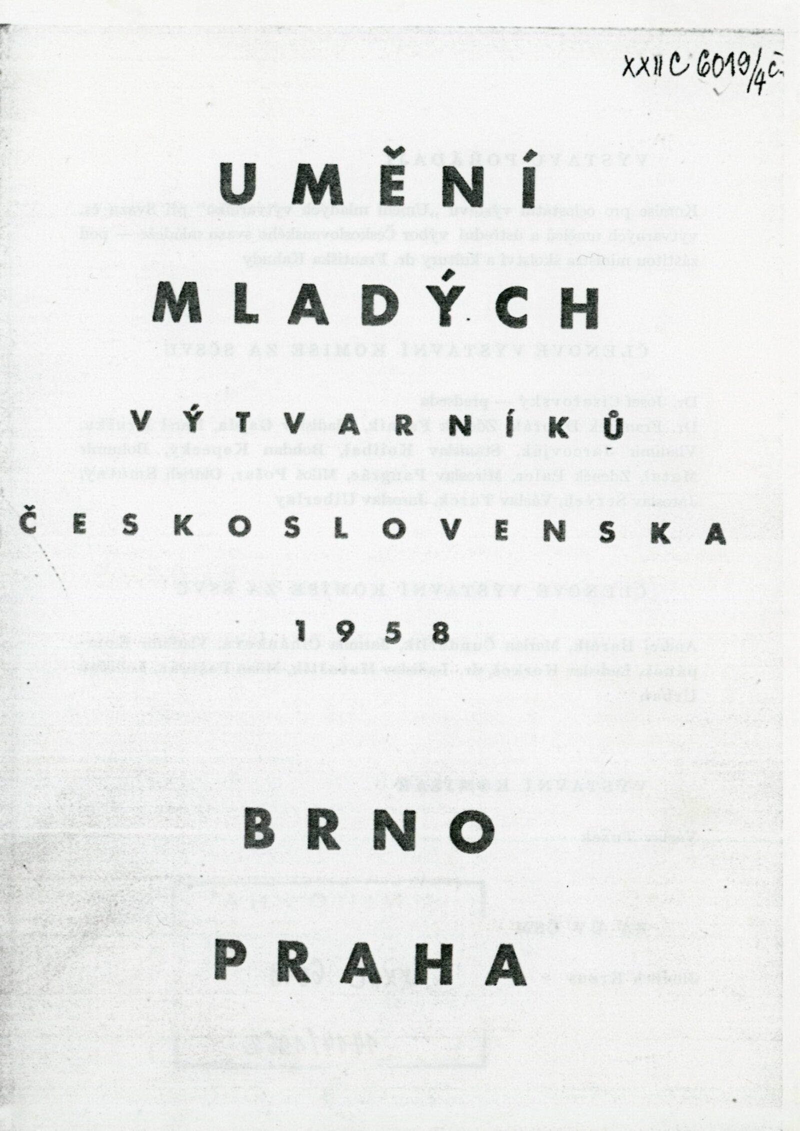 Umění mladých výtvarníků Československa. Obrazy a plastiky: Dům umění / Dům pánů z Poděbrad, I. část Obrazy a plastiky: Dům umění, 18. 5. – 29. 6. 1958, II. část Kresby a grafika: Dům pánů z Poděbrad, 25. 5. – 29. 6. 1958 / Společný katalog pro Brno a Prahu. Umění mladých výtvarníků Československa, 1958 / Text: Josef Císařovský. – Praha: Ústřední výbor ČSM, 1958. – 42 s., DU 310, DPK 6. – MZK; UPM