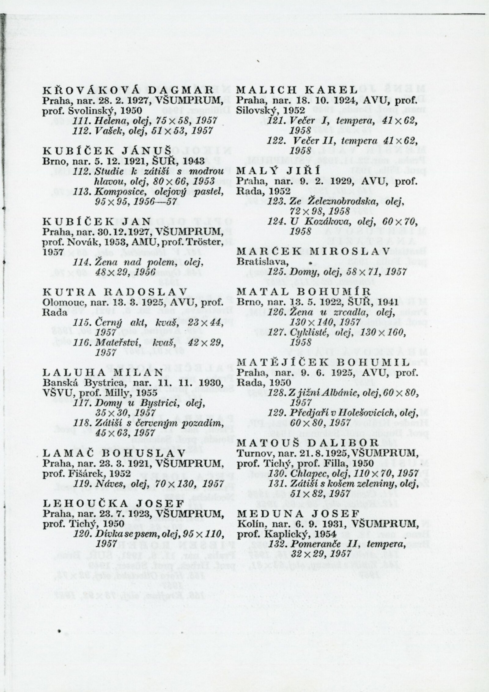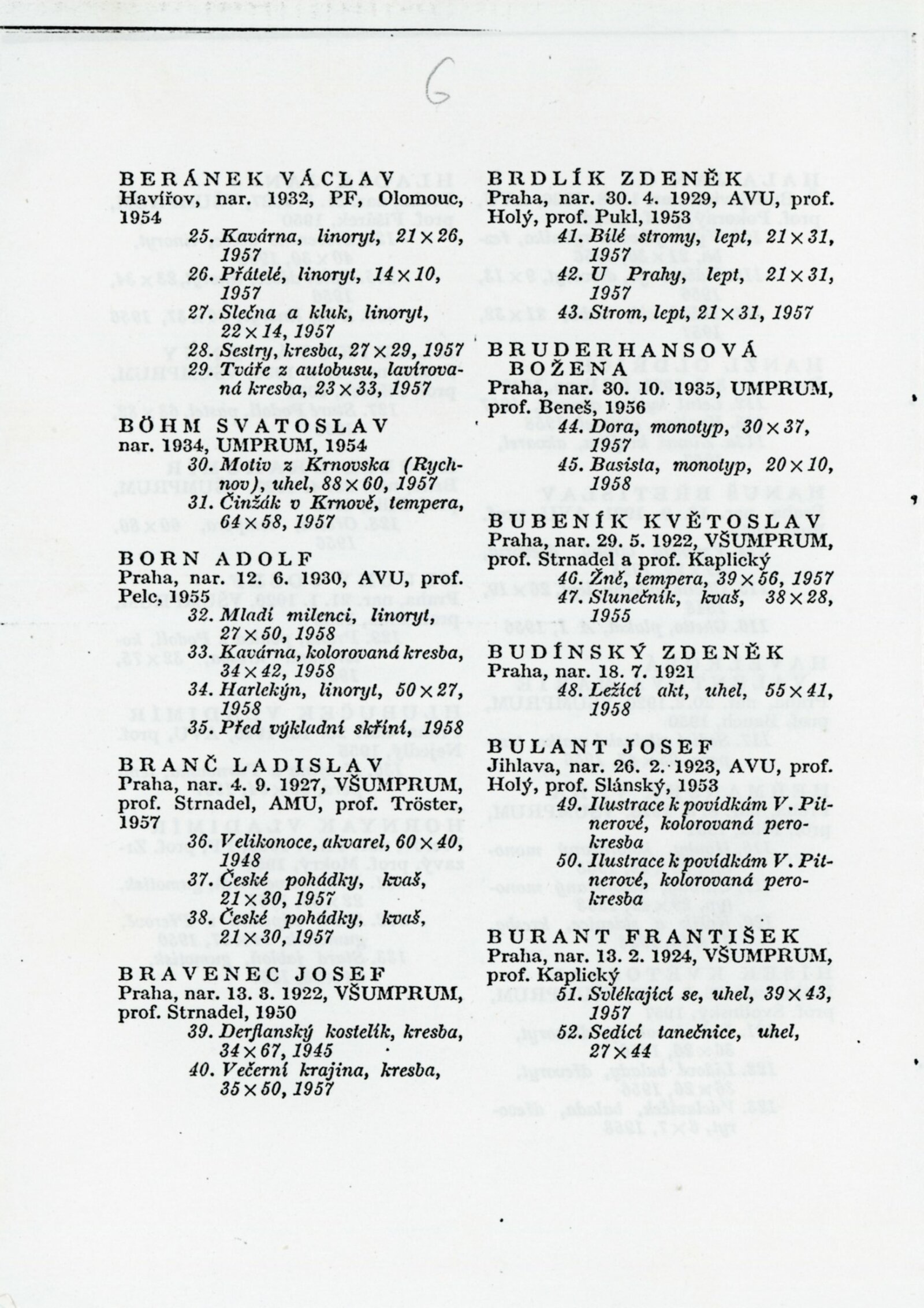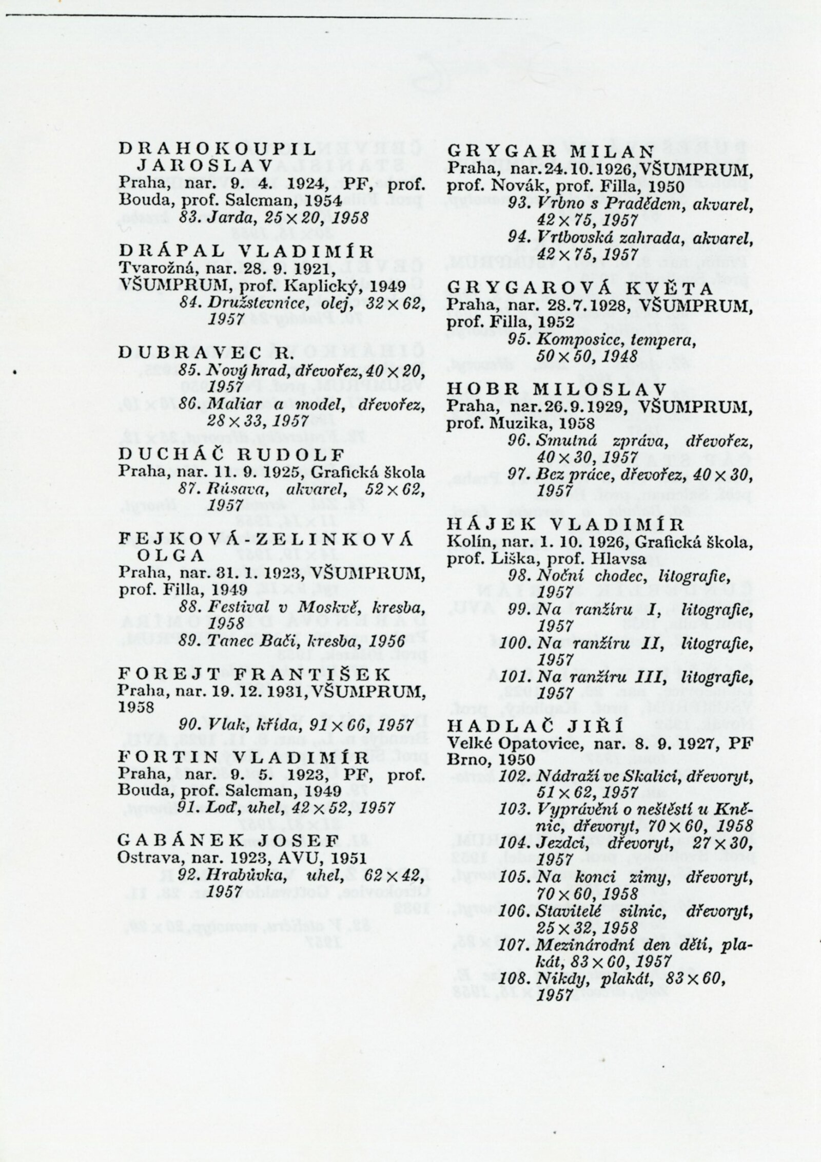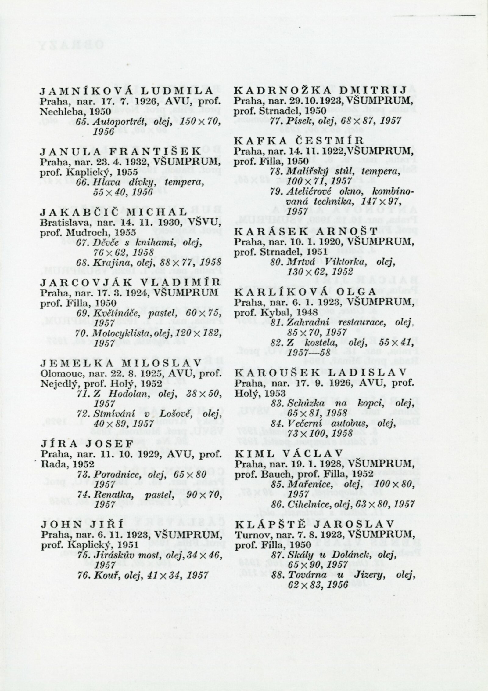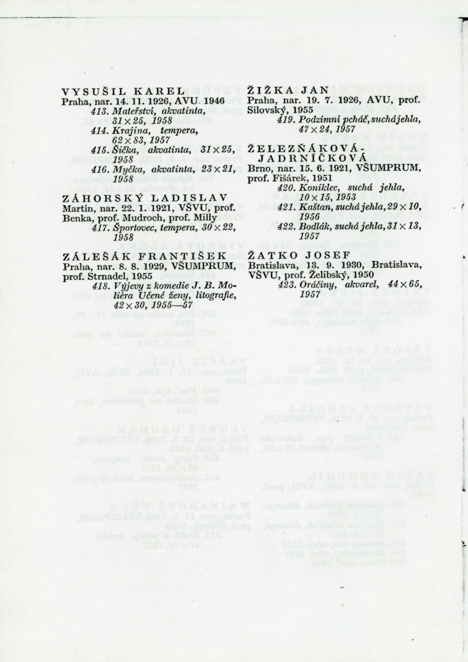 Umění mladých výtvarníků Československa. Obrazy a plastiky: Dům umění / Dům pánů z Poděbrad, I. část Obrazy a plastiky: Dům umění, 18. 5. – 29. 6. 1958, II. část Kresby a grafika: Dům pánů z Poděbrad, 25. 5. – 29. 6. 1958 / Společný katalog pro Brno a Prahu. Umění mladých výtvarníků Československa, 1958 / Text: Josef Císařovský. – Praha: Ústřední výbor ČSM, 1958. – 42 s., DU 310, DPK 6. – MZK; UPM