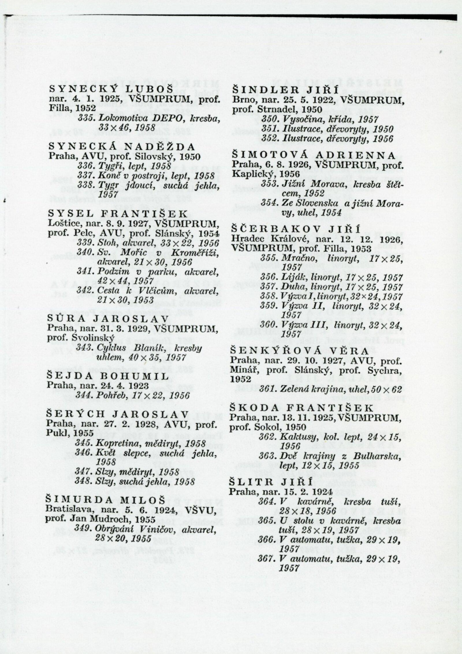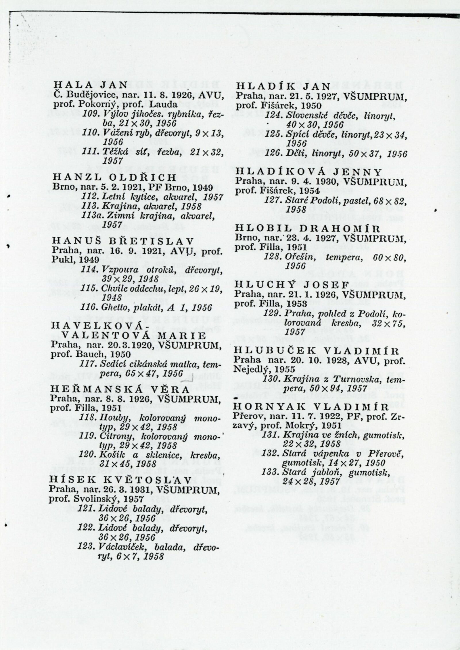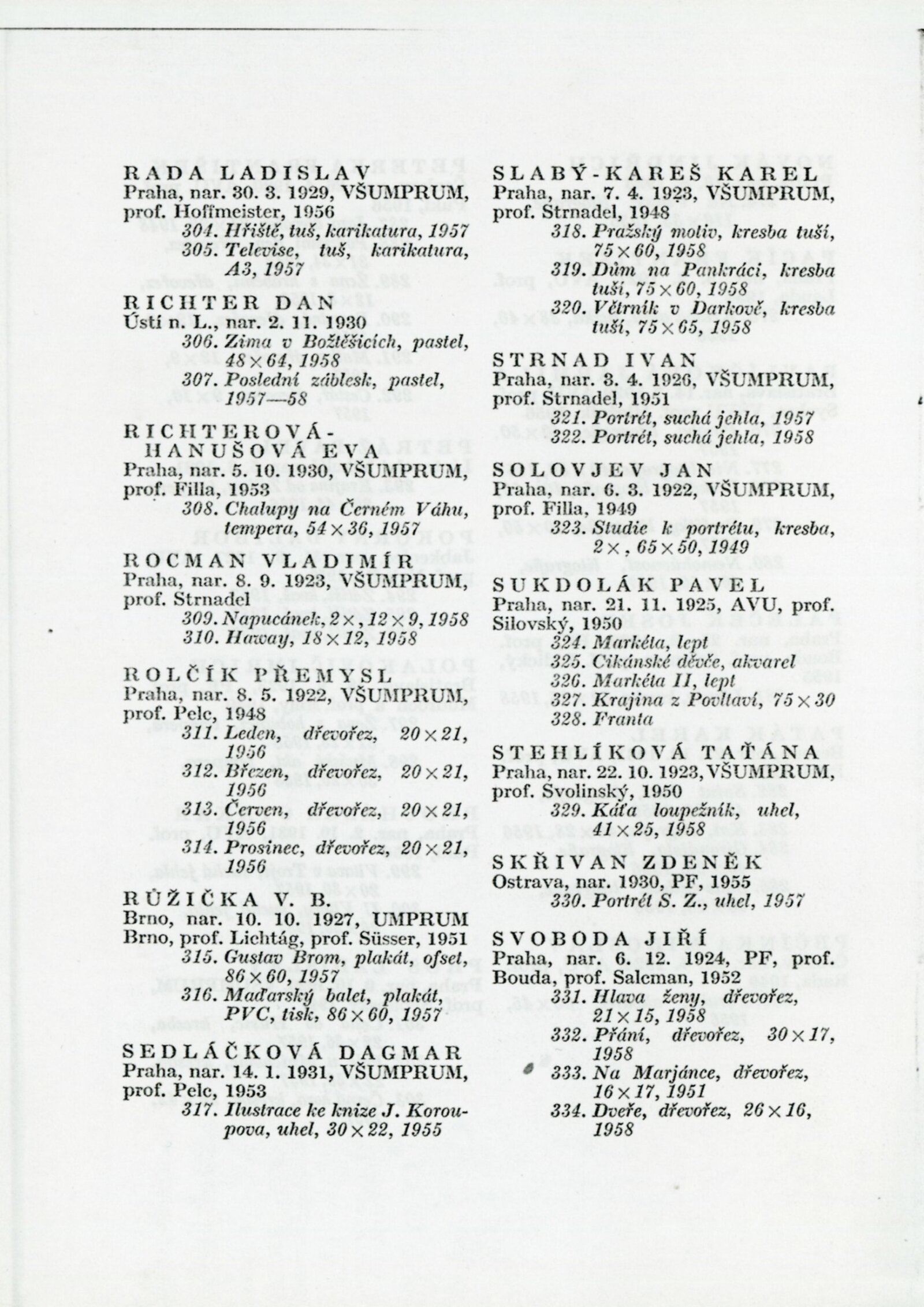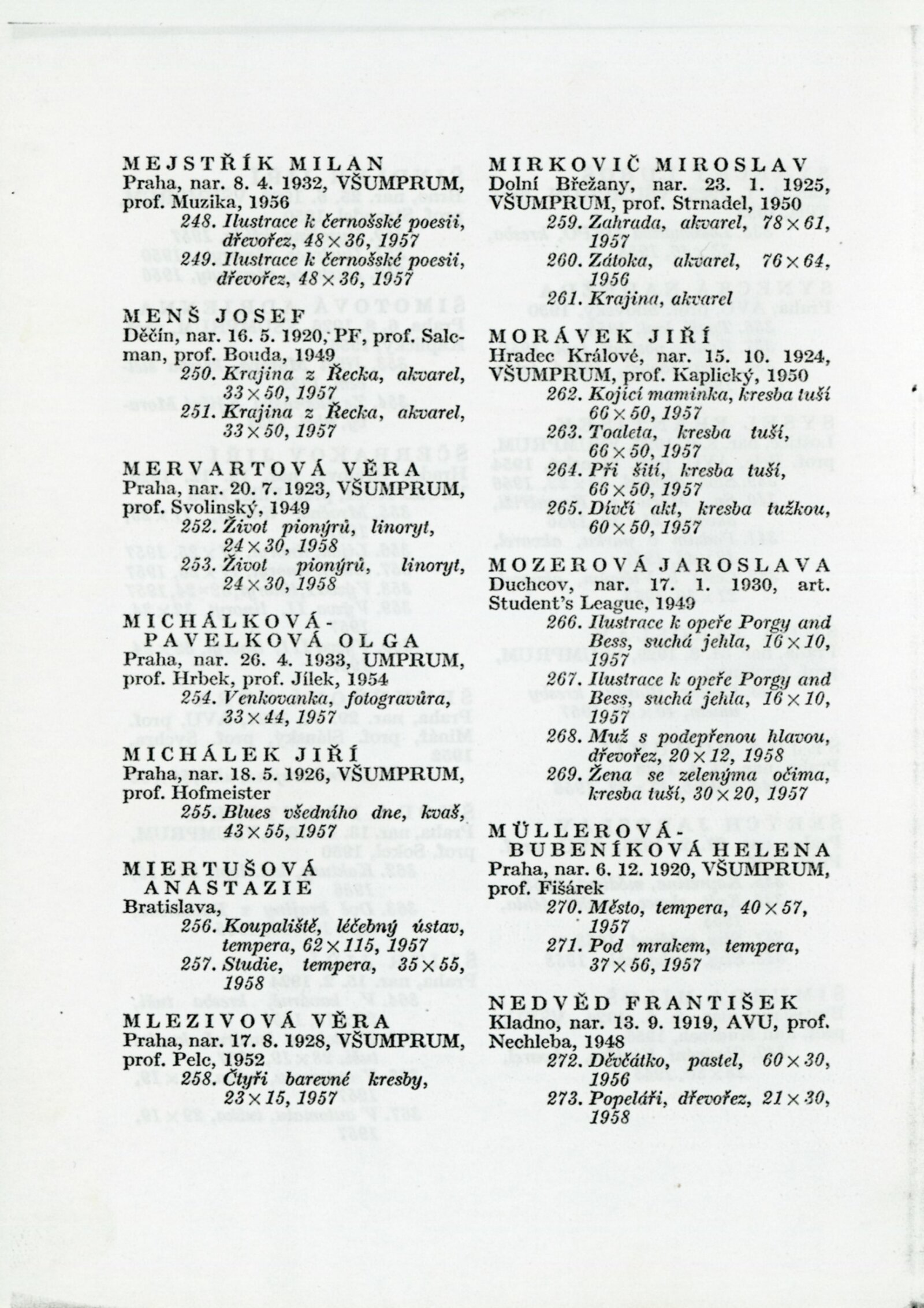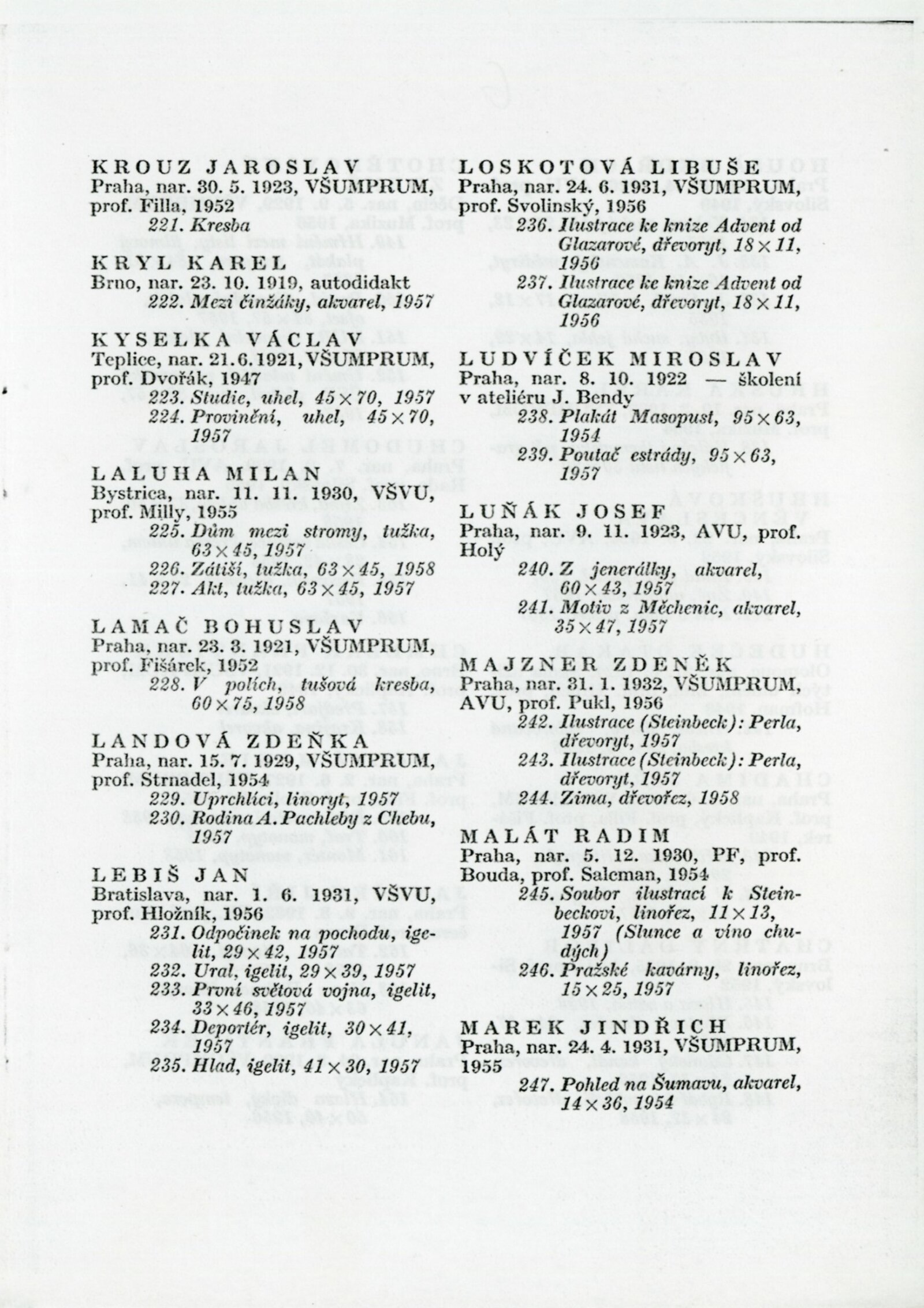 Umění mladých výtvarníků Československa. Obrazy a plastiky: Dům umění / Dům pánů z Poděbrad, I. část Obrazy a plastiky: Dům umění, 18. 5. – 29. 6. 1958, II. část Kresby a grafika: Dům pánů z Poděbrad, 25. 5. – 29. 6. 1958 / Společný katalog pro Brno a Prahu. Umění mladých výtvarníků Československa, 1958 / Text: Josef Císařovský. – Praha: Ústřední výbor ČSM, 1958. – 42 s., DU 310, DPK 6. – MZK; UPM