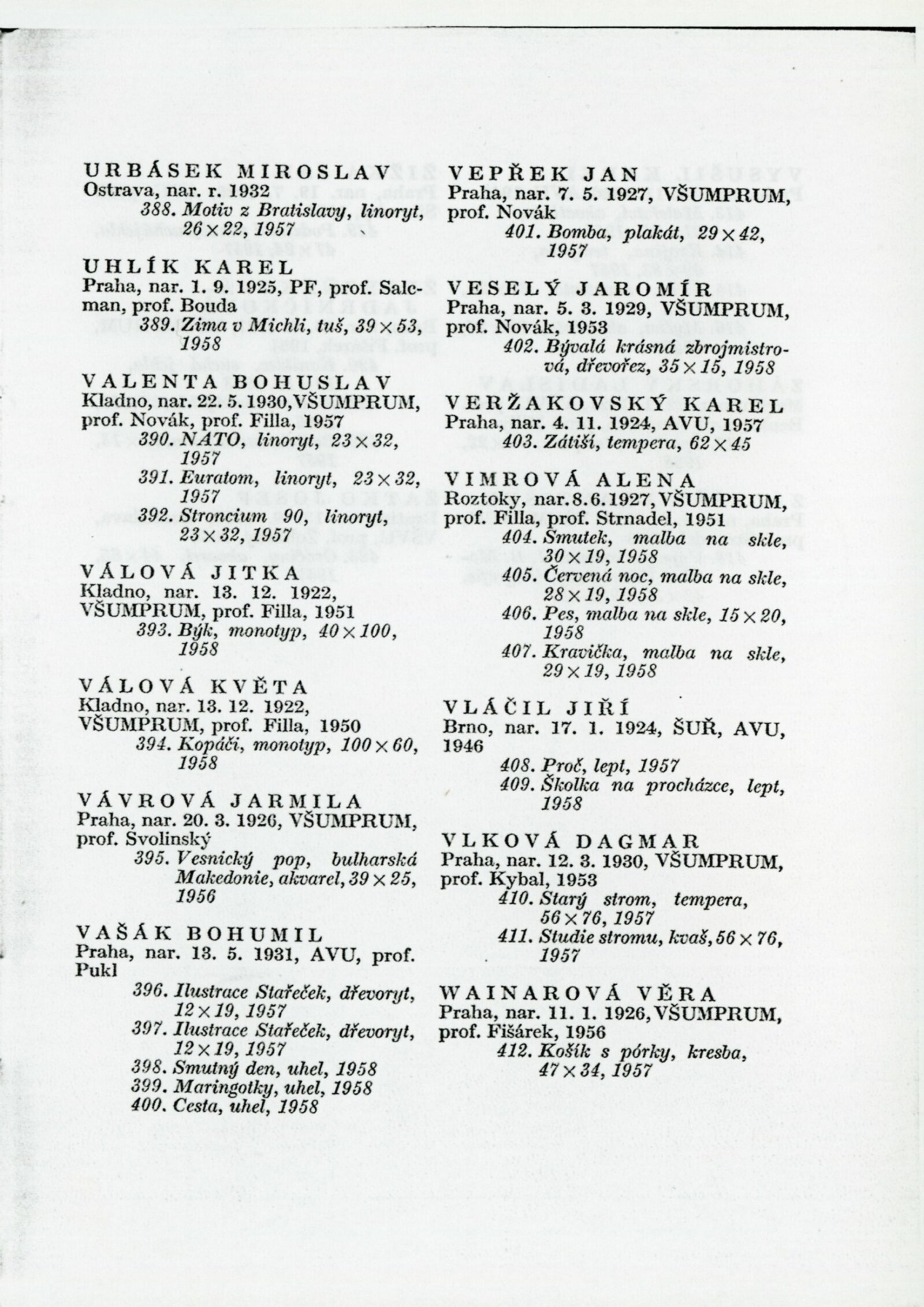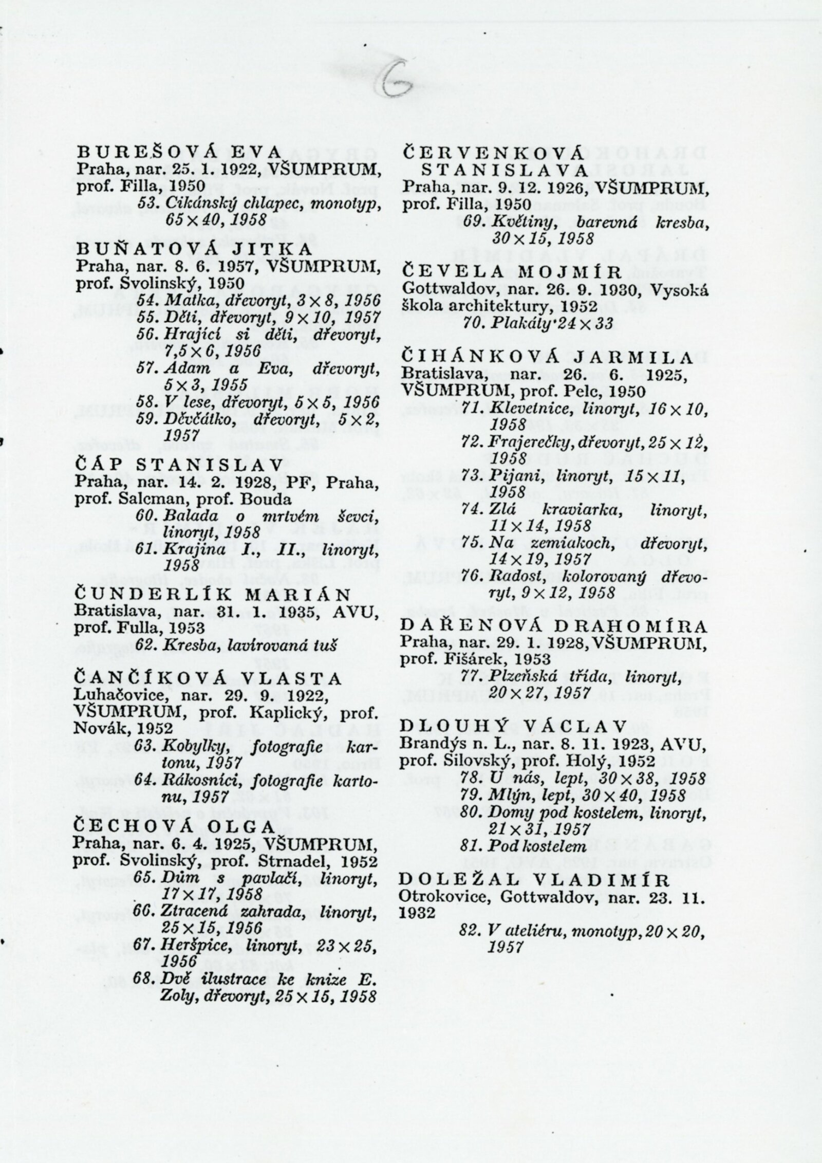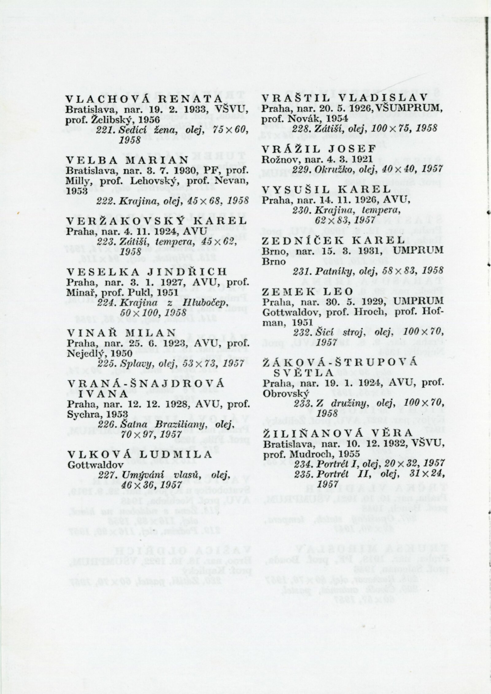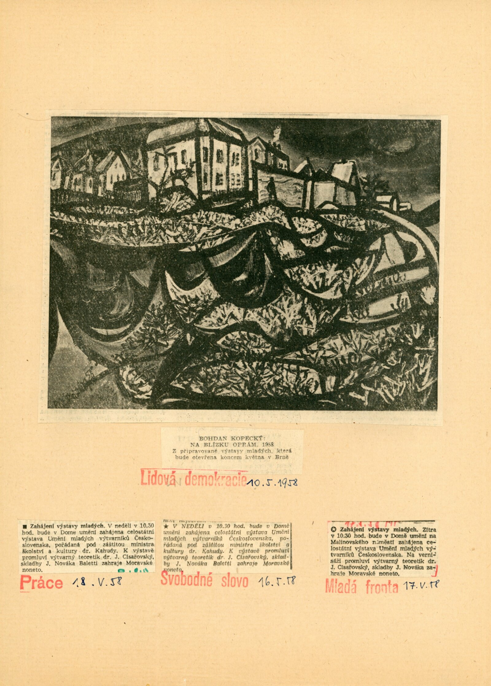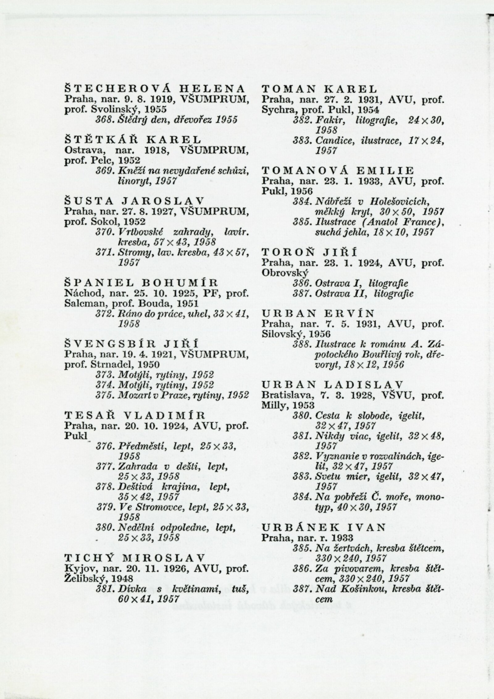 Umění mladých výtvarníků Československa. Obrazy a plastiky: Dům umění / Dům pánů z Poděbrad, I. část Obrazy a plastiky: Dům umění, 18. 5. – 29. 6. 1958, II. část Kresby a grafika: Dům pánů z Poděbrad, 25. 5. – 29. 6. 1958 / Společný katalog pro Brno a Prahu. Umění mladých výtvarníků Československa, 1958 / Text: Josef Císařovský. – Praha: Ústřední výbor ČSM, 1958. – 42 s., DU 310, DPK 6. – MZK; UPM
