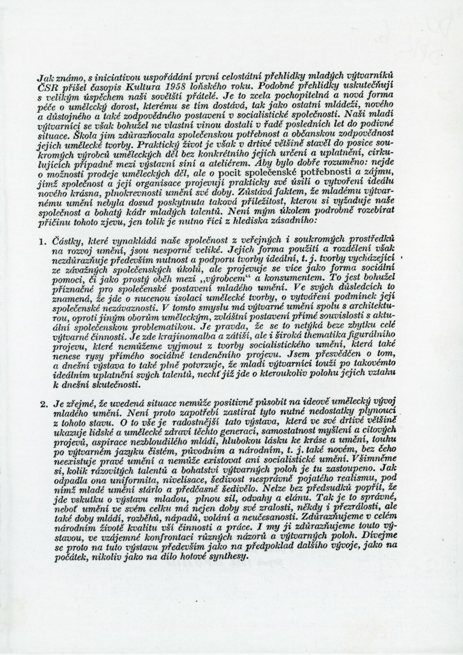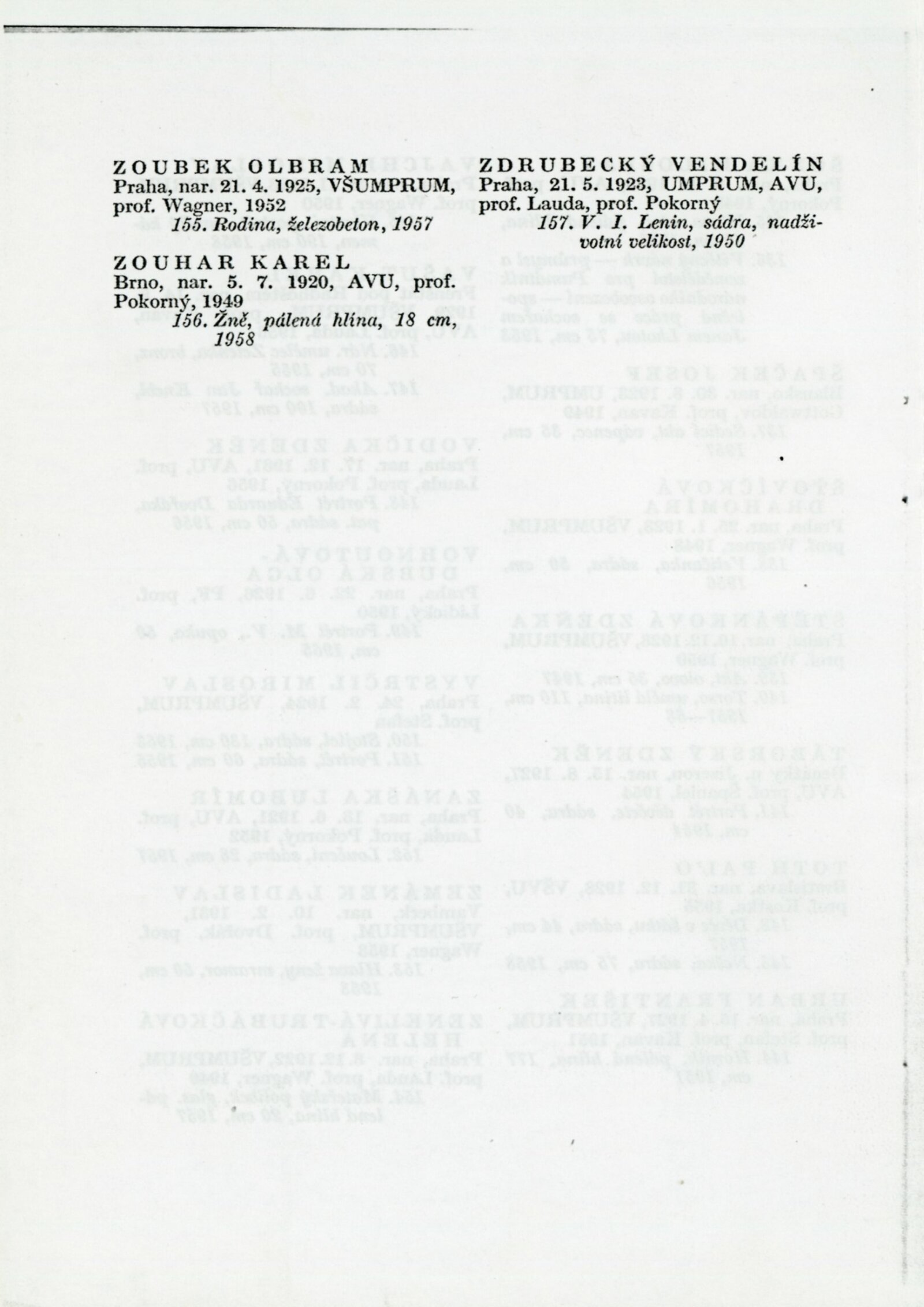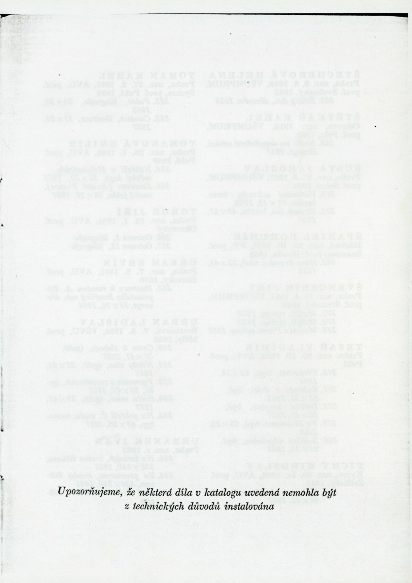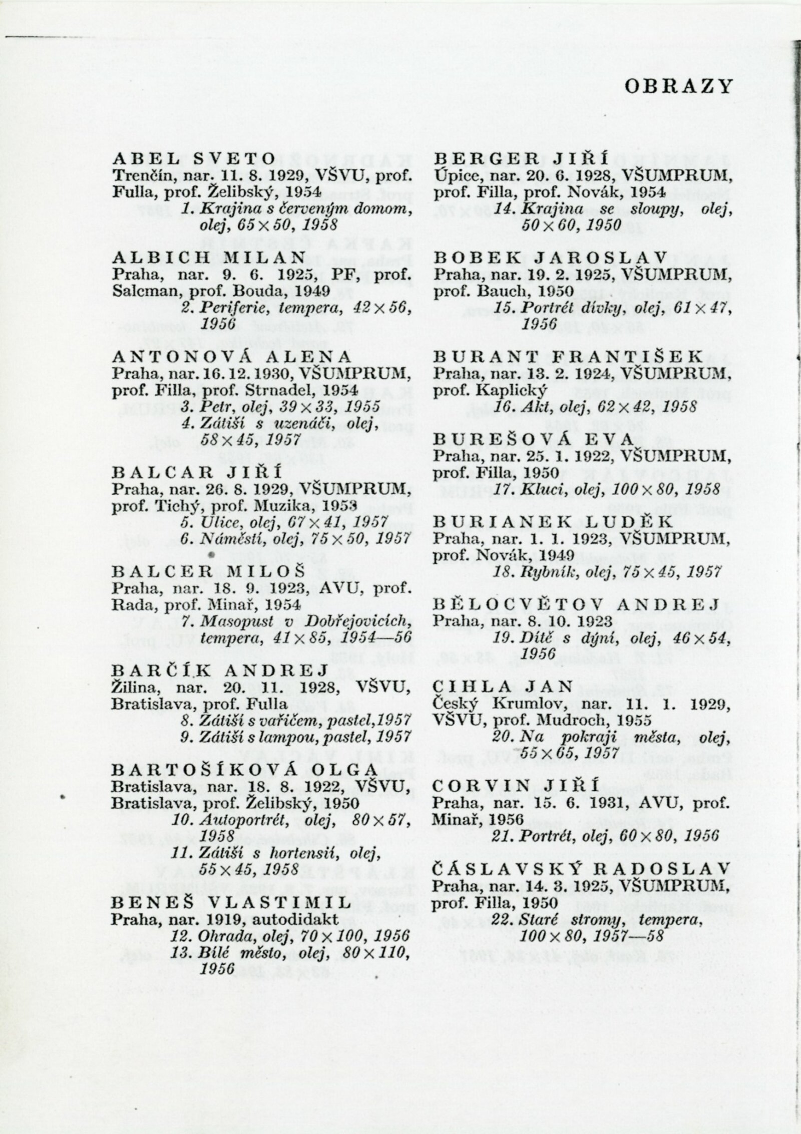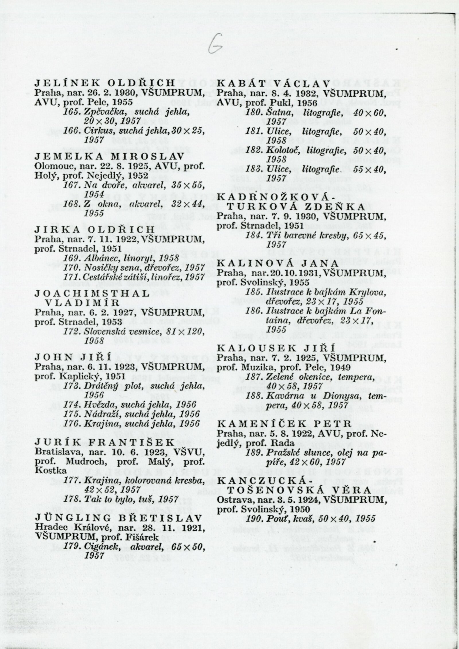 Umění mladých výtvarníků Československa. Obrazy a plastiky: Dům umění / Dům pánů z Poděbrad, I. část Obrazy a plastiky: Dům umění, 18. 5. – 29. 6. 1958, II. část Kresby a grafika: Dům pánů z Poděbrad, 25. 5. – 29. 6. 1958 / Společný katalog pro Brno a Prahu. Umění mladých výtvarníků Československa, 1958 / Text: Josef Císařovský. – Praha: Ústřední výbor ČSM, 1958. – 42 s., DU 310, DPK 6. – MZK; UPM