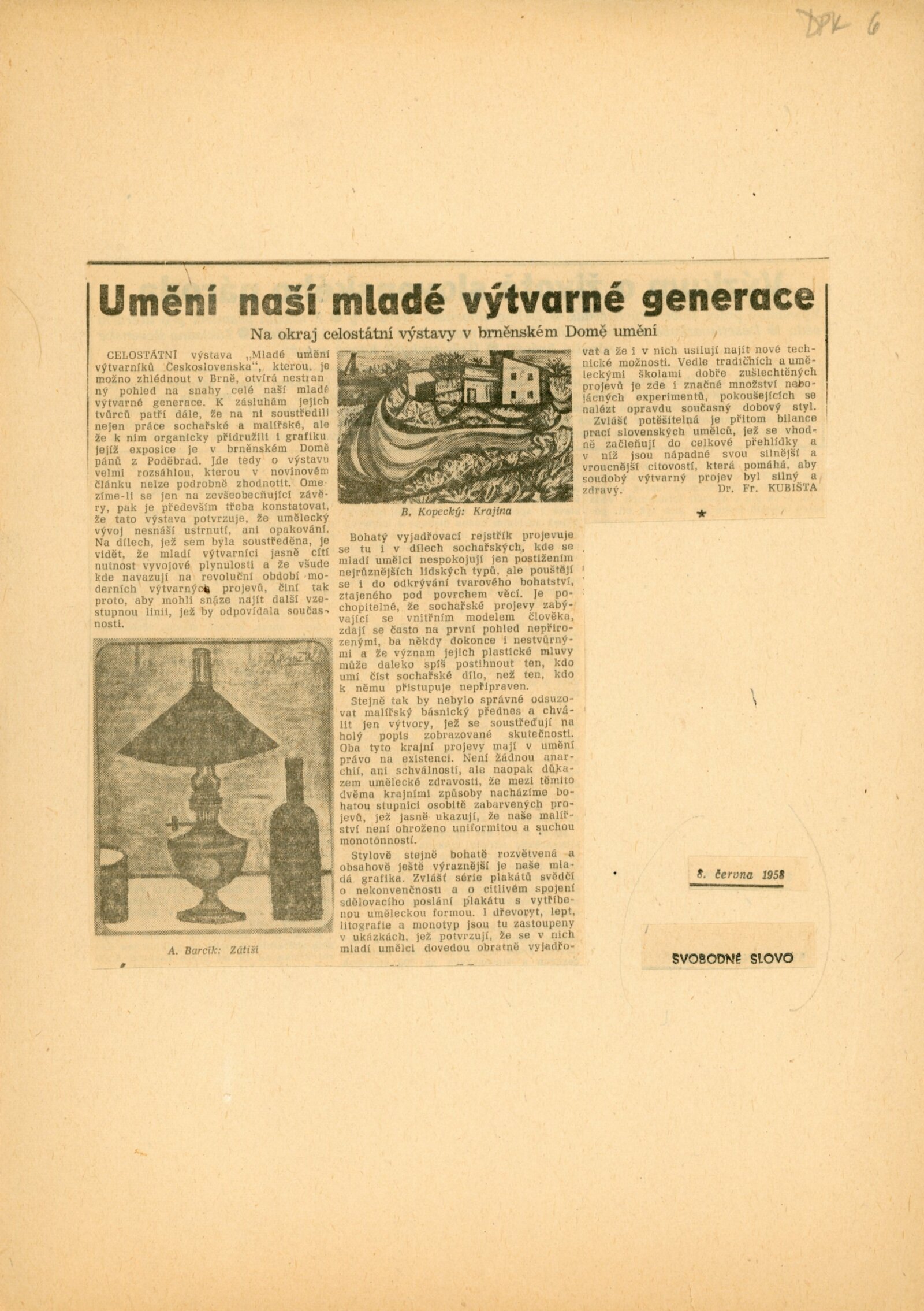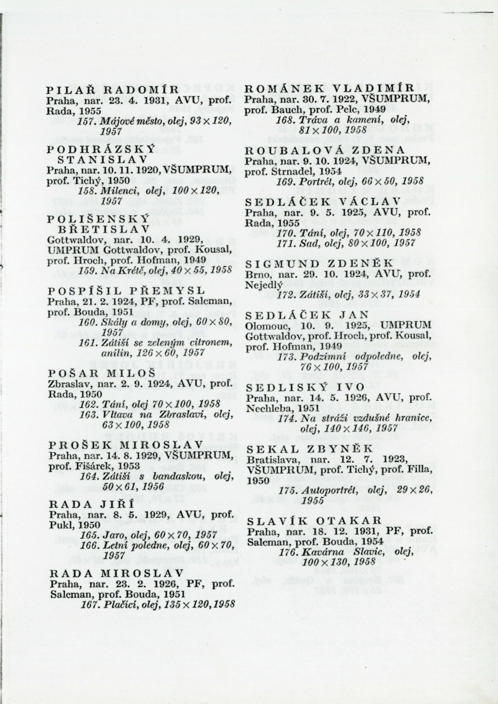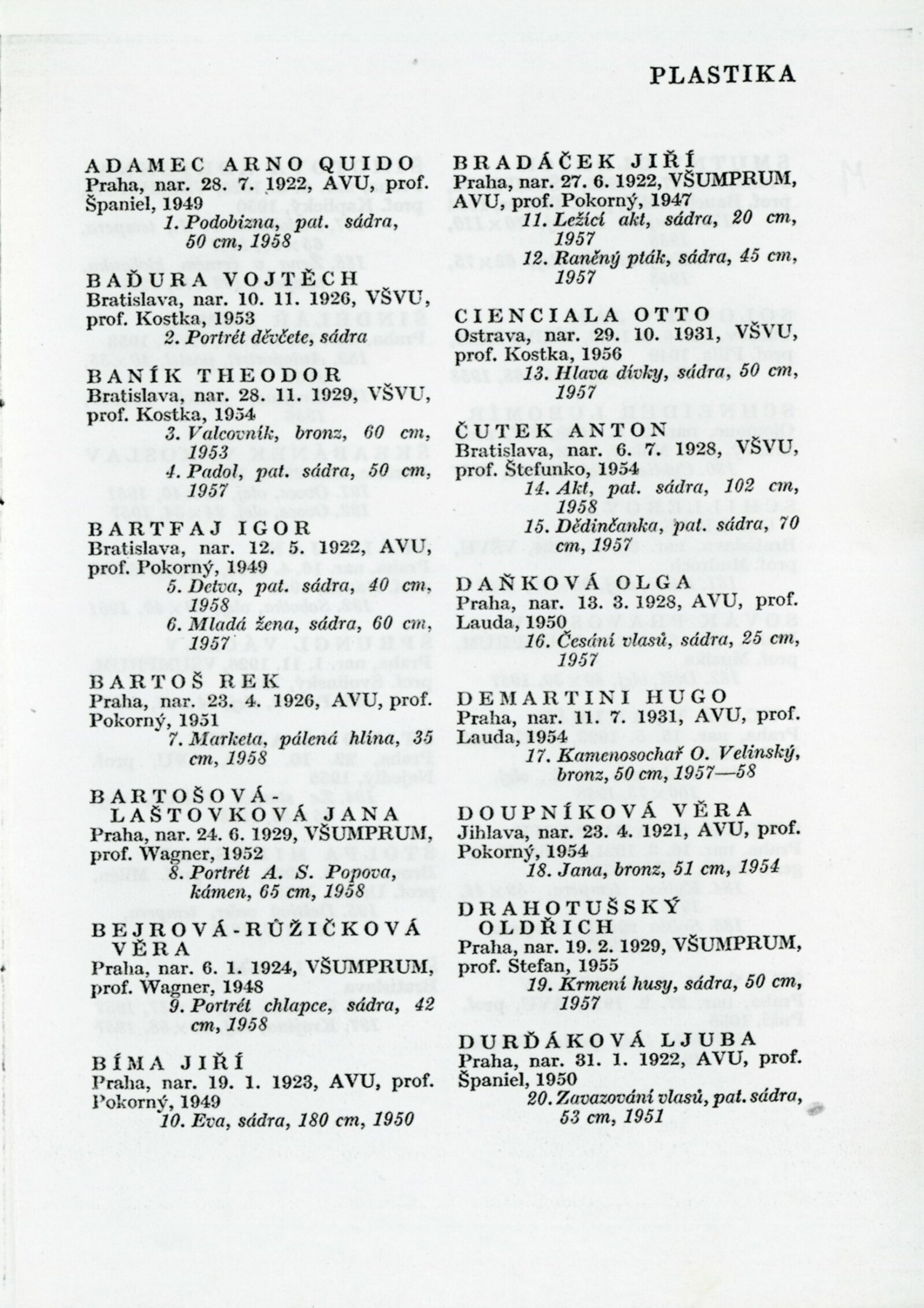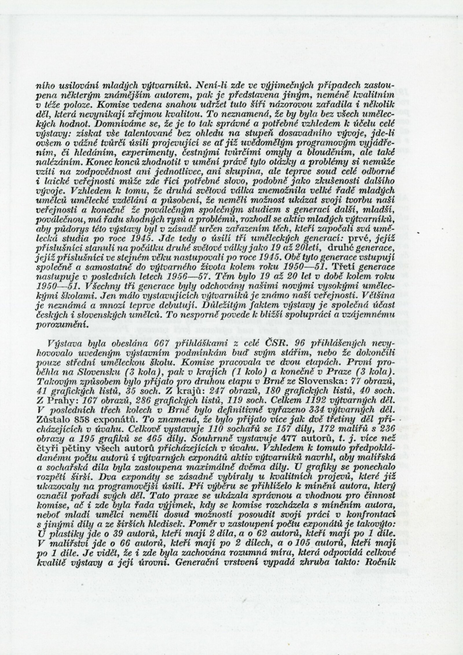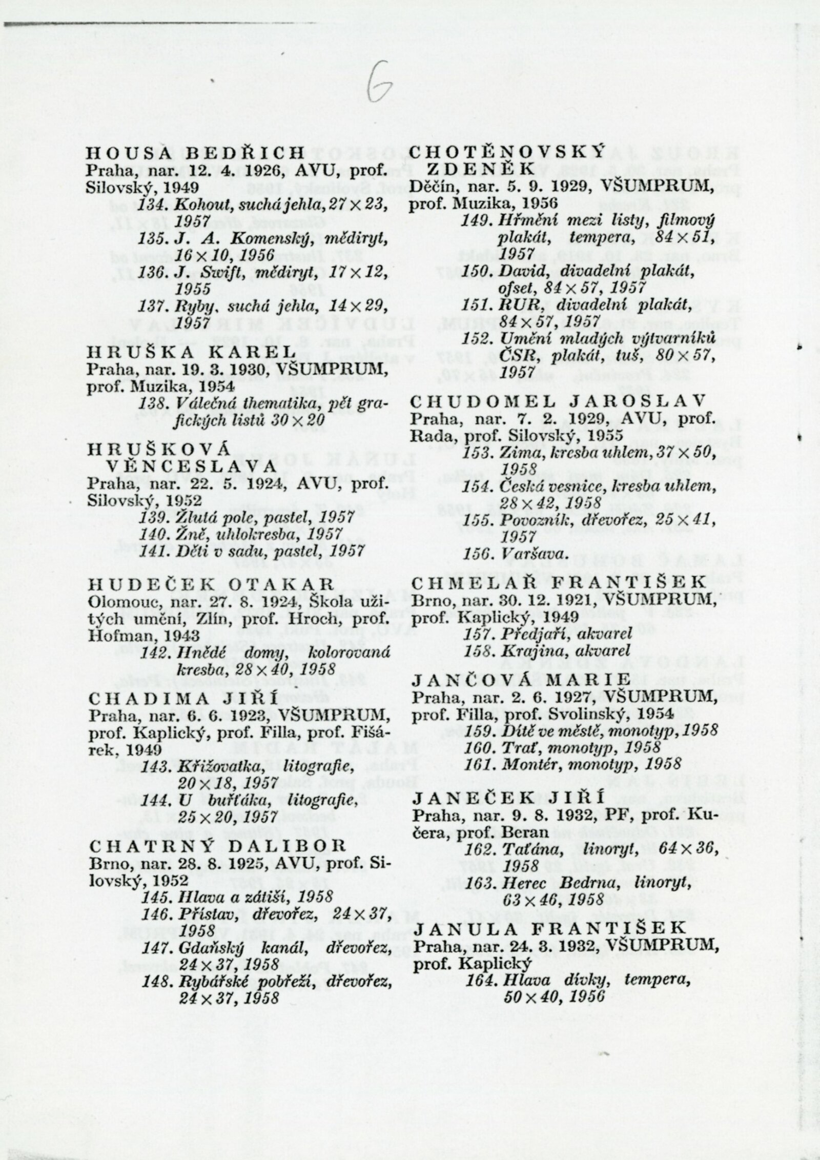 Umění mladých výtvarníků Československa. Obrazy a plastiky: Dům umění / Dům pánů z Poděbrad, I. část Obrazy a plastiky: Dům umění, 18. 5. – 29. 6. 1958, II. část Kresby a grafika: Dům pánů z Poděbrad, 25. 5. – 29. 6. 1958 / Společný katalog pro Brno a Prahu. Umění mladých výtvarníků Československa, 1958 / Text: Josef Císařovský. – Praha: Ústřední výbor ČSM, 1958. – 42 s., DU 310, DPK 6. – MZK; UPM