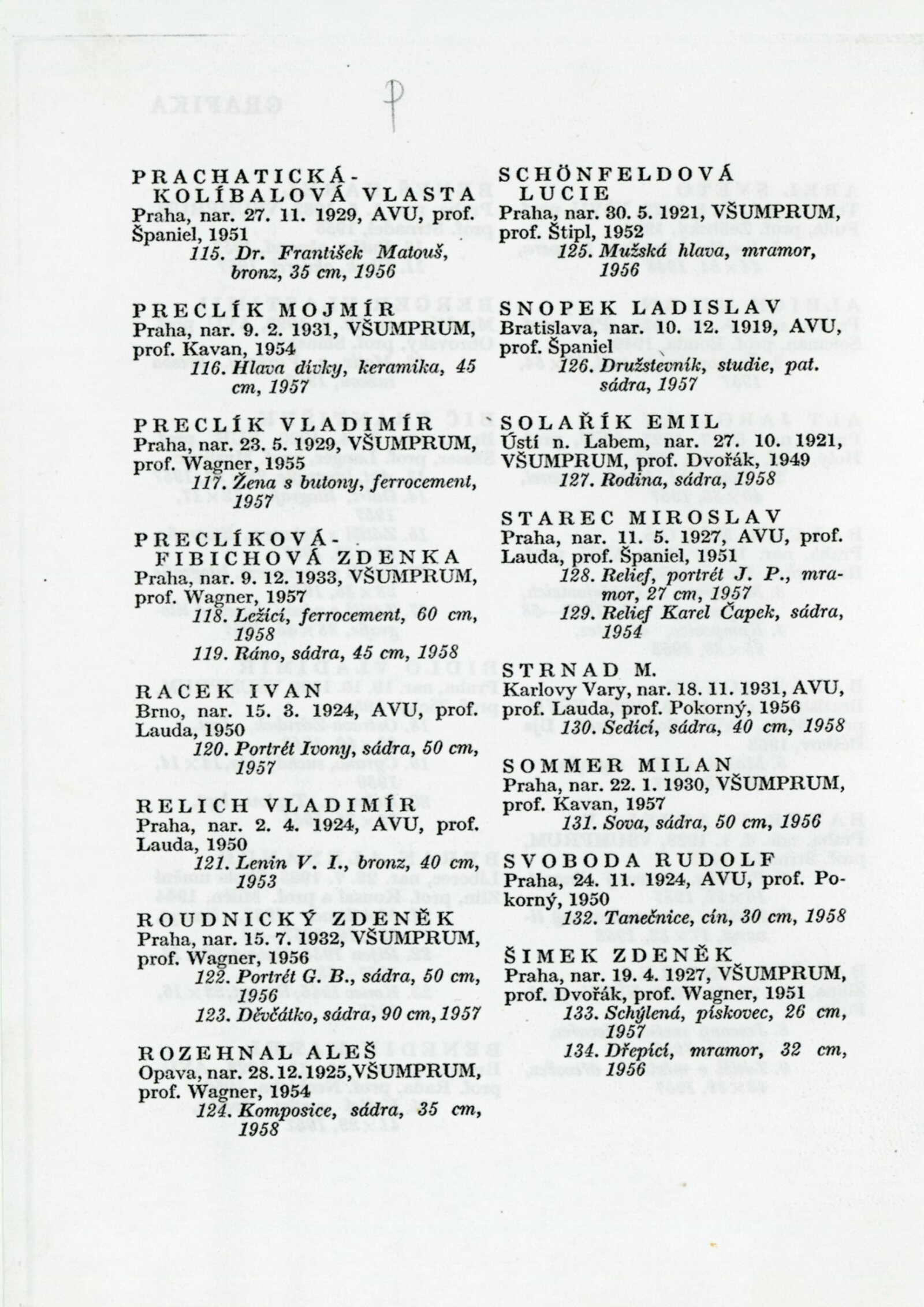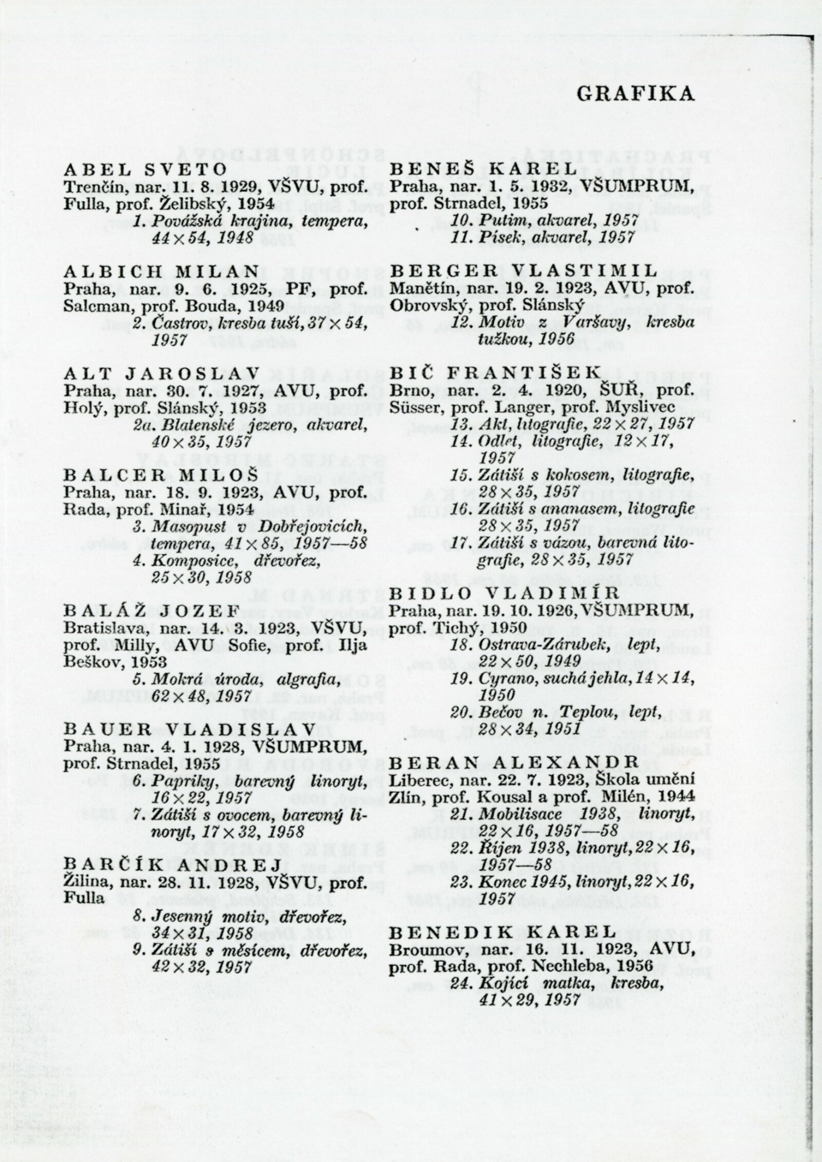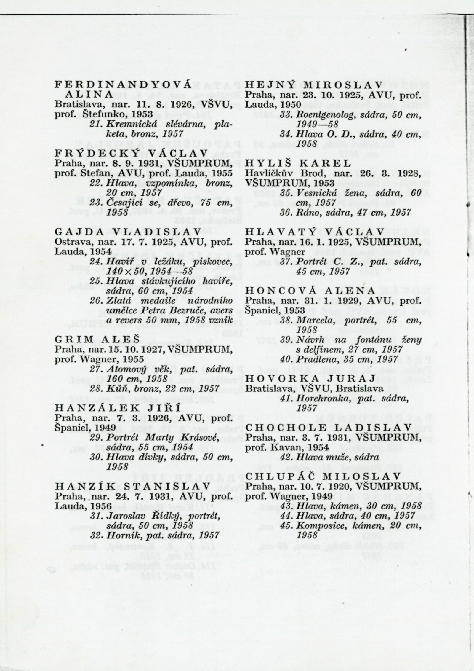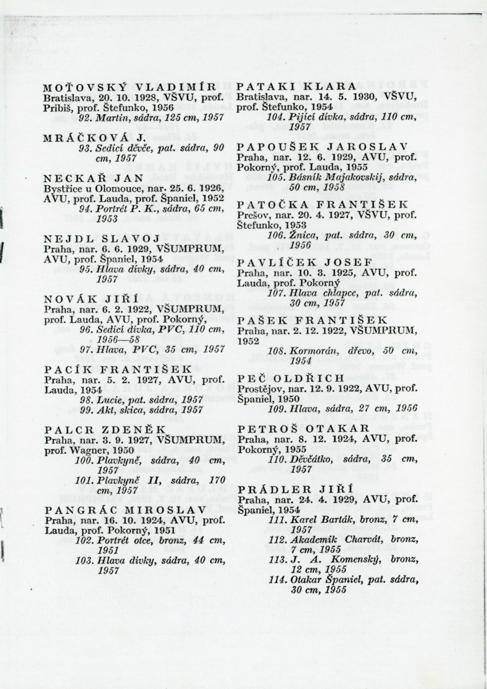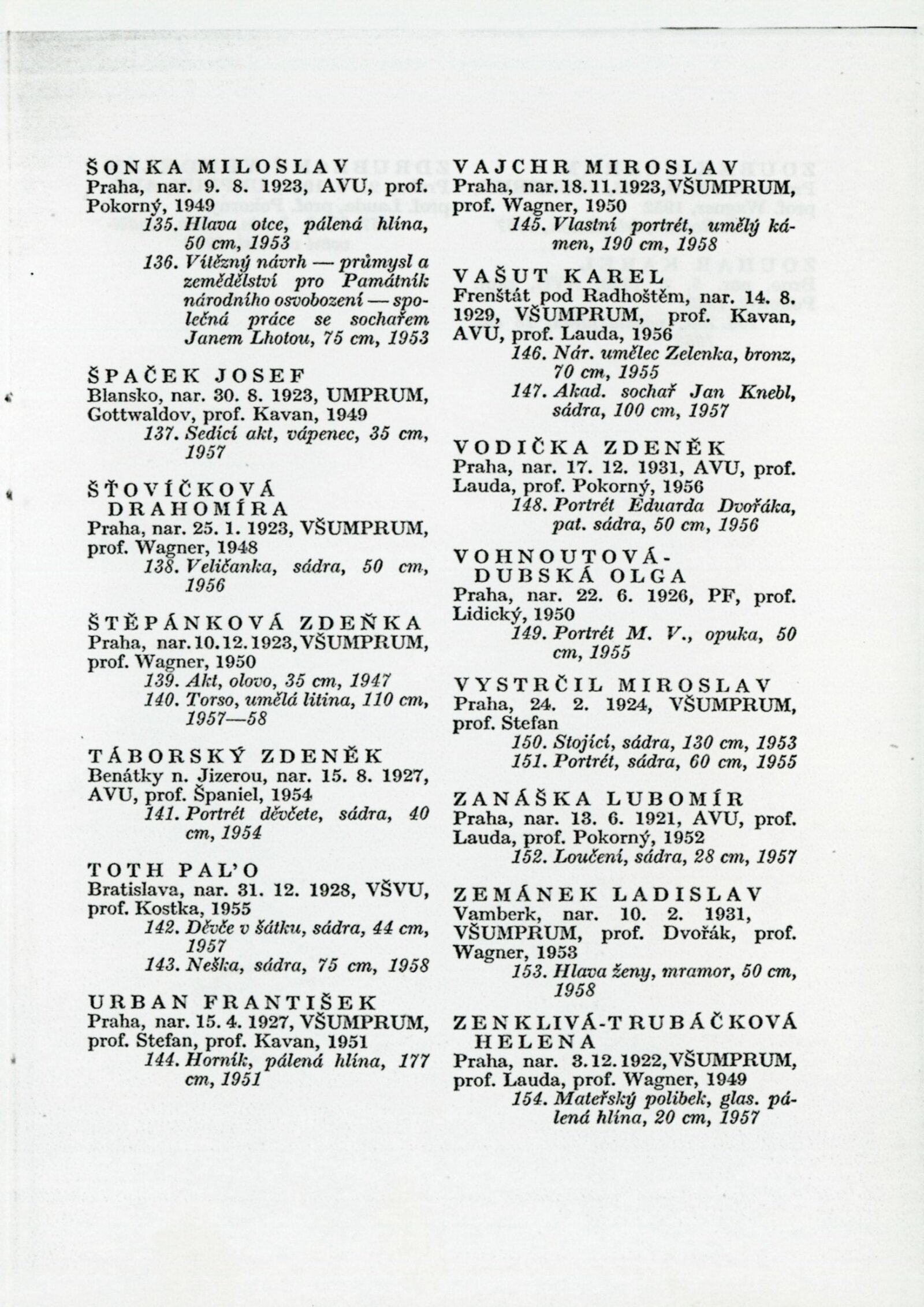Umění mladých výtvarníků Československa. Obrazy a plastiky: Dům umění / Dům pánů z Poděbrad, I. část Obrazy a plastiky: Dům umění, 18. 5. – 29. 6. 1958, II. část Kresby a grafika: Dům pánů z Poděbrad, 25. 5. – 29. 6. 1958 / Společný katalog pro Brno a Prahu. Umění mladých výtvarníků Československa, 1958 / Text: Josef Císařovský. – Praha: Ústřední výbor ČSM, 1958. – 42 s., DU 310, DPK 6. – MZK; UPM