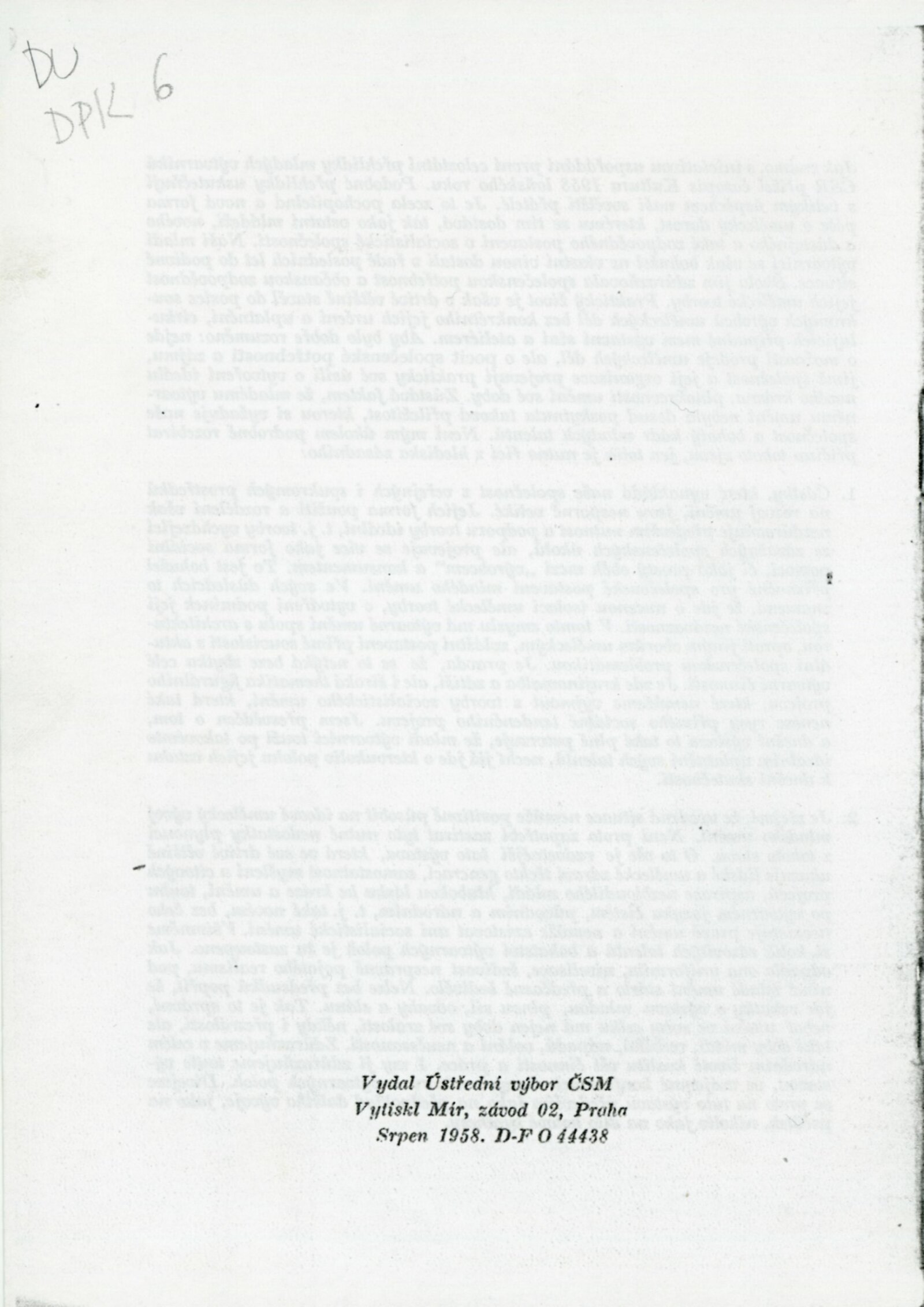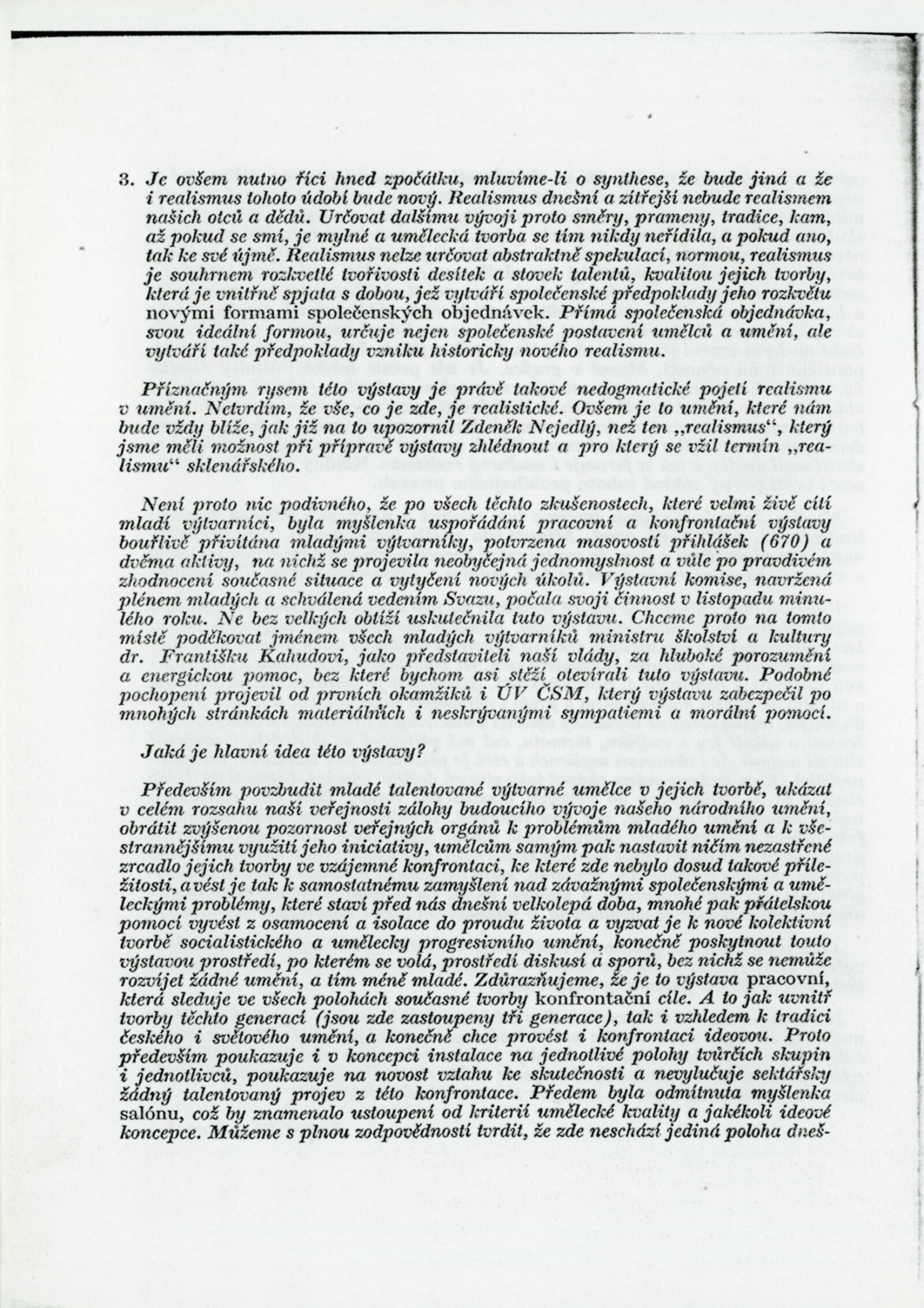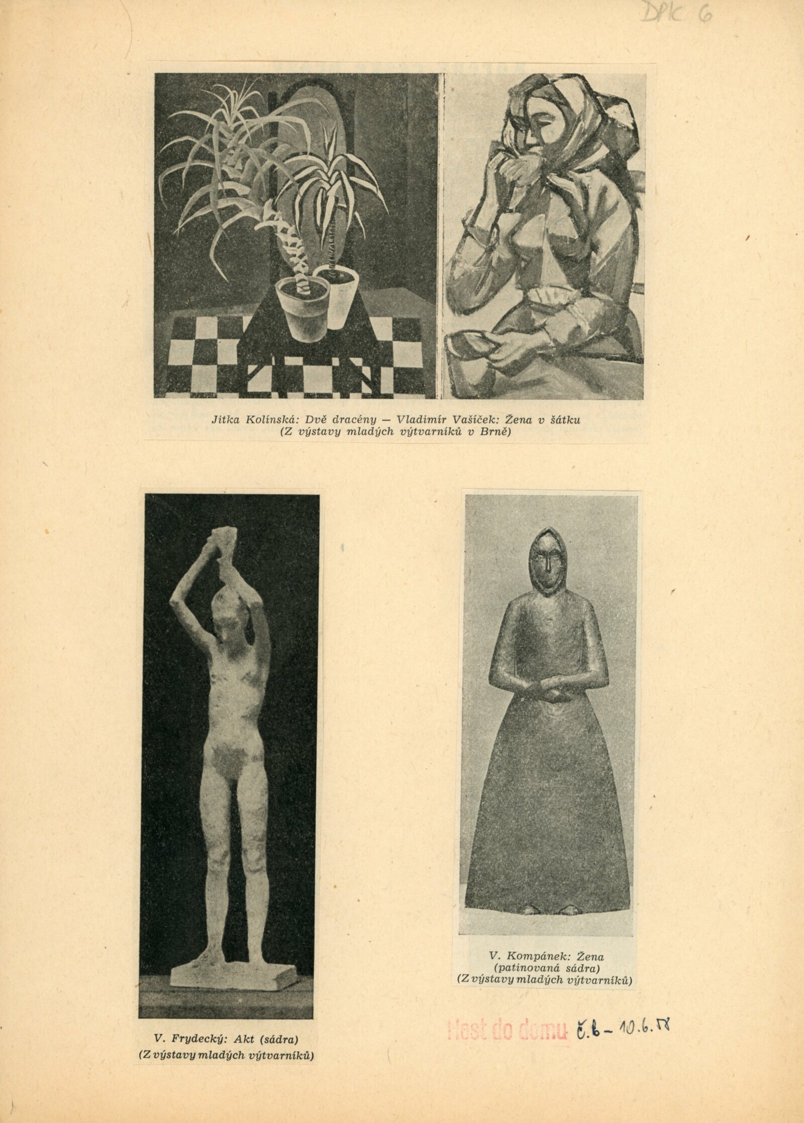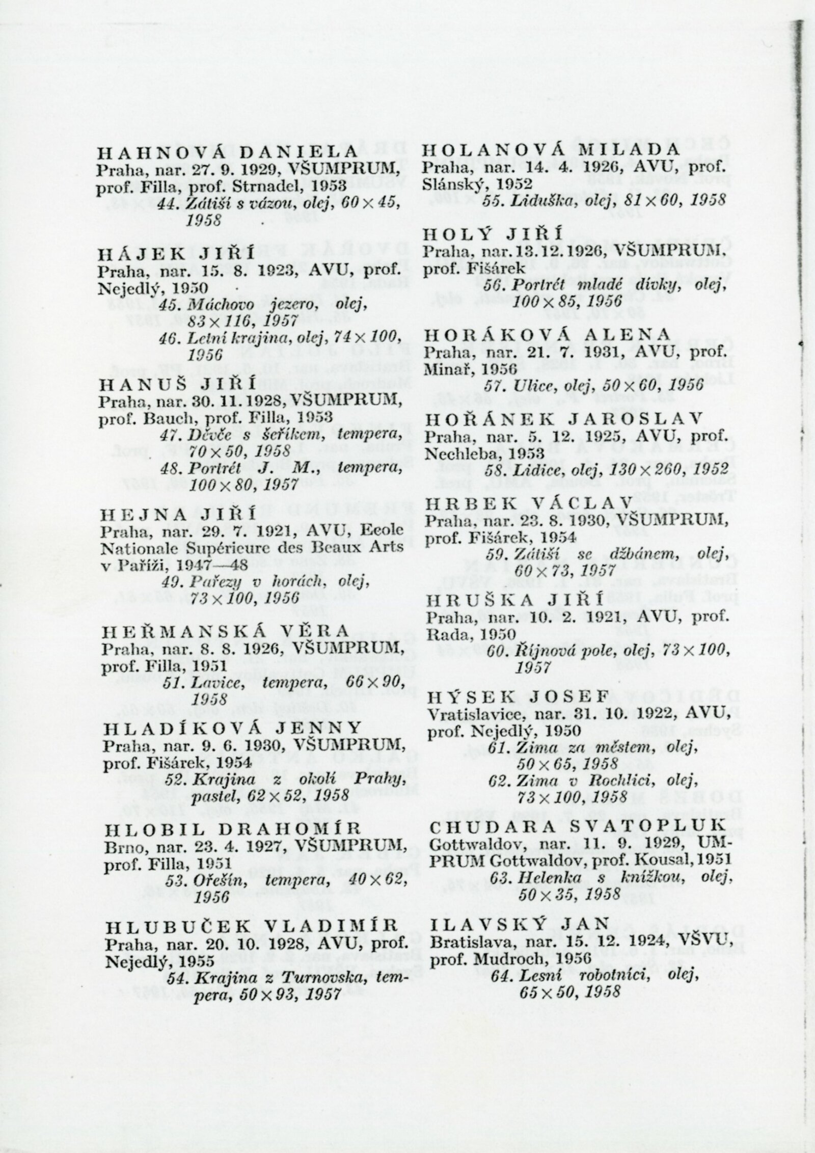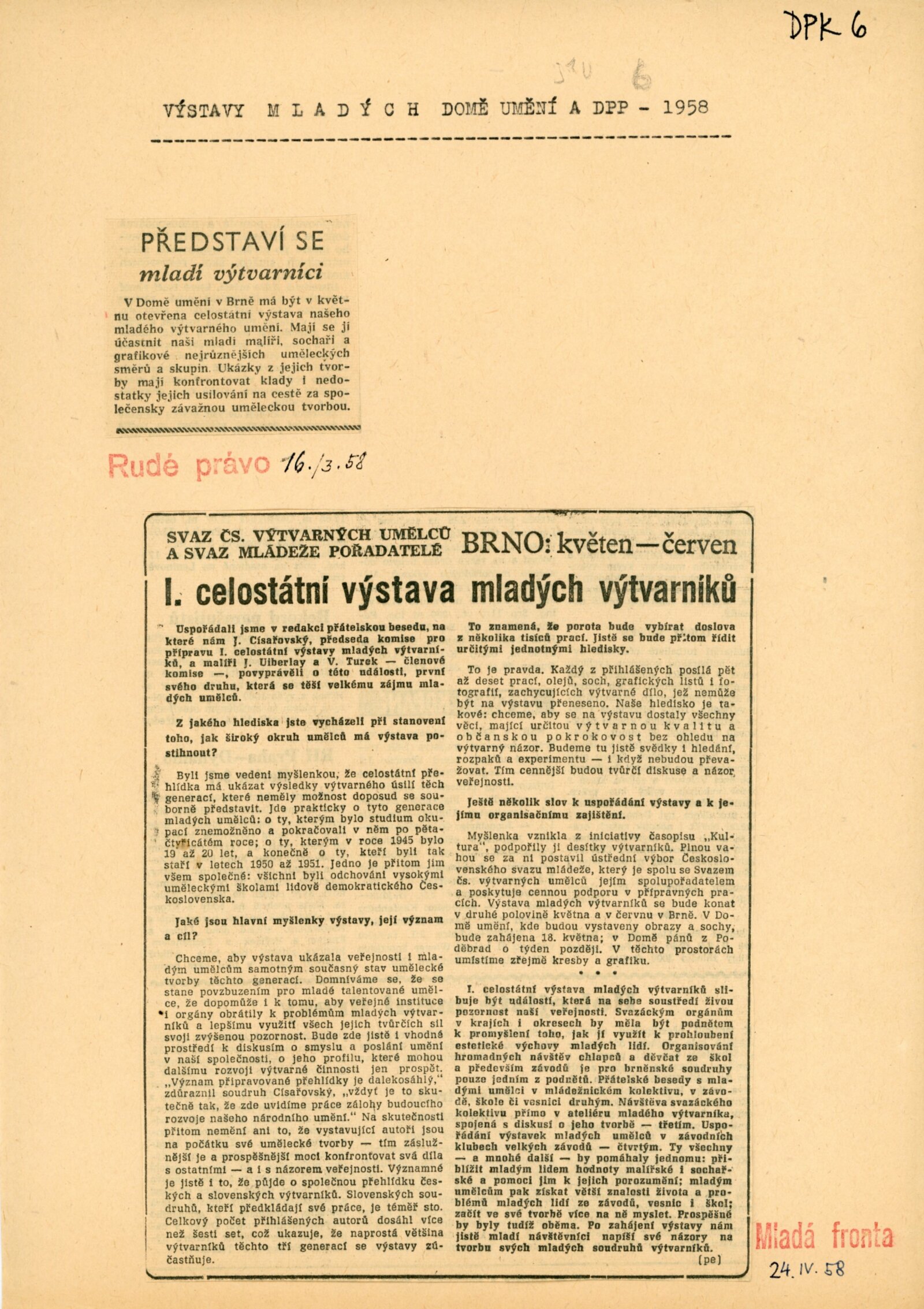 Umění mladých výtvarníků Československa. Obrazy a plastiky: Dům umění / Dům pánů z Poděbrad, I. část Obrazy a plastiky: Dům umění, 18. 5. – 29. 6. 1958, II. část Kresby a grafika: Dům pánů z Poděbrad, 25. 5. – 29. 6. 1958 / Společný katalog pro Brno a Prahu. Umění mladých výtvarníků Československa, 1958 / Text: Josef Císařovský. – Praha: Ústřední výbor ČSM, 1958. – 42 s., DU 310, DPK 6. – MZK; UPM