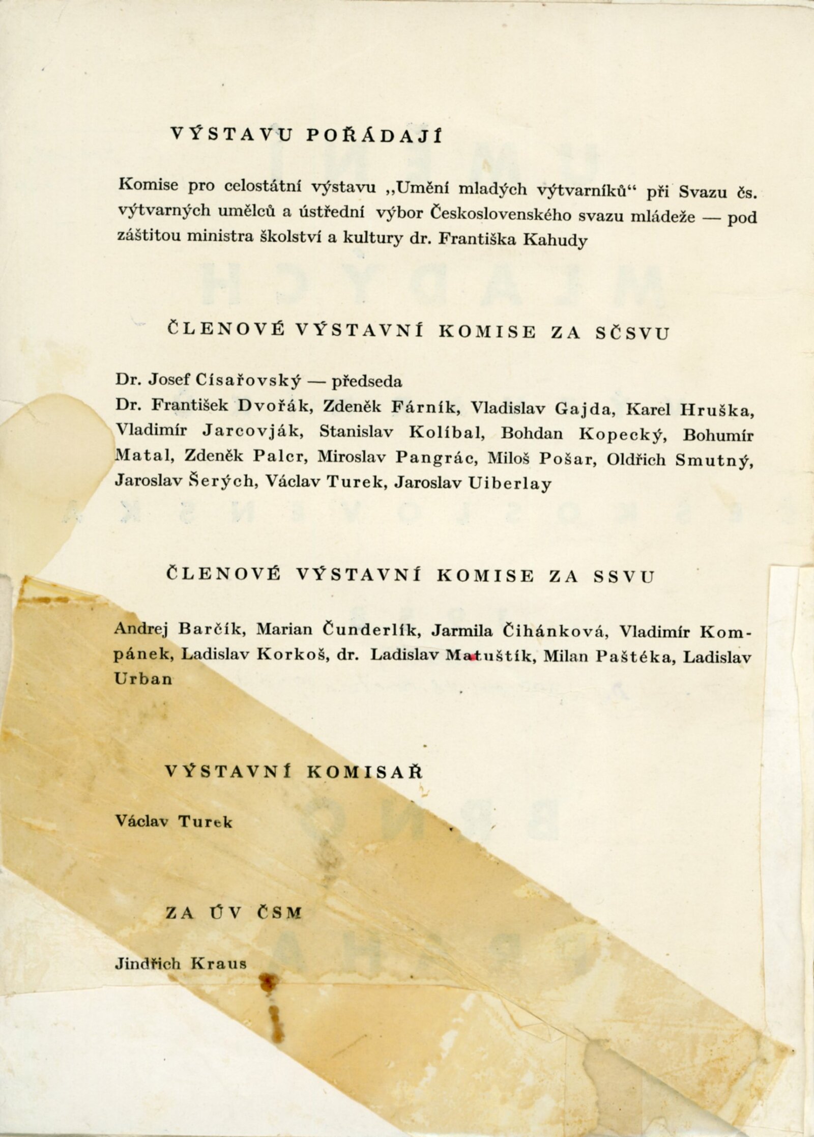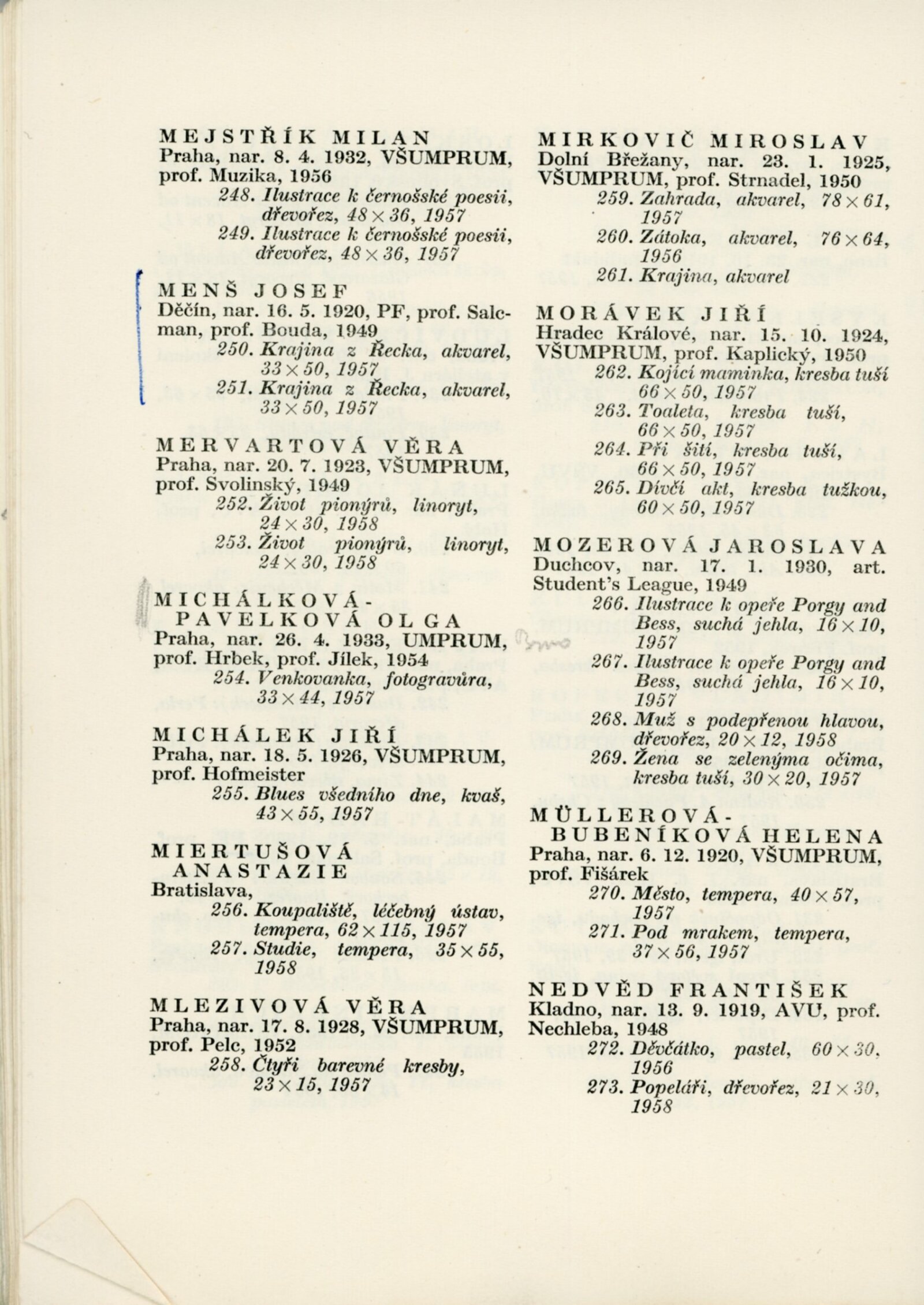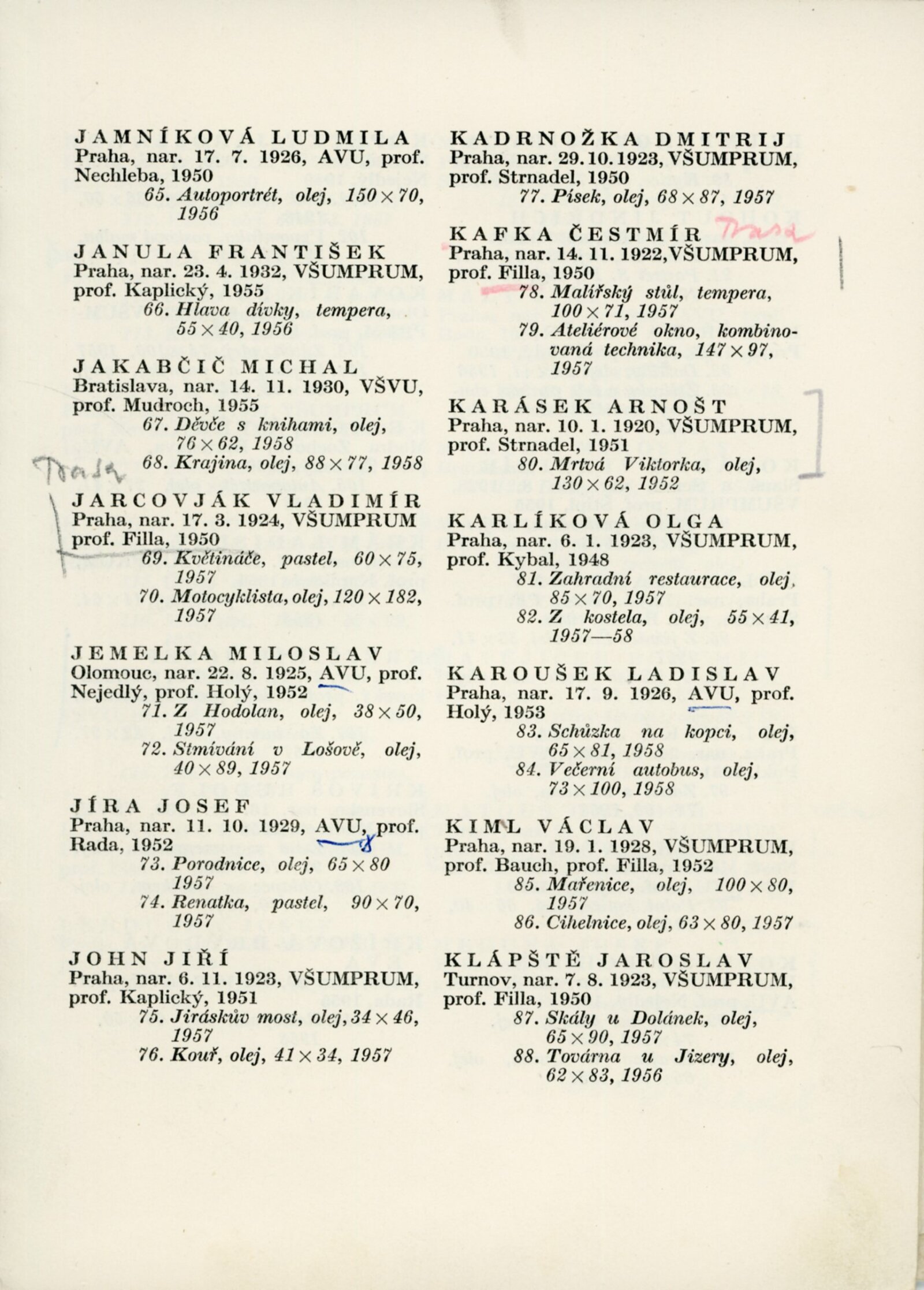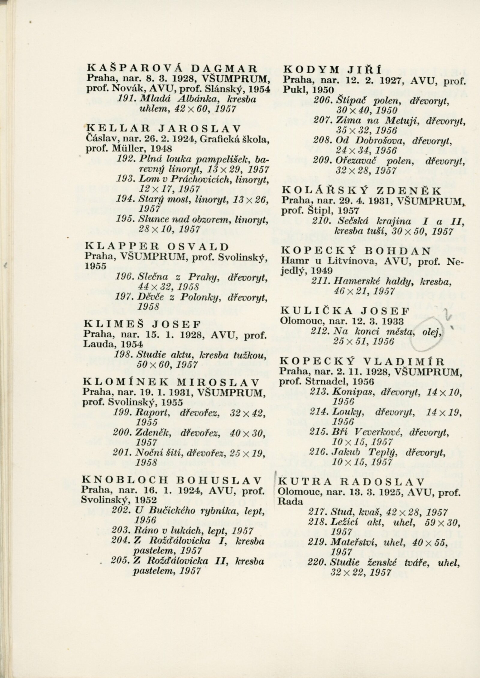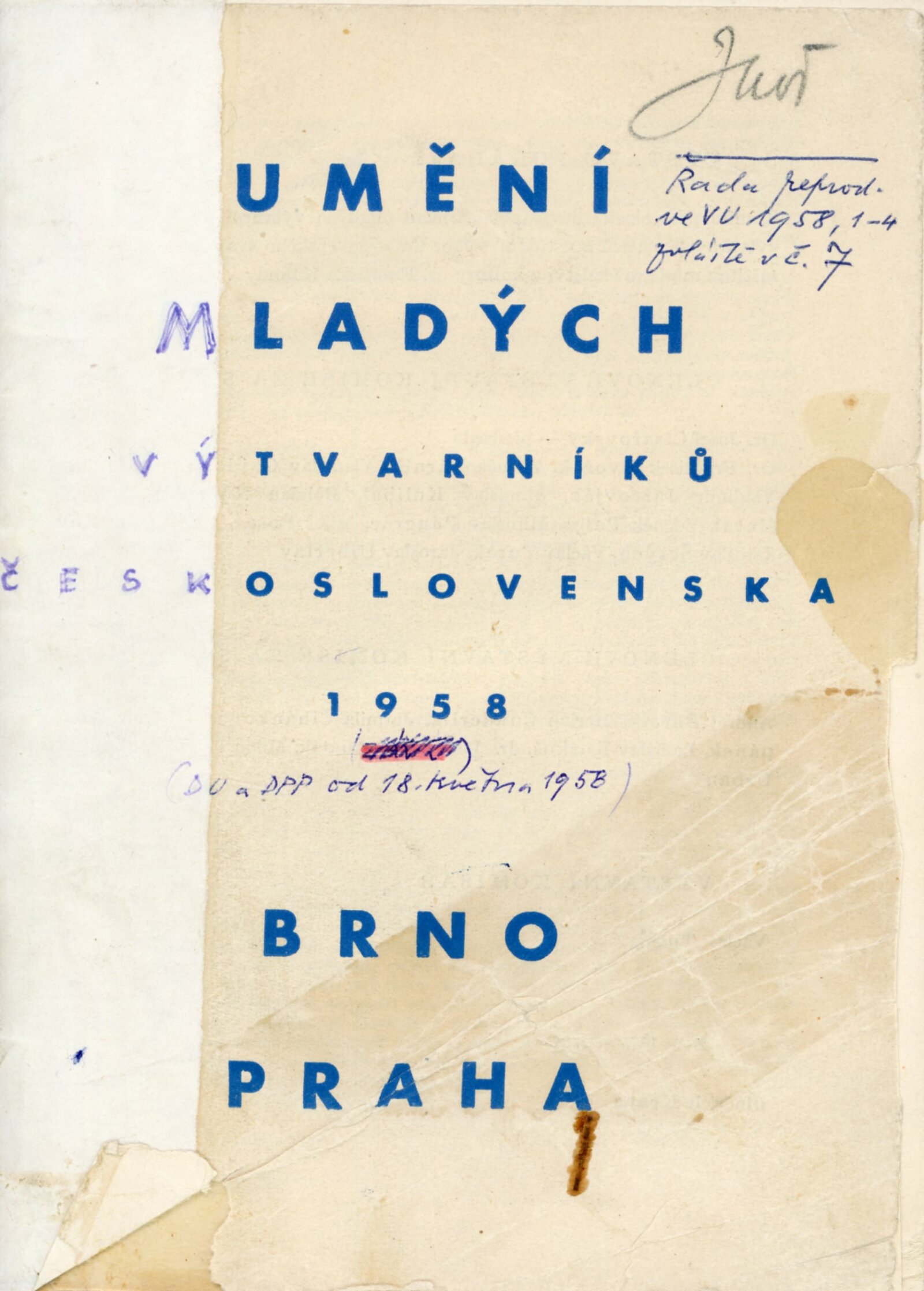 Umění mladých výtvarníků Československa. Obrazy a plastiky: Dům umění / Dům pánů z Poděbrad, I. část Obrazy a plastiky: Dům umění, 18. 5. – 29. 6. 1958, II. část Kresby a grafika: Dům pánů z Poděbrad, 25. 5. – 29. 6. 1958 / Společný katalog pro Brno a Prahu. Umění mladých výtvarníků Československa, 1958 / Text: Josef Císařovský. – Praha: Ústřední výbor ČSM, 1958. – 42 s., DU 310, DPK 6. – MZK; UPM