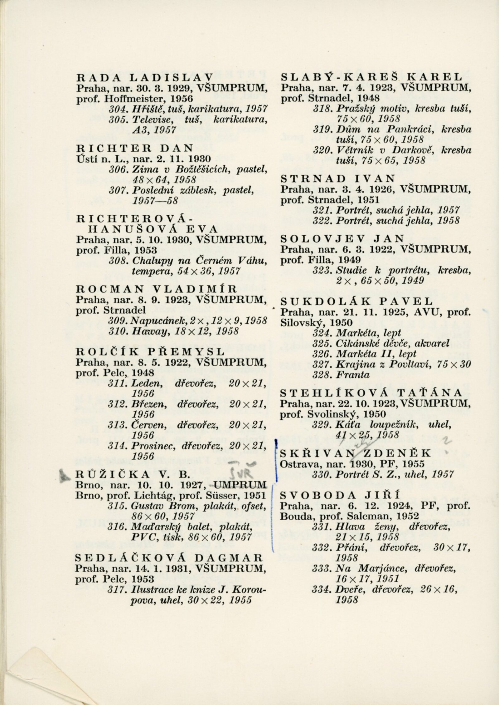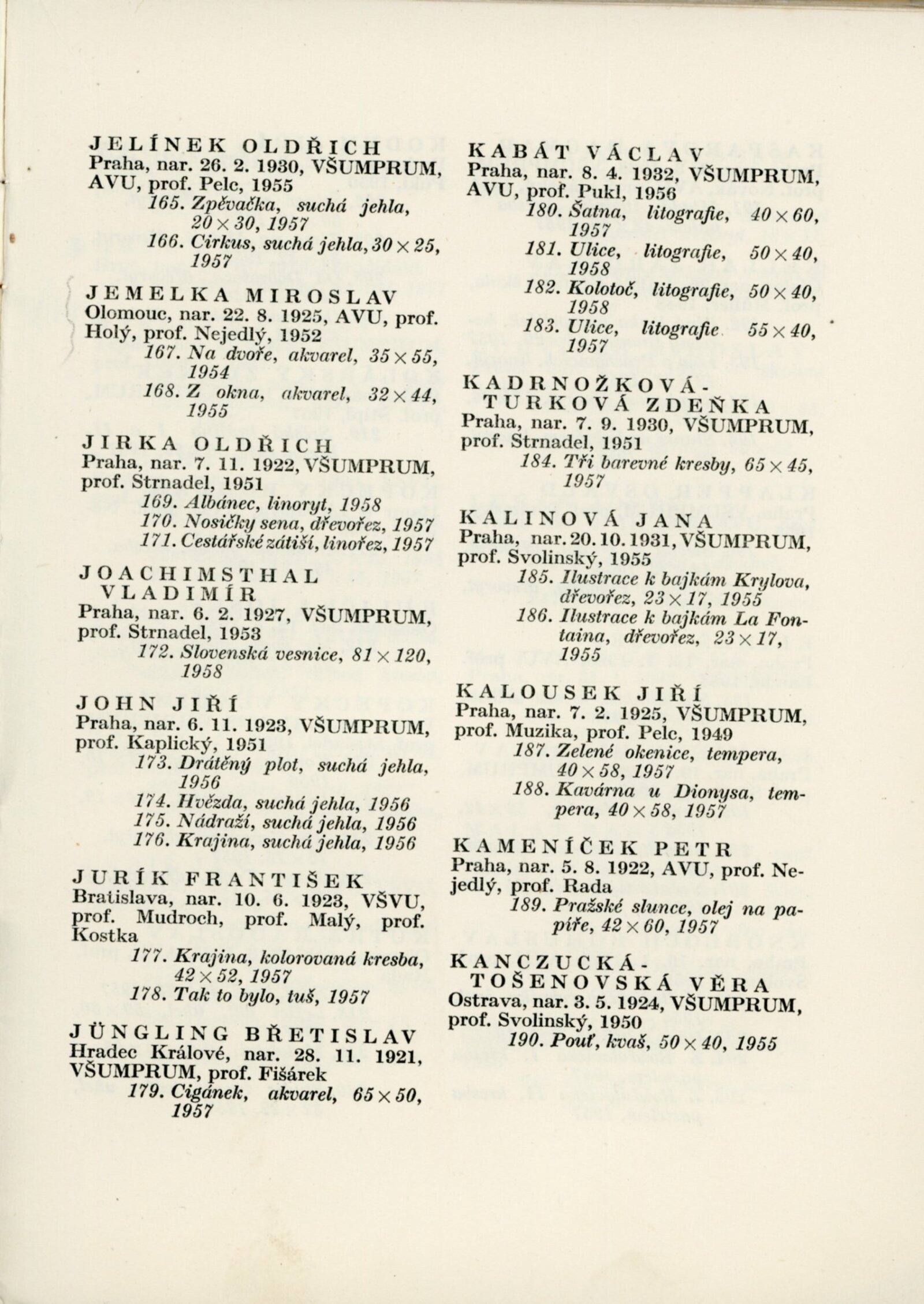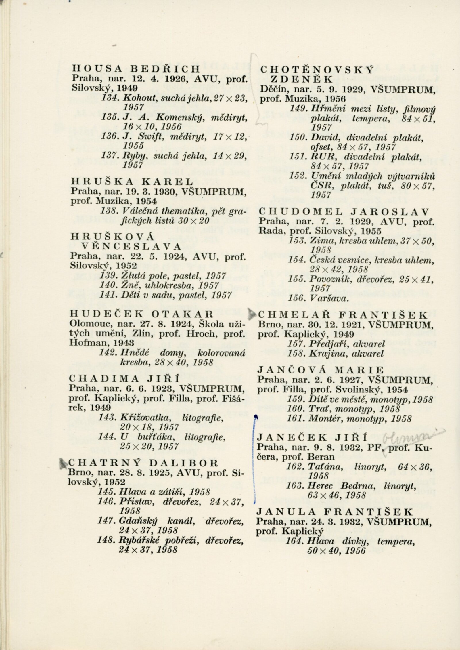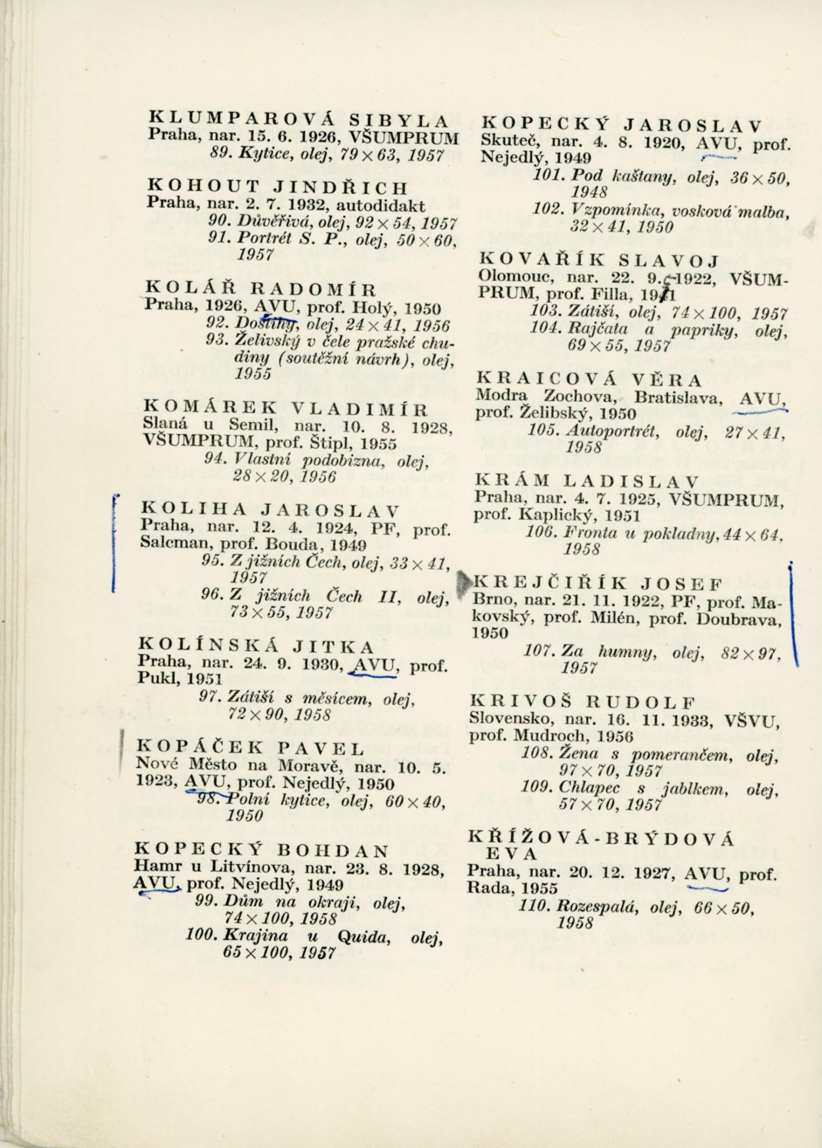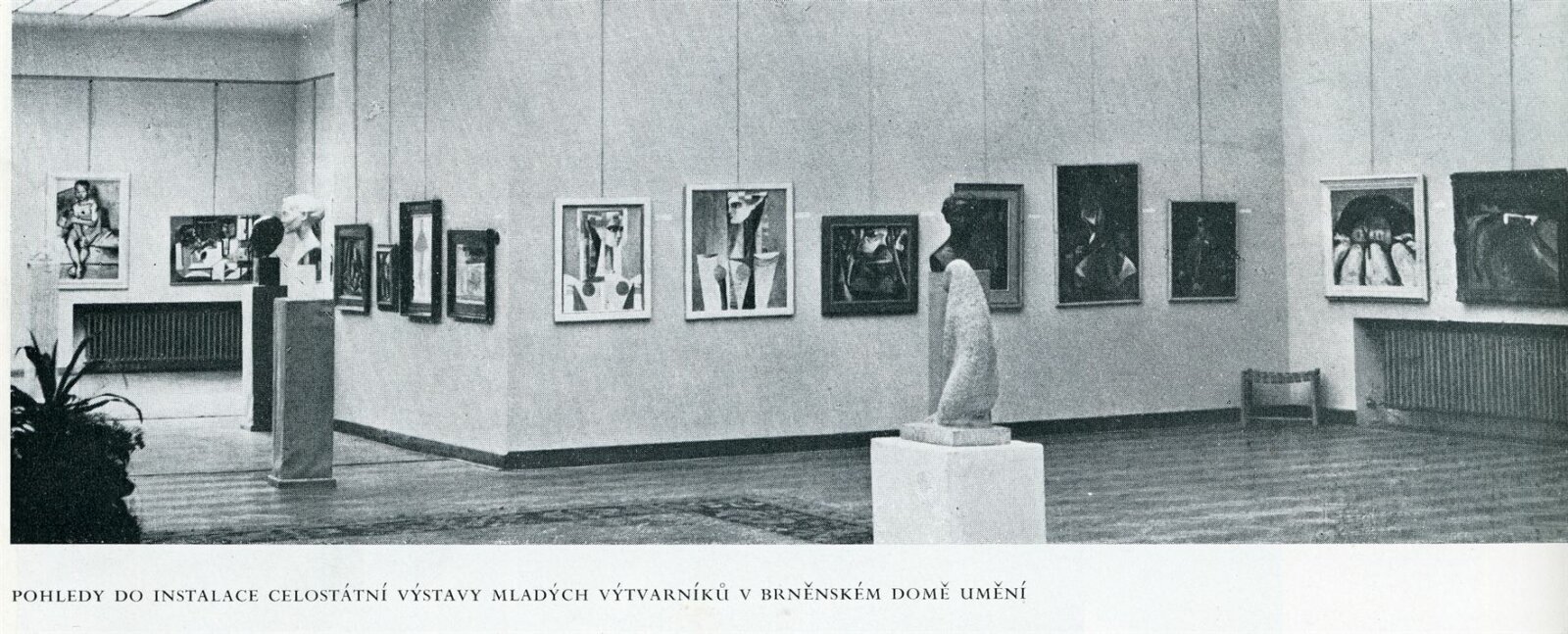 Umění mladých výtvarníků Československa. Obrazy a plastiky: Dům umění / Dům pánů z Poděbrad, I. část Obrazy a plastiky: Dům umění, 18. 5. – 29. 6. 1958, II. část Kresby a grafika: Dům pánů z Poděbrad, 25. 5. – 29. 6. 1958 / Společný katalog pro Brno a Prahu. Umění mladých výtvarníků Československa, 1958 / Text: Josef Císařovský. – Praha: Ústřední výbor ČSM, 1958. – 42 s., DU 310, DPK 6. – MZK; UPM