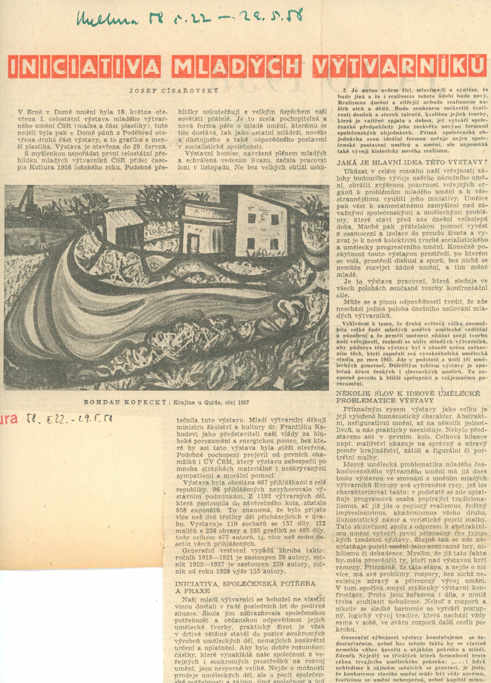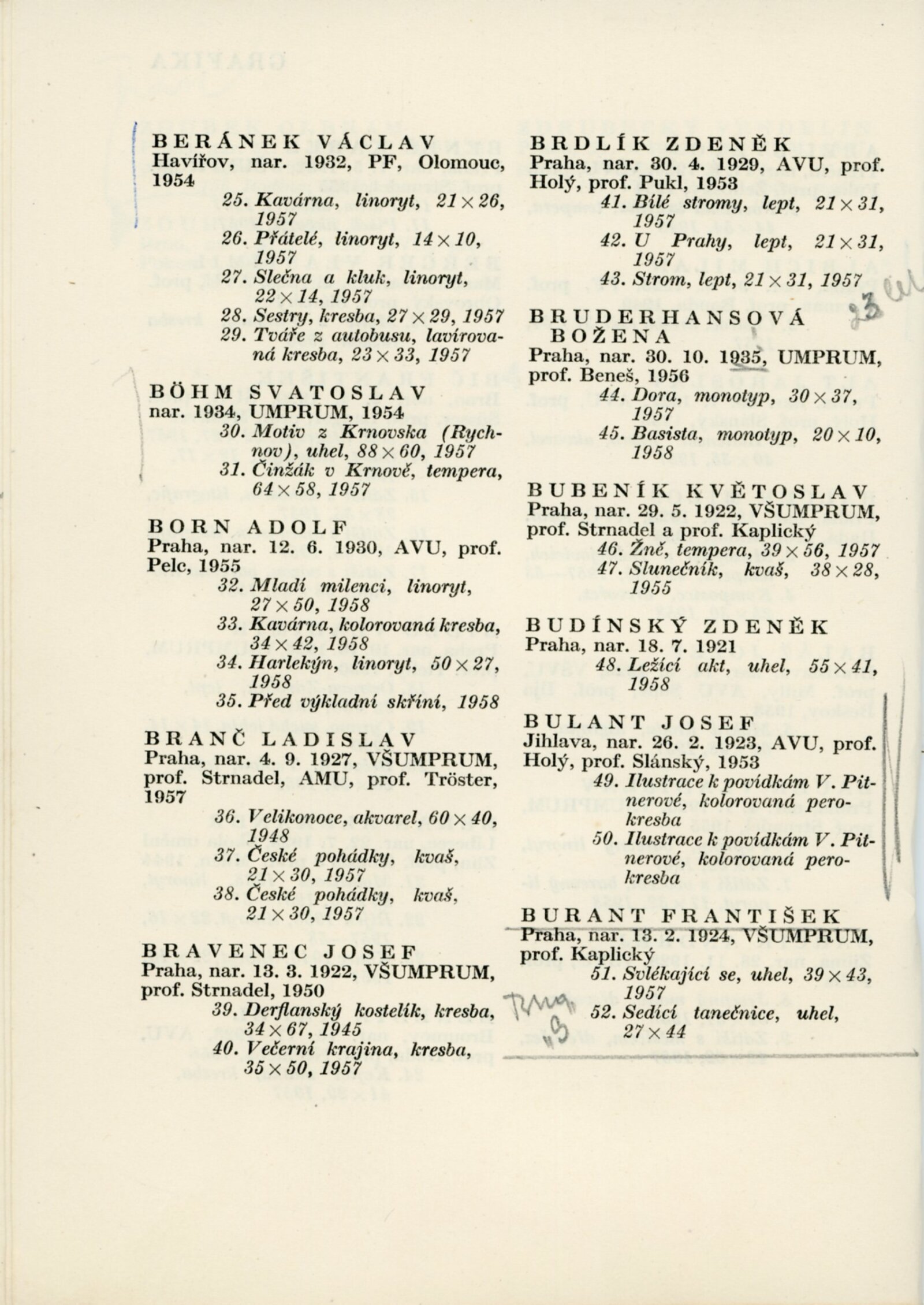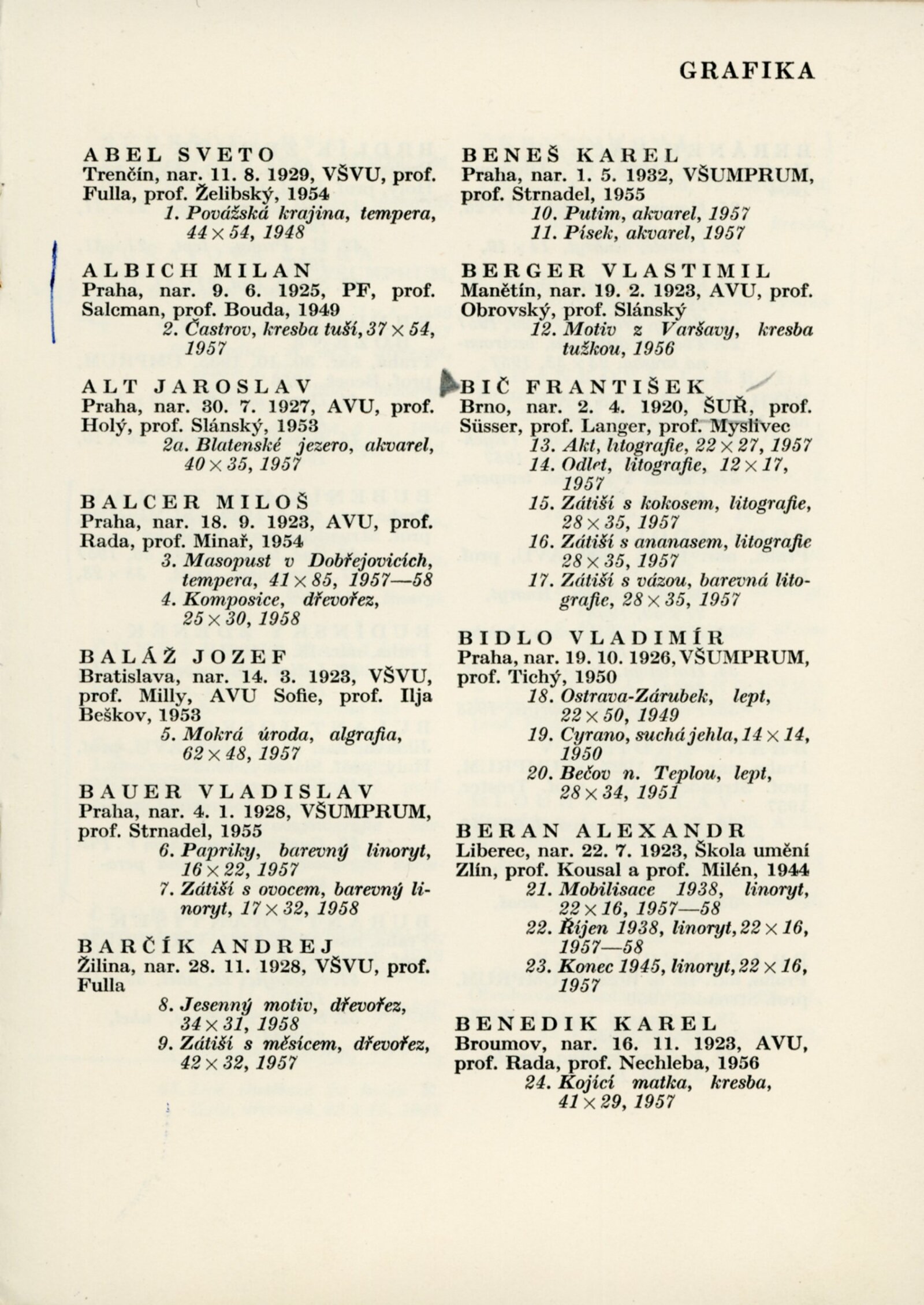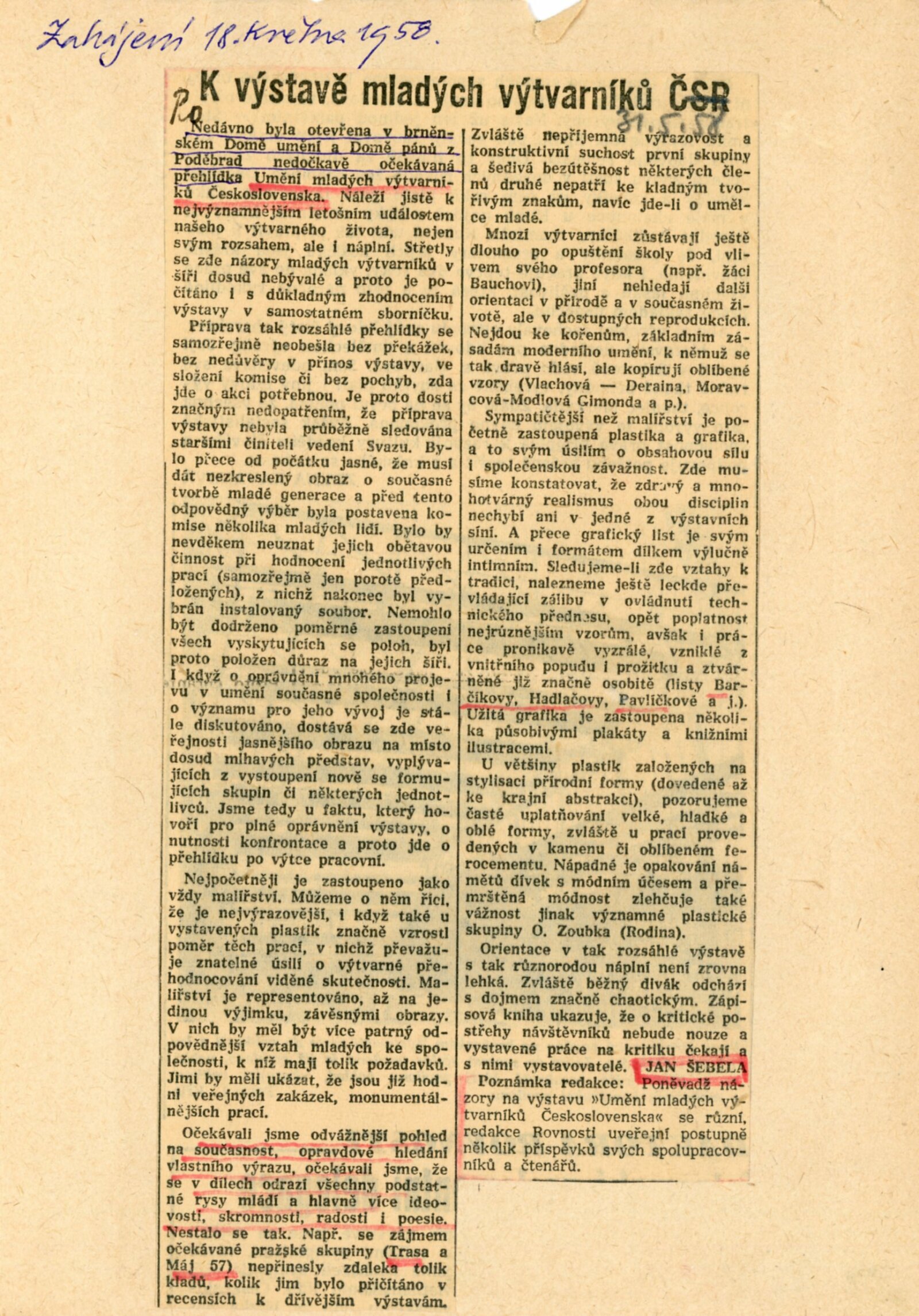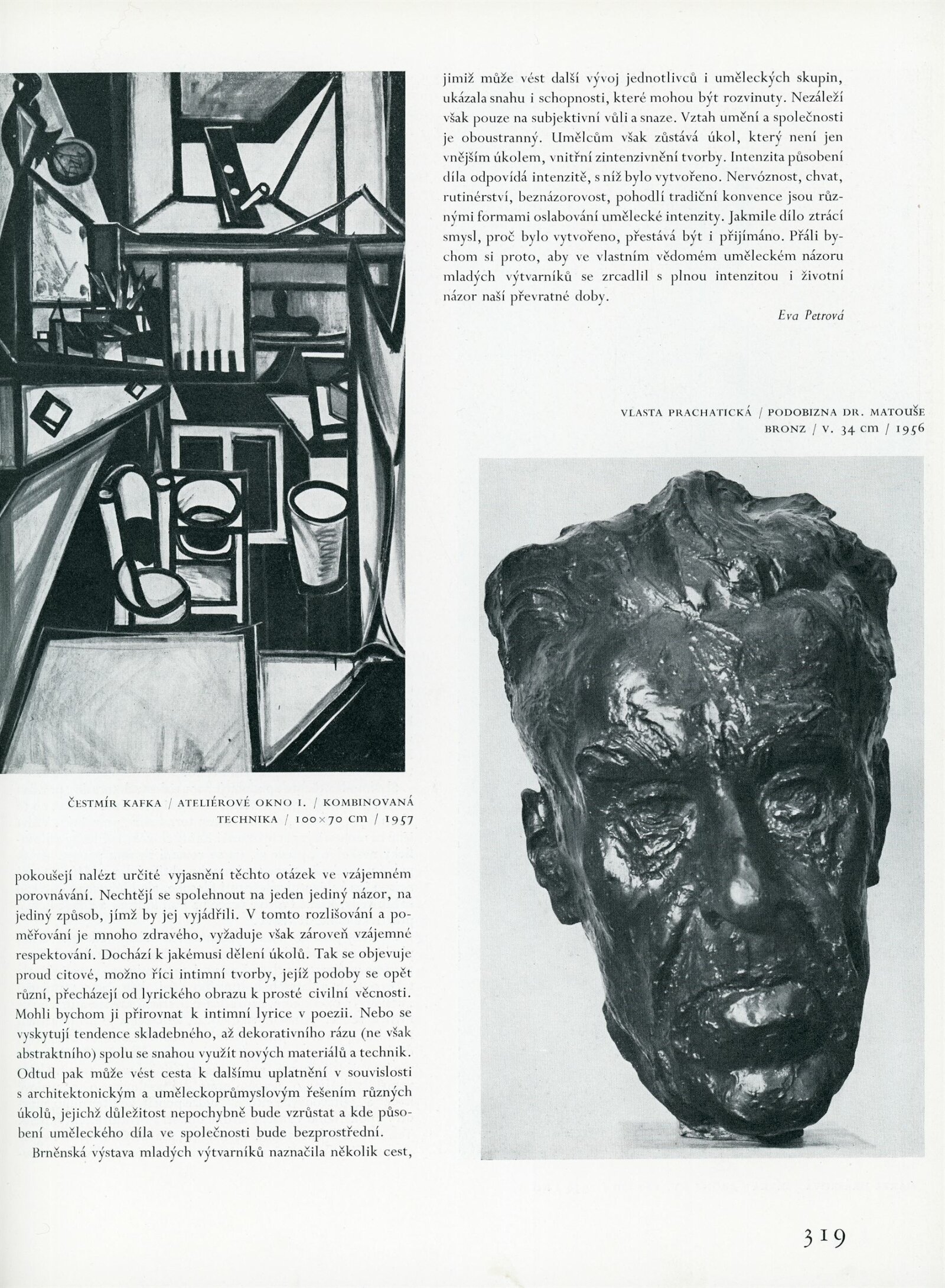 Umění mladých výtvarníků Československa. Obrazy a plastiky: Dům umění / Dům pánů z Poděbrad, I. část Obrazy a plastiky: Dům umění, 18. 5. – 29. 6. 1958, II. část Kresby a grafika: Dům pánů z Poděbrad, 25. 5. – 29. 6. 1958 / Společný katalog pro Brno a Prahu. Umění mladých výtvarníků Československa, 1958 / Text: Josef Císařovský. – Praha: Ústřední výbor ČSM, 1958. – 42 s., DU 310, DPK 6. – MZK; UPM