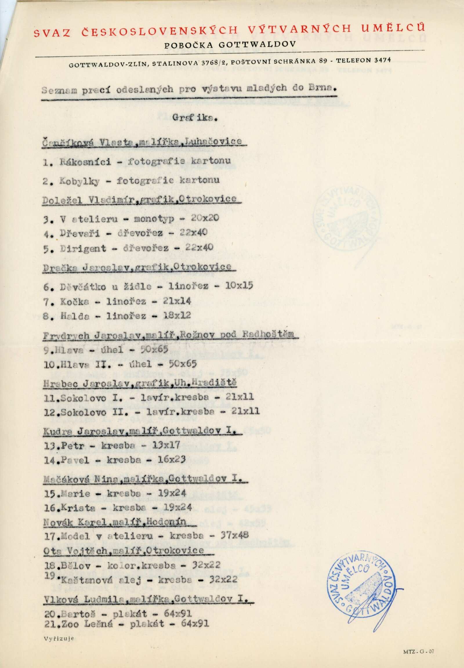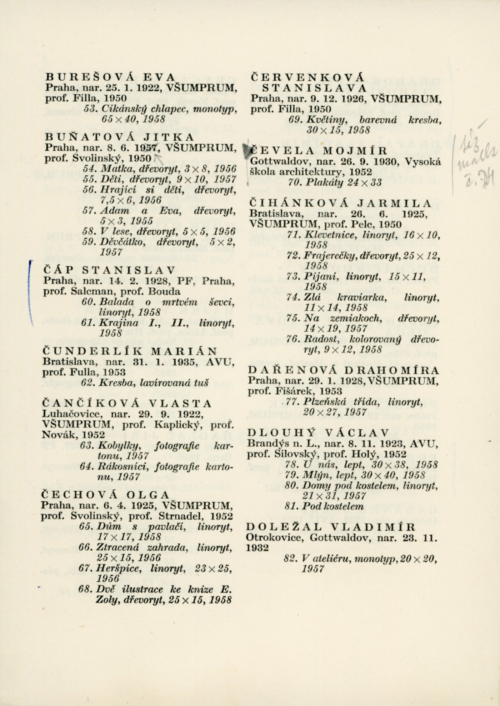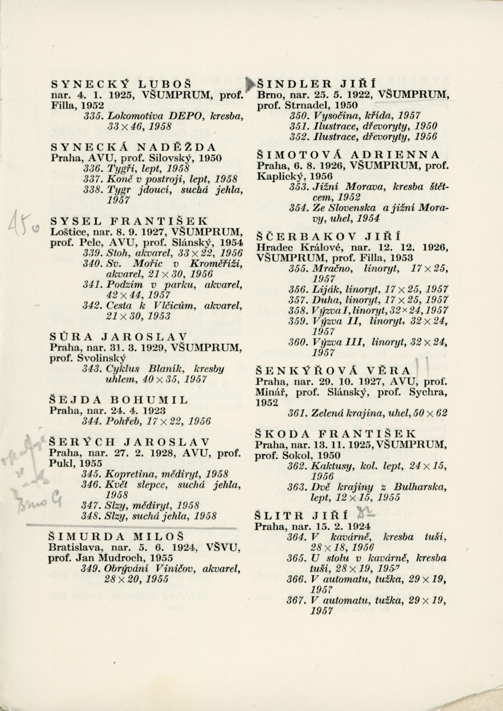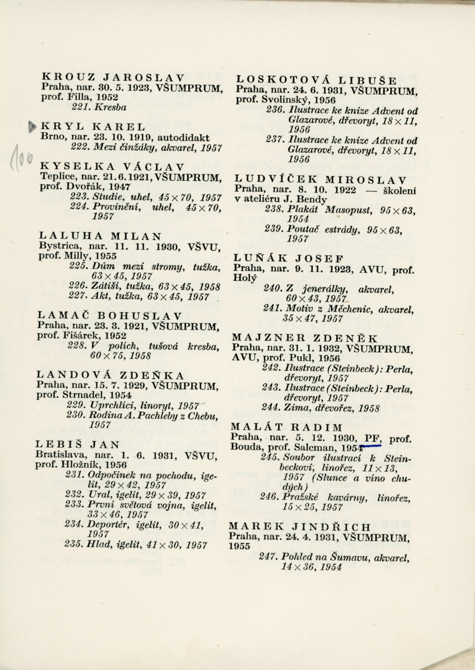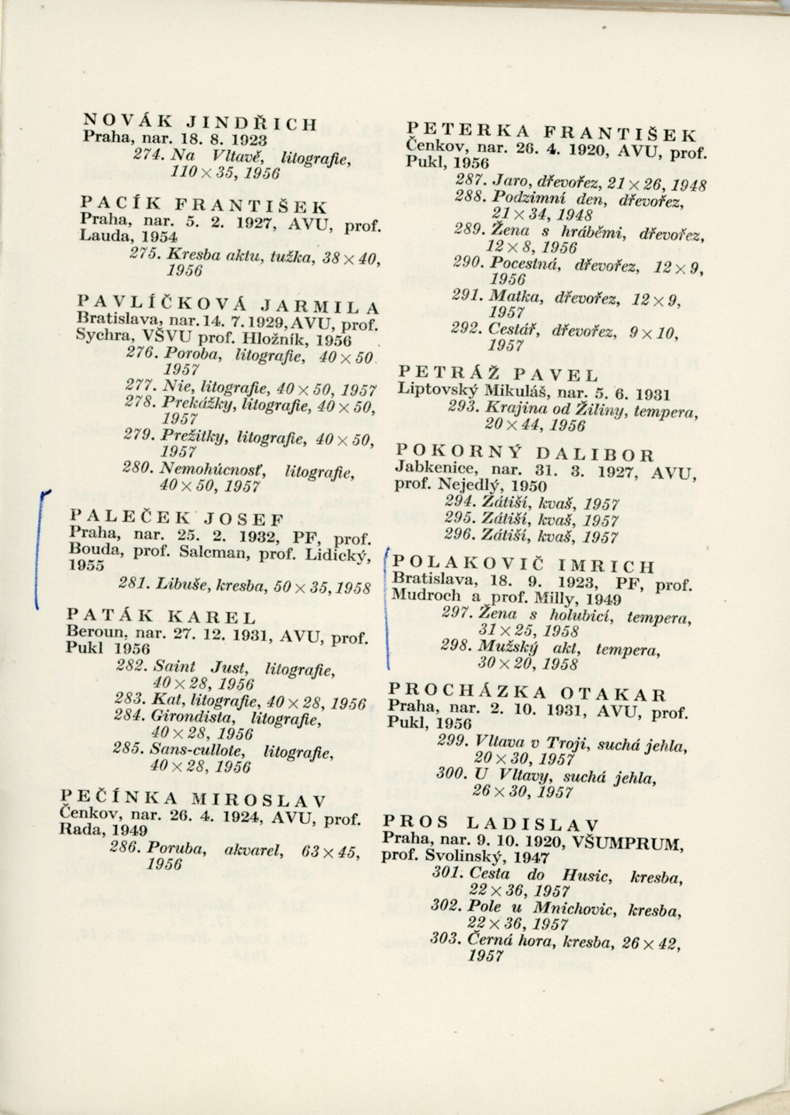 Umění mladých výtvarníků Československa. Obrazy a plastiky: Dům umění / Dům pánů z Poděbrad, I. část Obrazy a plastiky: Dům umění, 18. 5. – 29. 6. 1958, II. část Kresby a grafika: Dům pánů z Poděbrad, 25. 5. – 29. 6. 1958 / Společný katalog pro Brno a Prahu. Umění mladých výtvarníků Československa, 1958 / Text: Josef Císařovský. – Praha: Ústřední výbor ČSM, 1958. – 42 s., DU 310, DPK 6. – MZK; UPM