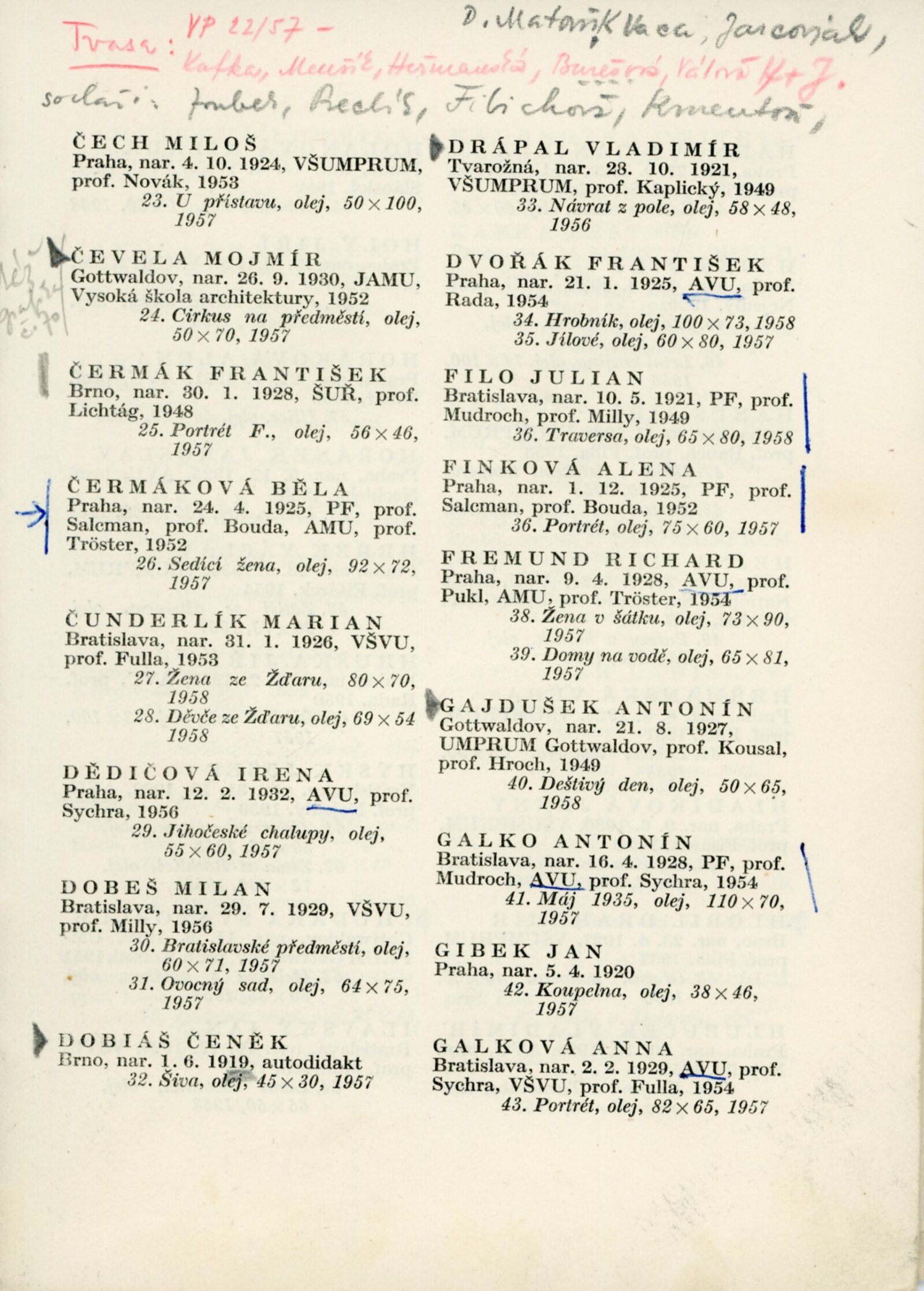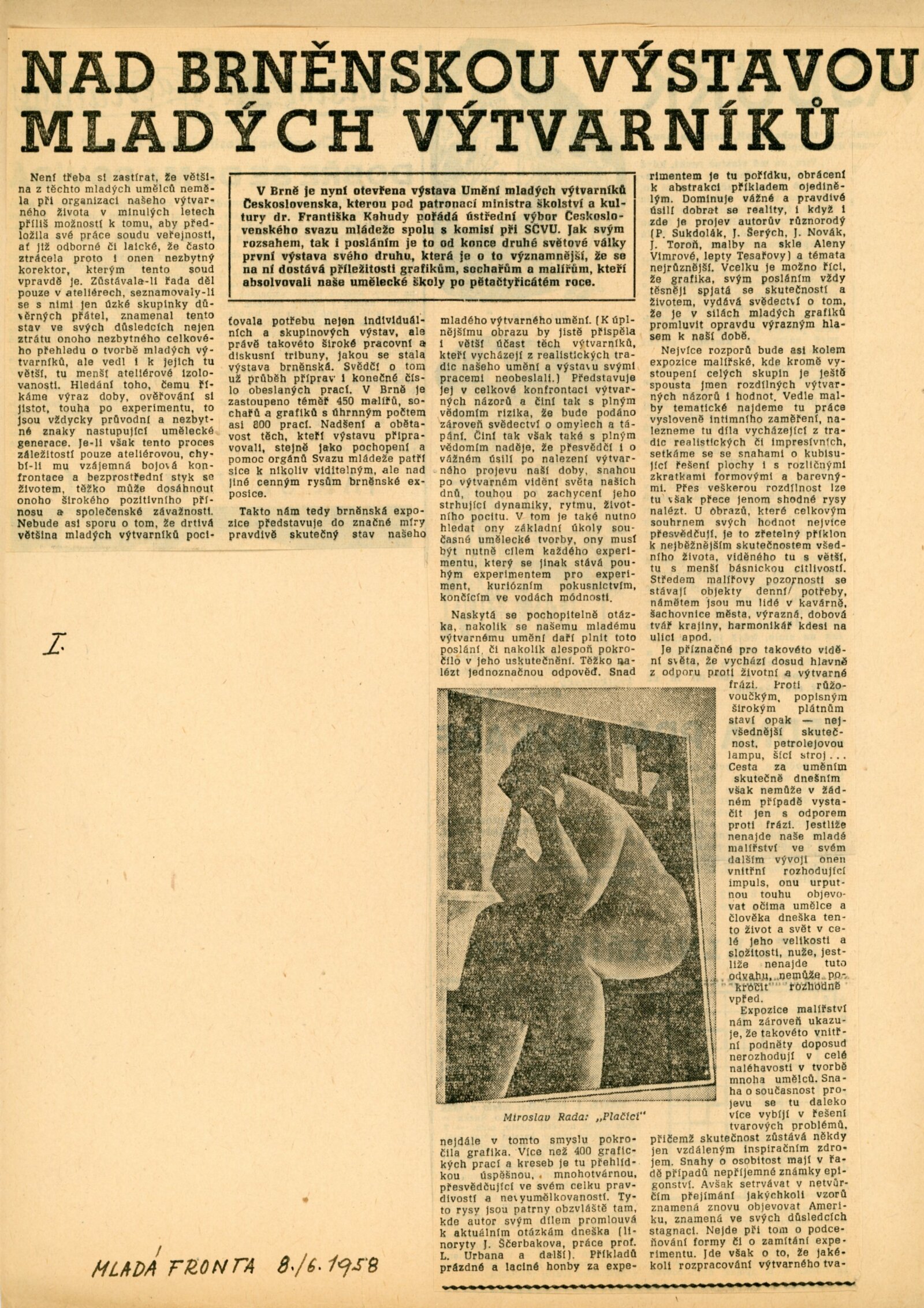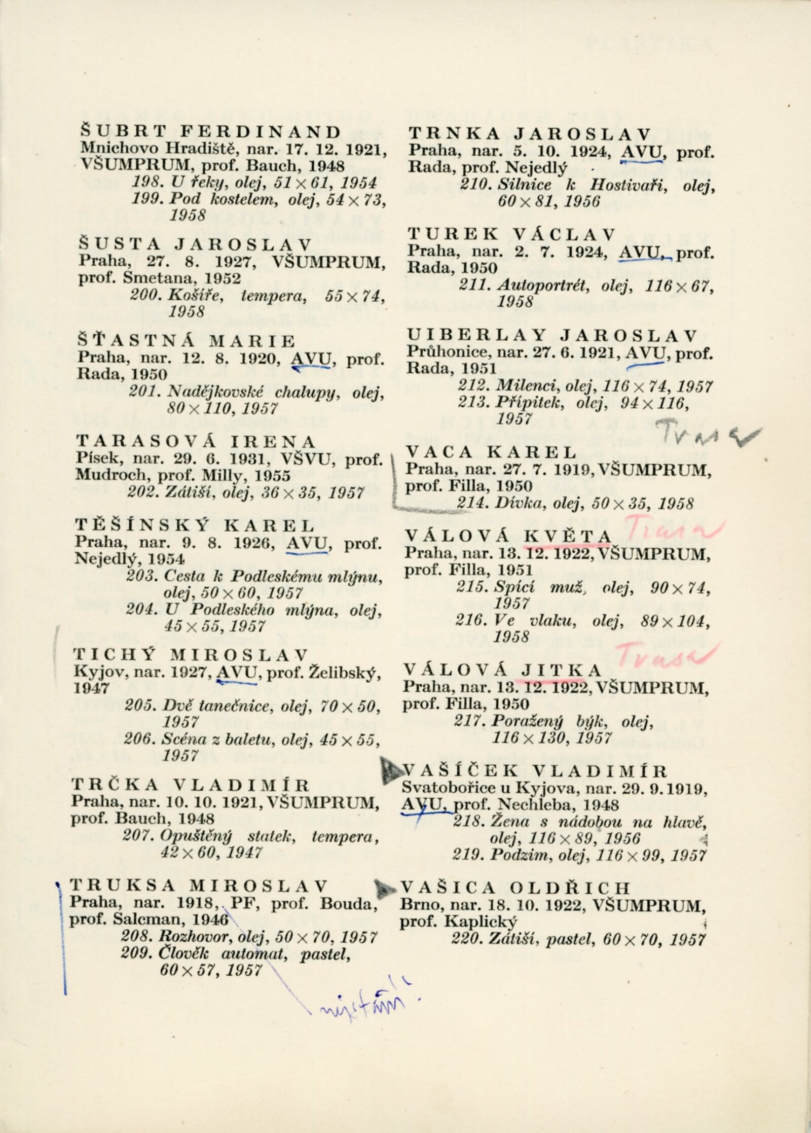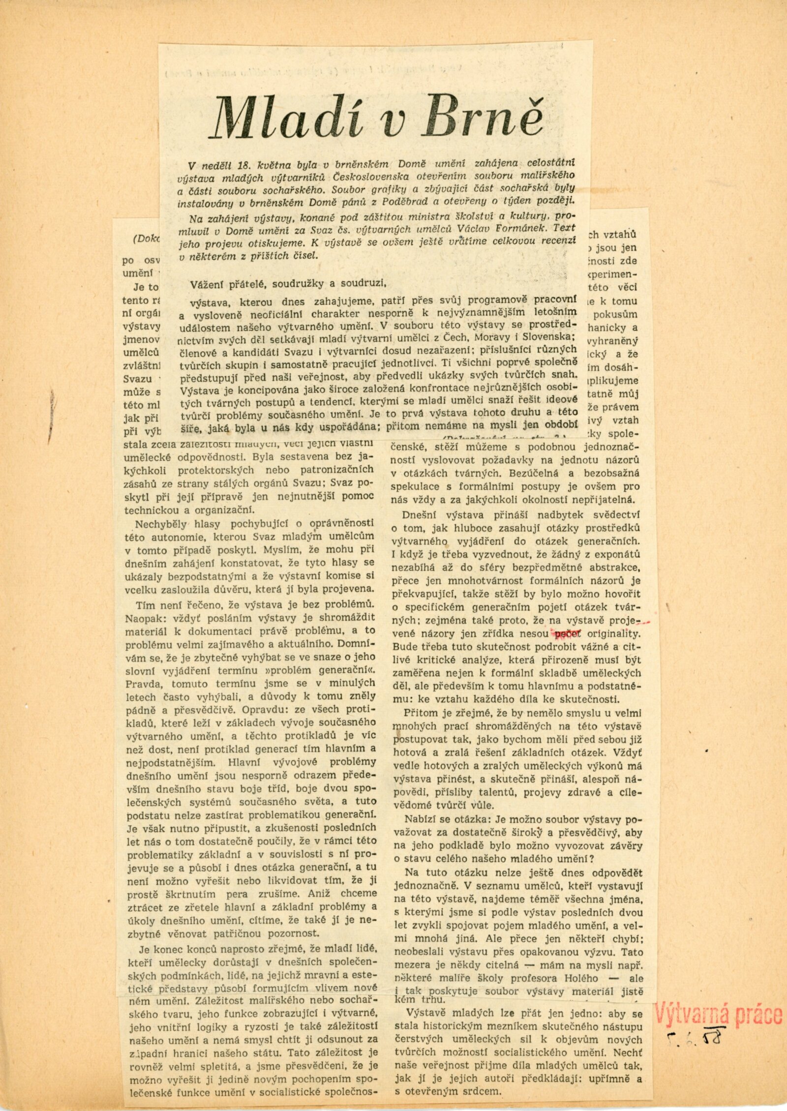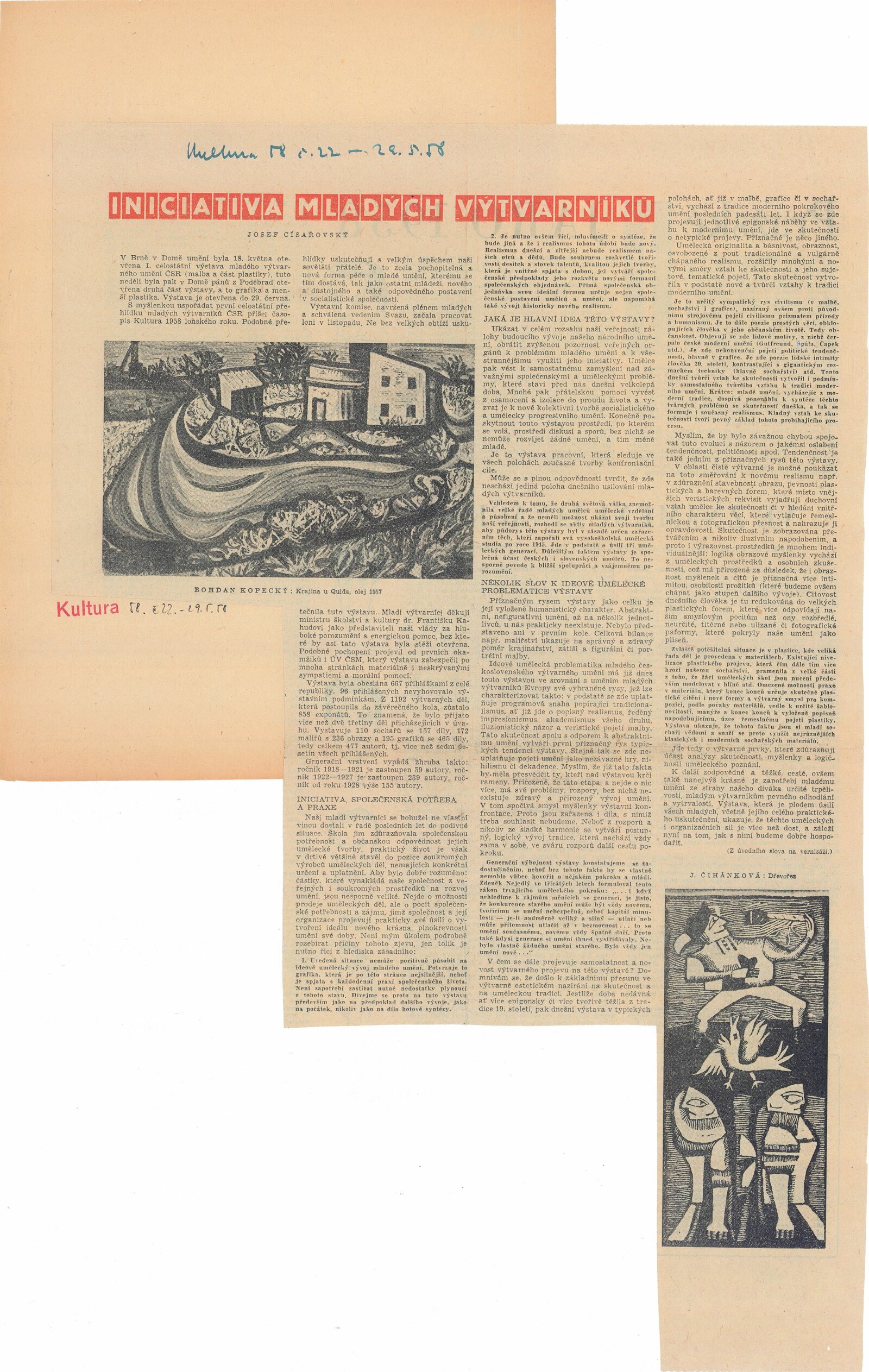 Umění mladých výtvarníků Československa. Obrazy a plastiky: Dům umění / Dům pánů z Poděbrad, I. část Obrazy a plastiky: Dům umění, 18. 5. – 29. 6. 1958, II. část Kresby a grafika: Dům pánů z Poděbrad, 25. 5. – 29. 6. 1958 / Společný katalog pro Brno a Prahu. Umění mladých výtvarníků Československa, 1958 / Text: Josef Císařovský. – Praha: Ústřední výbor ČSM, 1958. – 42 s., DU 310, DPK 6. – MZK; UPM