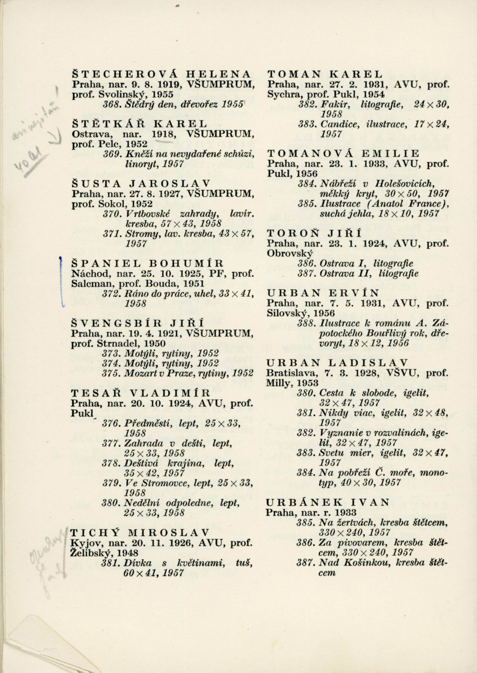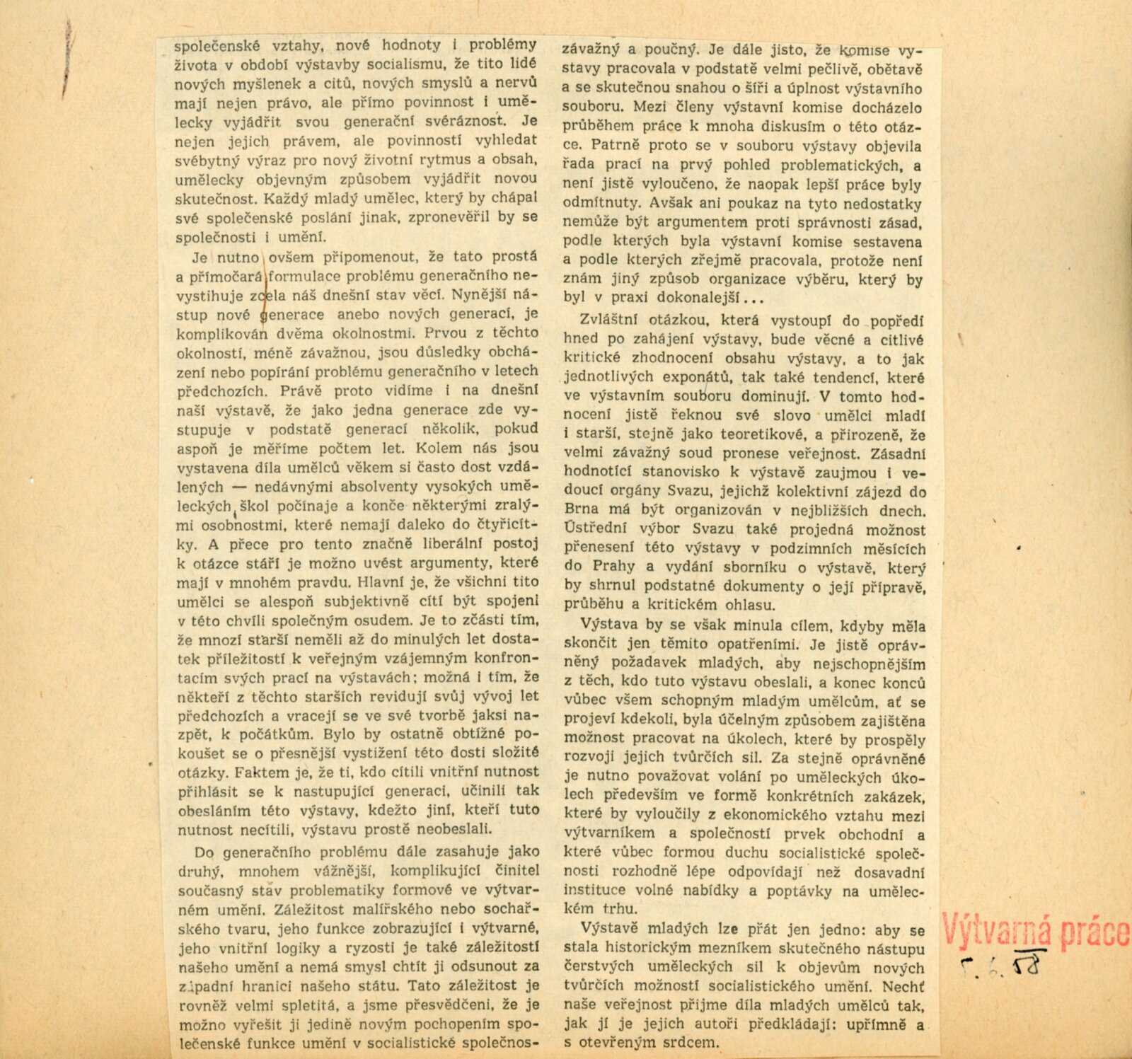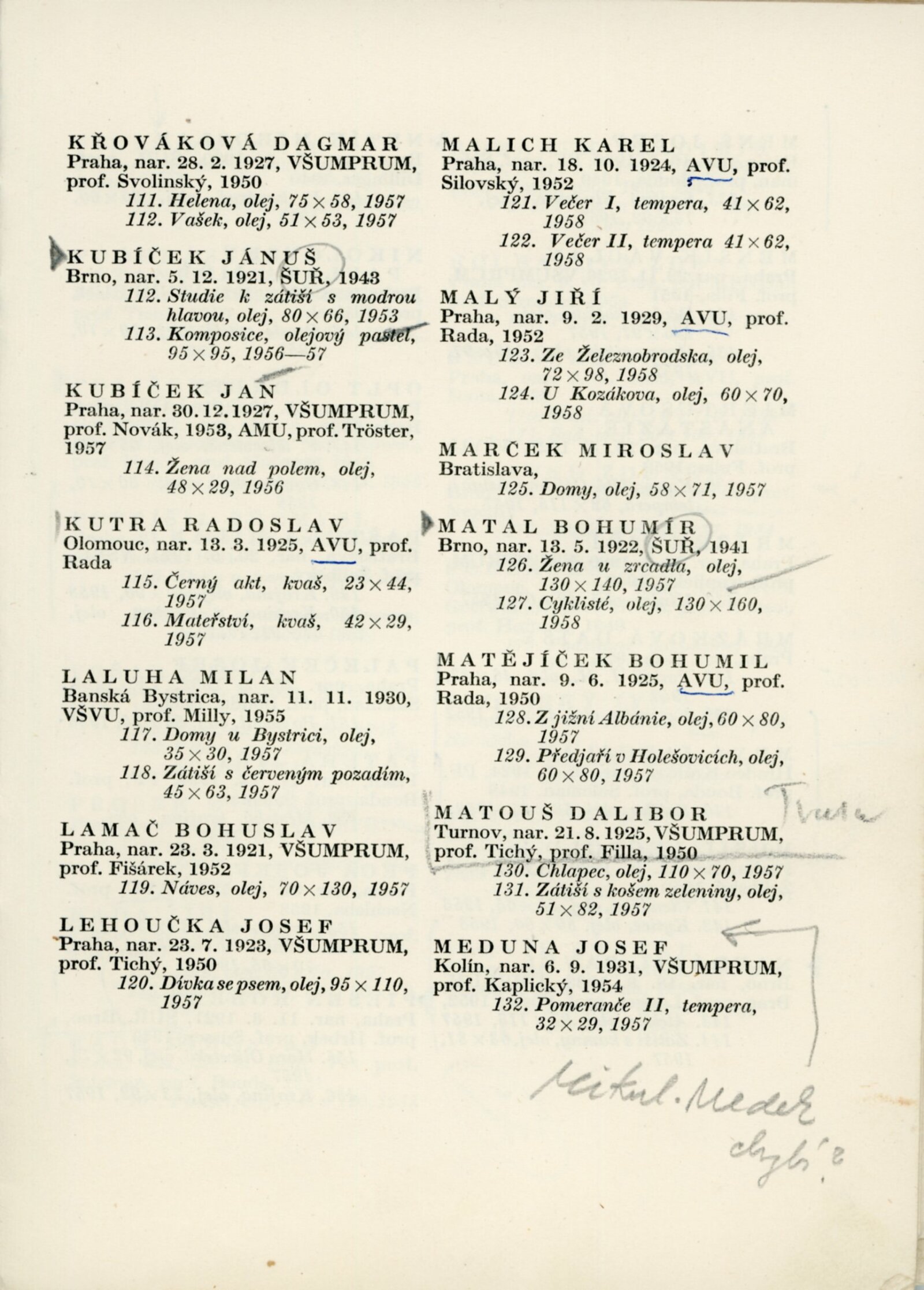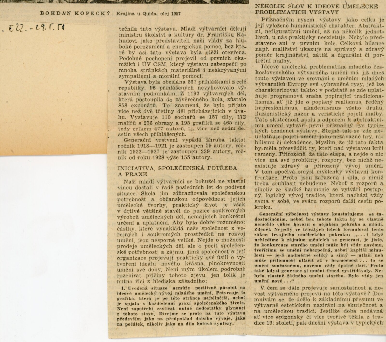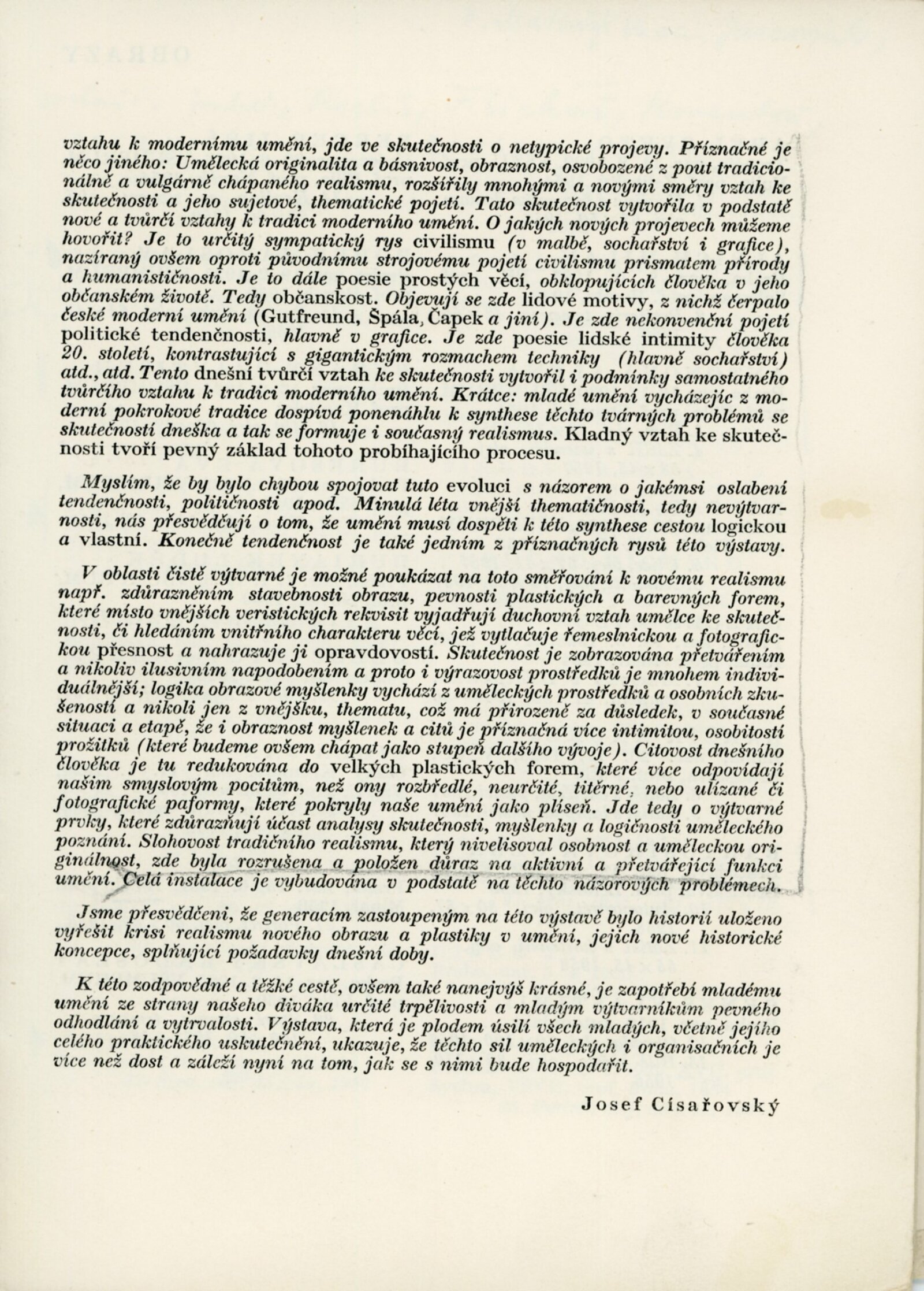 Umění mladých výtvarníků Československa. Obrazy a plastiky: Dům umění / Dům pánů z Poděbrad, I. část Obrazy a plastiky: Dům umění, 18. 5. – 29. 6. 1958, II. část Kresby a grafika: Dům pánů z Poděbrad, 25. 5. – 29. 6. 1958 / Společný katalog pro Brno a Prahu. Umění mladých výtvarníků Československa, 1958 / Text: Josef Císařovský. – Praha: Ústřední výbor ČSM, 1958. – 42 s., DU 310, DPK 6. – MZK; UPM