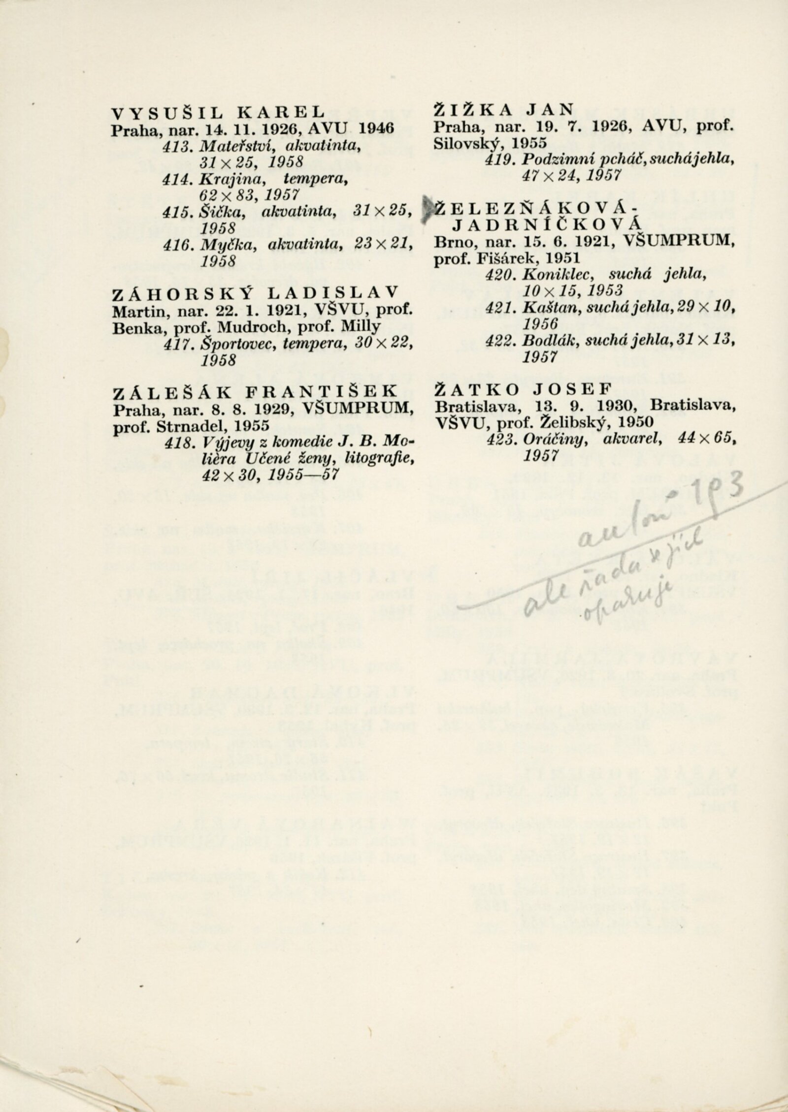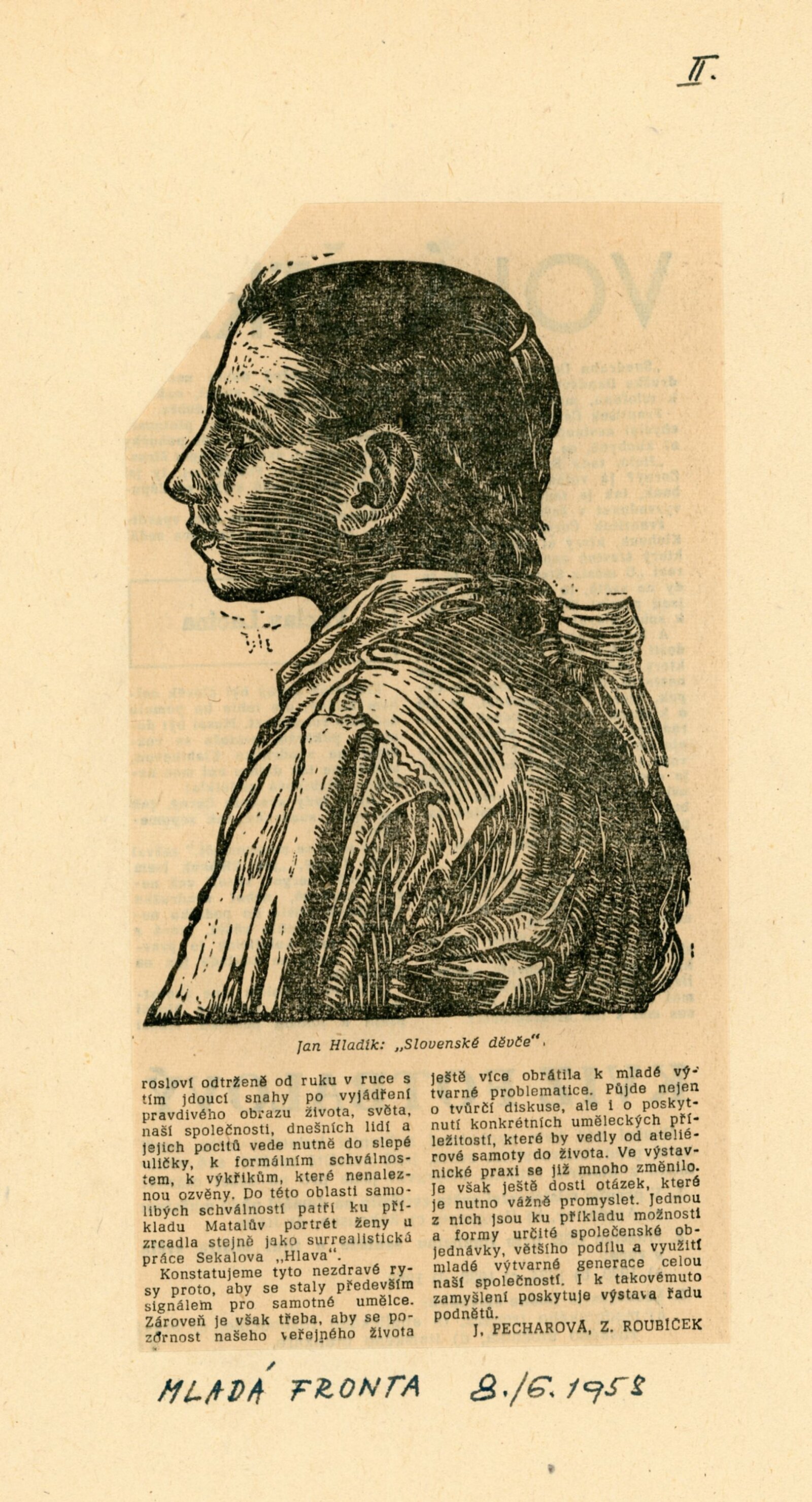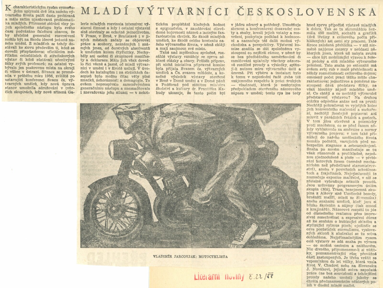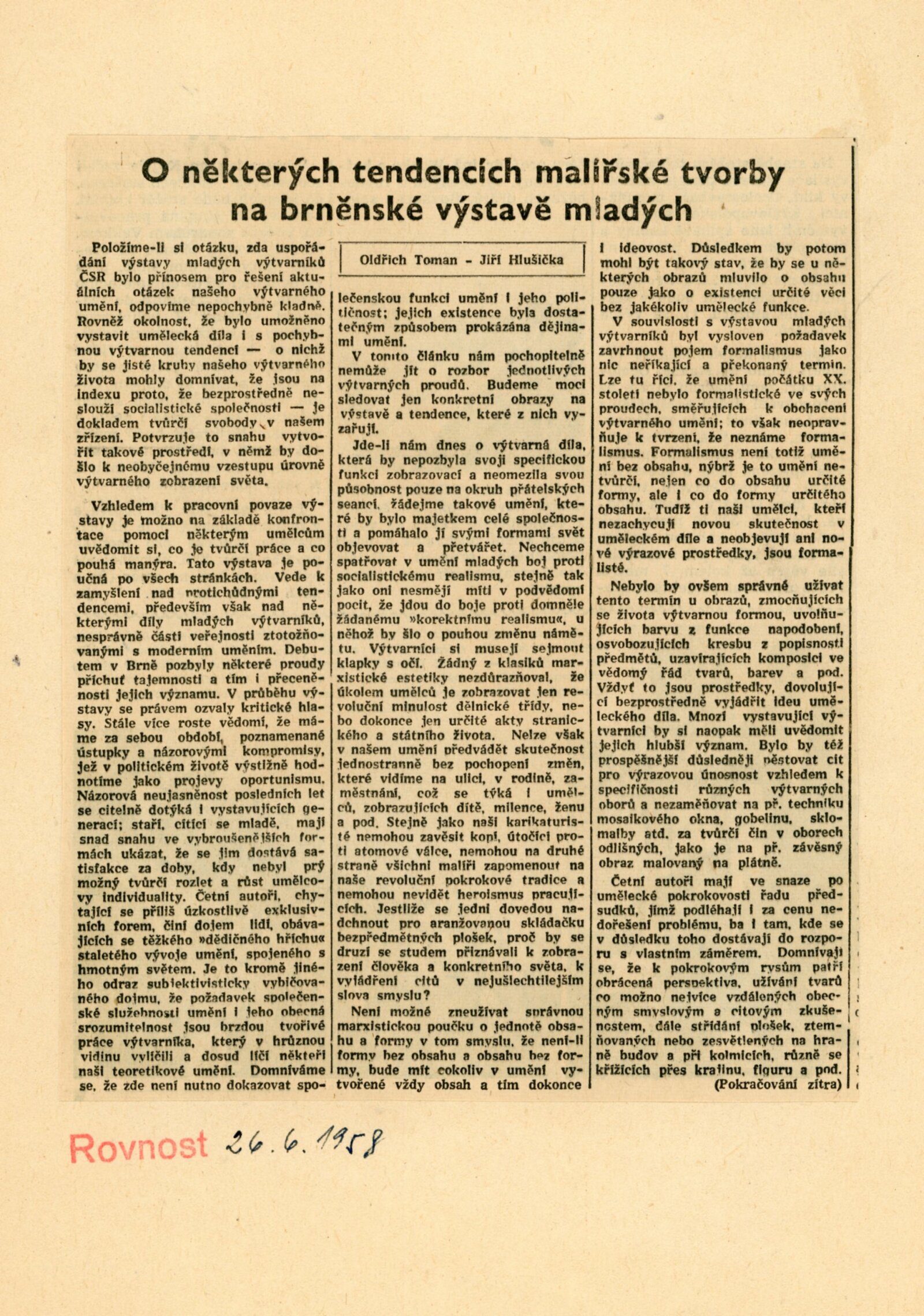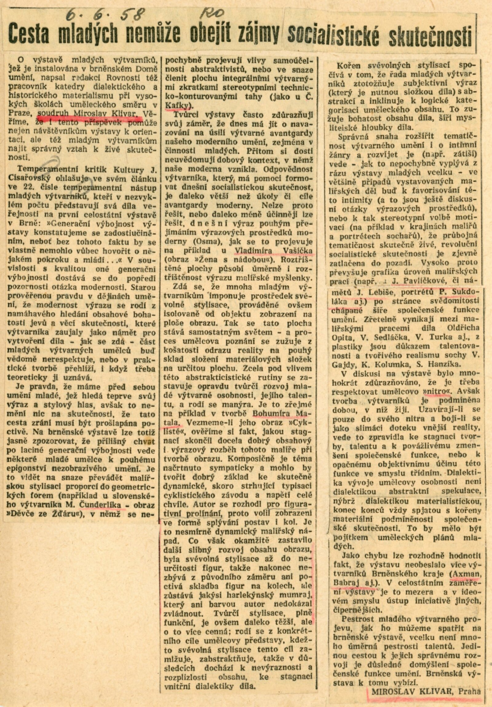 Umění mladých výtvarníků Československa. Obrazy a plastiky: Dům umění / Dům pánů z Poděbrad, I. část Obrazy a plastiky: Dům umění, 18. 5. – 29. 6. 1958, II. část Kresby a grafika: Dům pánů z Poděbrad, 25. 5. – 29. 6. 1958 / Společný katalog pro Brno a Prahu. Umění mladých výtvarníků Československa, 1958 / Text: Josef Císařovský. – Praha: Ústřední výbor ČSM, 1958. – 42 s., DU 310, DPK 6. – MZK; UPM