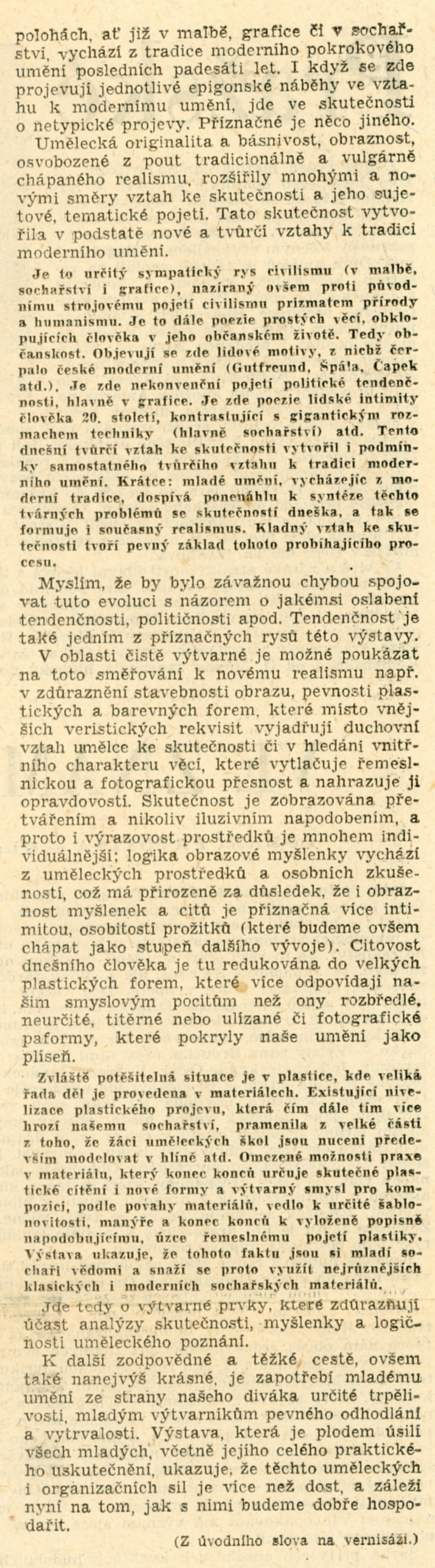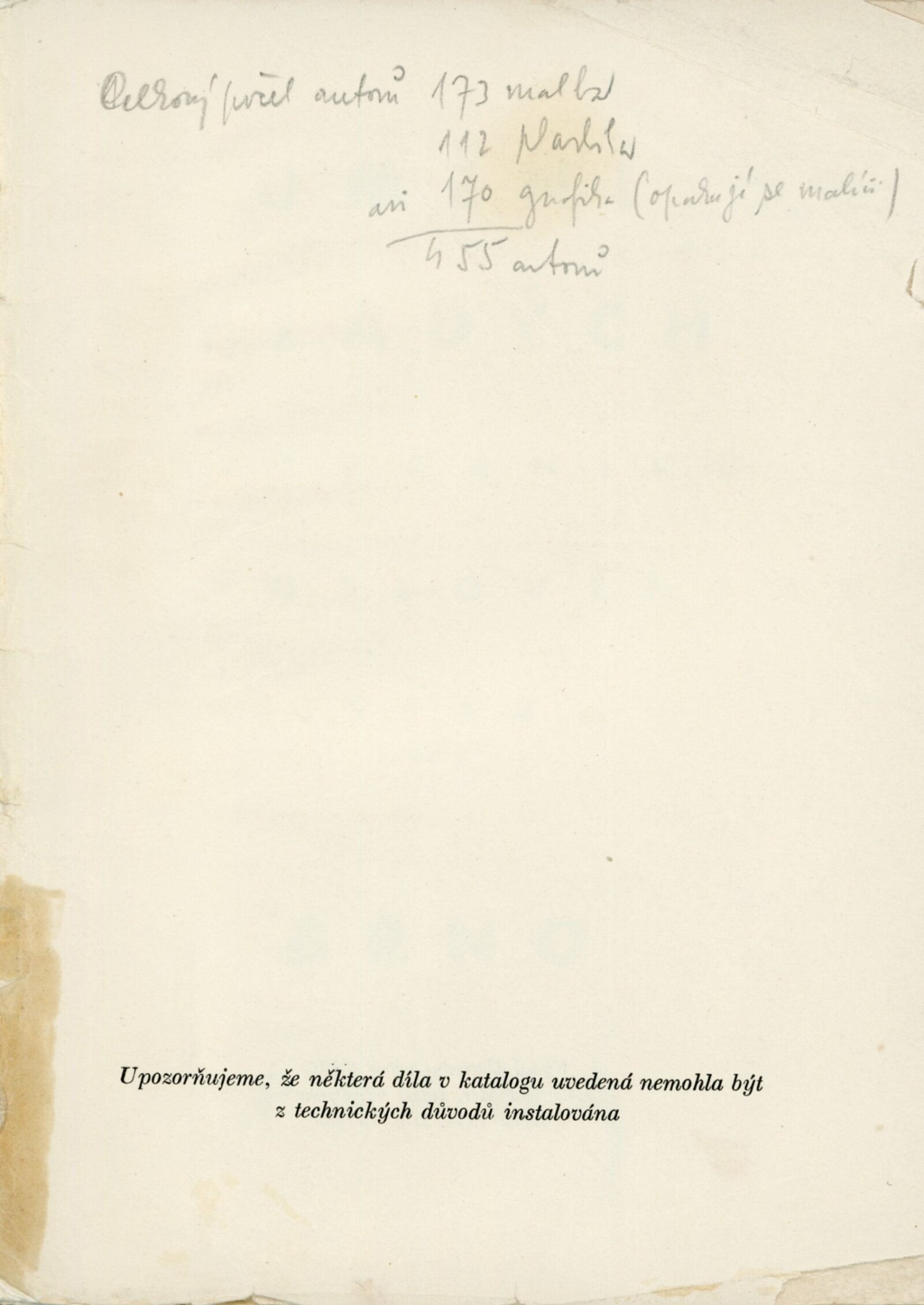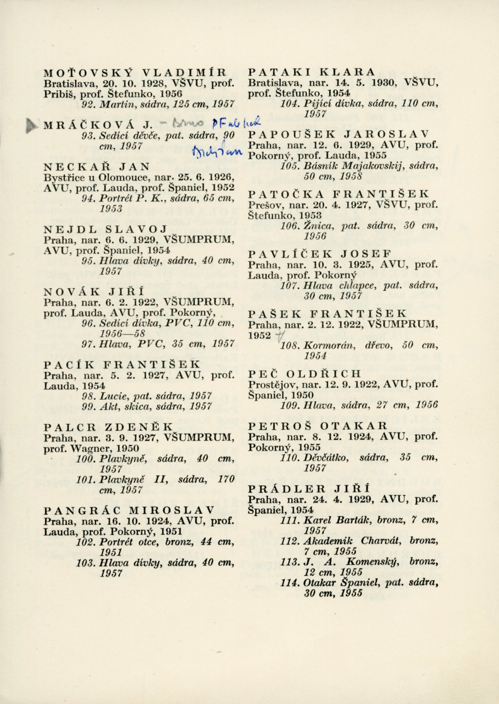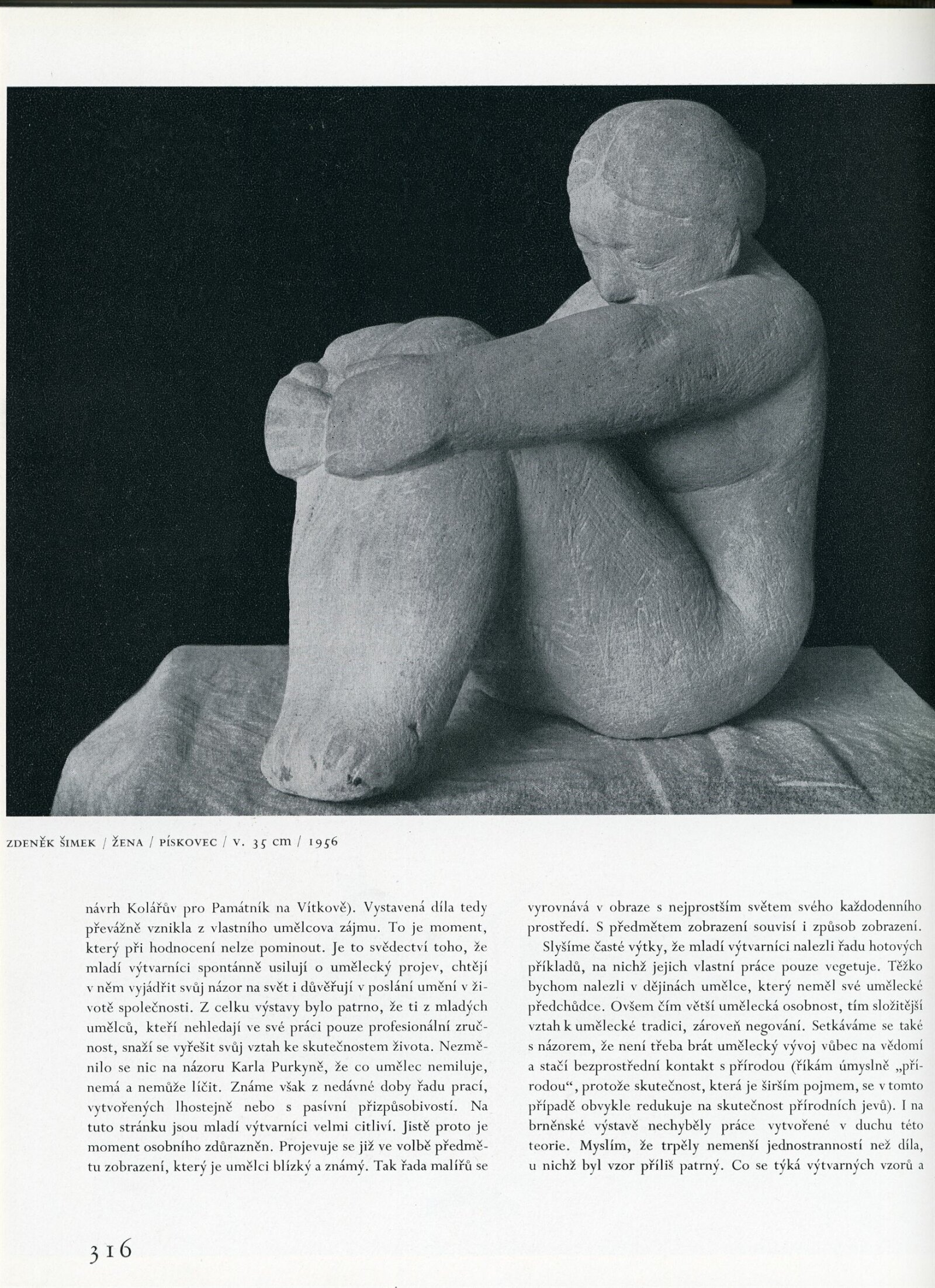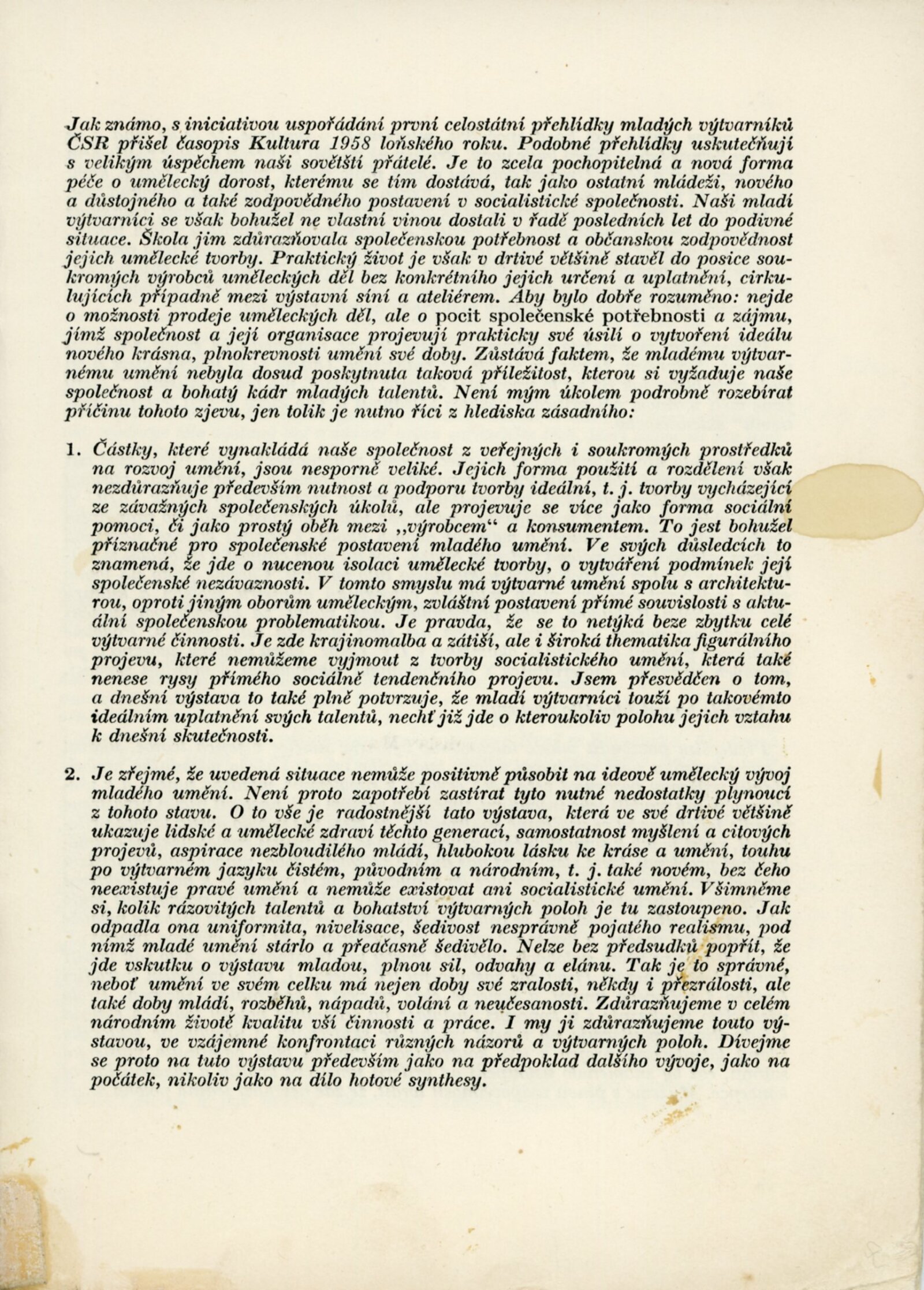 Umění mladých výtvarníků Československa. Obrazy a plastiky: Dům umění / Dům pánů z Poděbrad, I. část Obrazy a plastiky: Dům umění, 18. 5. – 29. 6. 1958, II. část Kresby a grafika: Dům pánů z Poděbrad, 25. 5. – 29. 6. 1958 / Společný katalog pro Brno a Prahu. Umění mladých výtvarníků Československa, 1958 / Text: Josef Císařovský. – Praha: Ústřední výbor ČSM, 1958. – 42 s., DU 310, DPK 6. – MZK; UPM
