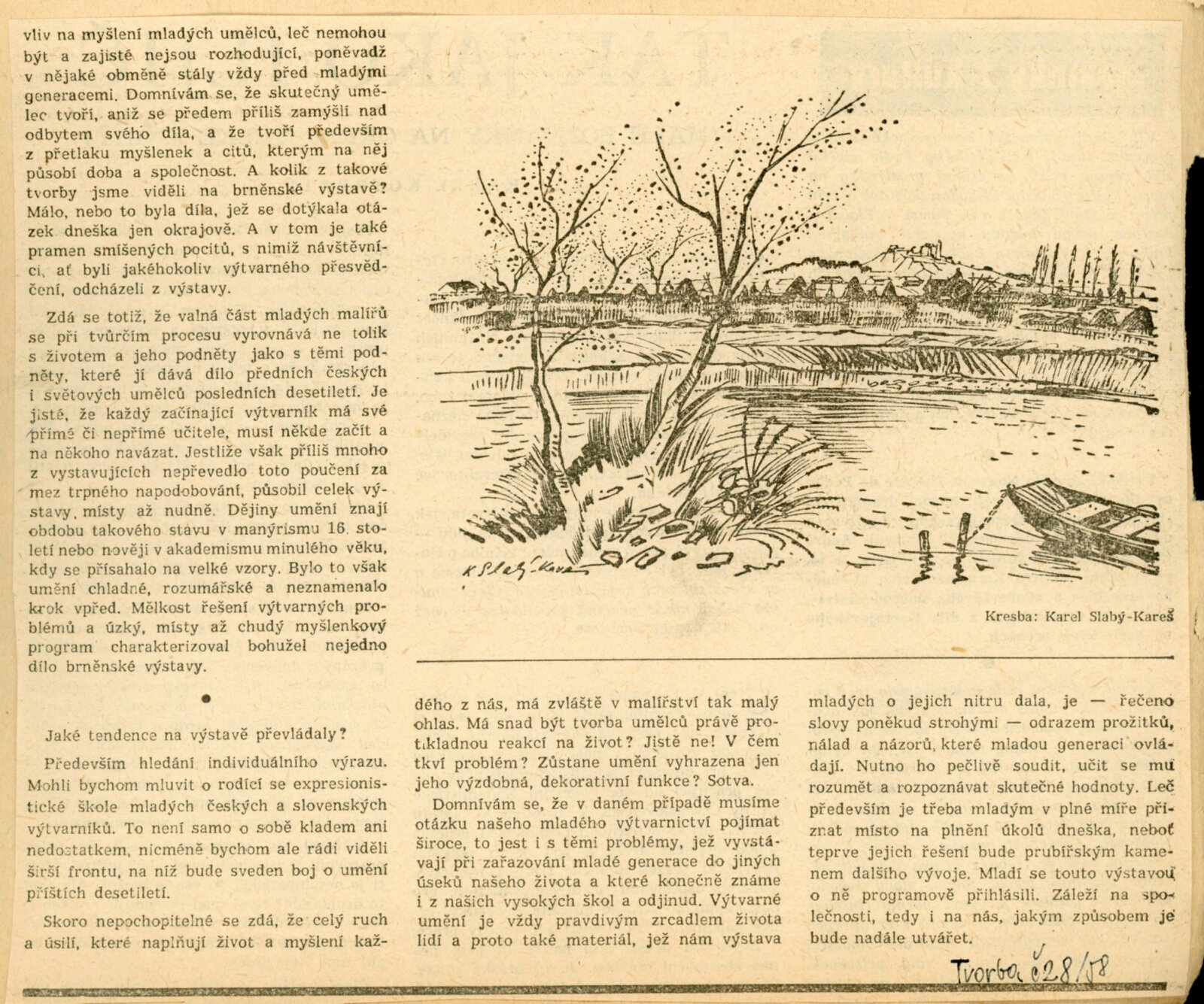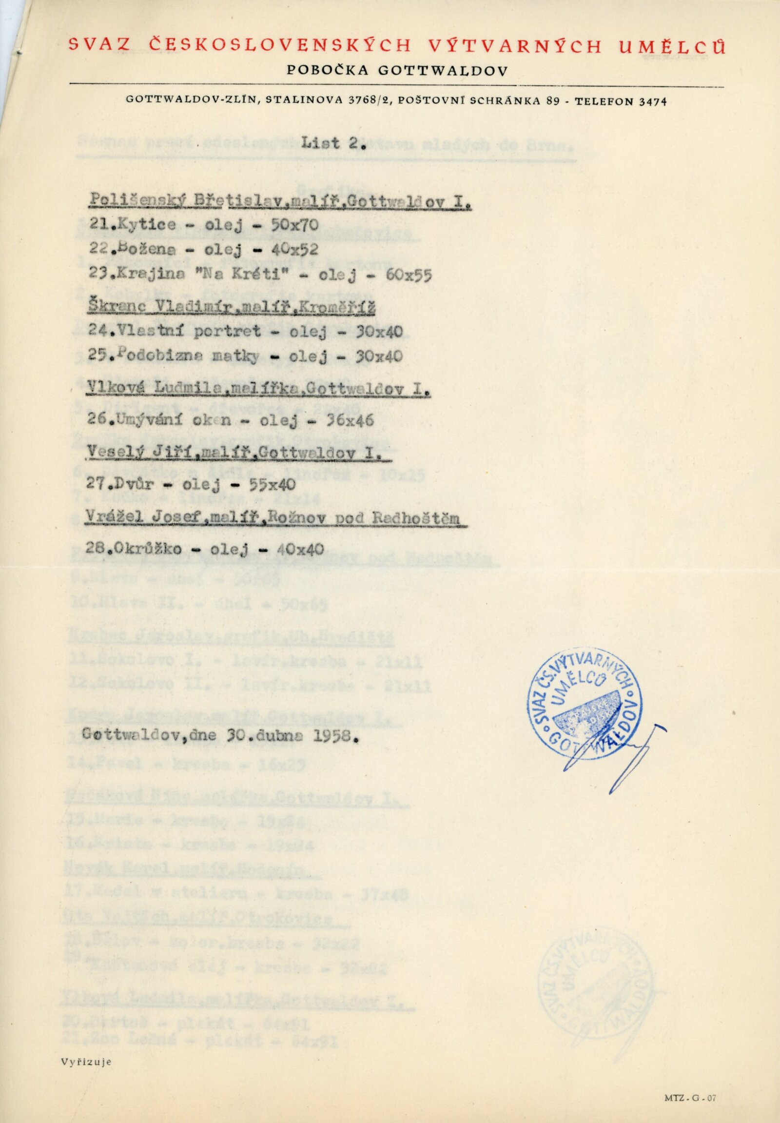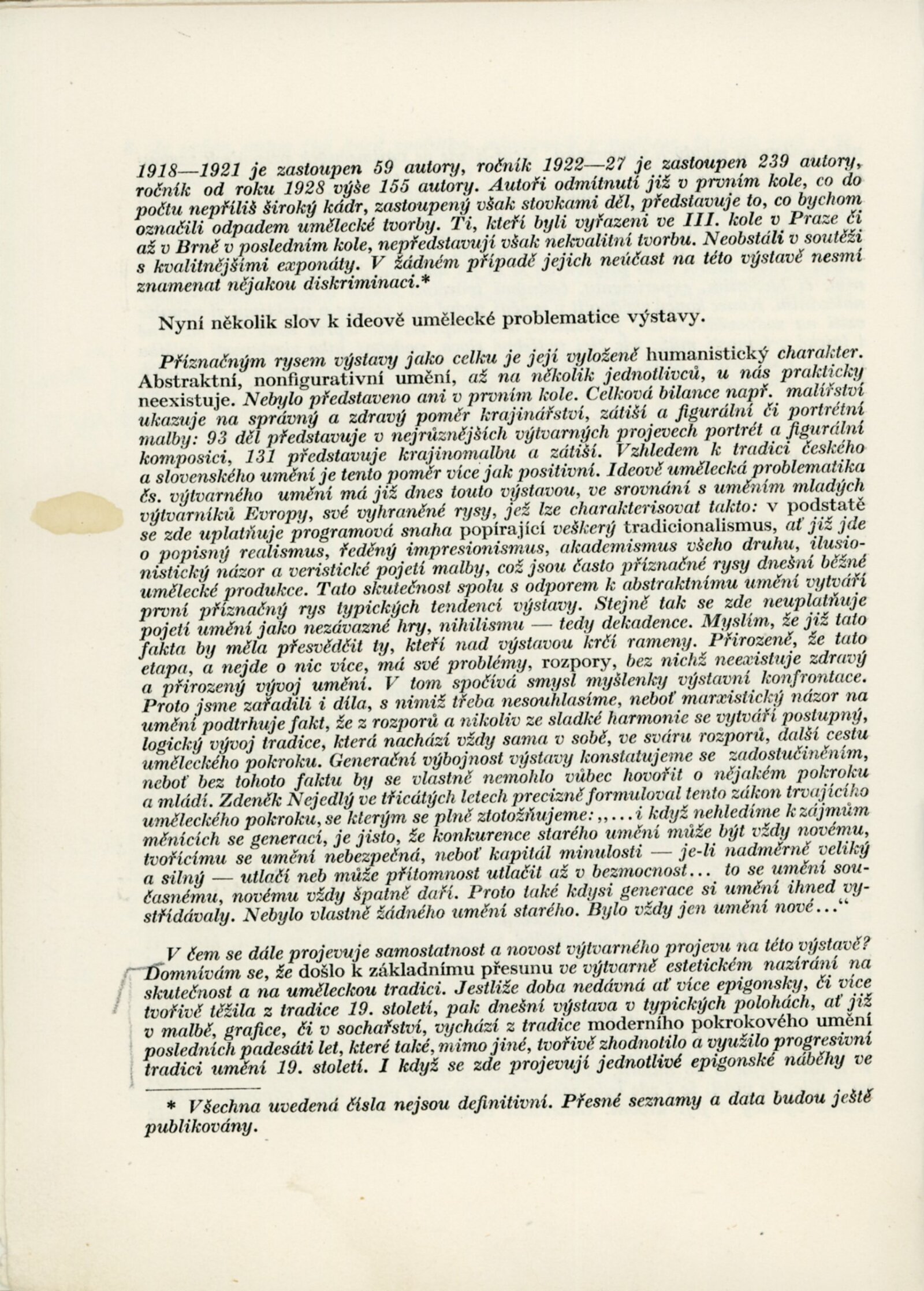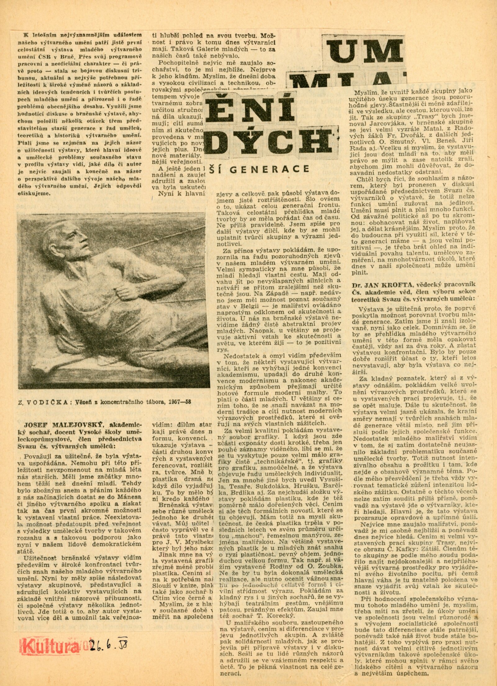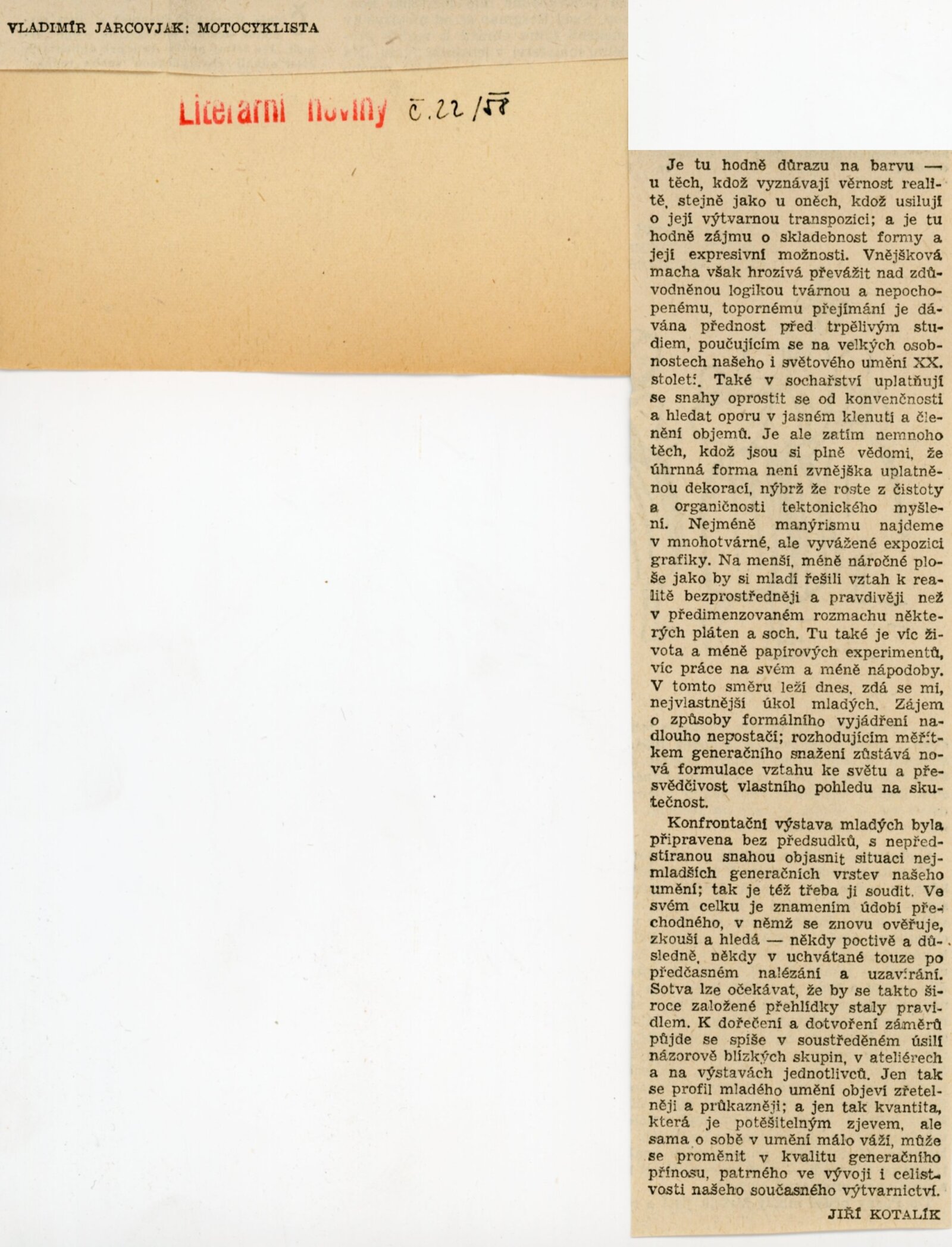 Umění mladých výtvarníků Československa. Obrazy a plastiky: Dům umění / Dům pánů z Poděbrad, I. část Obrazy a plastiky: Dům umění, 18. 5. – 29. 6. 1958, II. část Kresby a grafika: Dům pánů z Poděbrad, 25. 5. – 29. 6. 1958 / Společný katalog pro Brno a Prahu. Umění mladých výtvarníků Československa, 1958 / Text: Josef Císařovský. – Praha: Ústřední výbor ČSM, 1958. – 42 s., DU 310, DPK 6. – MZK; UPM