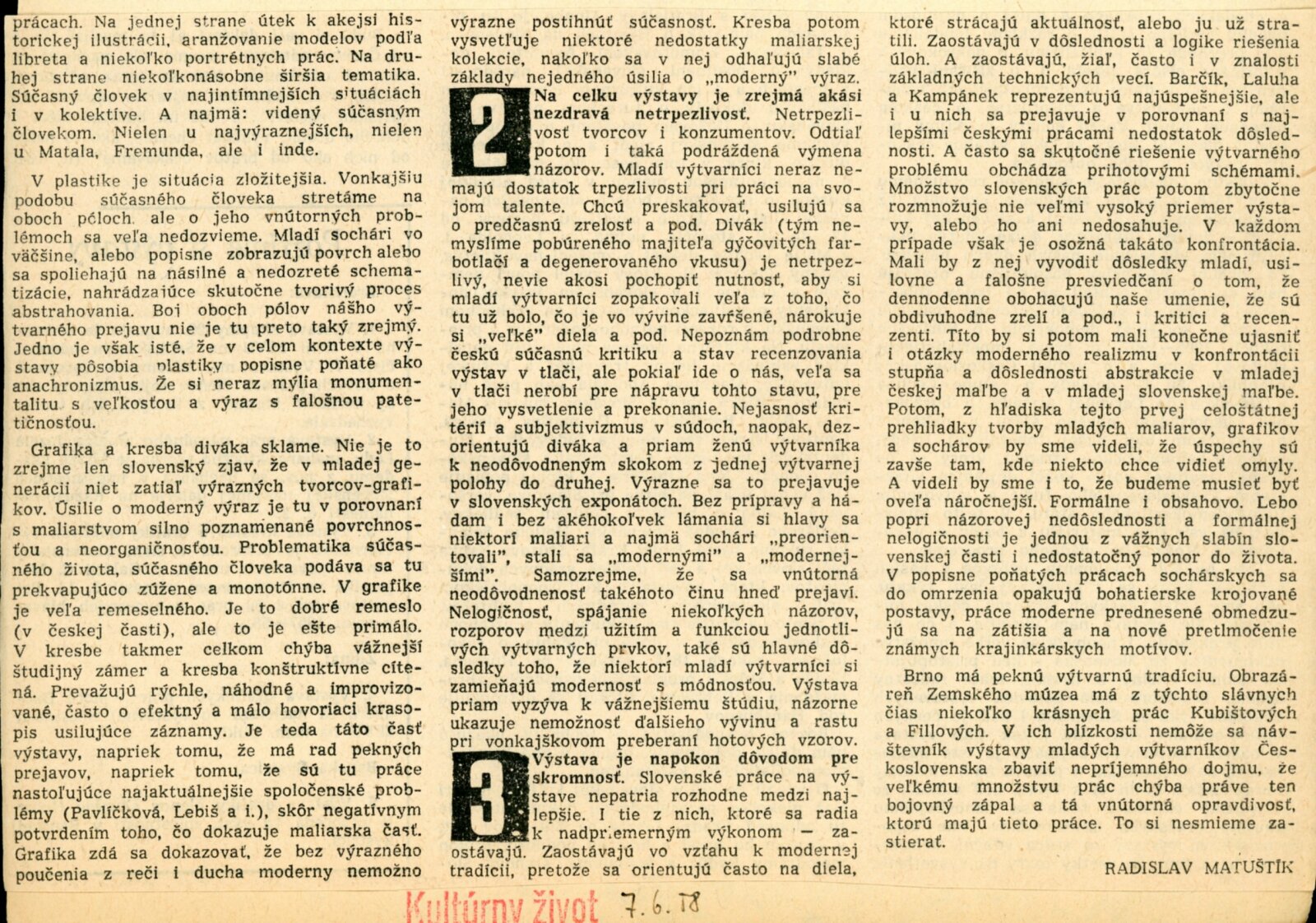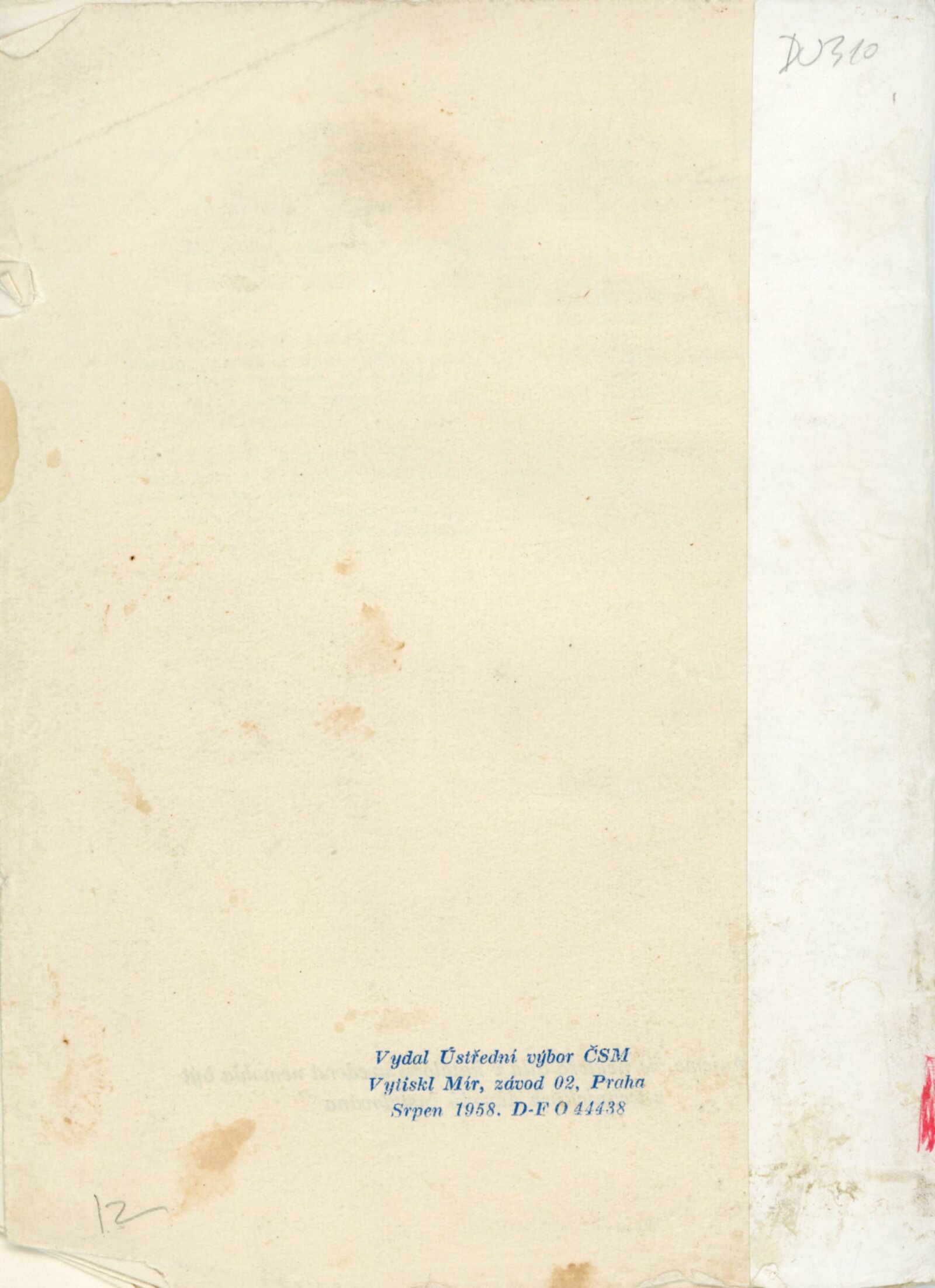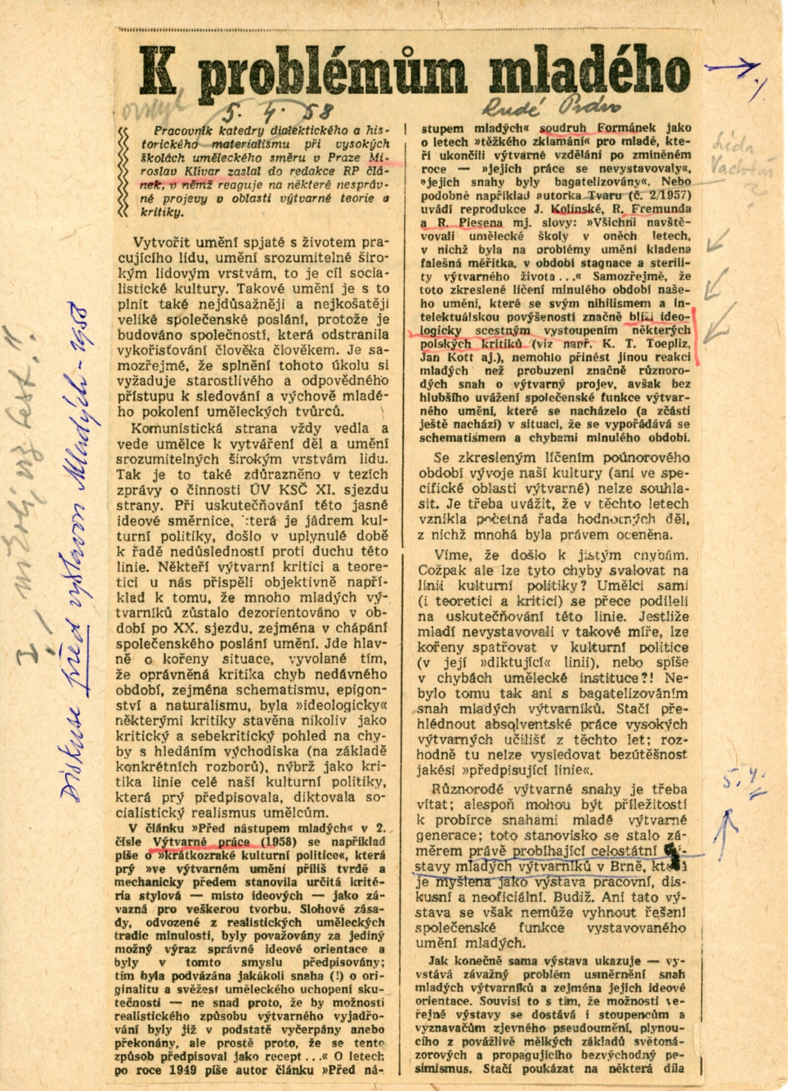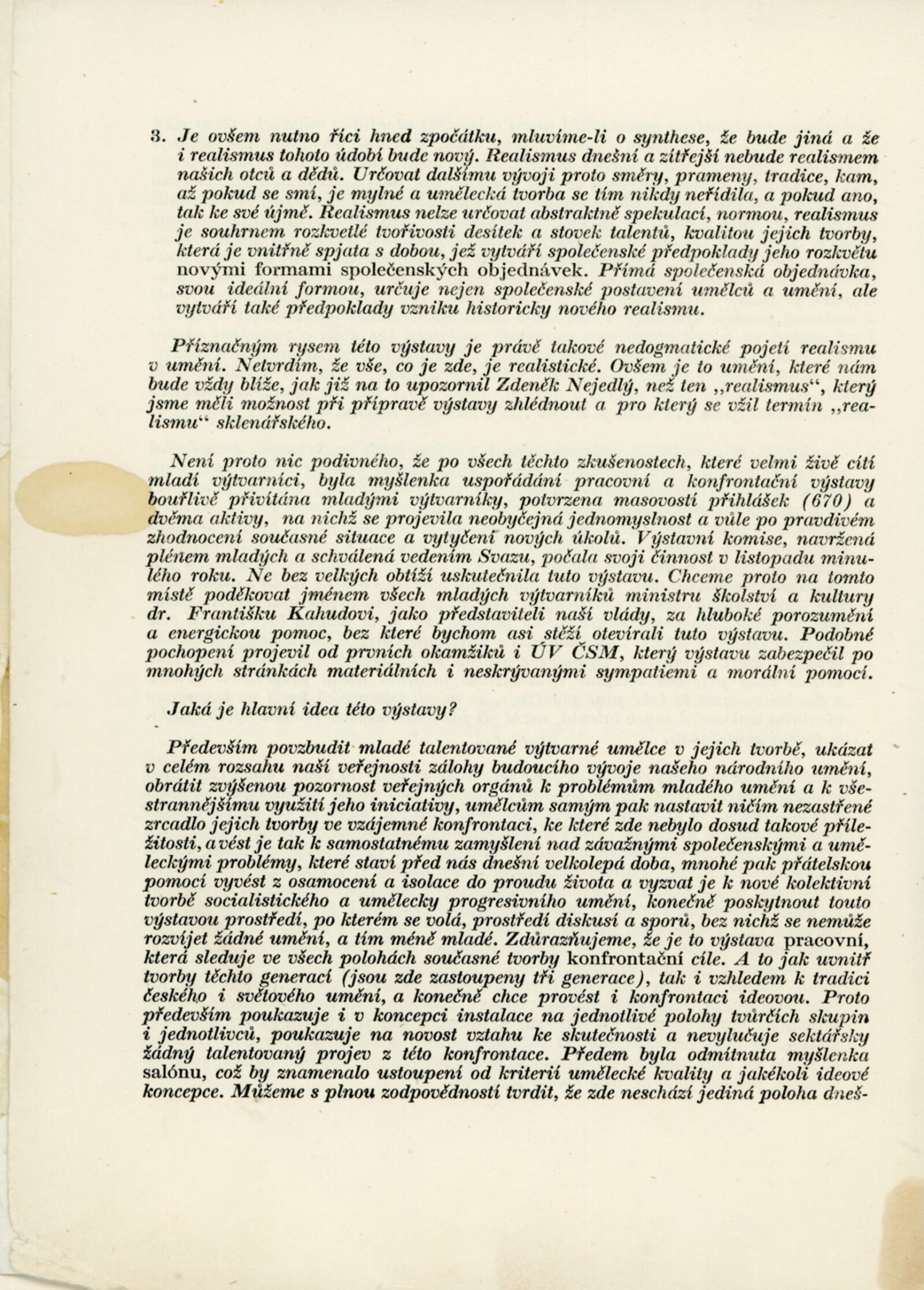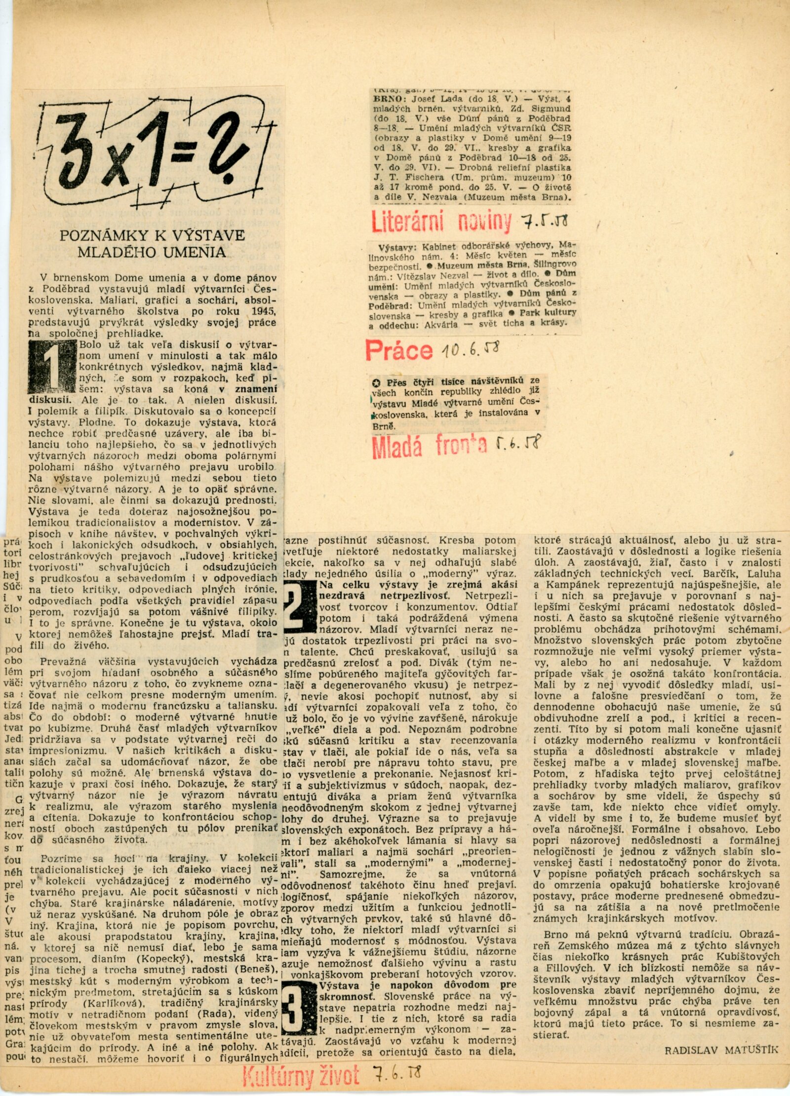 Umění mladých výtvarníků Československa. Obrazy a plastiky: Dům umění / Dům pánů z Poděbrad, I. část Obrazy a plastiky: Dům umění, 18. 5. – 29. 6. 1958, II. část Kresby a grafika: Dům pánů z Poděbrad, 25. 5. – 29. 6. 1958 / Společný katalog pro Brno a Prahu. Umění mladých výtvarníků Československa, 1958 / Text: Josef Císařovský. – Praha: Ústřední výbor ČSM, 1958. – 42 s., DU 310, DPK 6. – MZK; UPM