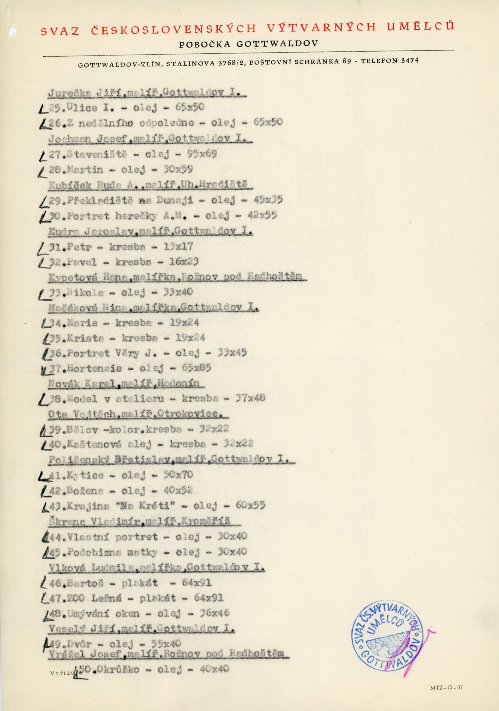 pozvánky, katalog, nabídka DU uspořádat výstavu v prostorách DU, dohoda (DU a SČSVU, podmínky realizace výstavy), rukopis V. Vašíčka, prezenční listina z tiskové konference, připomínky DU k pořádání výstavy, seznam prací z SČSVU Gottwaldov, provozní korespondence, recenze v tisku