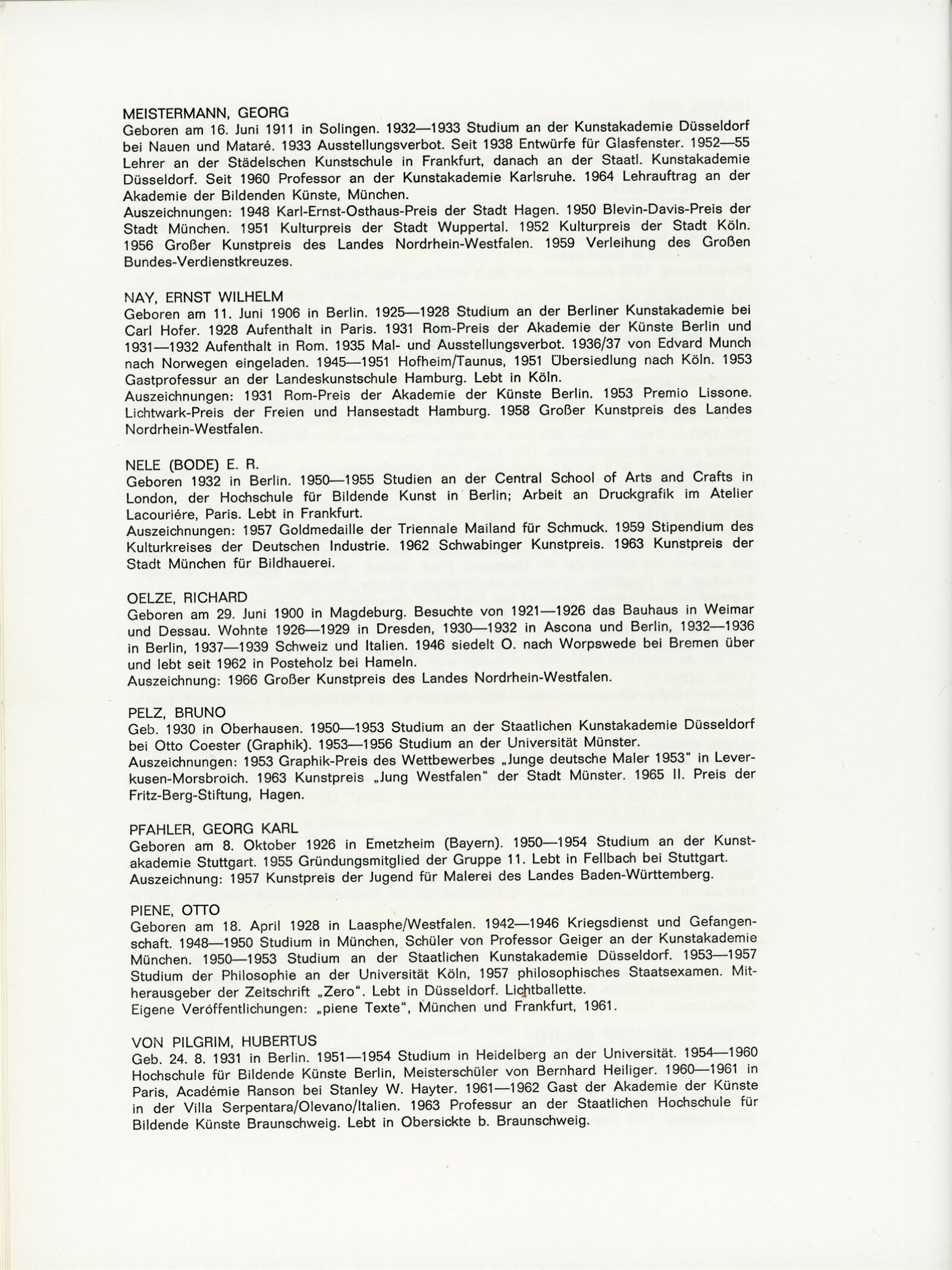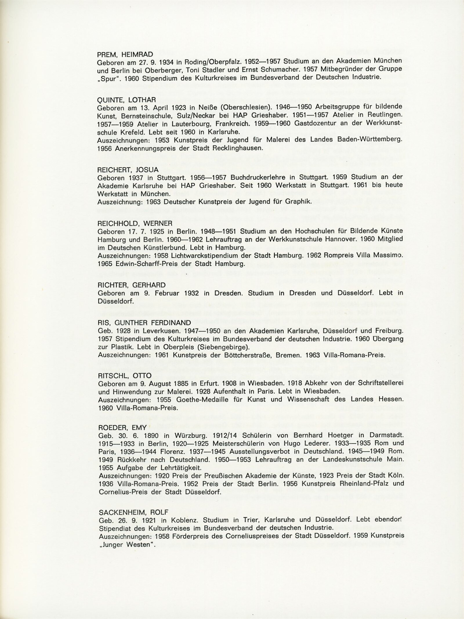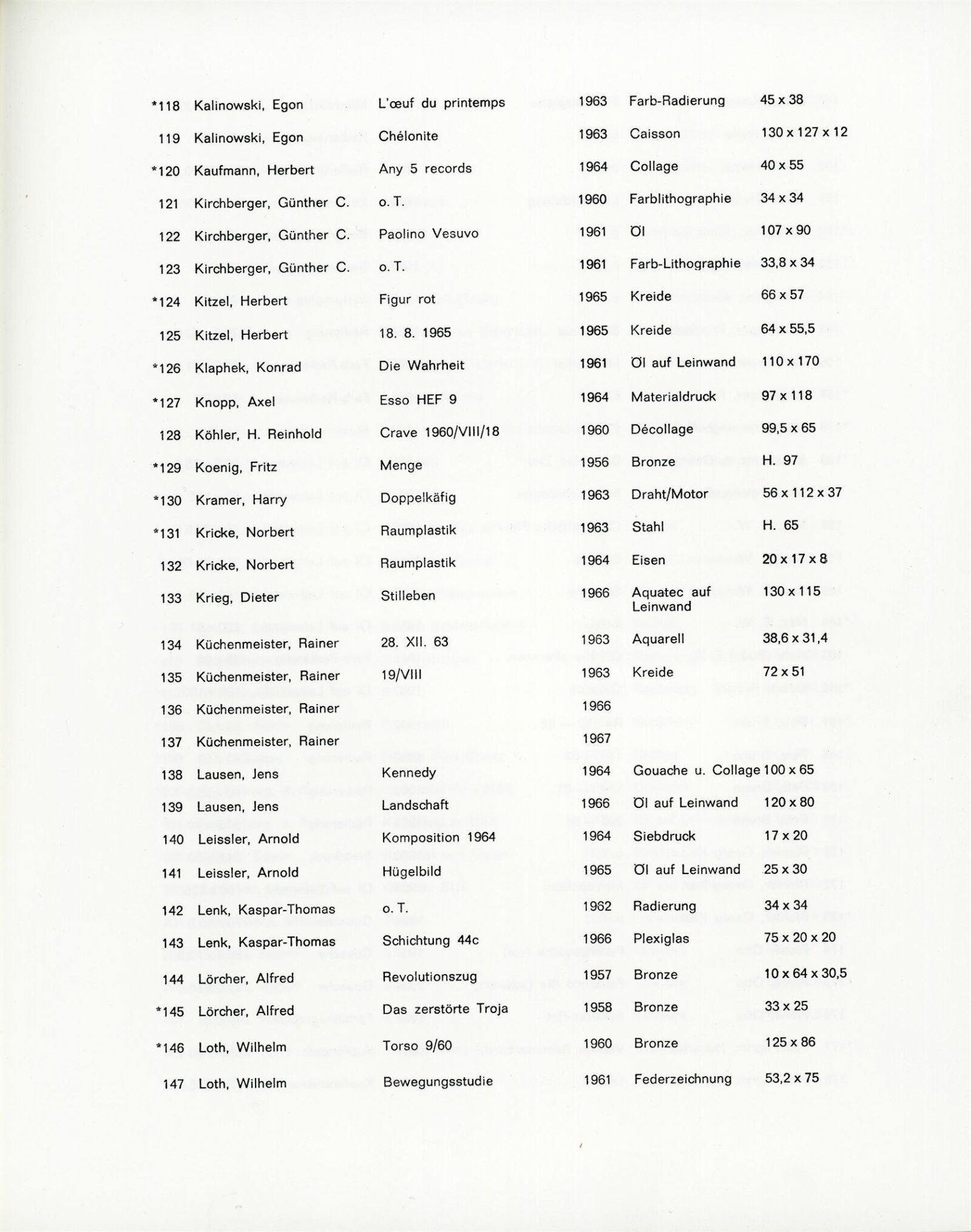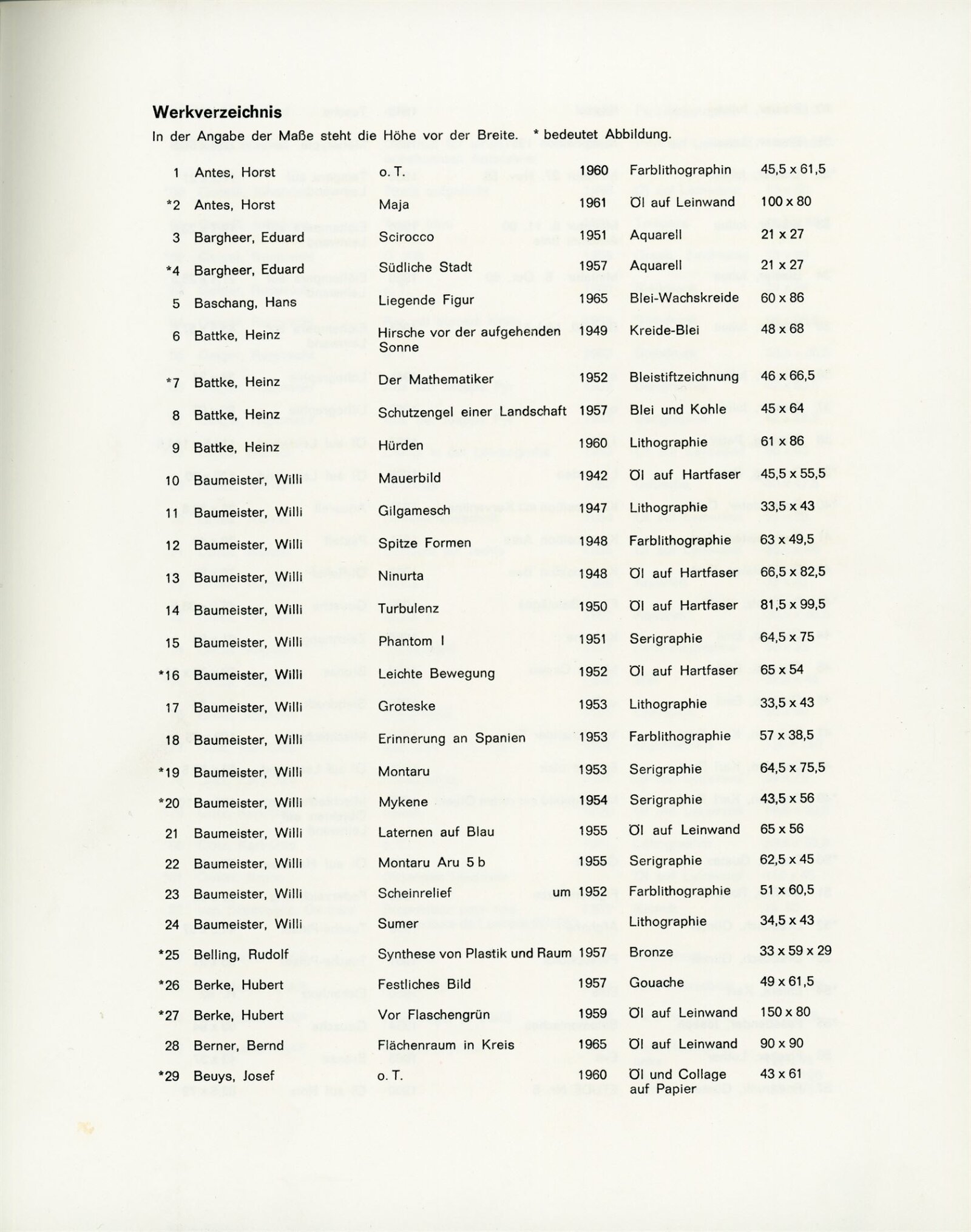 Antes Horst, Eduard Bargheer, Hans Baschang, Heinz Battke, Willi Baumeister, Rudolf Belling, Hubert Berke, Bernd Berner, Josef Beuys, Julius Bissier, Peter Brüning, Carl Buchheister, Wolff Buchholz, Emil Cimiotti, Karl Fred Dahmen, Gustav Deppe, Roland Dörfler, Günter Drebusch, Karl Ehlers, Joseph Fassbender, Lothar Fischer, Günter Fruhtrunk, Winfred Gaul, Johannes Geelli, Rupprecht Geiger, Werner Gilles, Raimund Girke, Karl-Otto Götz, Bruno Goller, Gerhard von Graevenitz, Hap Grieshaber, Thomas Grochowiak, Dieter Haack, Günter Haese, Otto Herbert Hajek, Erich Hauser, Peter Herkenrath, Ernst Hermanns, Jochen Hiltmann, Gerhard Hoehme, Oskar Holweck, Horst Janssen, Guido Jendritzko, Klaus Jürgen-Fischer, Horst-Egon Kalinowski, Herbert Kaufmann, Günter C. Kirchberger, Herbert Kitzel, Konrad Klapheck, Axel Knopp, Reinhold Köhler, Fritz Koenig, Harry Kramer, Norbert Kricke, Dieter Krieg, Rainer Küchenmeister, Jens Lausen, Arnold Leissler, Kaspar-Thomas Lenk, Alfred Lörcher, Wilhelm Loth, Konrad Lueg, Heinz Mack, Almir Mavignier, Friedrich Meckseper, Brigitte Meier-Denninghoff, Georg Meistermann, Ernst Wilhelm Nay, E. R. Nele (Bode), Richard Oelze, Bruno Pelz, Georg Karl Pfahler, Otto Piene, Hubertus von Pilgrim, Heimrad Prem, Lothar Quinte, Josua Reichert, Werner Reichhold, Gerhard Richter, Ferdinand Gunther, Otto Ritschl, Emy Roeder, Rolf Sackenheim, Armin Sandig, Gustav Seitz, Sonderborg (K. R. Hoffmann), Edwin Scharff, Hans-Jürgen Schlieker, Michael Schoenholtz, Rudolf Schoofs, Johannes Schreiter, Bernard Schultze, Emil Schumacher, Toni Stadler, Walter Stöhrer, Norbert Tadeusz, Hans Thiemann, Heinz Thökes, Günter Uecker, Bernd Völkle, Wolf Vostell, Hans Werdehausen, Werthmann Friedrich, Wilhelm Wessel, Irmgart Wessel-Zumloch, Fritz Winter, Paul Wunderlich, Mac Zimmermann