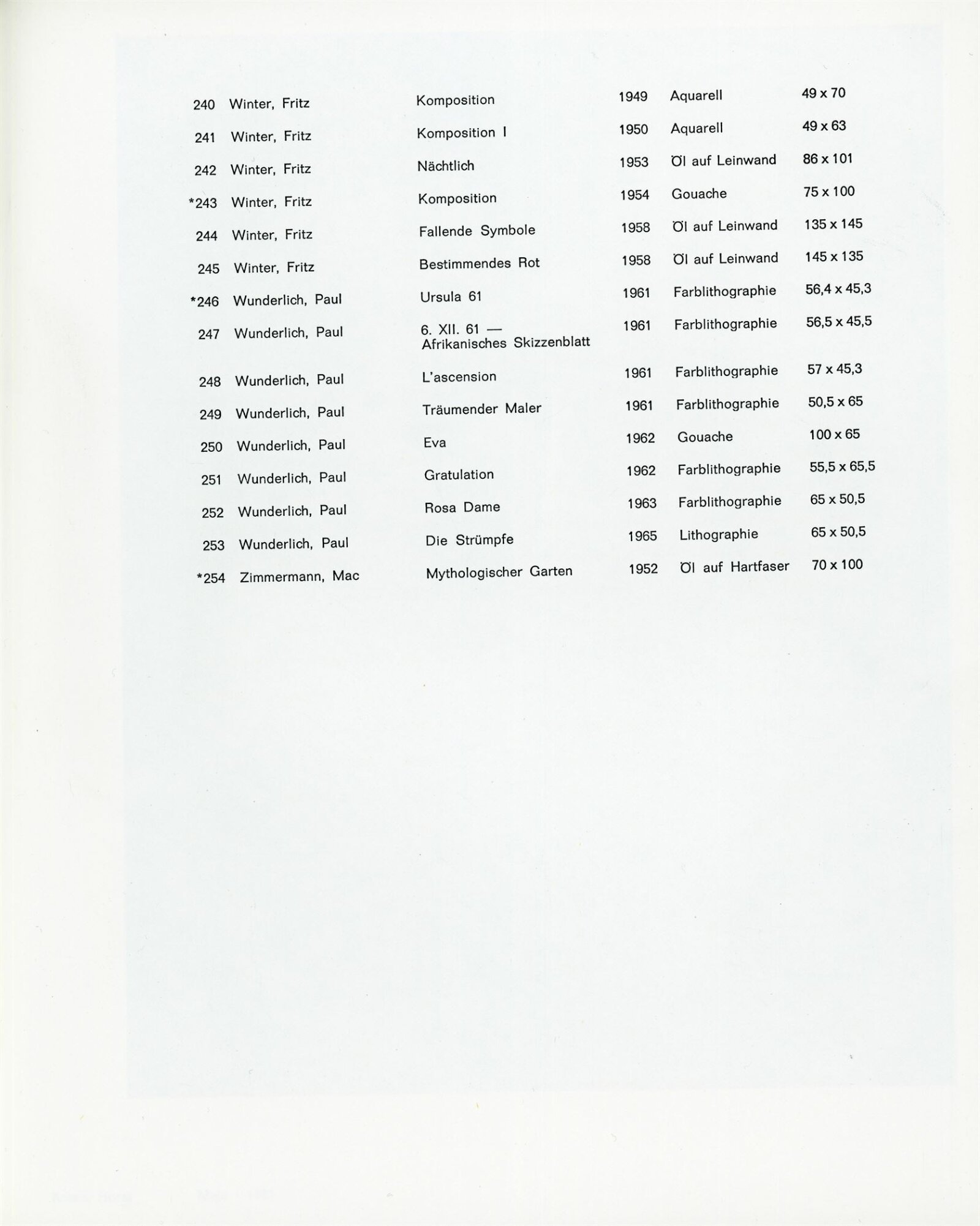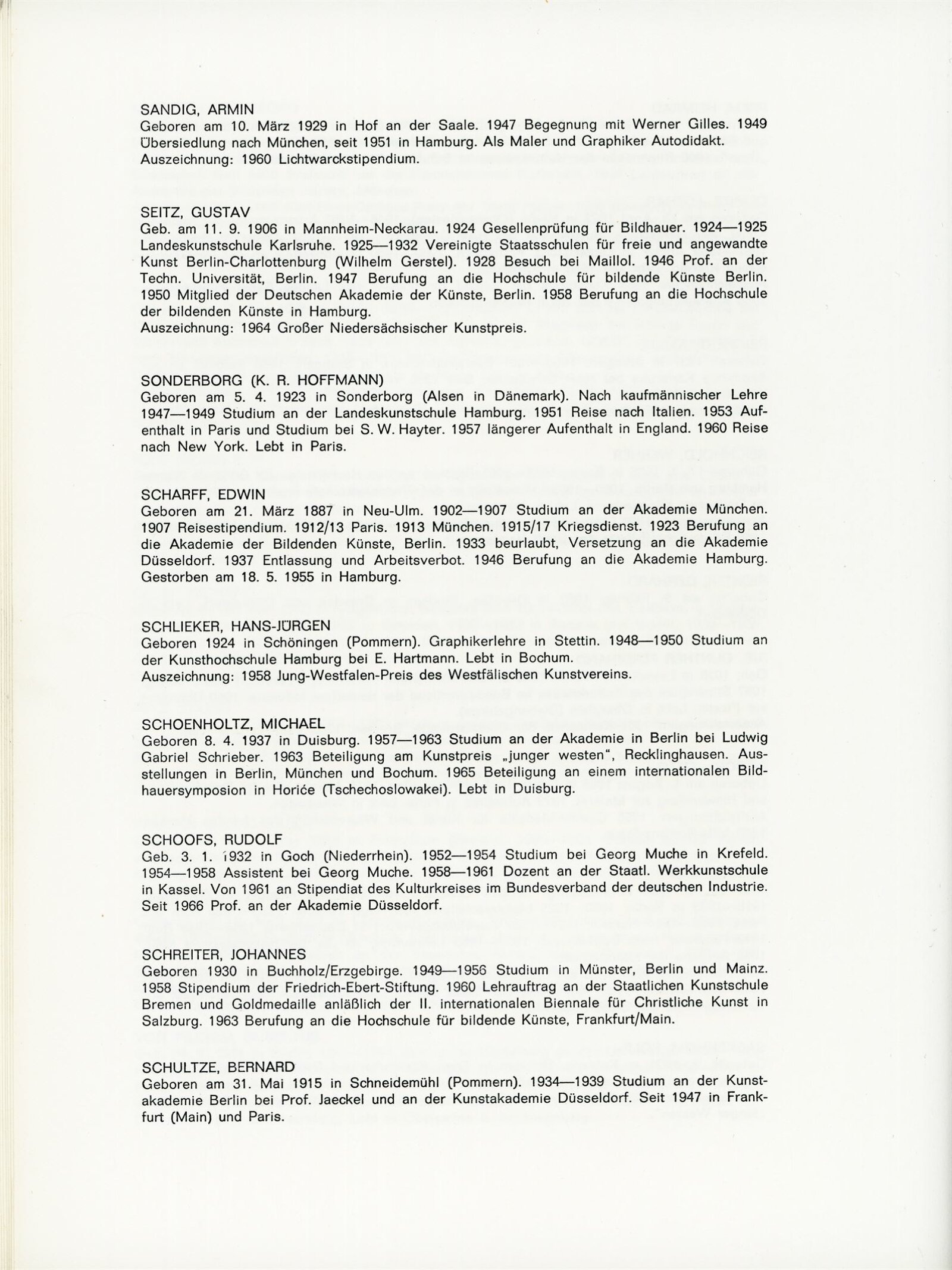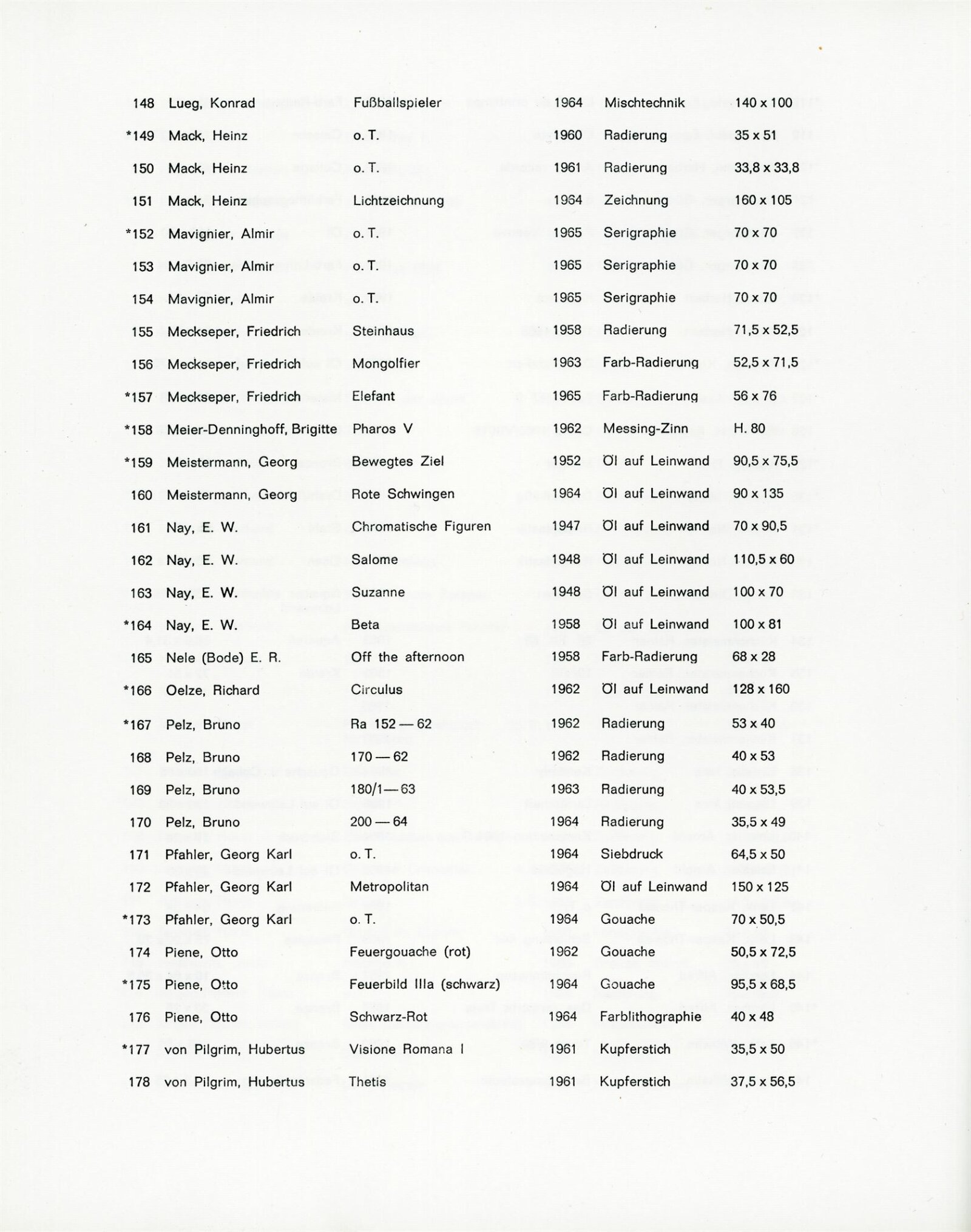 Antes Horst, Eduard Bargheer, Hans Baschang, Heinz Battke, Willi Baumeister, Rudolf Belling, Hubert Berke, Bernd Berner, Josef Beuys, Julius Bissier, Peter Brüning, Carl Buchheister, Wolff Buchholz, Emil Cimiotti, Karl Fred Dahmen, Gustav Deppe, Roland Dörfler, Günter Drebusch, Karl Ehlers, Joseph Fassbender, Lothar Fischer, Günter Fruhtrunk, Winfred Gaul, Johannes Geelli, Rupprecht Geiger, Werner Gilles, Raimund Girke, Karl-Otto Götz, Bruno Goller, Gerhard von Graevenitz, Hap Grieshaber, Thomas Grochowiak, Dieter Haack, Günter Haese, Otto Herbert Hajek, Erich Hauser, Peter Herkenrath, Ernst Hermanns, Jochen Hiltmann, Gerhard Hoehme, Oskar Holweck, Horst Janssen, Guido Jendritzko, Klaus Jürgen-Fischer, Horst-Egon Kalinowski, Herbert Kaufmann, Günter C. Kirchberger, Herbert Kitzel, Konrad Klapheck, Axel Knopp, Reinhold Köhler, Fritz Koenig, Harry Kramer, Norbert Kricke, Dieter Krieg, Rainer Küchenmeister, Jens Lausen, Arnold Leissler, Kaspar-Thomas Lenk, Alfred Lörcher, Wilhelm Loth, Konrad Lueg, Heinz Mack, Almir Mavignier, Friedrich Meckseper, Brigitte Meier-Denninghoff, Georg Meistermann, Ernst Wilhelm Nay, E. R. Nele (Bode), Richard Oelze, Bruno Pelz, Georg Karl Pfahler, Otto Piene, Hubertus von Pilgrim, Heimrad Prem, Lothar Quinte, Josua Reichert, Werner Reichhold, Gerhard Richter, Ferdinand Gunther, Otto Ritschl, Emy Roeder, Rolf Sackenheim, Armin Sandig, Gustav Seitz, Sonderborg (K. R. Hoffmann), Edwin Scharff, Hans-Jürgen Schlieker, Michael Schoenholtz, Rudolf Schoofs, Johannes Schreiter, Bernard Schultze, Emil Schumacher, Toni Stadler, Walter Stöhrer, Norbert Tadeusz, Hans Thiemann, Heinz Thökes, Günter Uecker, Bernd Völkle, Wolf Vostell, Hans Werdehausen, Werthmann Friedrich, Wilhelm Wessel, Irmgart Wessel-Zumloch, Fritz Winter, Paul Wunderlich, Mac Zimmermann