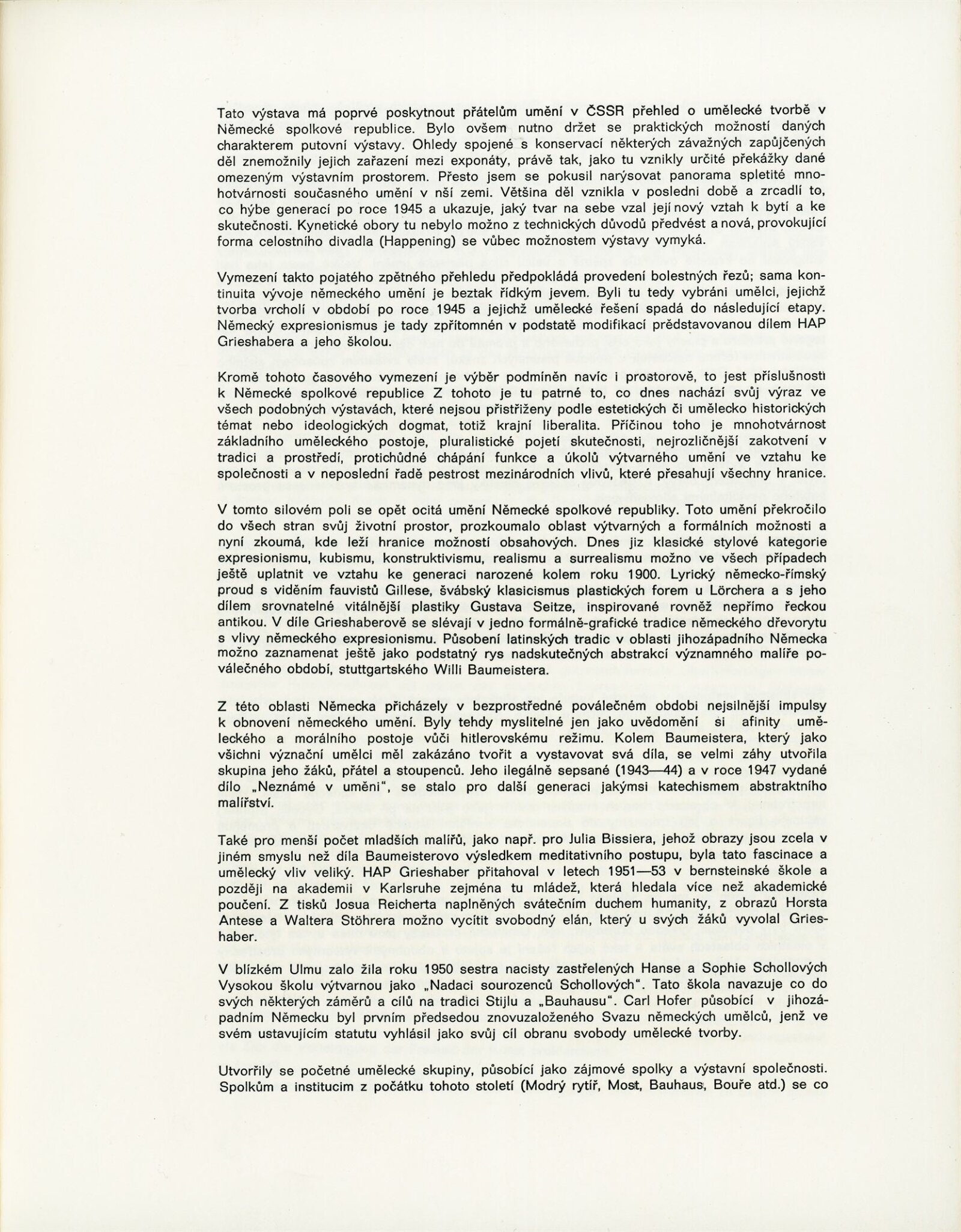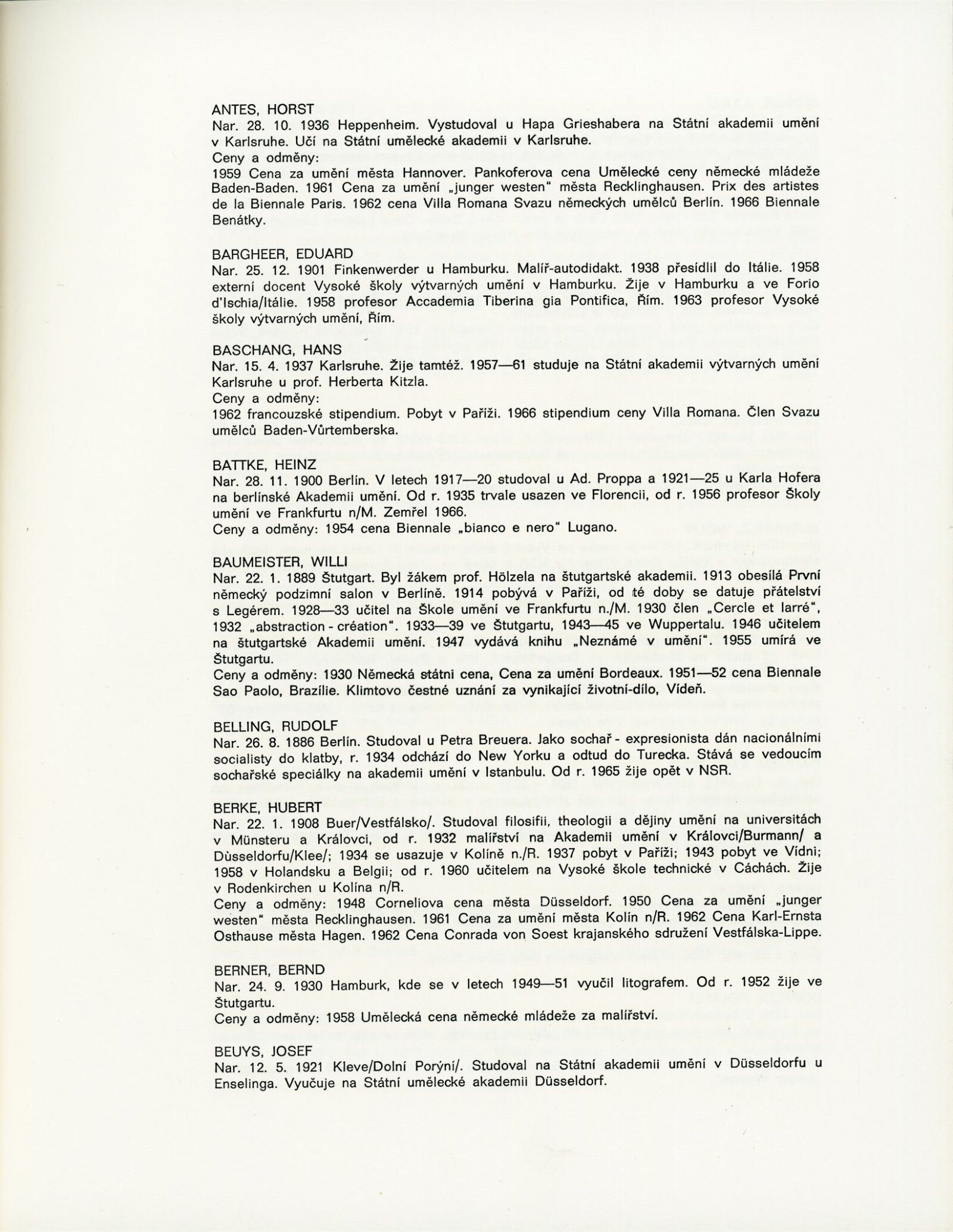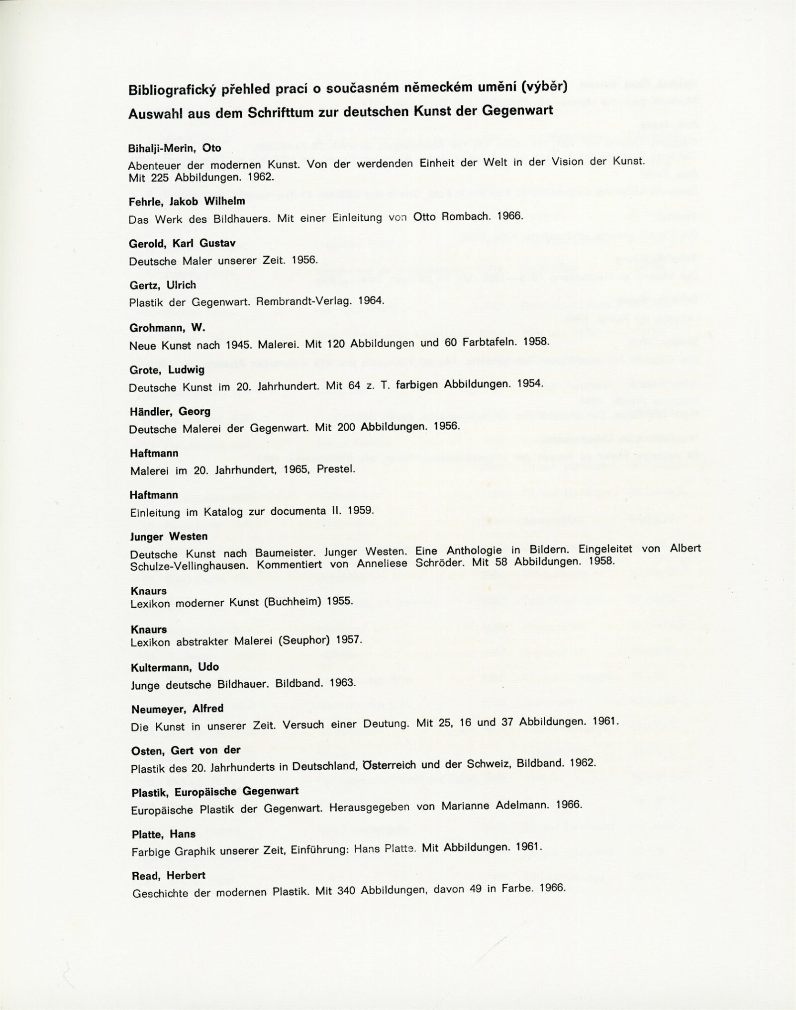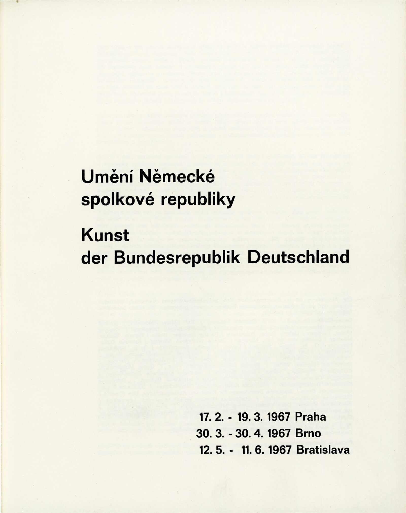 Umění Německé spolkové republiky. Kunst der Bundesrepublik Deutschland: Dům umění, 1. patro, 30. 3. – 30. 4. 1967 / Text: Petr Leo. – Bochum: Städtische Kunstgalerie, 1967. – 42 s., 92 s. obr. příl., DU 480