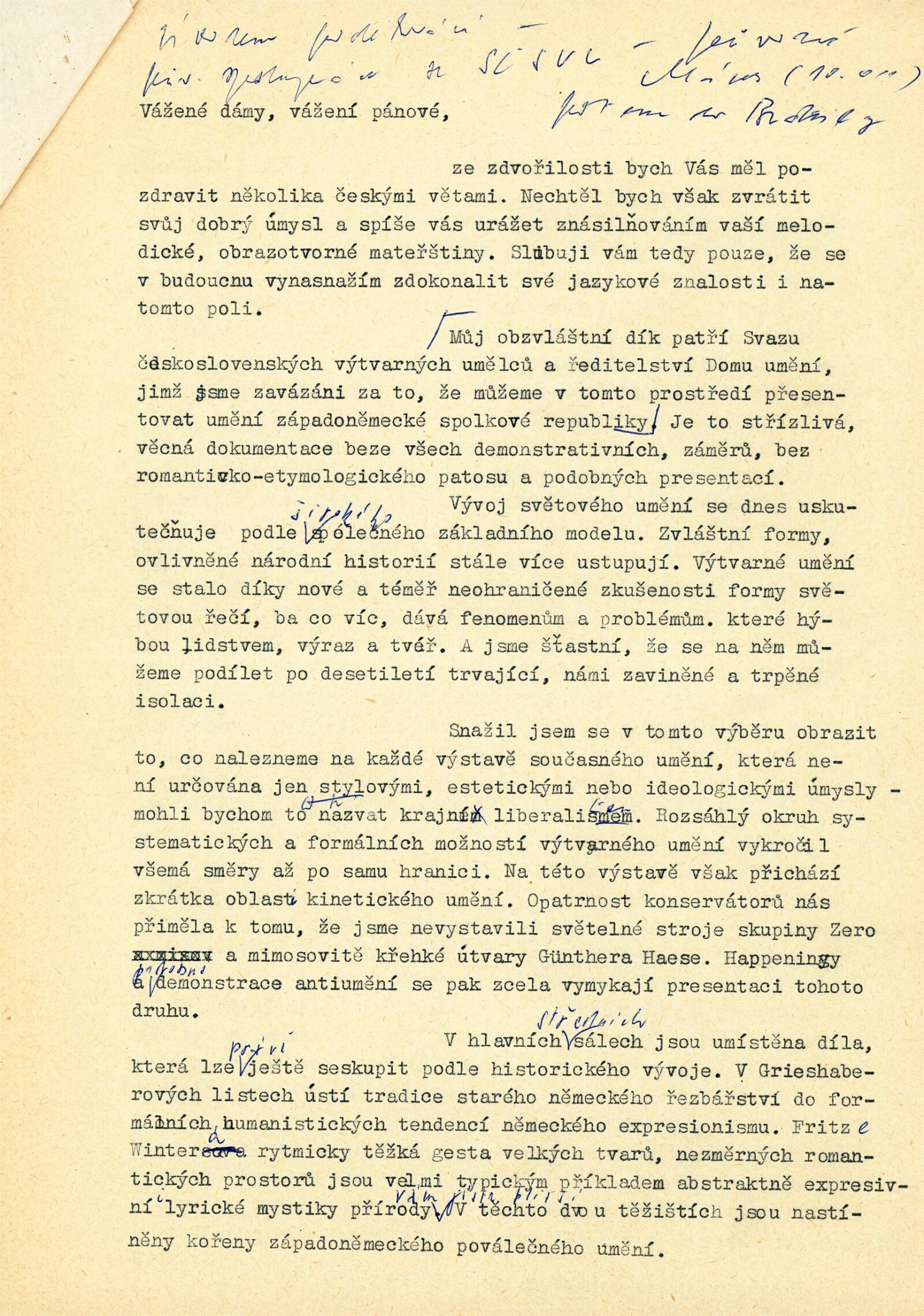 pozvánka, katalog, projev na vernisáži, seznam prací, fotografie (z vernisáže, několik děl), korespondence (s Dr. Leem, SČSVU, SNG), recenze v tisku