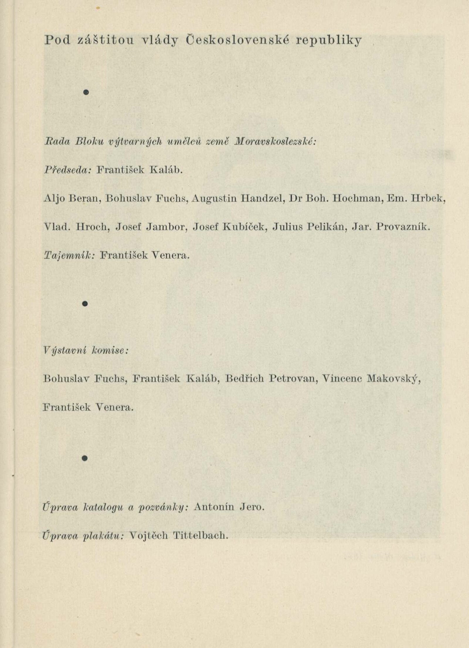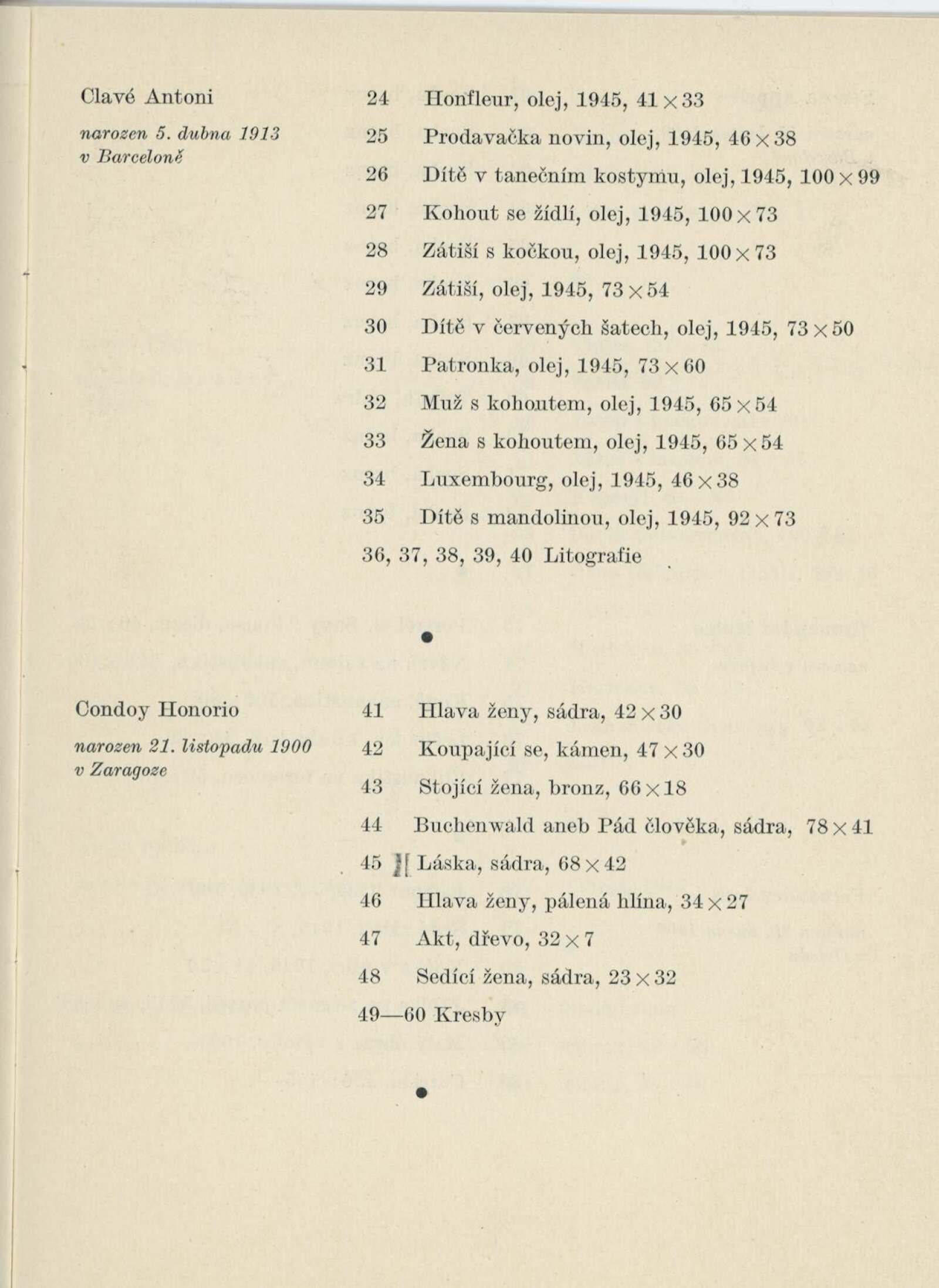 Umění republikánského Španělska. Španělští umělci pařížské školy. Druhá výstava Bloku: Dům umění, 23. 3. – 14. 4. 1946 / Text: Frédéric Delanglade. – Brno: Blok, 1946. – 32 s., obr., básně Paula Éluarda, Tristana Tzary, životní data vystavujících, DU 12. – MG; AMB; MMB