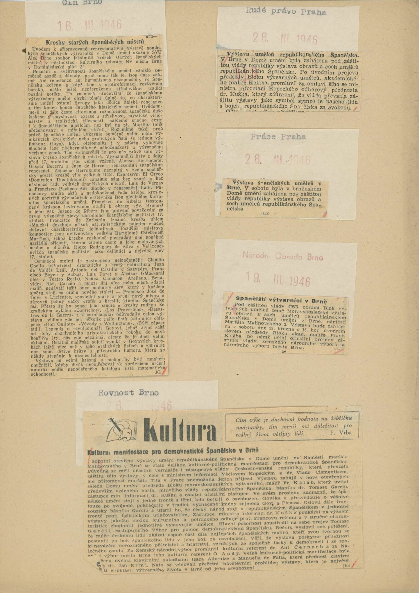katalog, úvodní proslov, projev T. Garcii, upozornění na výstavu institucím, provozní korespondence, soupisy zakoupených a odebraných obrazů, pojištění, zpráva a korespondence o návštěvě umělců: Antoni Clavé, Manuel Adsuara, Pedro Flores, Joaquin Peinado, Appelles Fenosa, Baltazar Lobo 7. – 11. 2. 1946, pojištění na přepravu, katalog výstavy v budově SVU Mánes, 30. 1. – 23. 5. 1946, potvrzení o převzetí prodaných obrazů, text o výstavě, recenze v tisku