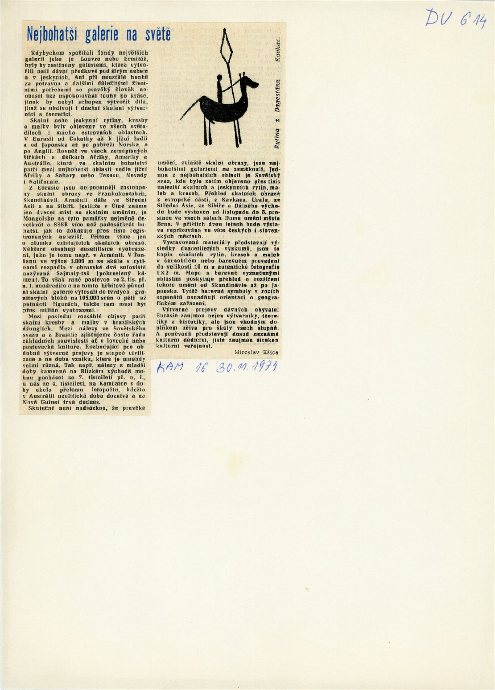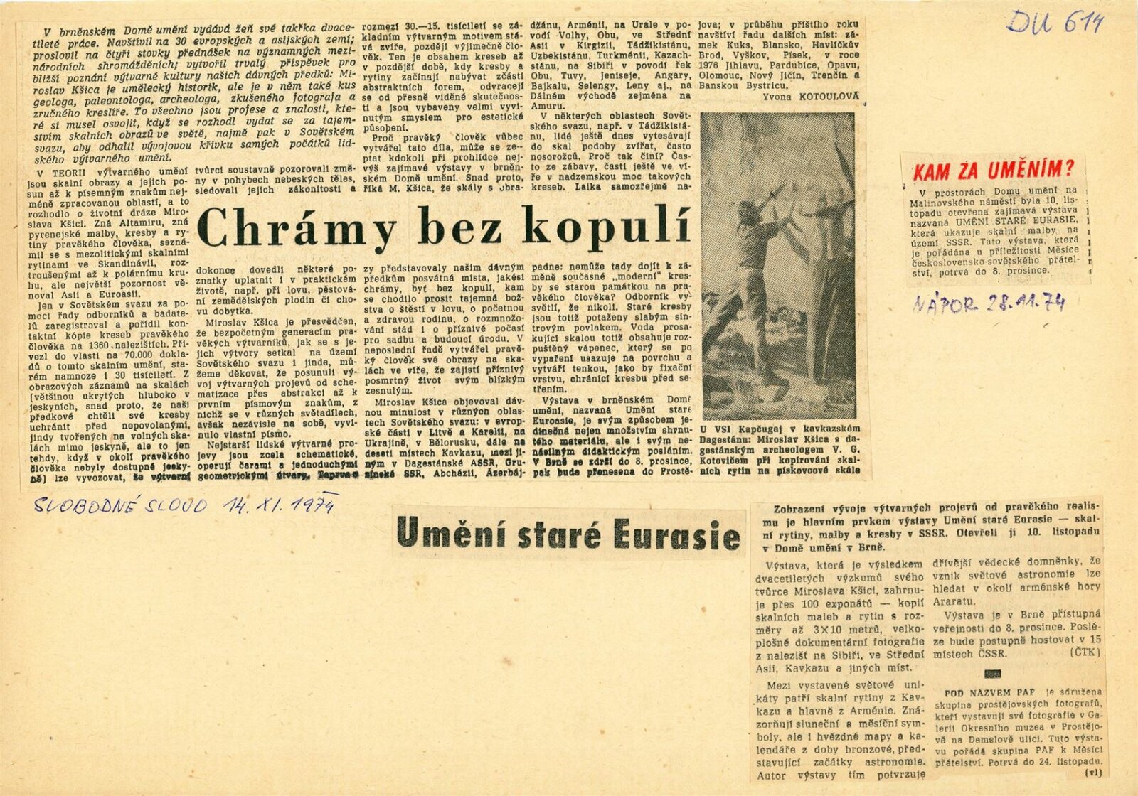 Umění staré Eurasie. Skalní obrazy v SSSR: Dům umění města Brna, 10. 11. – 8. 12. 1974 / Text: Miroslav Kšica. – Brno: DUmB, 1974. – 83 s., obr., DU 614. – MZK