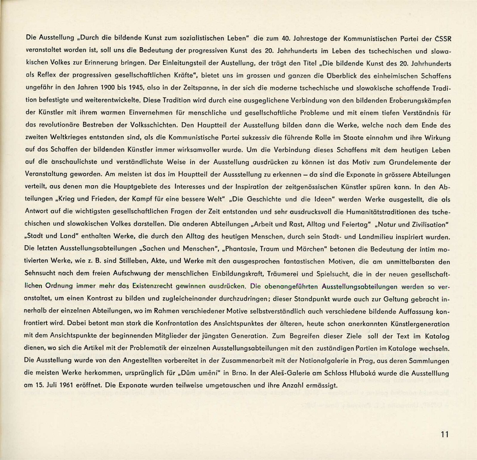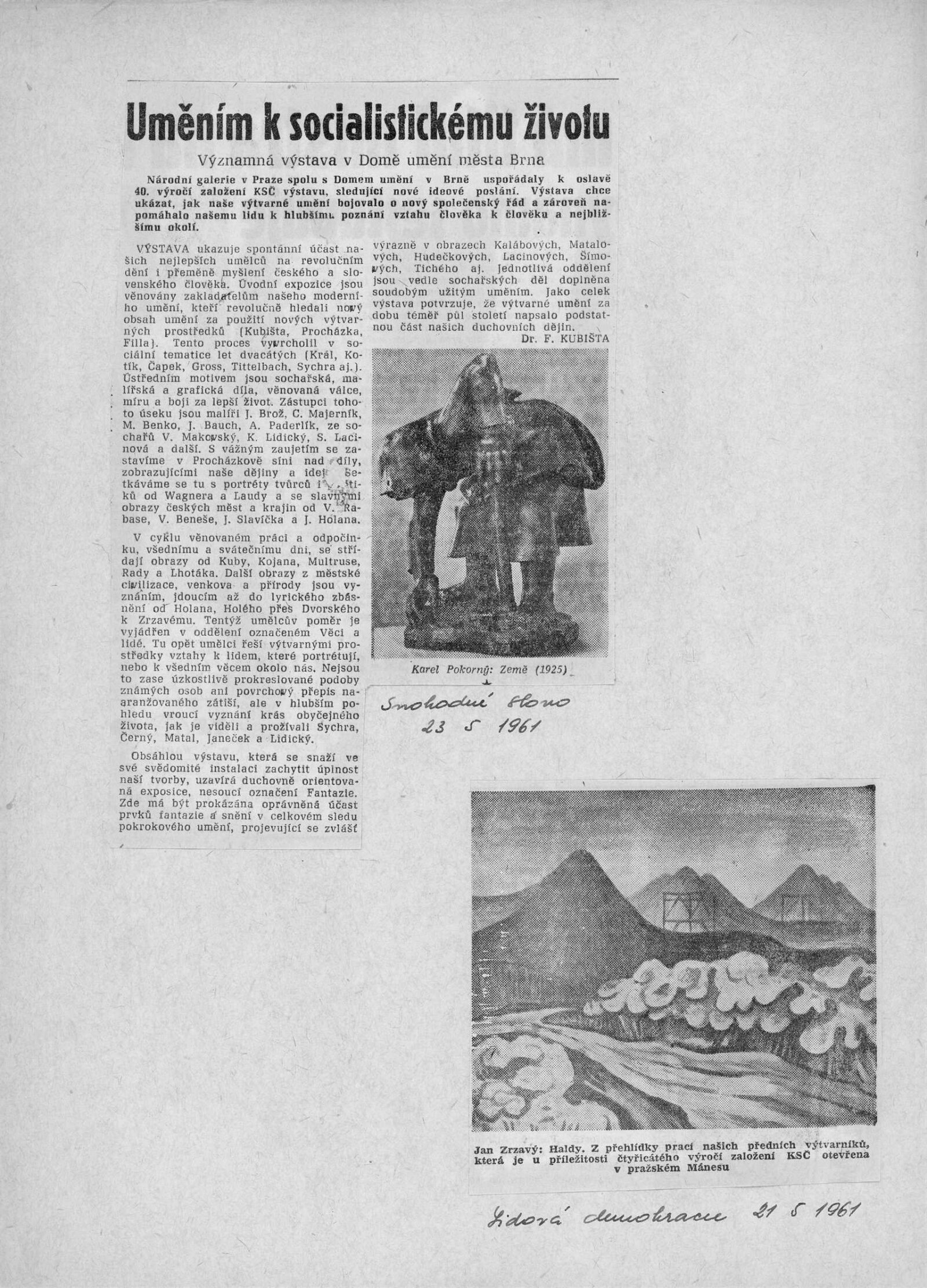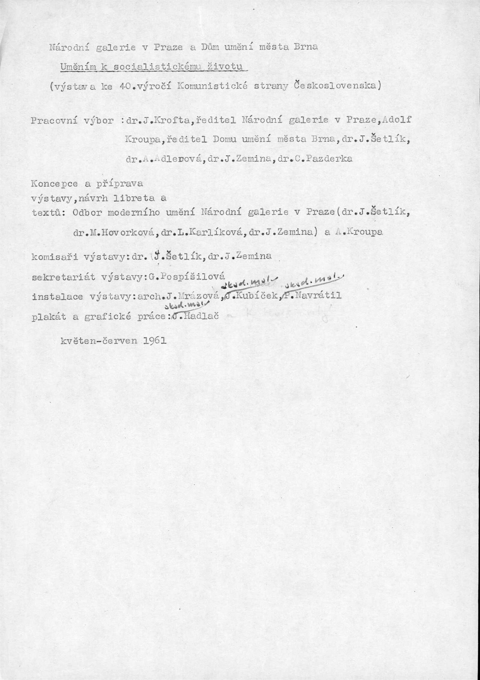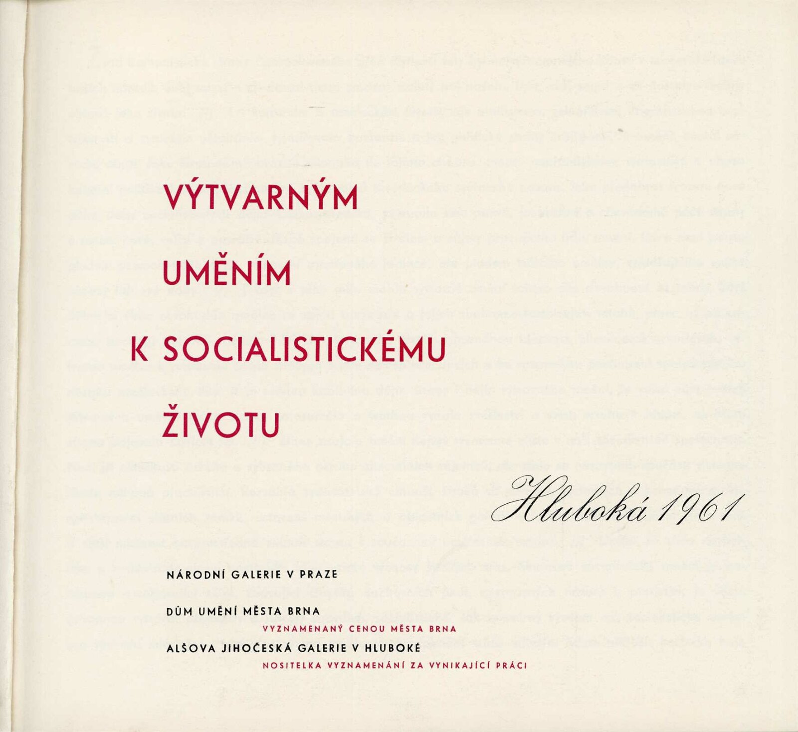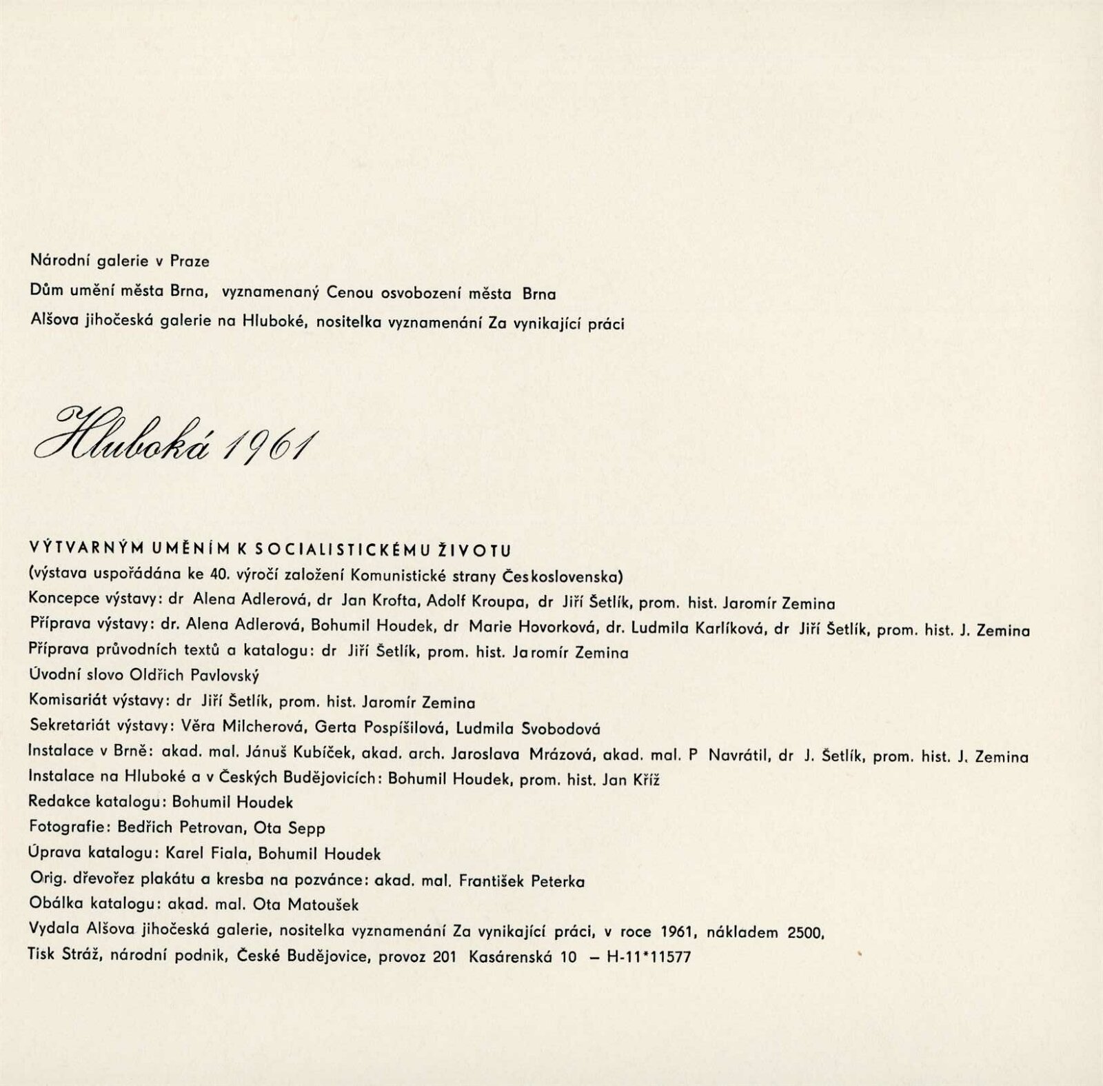 Uměním k socialistickému životu. K 40. výročí založení KSČ: Dům umění, 6. 5. – 2. 7. 1961 / Společný katalog výstavy pořádané Národní galerií v Praze, Domem umění města Brna a Alšovou jihočeskou galerií v Hluboké nad Vltavou. Výtvarným uměním k socialistickému životu: Hluboká, 1961 / Texty: Oldřich Pavlovský, Jiří Šetlík, Jaromír Zemina. – Hluboká nad Vltavou: Alšova jihočeská galerie, 1961. – 28 s., 48 s. obr. příl., DU 397. – MZK; MG