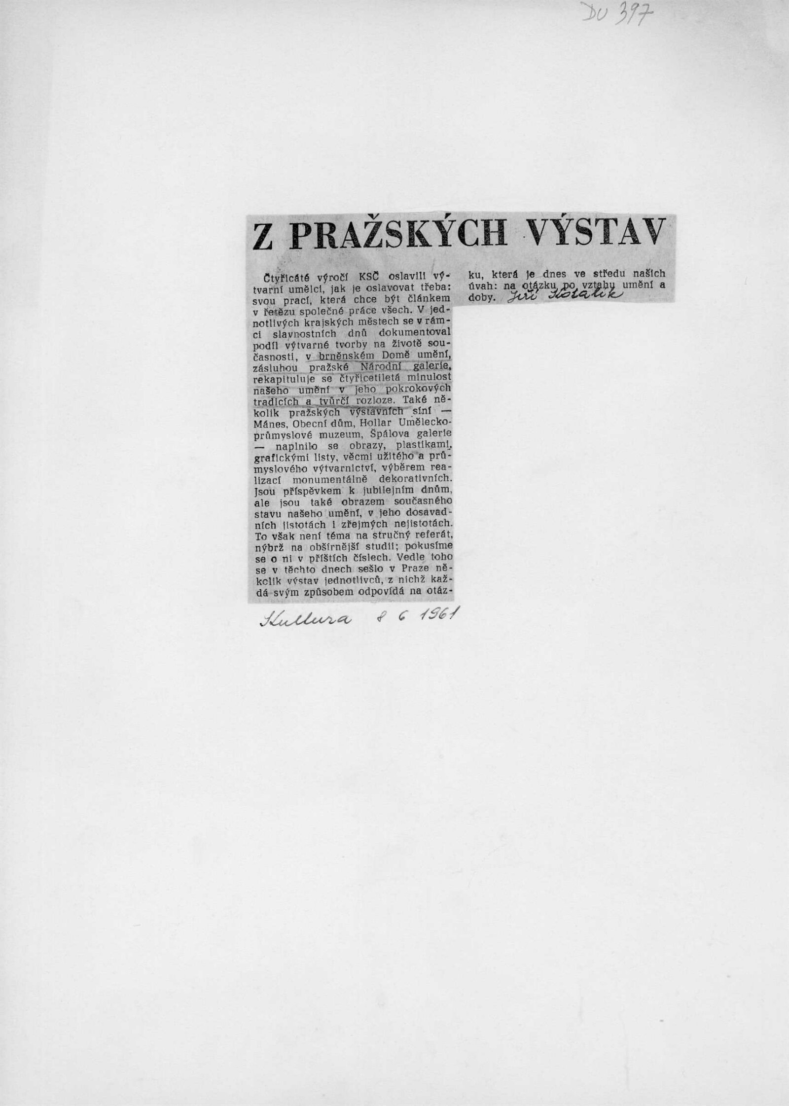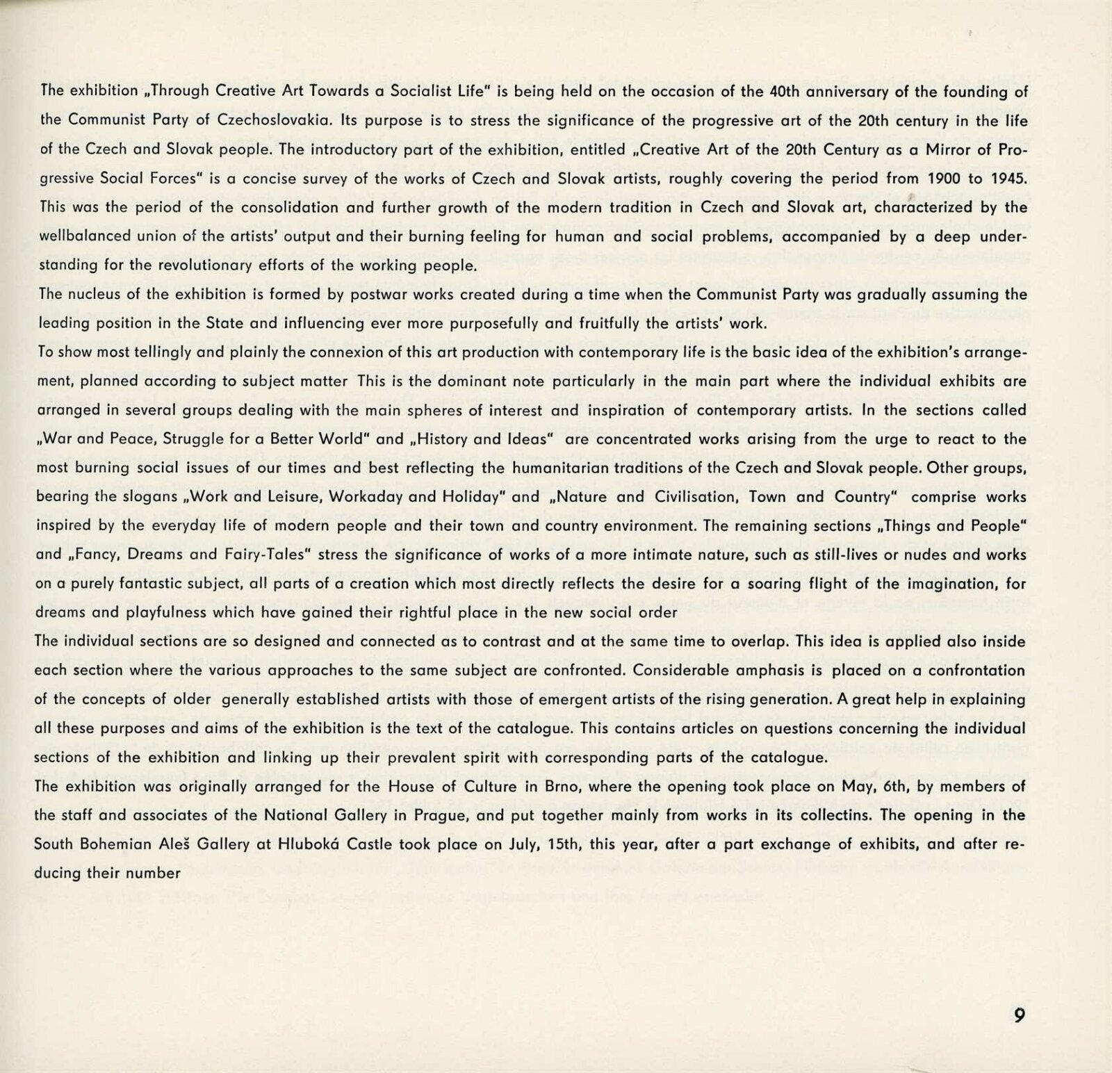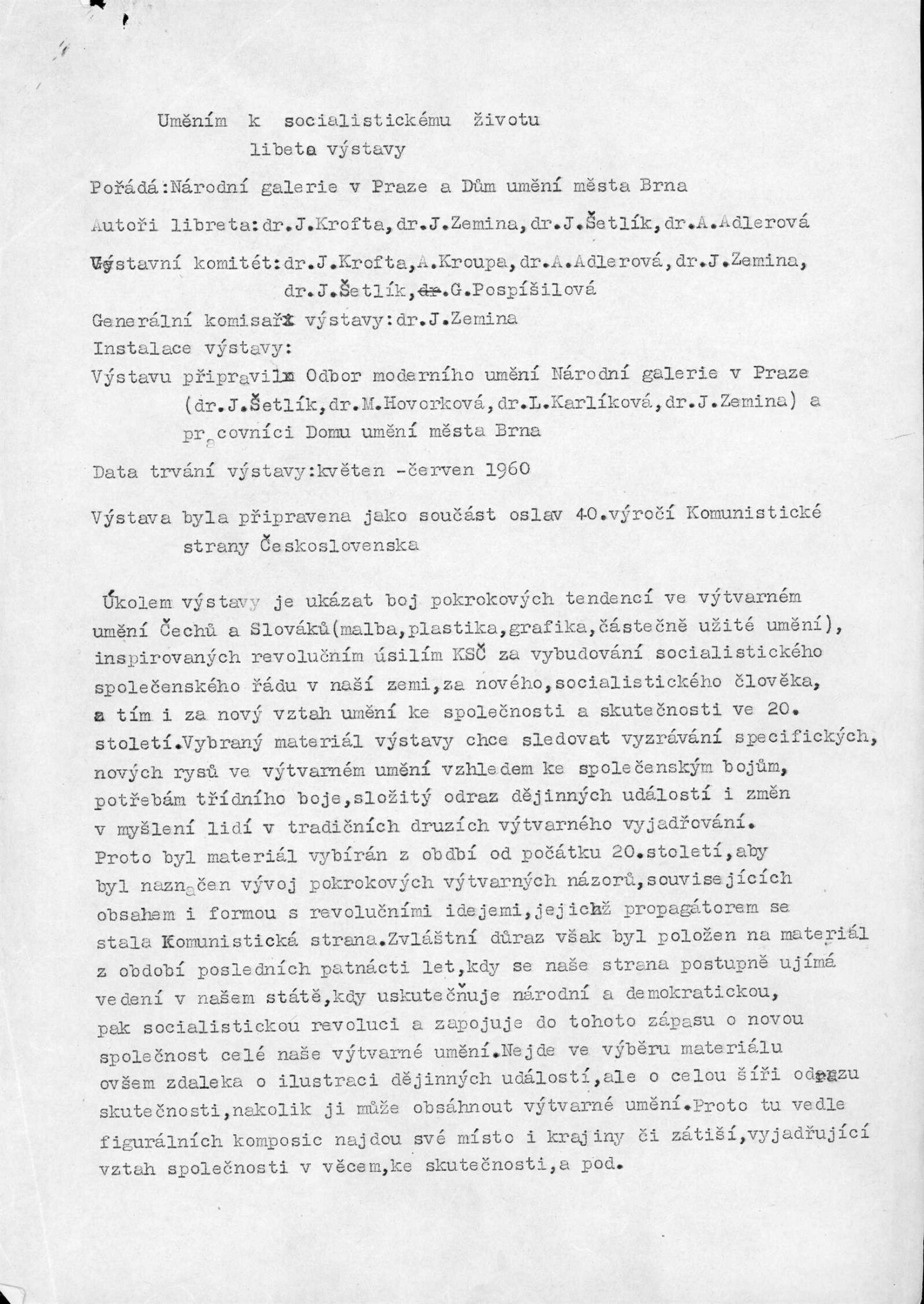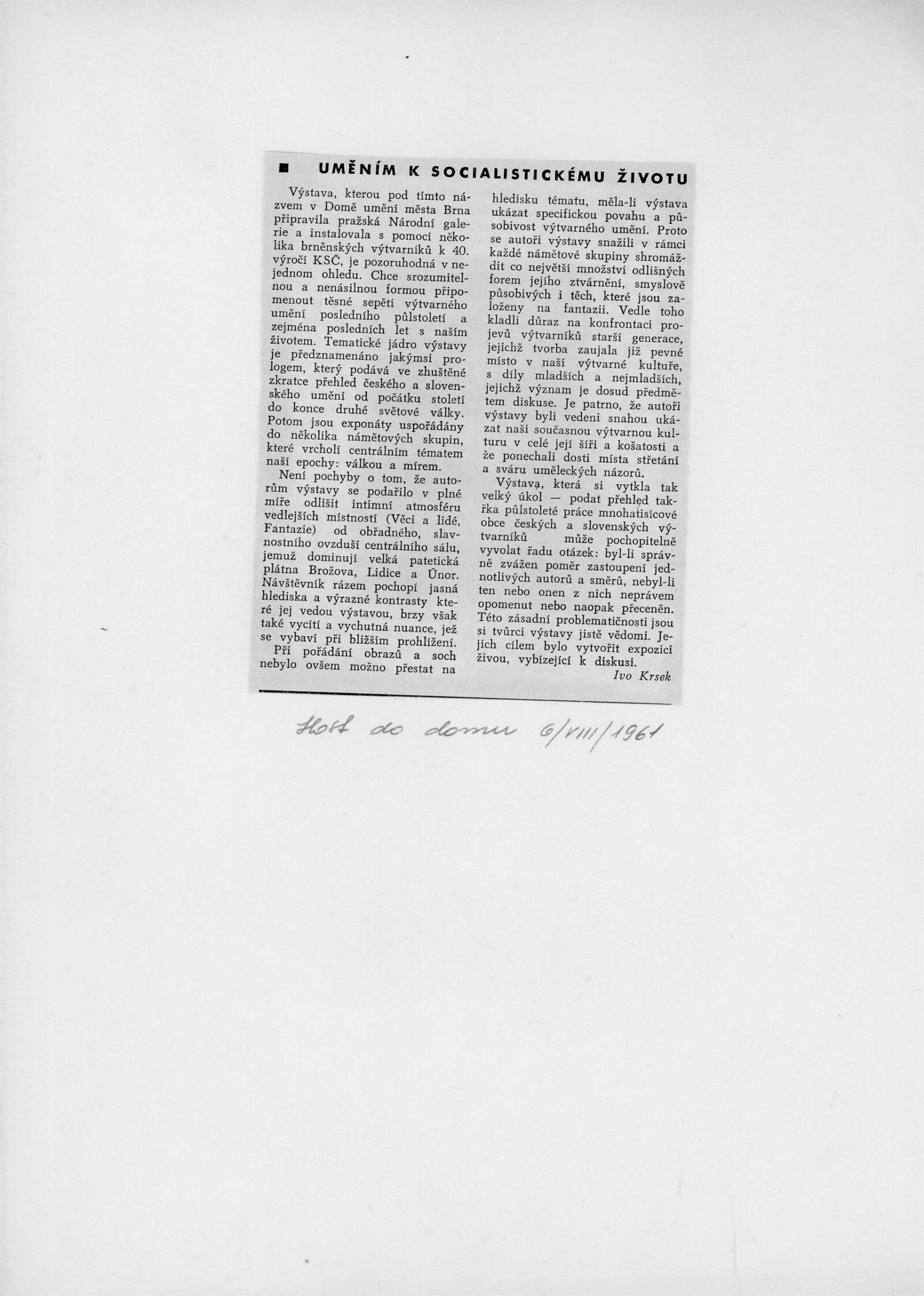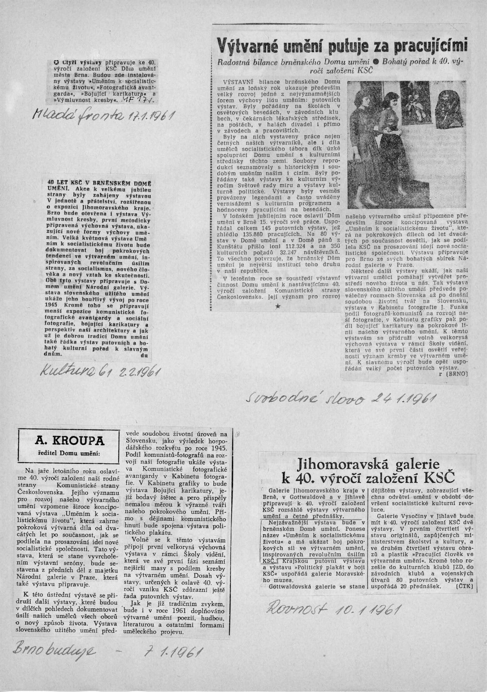 Uměním k socialistickému životu. K 40. výročí založení KSČ: Dům umění, 6. 5. – 2. 7. 1961 / Společný katalog výstavy pořádané Národní galerií v Praze, Domem umění města Brna a Alšovou jihočeskou galerií v Hluboké nad Vltavou. Výtvarným uměním k socialistickému životu: Hluboká, 1961 / Texty: Oldřich Pavlovský, Jiří Šetlík, Jaromír Zemina. – Hluboká nad Vltavou: Alšova jihočeská galerie, 1961. – 28 s., 48 s. obr. příl., DU 397. – MZK; MG