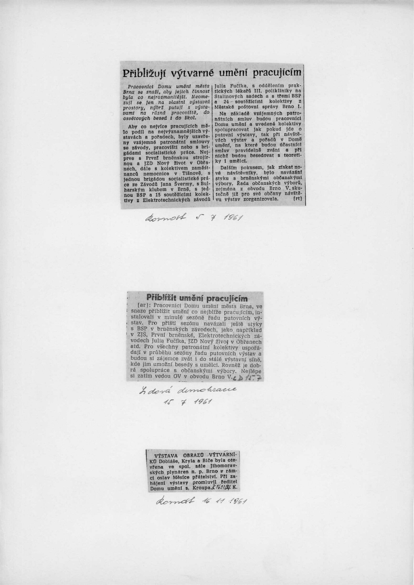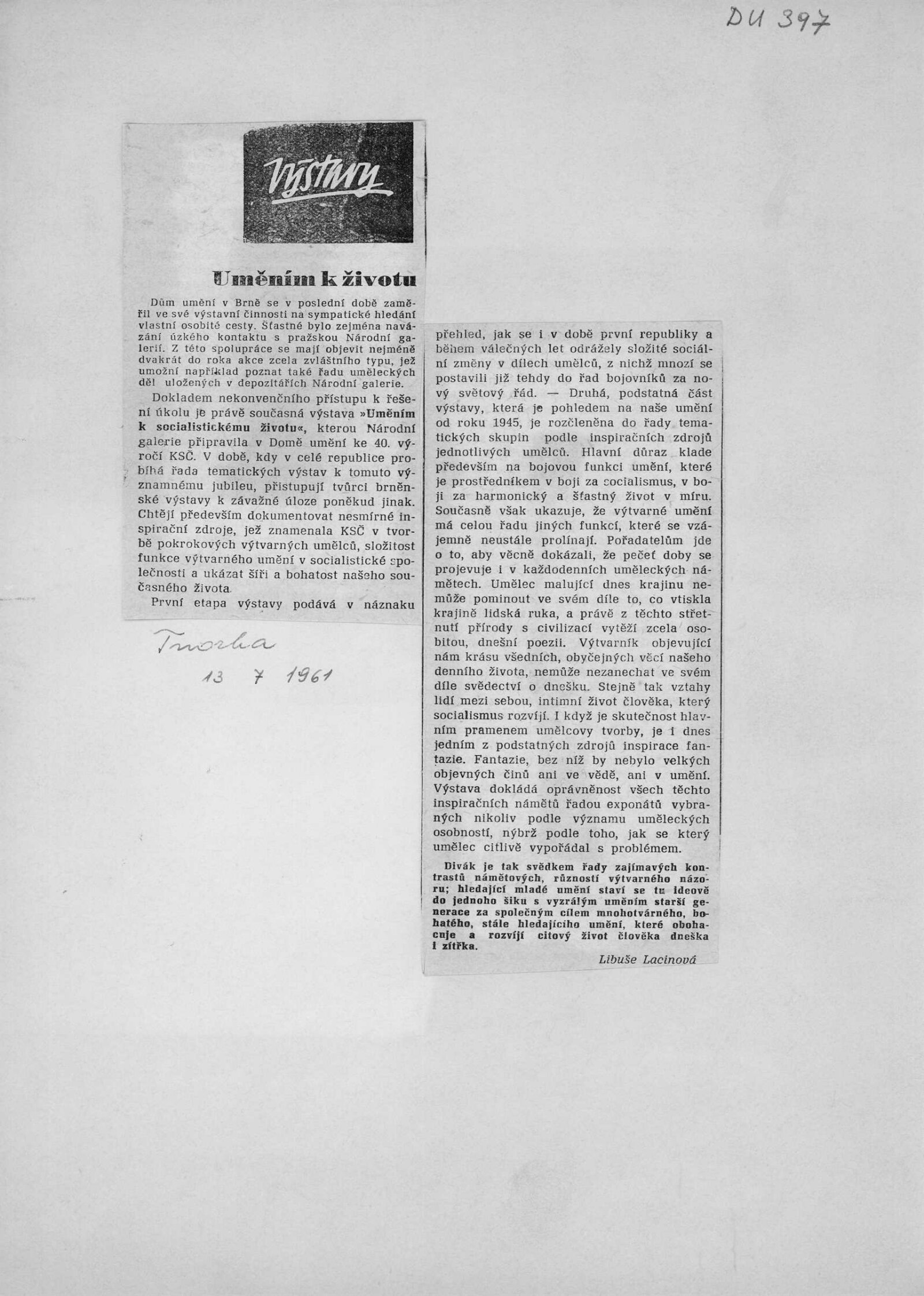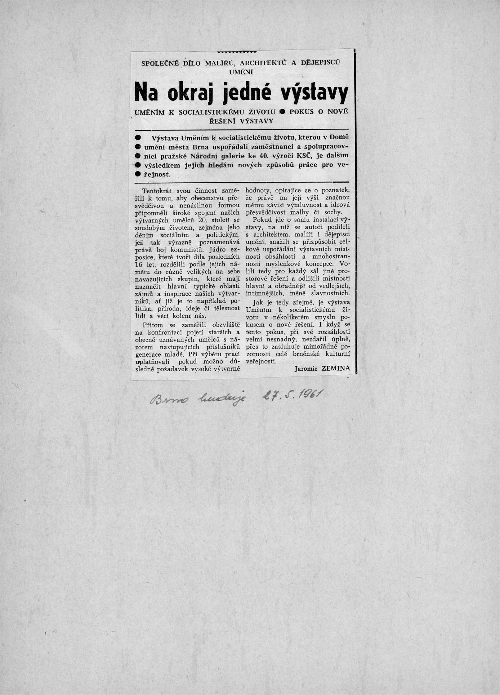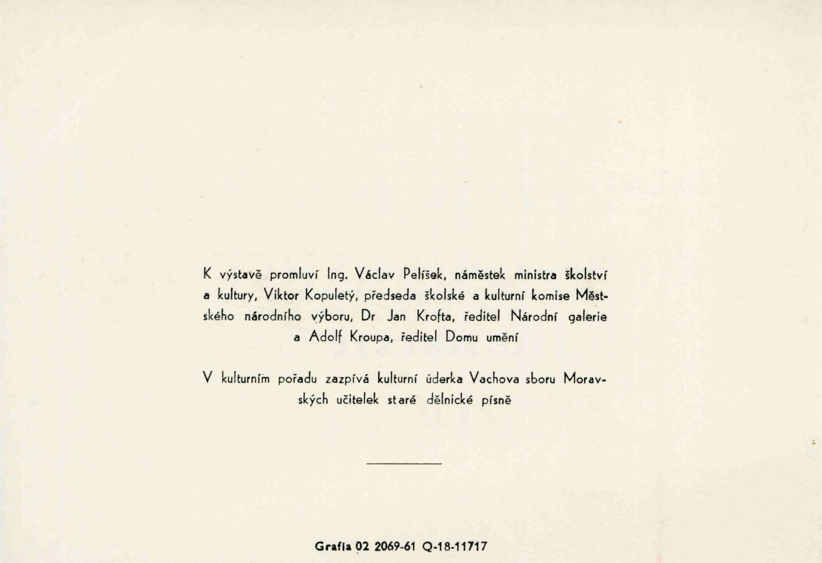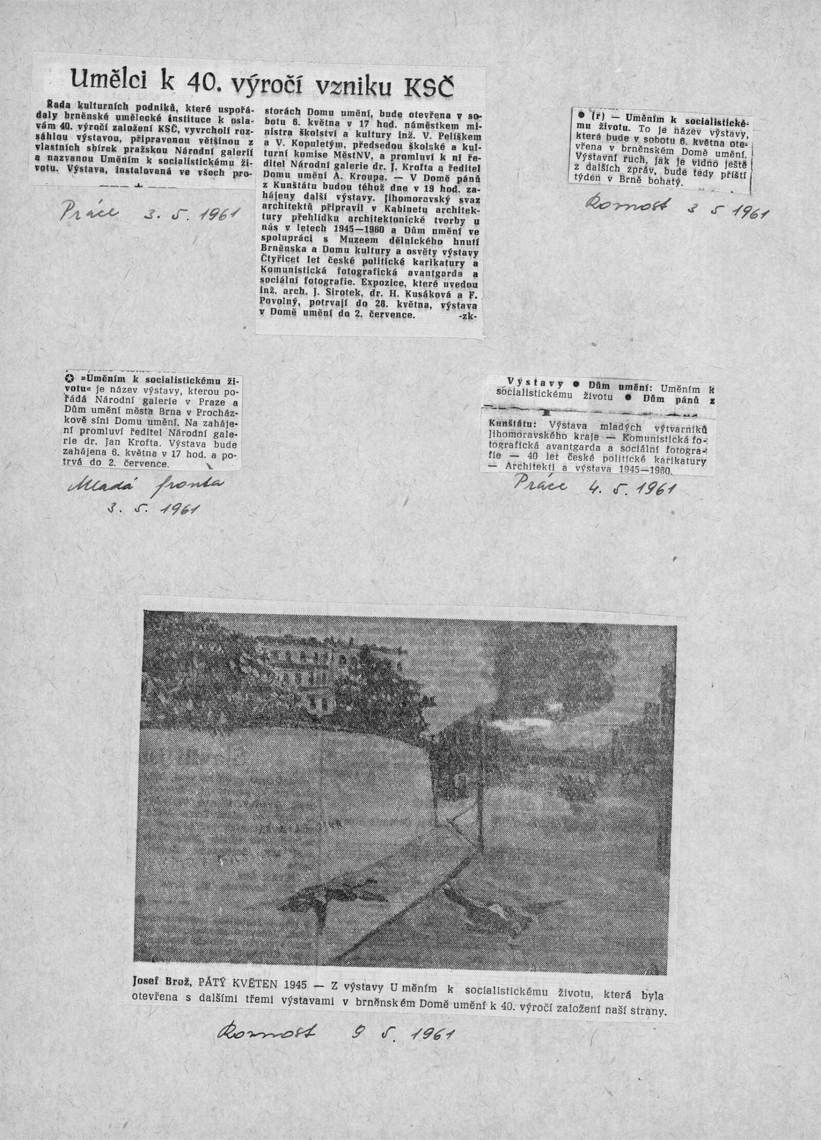 Uměním k socialistickému životu. K 40. výročí založení KSČ: Dům umění, 6. 5. – 2. 7. 1961 / Společný katalog výstavy pořádané Národní galerií v Praze, Domem umění města Brna a Alšovou jihočeskou galerií v Hluboké nad Vltavou. Výtvarným uměním k socialistickému životu: Hluboká, 1961 / Texty: Oldřich Pavlovský, Jiří Šetlík, Jaromír Zemina. – Hluboká nad Vltavou: Alšova jihočeská galerie, 1961. – 28 s., 48 s. obr. příl., DU 397. – MZK; MG