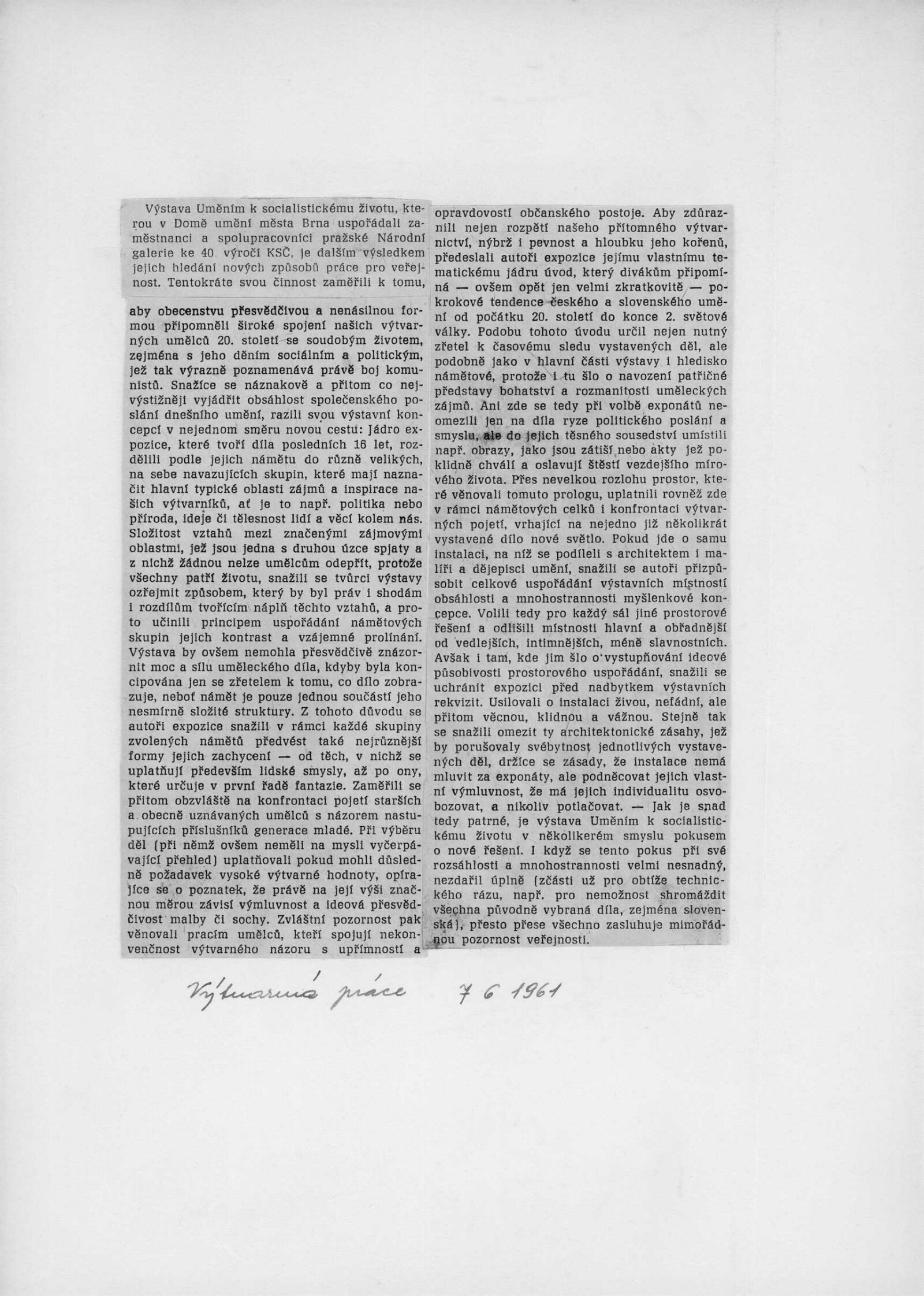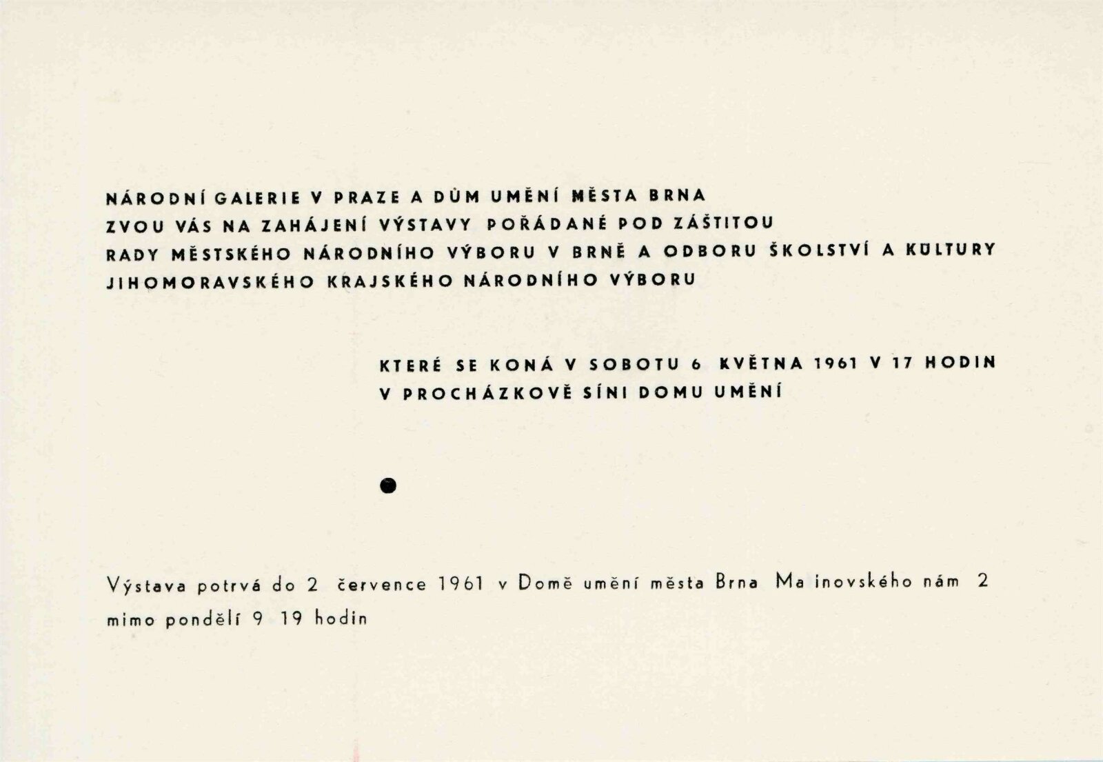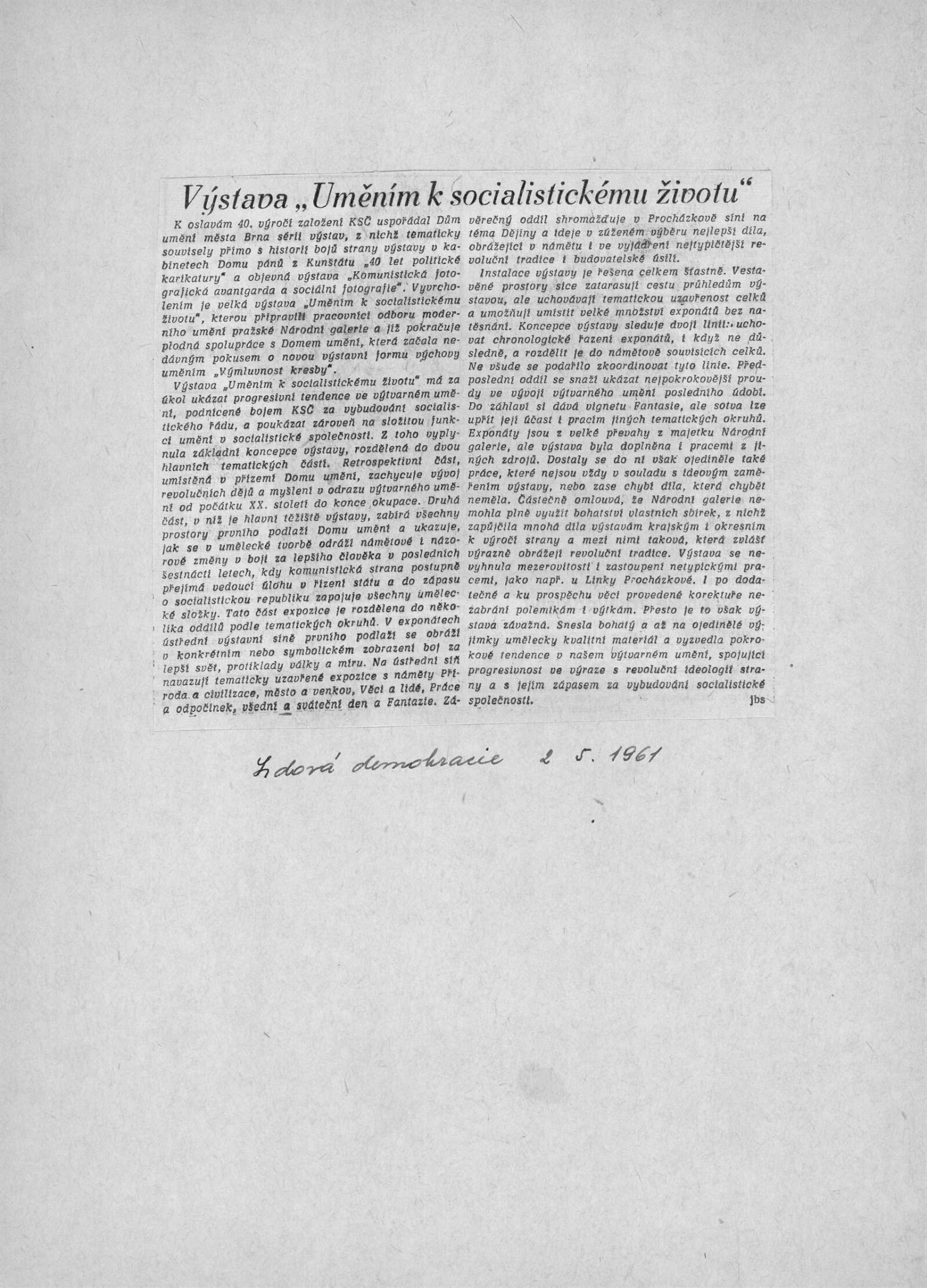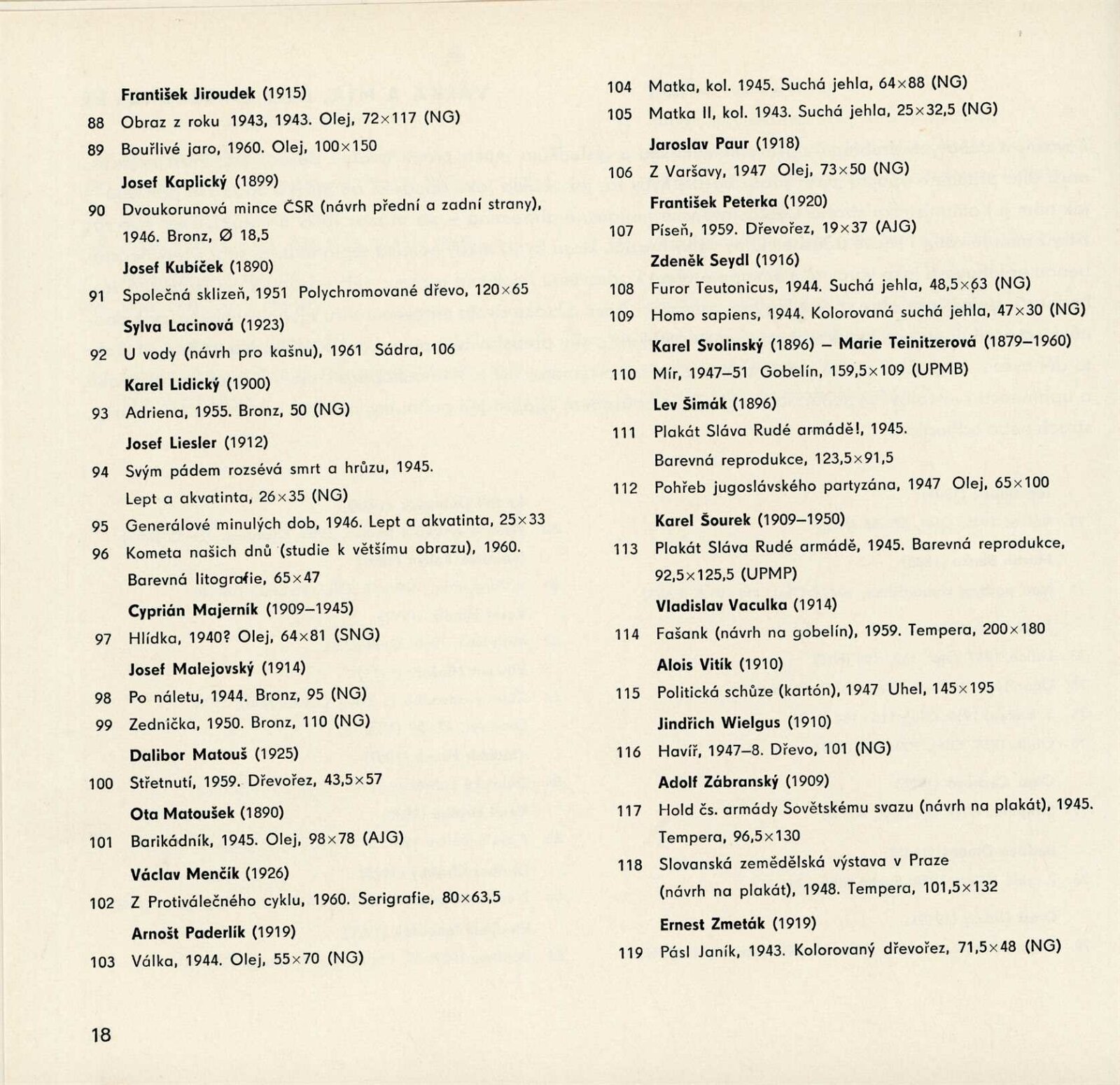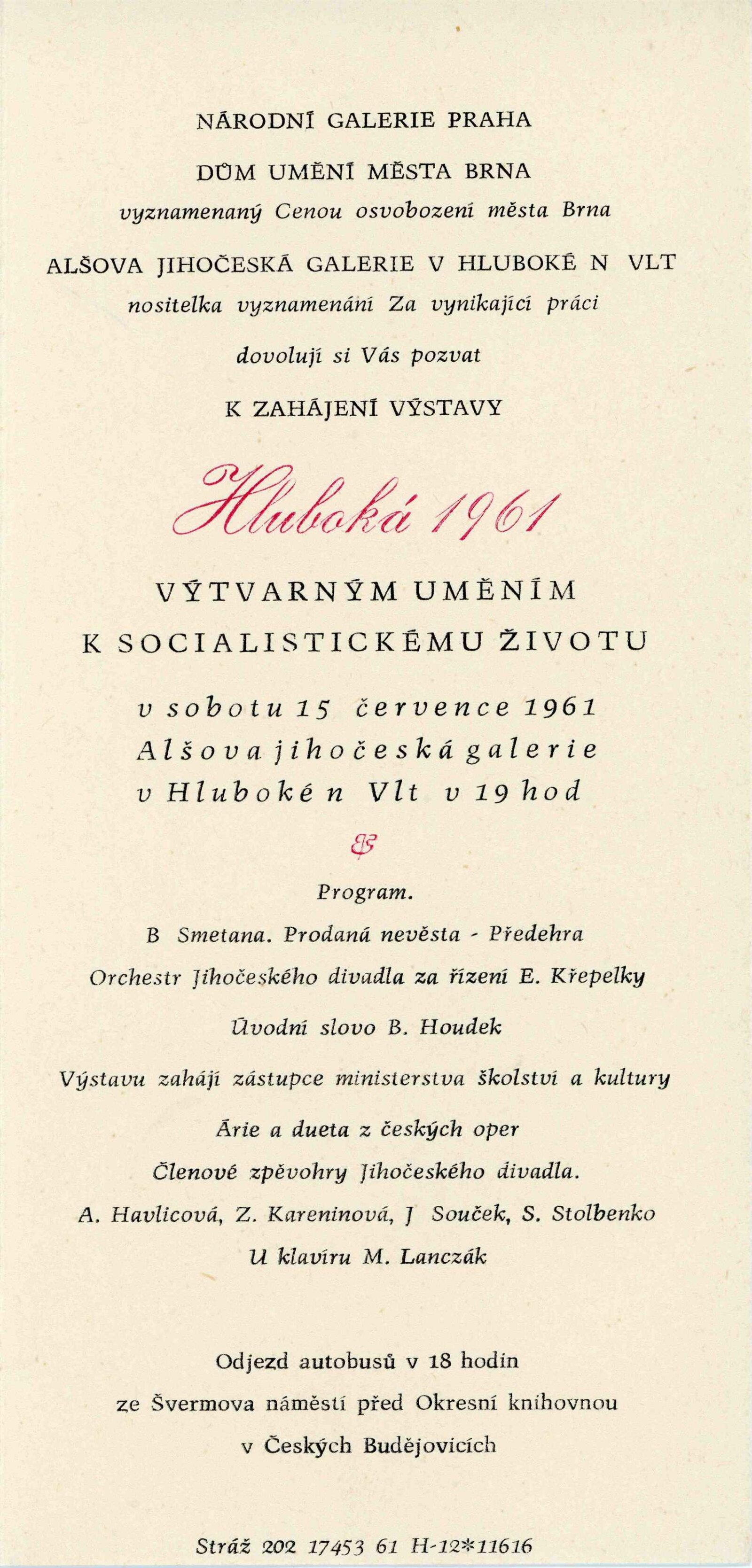 Uměním k socialistickému životu. K 40. výročí založení KSČ: Dům umění, 6. 5. – 2. 7. 1961 / Společný katalog výstavy pořádané Národní galerií v Praze, Domem umění města Brna a Alšovou jihočeskou galerií v Hluboké nad Vltavou. Výtvarným uměním k socialistickému životu: Hluboká, 1961 / Texty: Oldřich Pavlovský, Jiří Šetlík, Jaromír Zemina. – Hluboká nad Vltavou: Alšova jihočeská galerie, 1961. – 28 s., 48 s. obr. příl., DU 397. – MZK; MG