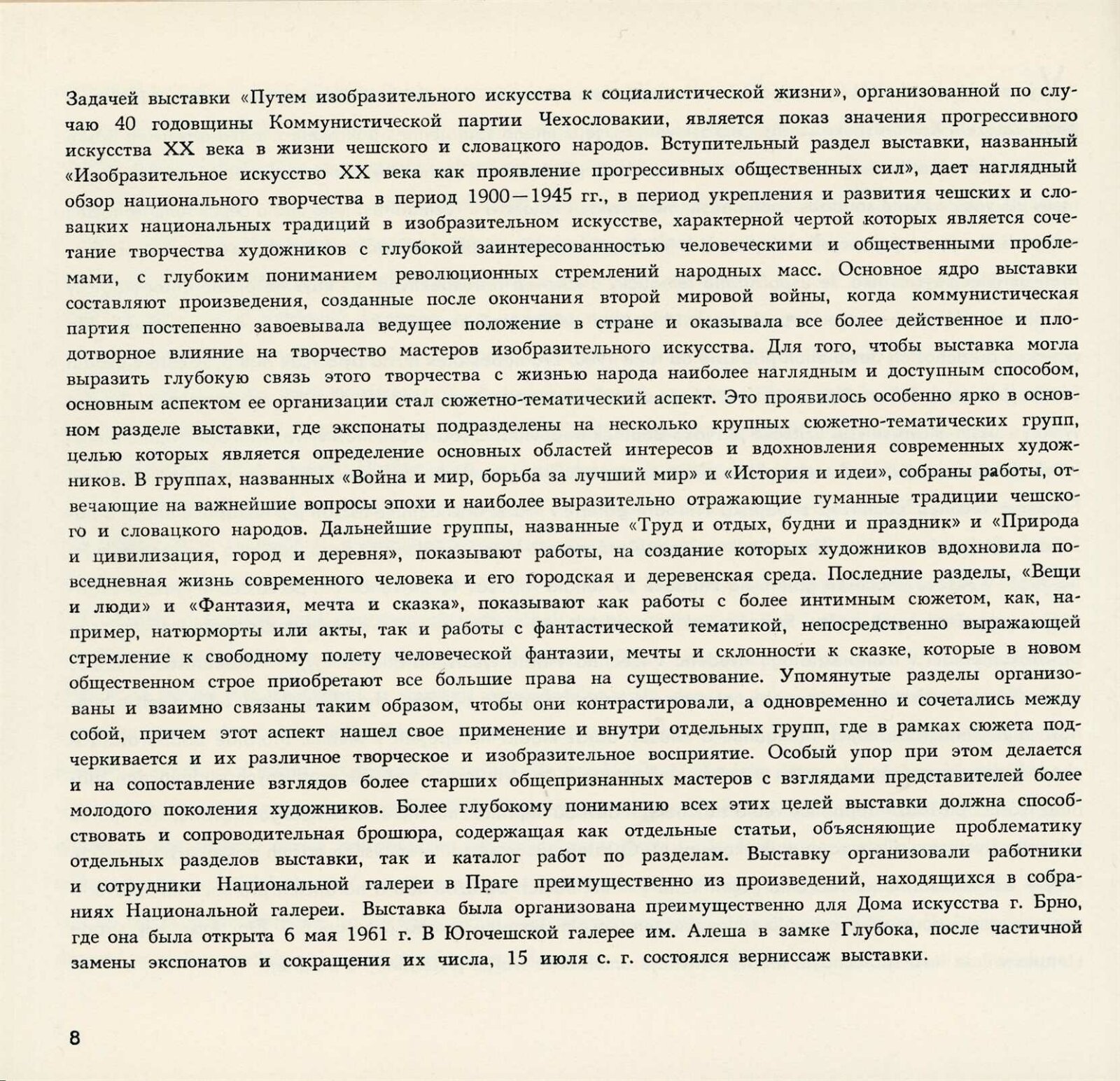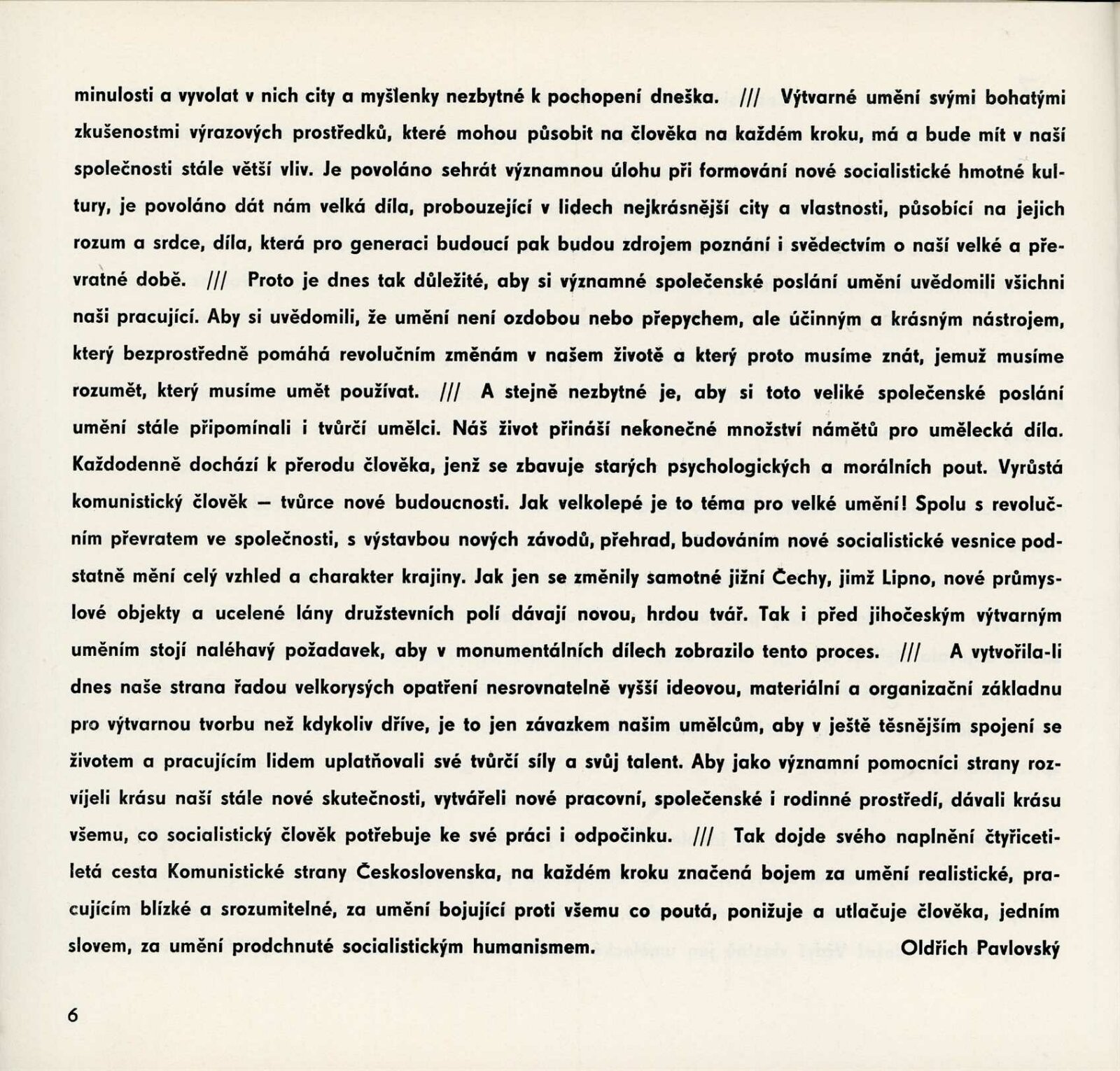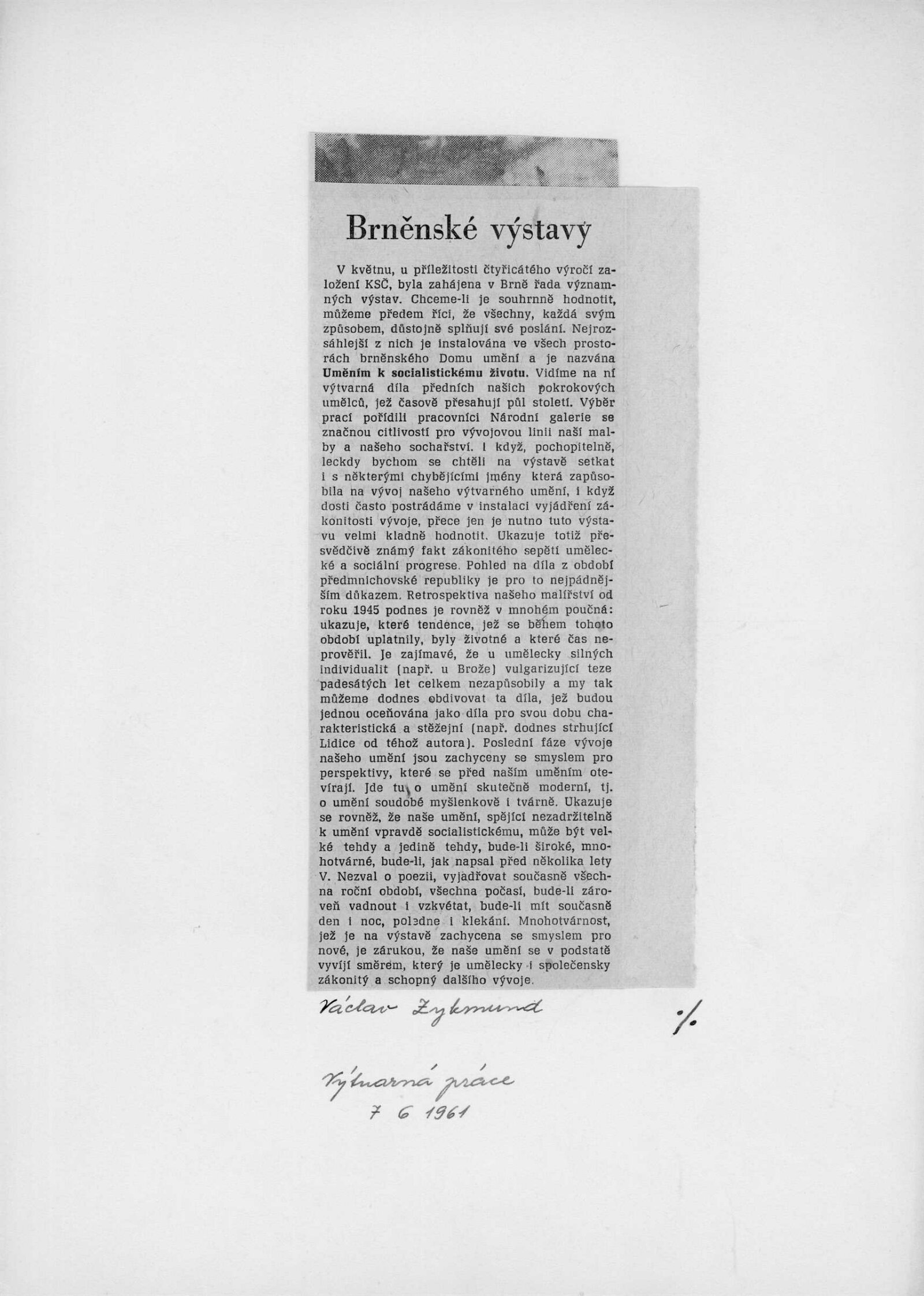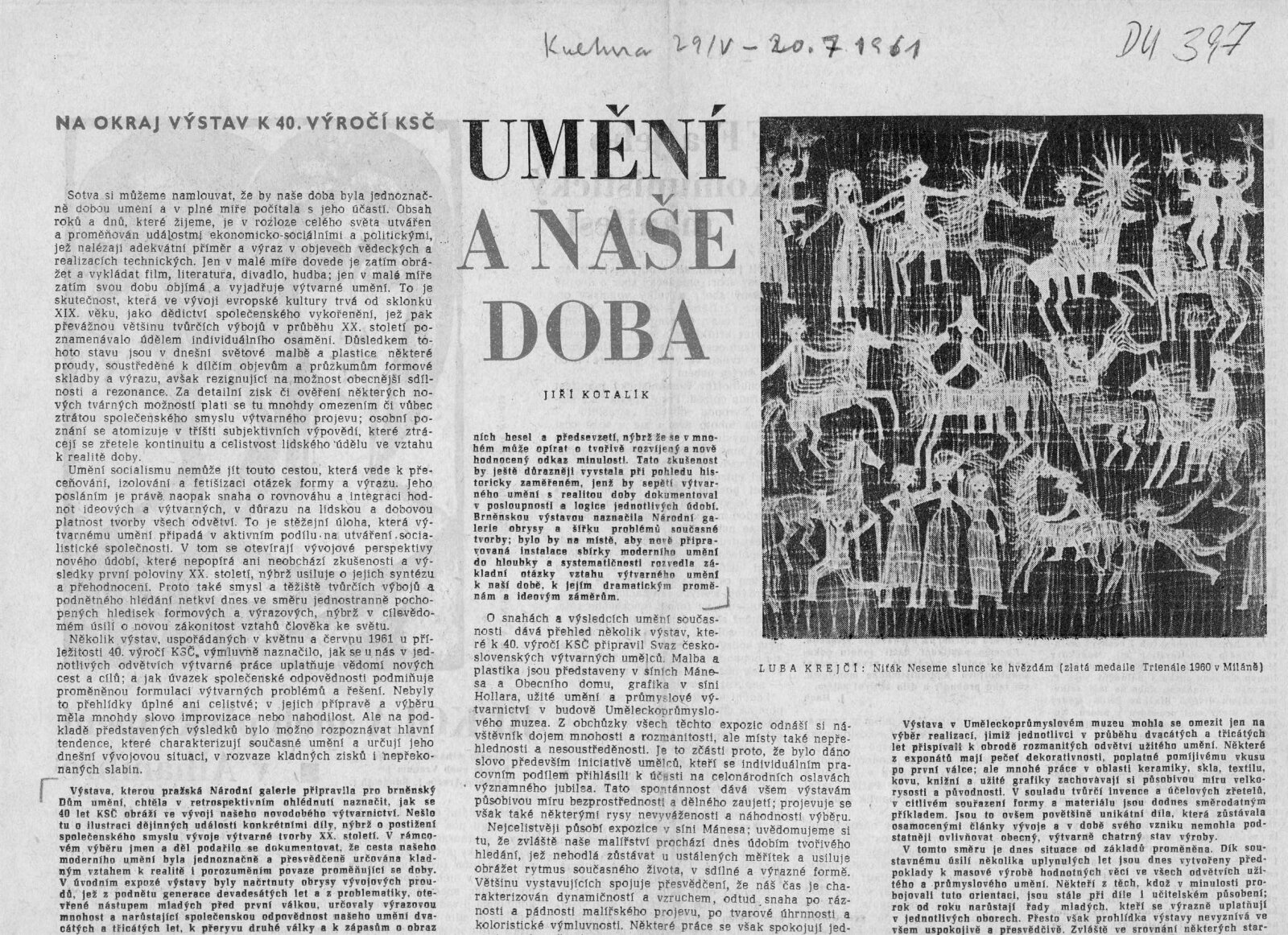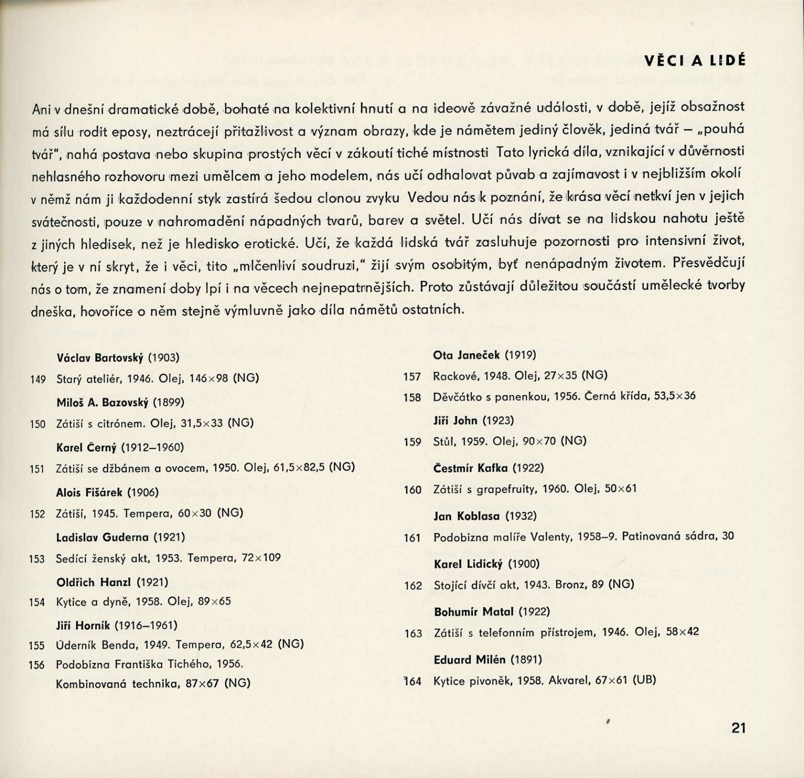 Uměním k socialistickému životu. K 40. výročí založení KSČ: Dům umění, 6. 5. – 2. 7. 1961 / Společný katalog výstavy pořádané Národní galerií v Praze, Domem umění města Brna a Alšovou jihočeskou galerií v Hluboké nad Vltavou. Výtvarným uměním k socialistickému životu: Hluboká, 1961 / Texty: Oldřich Pavlovský, Jiří Šetlík, Jaromír Zemina. – Hluboká nad Vltavou: Alšova jihočeská galerie, 1961. – 28 s., 48 s. obr. příl., DU 397. – MZK; MG