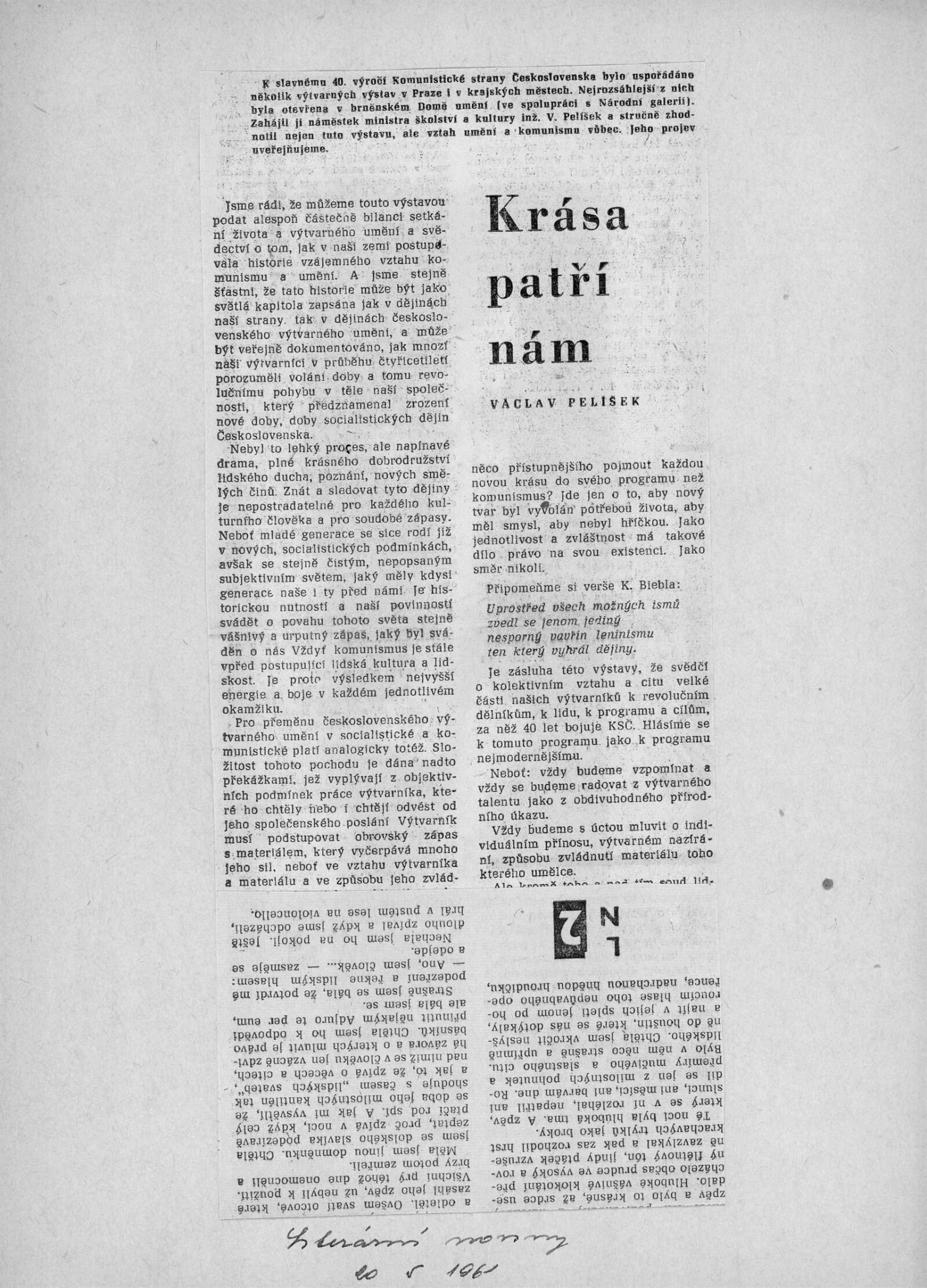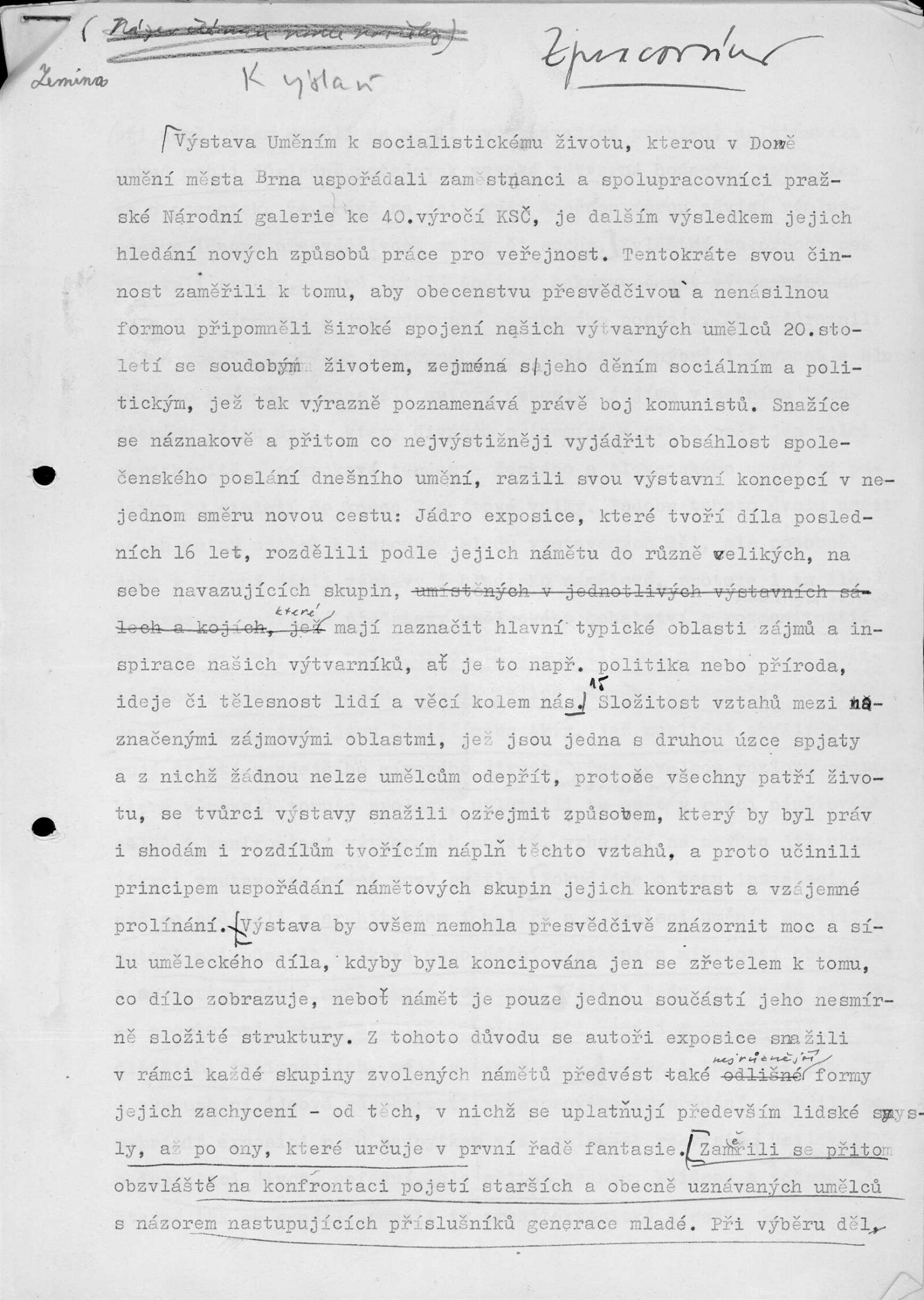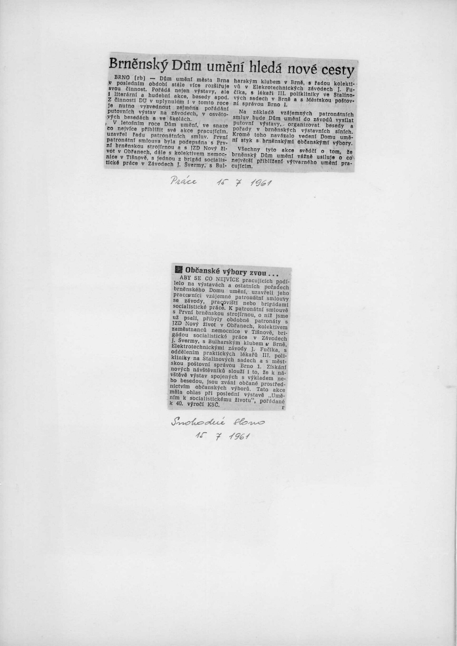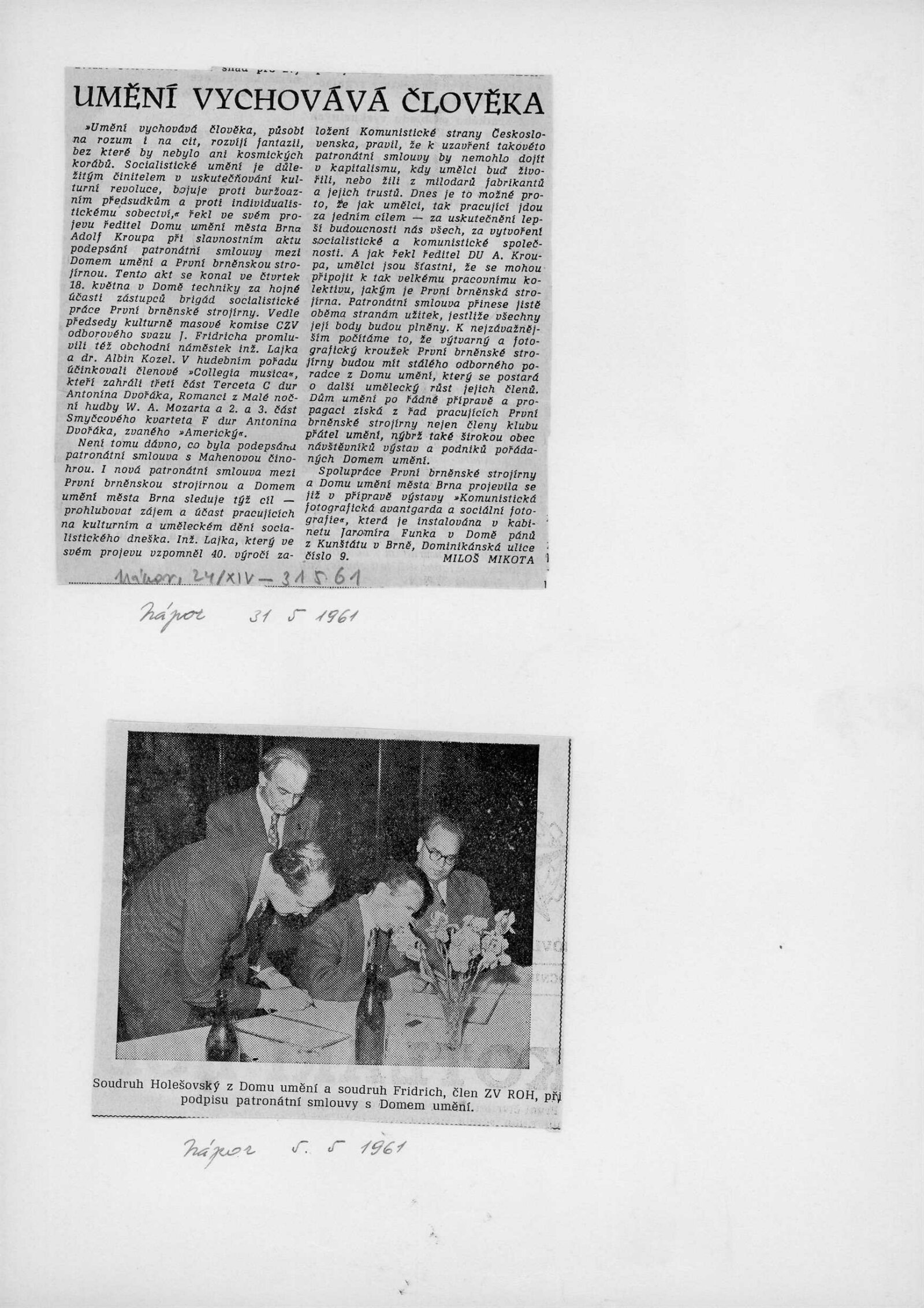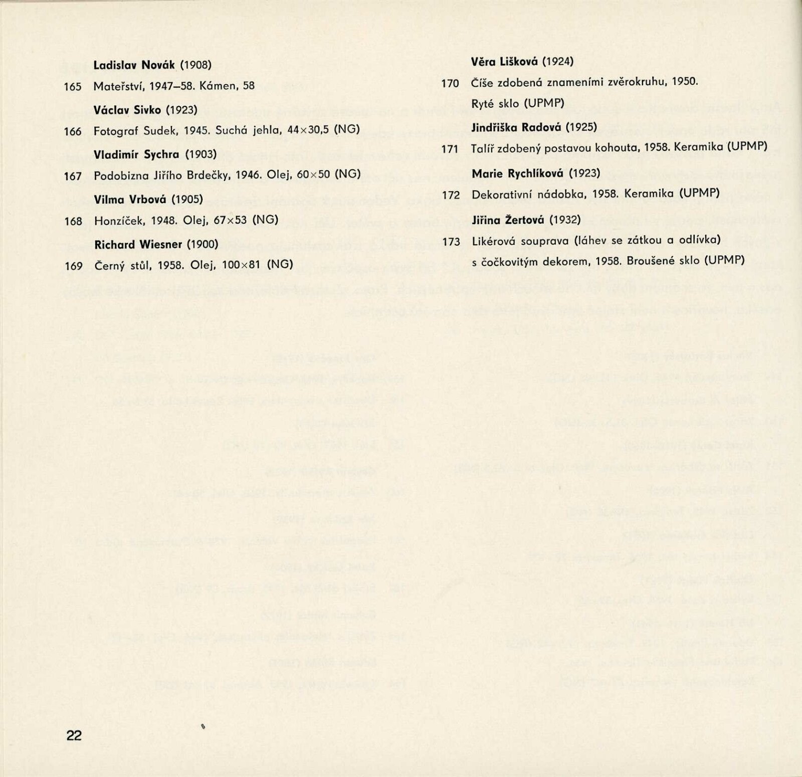 Uměním k socialistickému životu. K 40. výročí založení KSČ: Dům umění, 6. 5. – 2. 7. 1961 / Společný katalog výstavy pořádané Národní galerií v Praze, Domem umění města Brna a Alšovou jihočeskou galerií v Hluboké nad Vltavou. Výtvarným uměním k socialistickému životu: Hluboká, 1961 / Texty: Oldřich Pavlovský, Jiří Šetlík, Jaromír Zemina. – Hluboká nad Vltavou: Alšova jihočeská galerie, 1961. – 28 s., 48 s. obr. příl., DU 397. – MZK; MG
