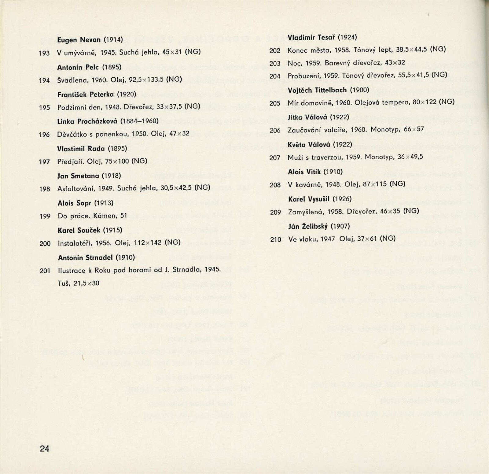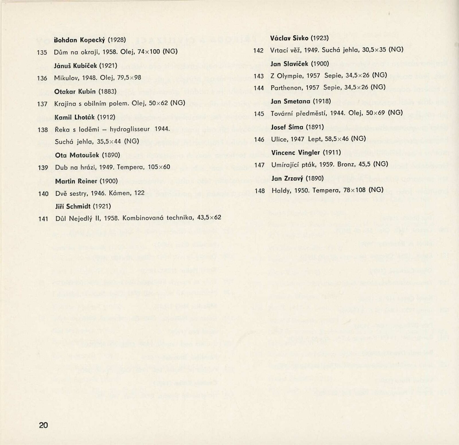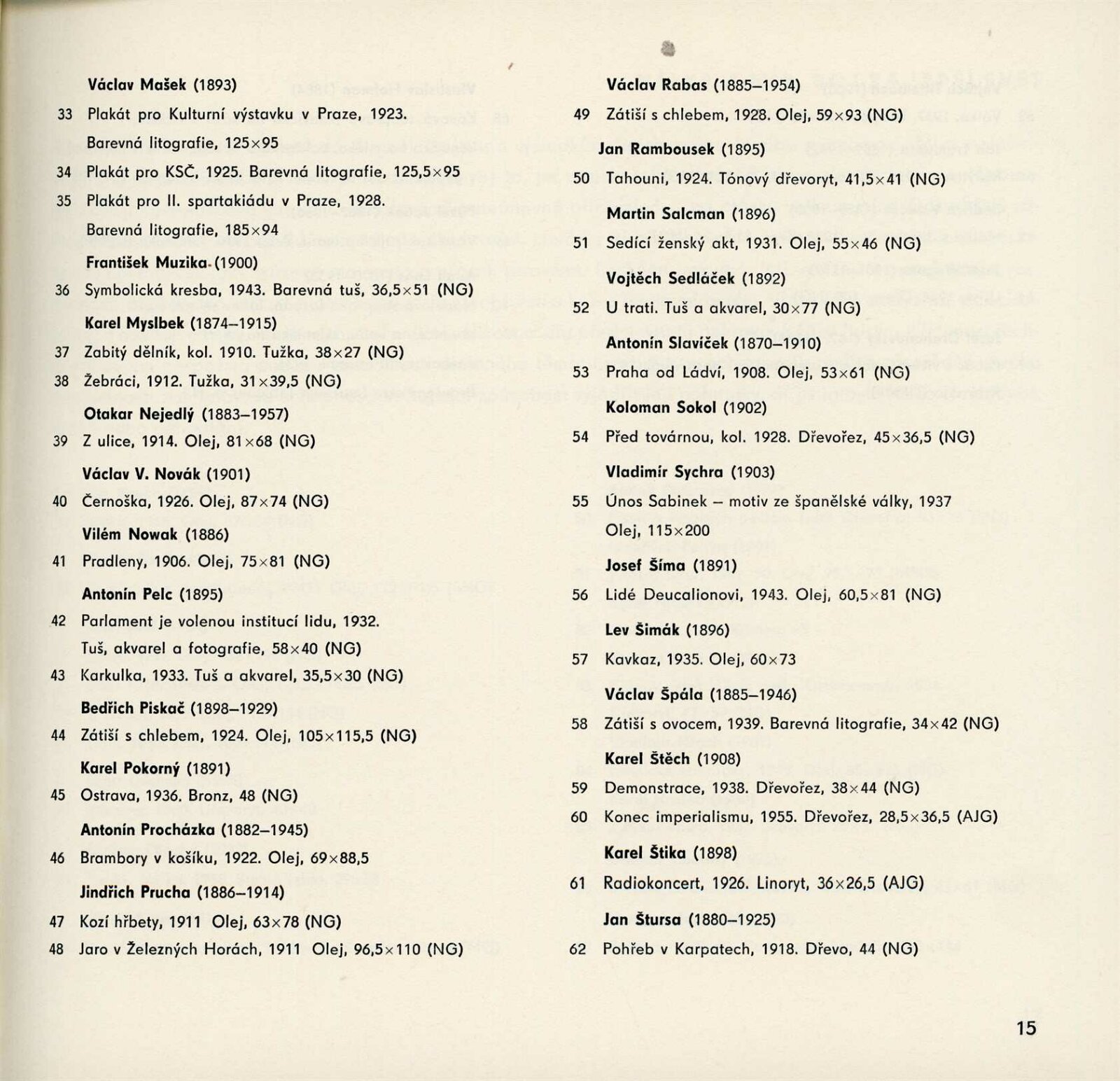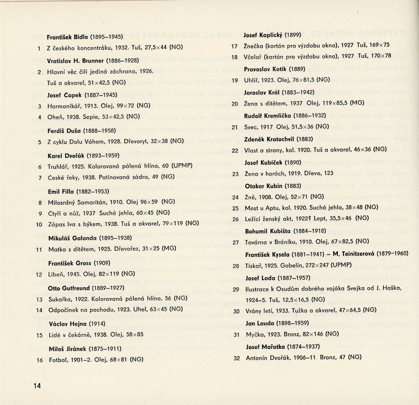 Konrád Babraj, Václav Bartovský, Jan Bauch, Miloš A. Bazovský, Vincenc Beneš, Martin Benka, František Bidlo, Cyril Bouda, Josef Brož, Vratislav H. Brunner, Josef Čapek, Olga Čechová, Karel Černý, Miroslav J. Černý, Petr Dillinger, Bedřich Dlouhý, František Doubrava, Josef Drahoňovský, Orest Dubay, Rudolf Dúbravec, Ferdiš Duša, Bohumír Dvorský, František Dvořák, Karel Dvořák, Václav Fiala, Emil Filla, Alois Fišárek, Josef Flejšar, František Foltýn, Richard Fremund, Vladimír Fuka, Ľudovít Fulla, Mikuláš Galanda, František Gross, Jaroslav Grus, Ladislav Guderna, Otto Gutfreund, Jiří Hadlač, Oldřich Hanzl, Václav Hejna, Karel Hladík, Vincent Hložník, Adolf Hoffmeister, Vlastislav Hofman, Karel Holan, Miloslav Holý, Jiří Horník, Vladimír Hroch, Karel Hruška, František Hudeček, Dalibor Chatrný, Zdeněk Chotěnovský, Pavel Janák, Ota Janeček, Vladimír Janoušek, Věra Janoušková, Josef Jíra, Miloš Jiránek, Marta Jirásková, František Jiroudek, Jiří John, Čestmír Kafka, František Kaláb, Josef Kaplický, Jan Koblasa, Jan Kodet, Jan Kojan, Stanislav Kolíbal, Bohdan Kopecký, Jozef Kostka, Pravoslav Kotík, Václav Koutský, Jaroslav Král, Rudolf Kremlička, Zdeněk Kratochvíl, Ludvík Kuba, Jánuš Kubíček, Josef Kubíček, Otakar Kubín, Bohumil Kubišta, František Kysela, Bohdan Lacina, Sylva Lacinová, Josef Lada, Jan Lauda, Kamil Lhoták, Karel Lidický, Josef Liesler, Věra Lišková, Adolf Loos, Cyprián Majerník, Vincenc Makovský, Josef Malejovský, Karel Malich, Josef Mařatka, Václav Mašek, Bohumír Matal, Dalibor Matouš, Ota Matoušek, Mária Medvecká, Václav Menšík, Eduard Milén, Josef Multrus, František Muzika, Karel Myslbek, Otakar Nejedlý, Eugen Nevan, Ladislav Novák, Václav V. Novák, Vilém Nowak, Arnošt Paderlík, Zdeněk Palcr, Jaroslav Paur, Antonín Pelc, František Peterka, Robert Piesen, Bedřich Piskač, Vilém Plocek, Karel Pokorný, Antonín Procházka, Linka Procházková, Jindřich Prucha, Václav Rabas, Vlastimil Rada, Jindřiška Radová, Jan Rambousek, Martin Reiner, Marie Rychlíková, Martin Salcman, Vojtěch Sedláček, Zdeněk Seydl, Jiří Schmidt, Václav Sivko, Zdeněk Sklenář, Martin Sladký, Antonín Slavíček, Jan Slavíček, Jan Smetana, Koloman Sokol, Alois Sopr, Karel Souček, Antonín Strnadel, Pavel Sukdolák, Karel Svolinský, Vladimír Sychra, Jaroslav Šerých, Josef Šíma, Lev Šimák, Václav Špála, Otakar Španiel, Karel Štěch, Karel Štika, Jan Štursa, Karel Šourek, Max Švabinský, M. Teinitzerová, Vladimír Tesař, František Tichý, Jiří Tichý, Vojtěch Tittelbach, Jan Trampota, Jiří Trnka, Vladislav Vaculka, Ida Vaculková, Jitka Válová, Květa Válová, Bedřich Vaníček, Vincenc Vingler, Alois Vitík, Vilma Vrbová, Karel Vysušil, Josef Wagner, Jindřich Wielgus, Richard Wiesner, Adolf Zábranský, Ladislav Zívr, Ernest Zmeták, Olbram Zoubek, Jan Zrzavý, Ján Želibský, Jiřina Žertová