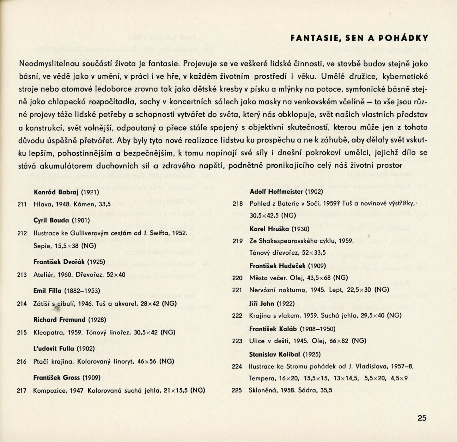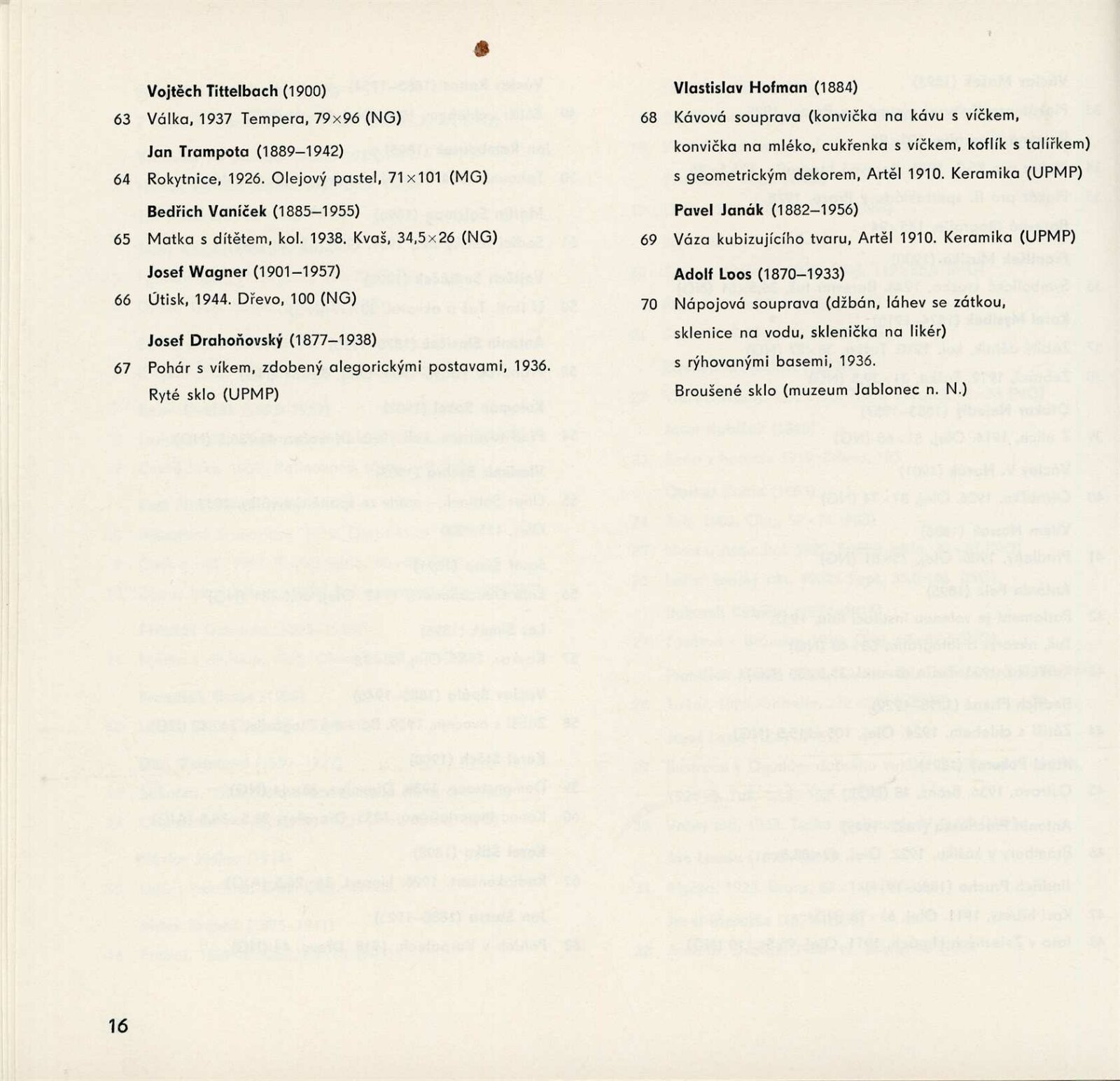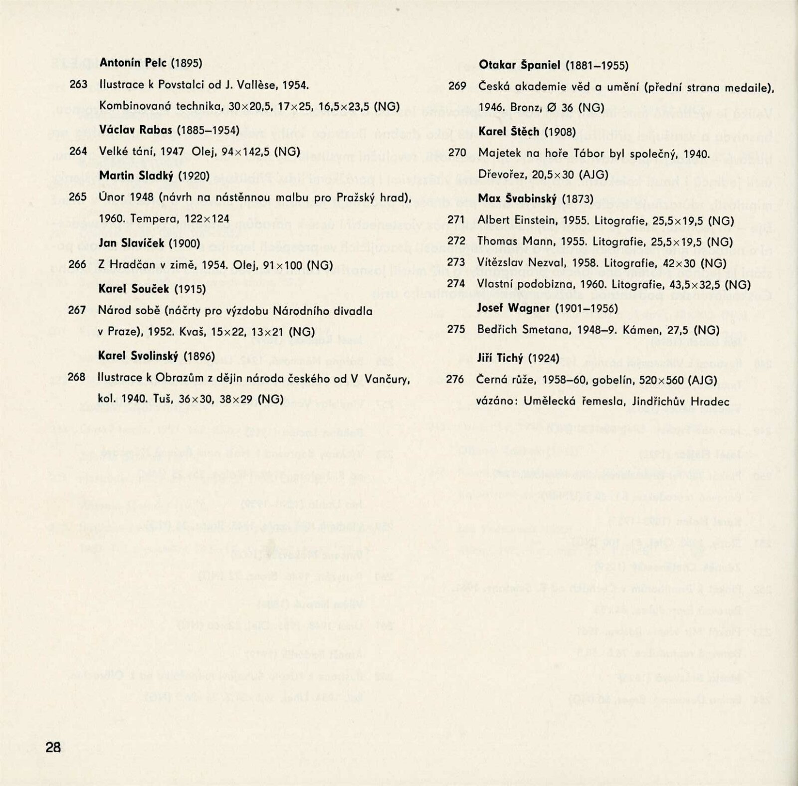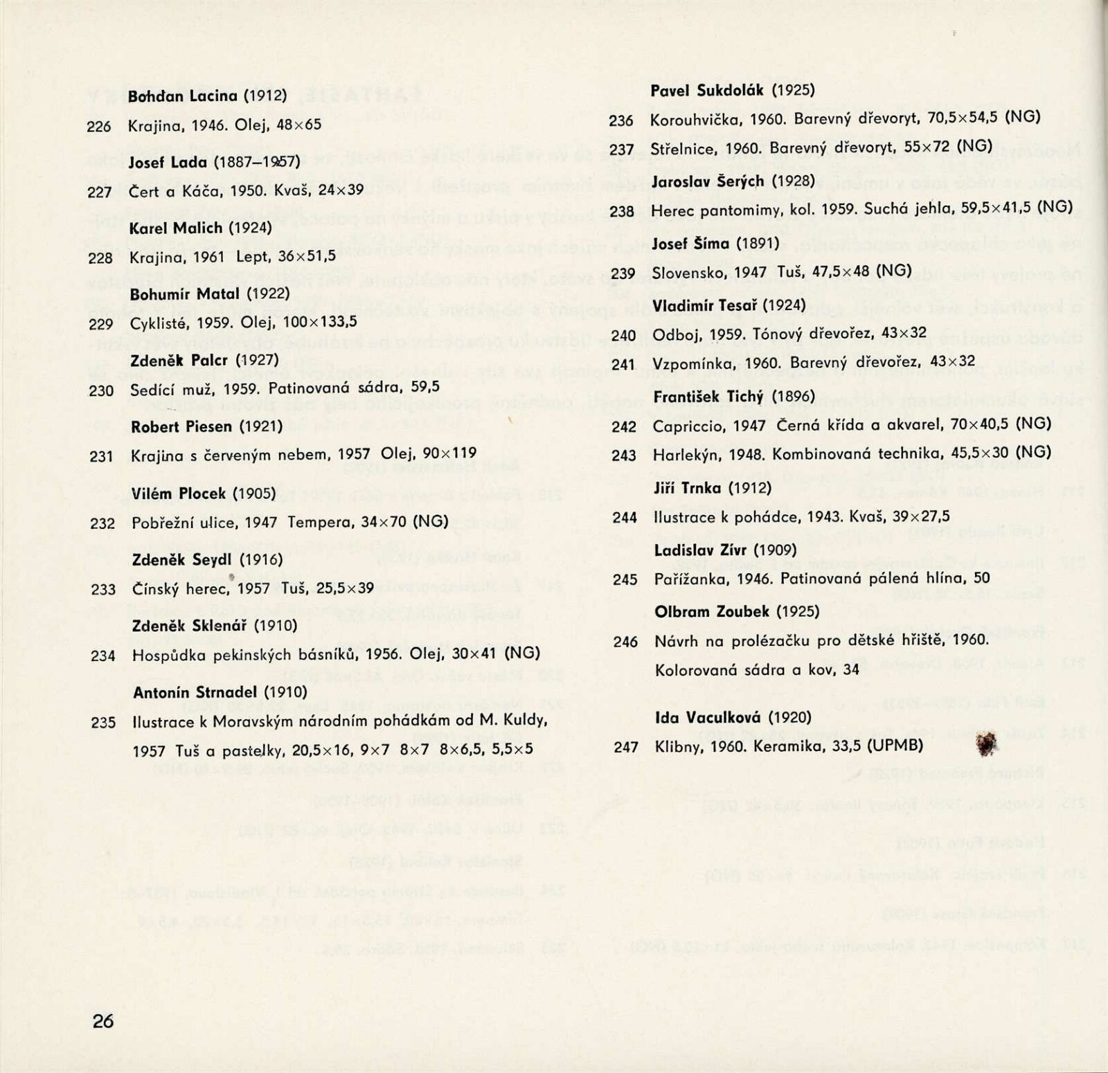 Konrád Babraj, Václav Bartovský, Jan Bauch, Miloš A. Bazovský, Vincenc Beneš, Martin Benka, František Bidlo, Cyril Bouda, Josef Brož, Vratislav H. Brunner, Josef Čapek, Olga Čechová, Karel Černý, Miroslav J. Černý, Petr Dillinger, Bedřich Dlouhý, František Doubrava, Josef Drahoňovský, Orest Dubay, Rudolf Dúbravec, Ferdiš Duša, Bohumír Dvorský, František Dvořák, Karel Dvořák, Václav Fiala, Emil Filla, Alois Fišárek, Josef Flejšar, František Foltýn, Richard Fremund, Vladimír Fuka, Ľudovít Fulla, Mikuláš Galanda, František Gross, Jaroslav Grus, Ladislav Guderna, Otto Gutfreund, Jiří Hadlač, Oldřich Hanzl, Václav Hejna, Karel Hladík, Vincent Hložník, Adolf Hoffmeister, Vlastislav Hofman, Karel Holan, Miloslav Holý, Jiří Horník, Vladimír Hroch, Karel Hruška, František Hudeček, Dalibor Chatrný, Zdeněk Chotěnovský, Pavel Janák, Ota Janeček, Vladimír Janoušek, Věra Janoušková, Josef Jíra, Miloš Jiránek, Marta Jirásková, František Jiroudek, Jiří John, Čestmír Kafka, František Kaláb, Josef Kaplický, Jan Koblasa, Jan Kodet, Jan Kojan, Stanislav Kolíbal, Bohdan Kopecký, Jozef Kostka, Pravoslav Kotík, Václav Koutský, Jaroslav Král, Rudolf Kremlička, Zdeněk Kratochvíl, Ludvík Kuba, Jánuš Kubíček, Josef Kubíček, Otakar Kubín, Bohumil Kubišta, František Kysela, Bohdan Lacina, Sylva Lacinová, Josef Lada, Jan Lauda, Kamil Lhoták, Karel Lidický, Josef Liesler, Věra Lišková, Adolf Loos, Cyprián Majerník, Vincenc Makovský, Josef Malejovský, Karel Malich, Josef Mařatka, Václav Mašek, Bohumír Matal, Dalibor Matouš, Ota Matoušek, Mária Medvecká, Václav Menšík, Eduard Milén, Josef Multrus, František Muzika, Karel Myslbek, Otakar Nejedlý, Eugen Nevan, Ladislav Novák, Václav V. Novák, Vilém Nowak, Arnošt Paderlík, Zdeněk Palcr, Jaroslav Paur, Antonín Pelc, František Peterka, Robert Piesen, Bedřich Piskač, Vilém Plocek, Karel Pokorný, Antonín Procházka, Linka Procházková, Jindřich Prucha, Václav Rabas, Vlastimil Rada, Jindřiška Radová, Jan Rambousek, Martin Reiner, Marie Rychlíková, Martin Salcman, Vojtěch Sedláček, Zdeněk Seydl, Jiří Schmidt, Václav Sivko, Zdeněk Sklenář, Martin Sladký, Antonín Slavíček, Jan Slavíček, Jan Smetana, Koloman Sokol, Alois Sopr, Karel Souček, Antonín Strnadel, Pavel Sukdolák, Karel Svolinský, Vladimír Sychra, Jaroslav Šerých, Josef Šíma, Lev Šimák, Václav Špála, Otakar Španiel, Karel Štěch, Karel Štika, Jan Štursa, Karel Šourek, Max Švabinský, M. Teinitzerová, Vladimír Tesař, František Tichý, Jiří Tichý, Vojtěch Tittelbach, Jan Trampota, Jiří Trnka, Vladislav Vaculka, Ida Vaculková, Jitka Válová, Květa Válová, Bedřich Vaníček, Vincenc Vingler, Alois Vitík, Vilma Vrbová, Karel Vysušil, Josef Wagner, Jindřich Wielgus, Richard Wiesner, Adolf Zábranský, Ladislav Zívr, Ernest Zmeták, Olbram Zoubek, Jan Zrzavý, Ján Želibský, Jiřina Žertová