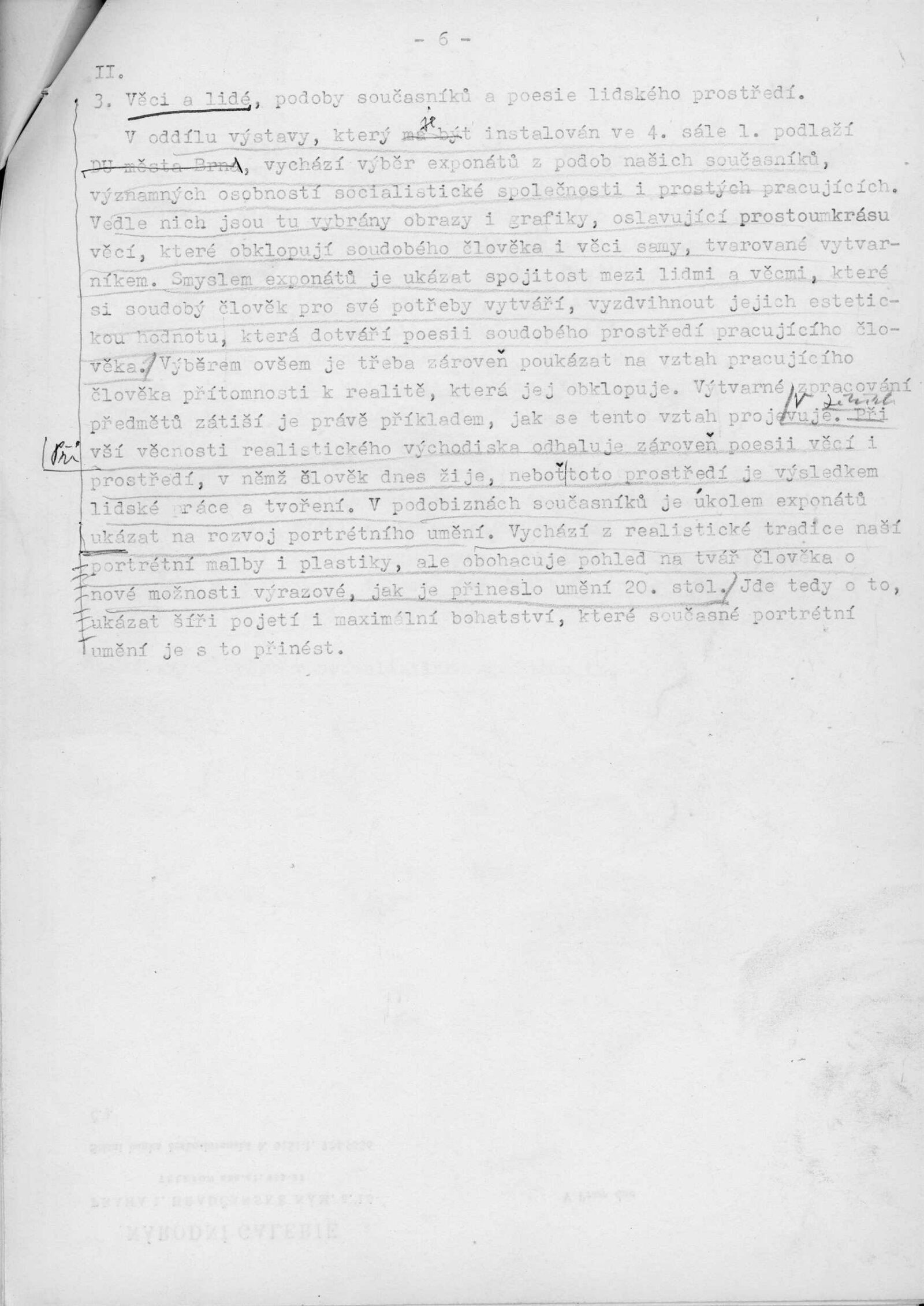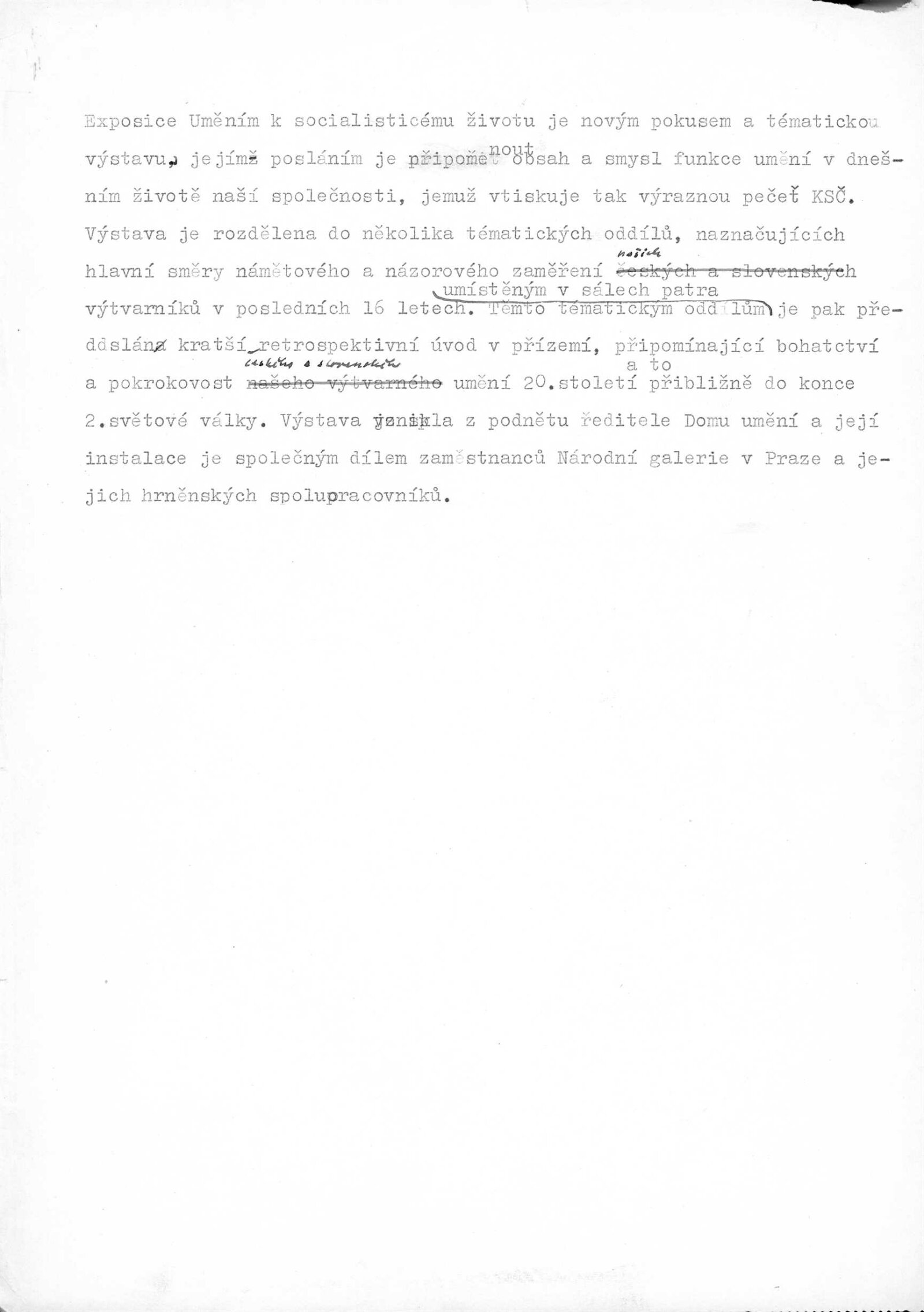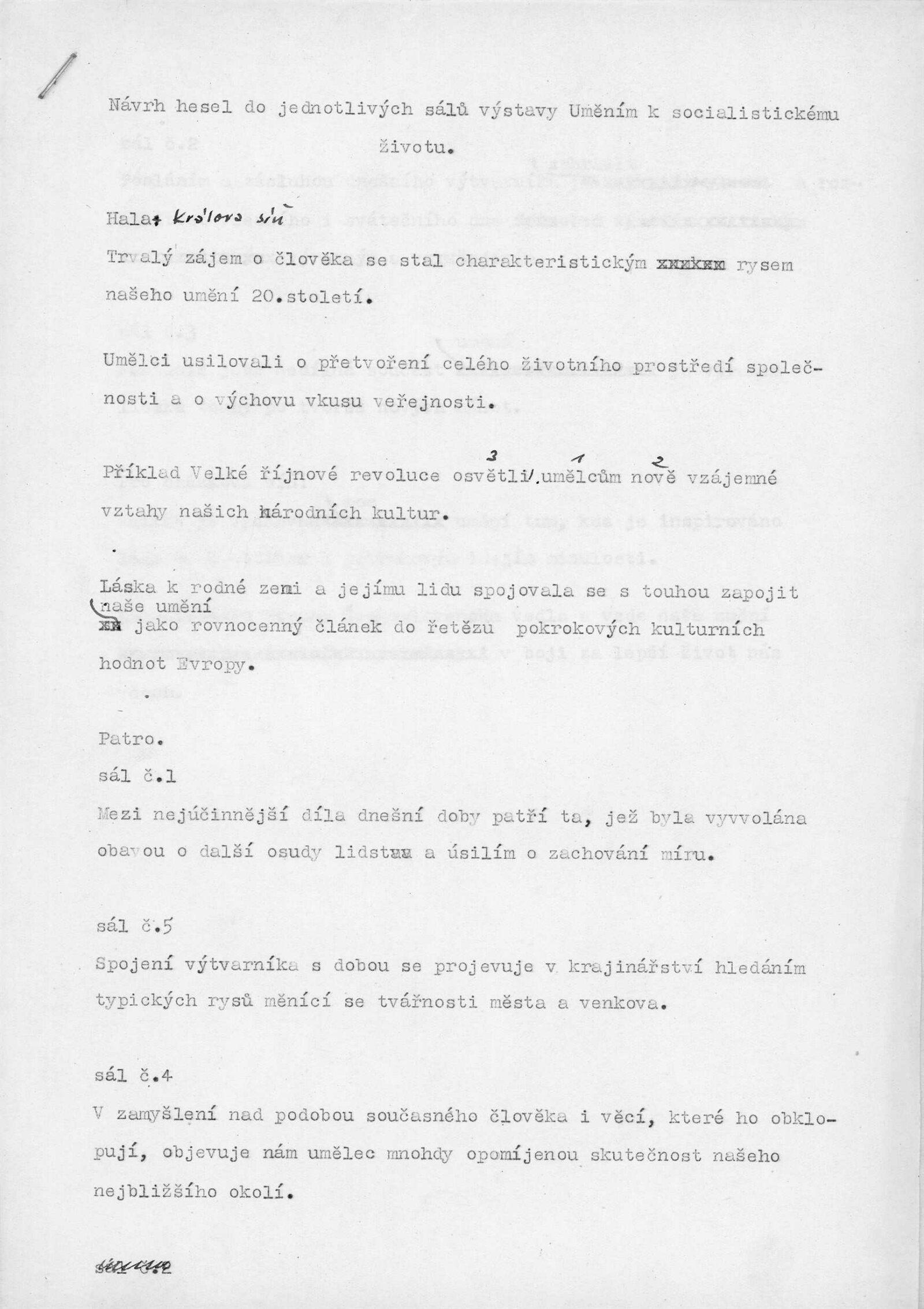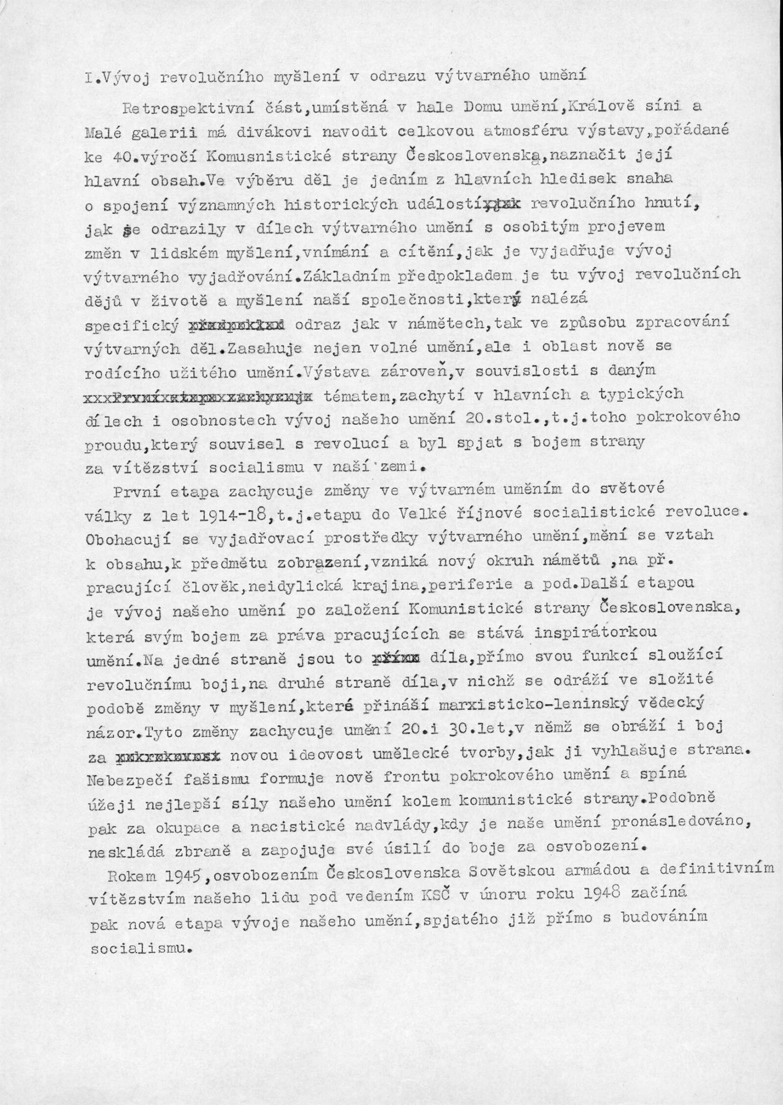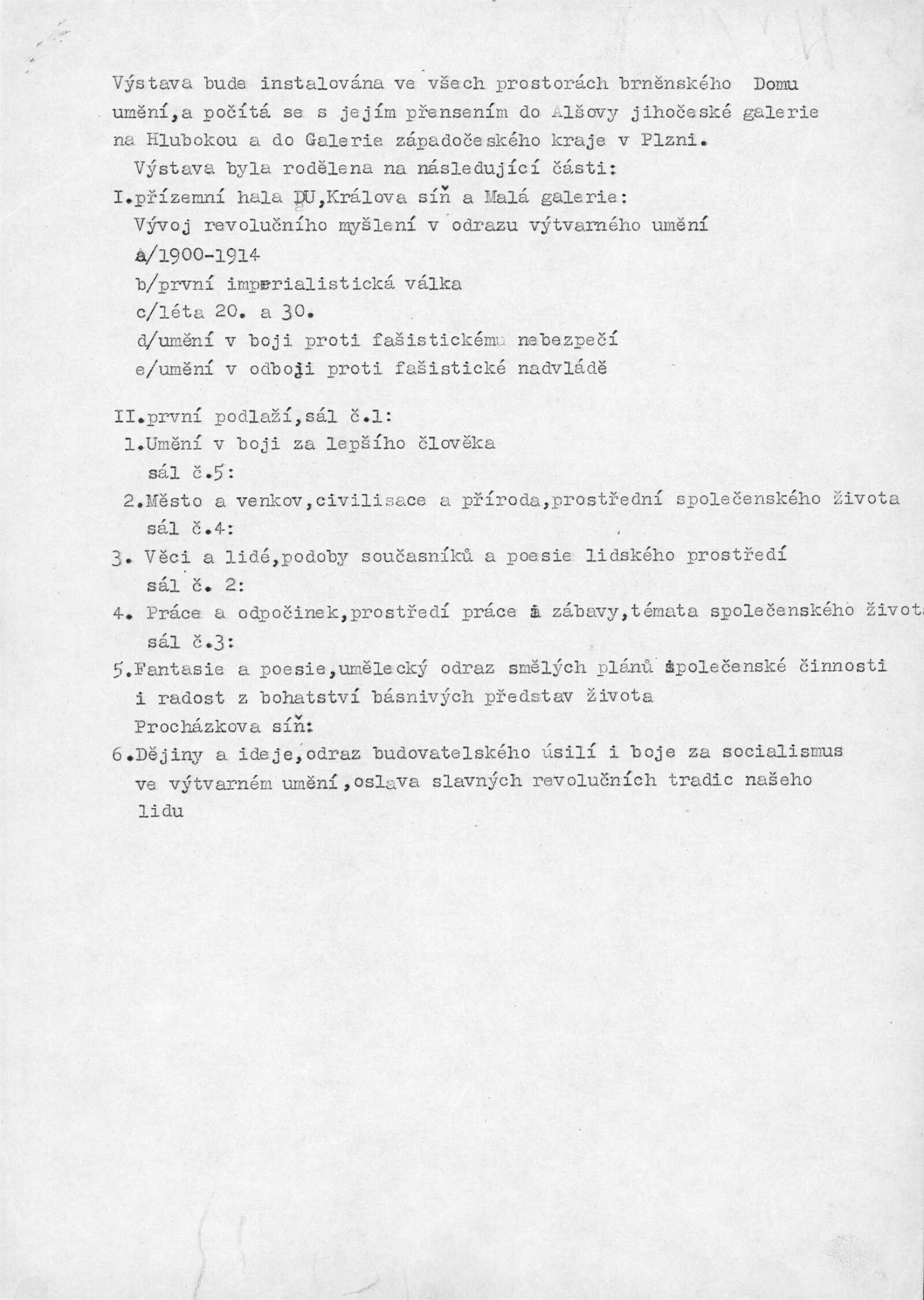 pozvánka (DU a Alšova jihočeská galerie v Hluboké), katalog, strojopis textu (Jaromír Zemina, V. Pelíšek), podklady pro katalog (foto + autotypie), návrh libreta výstavy a def. verze, návrh hesel do výstavy, definitivní seznam děl, cyklostyl. text – pozvání na výstavu, prezenční listina (tisk, konference), seznam prací jednotlivých tematických a ideových celků výstavy, fotografie z instalace výstavy v DU, korespondence (dopis ředitele NG J. Krofty k libretu, korespondence – záštita, Hložník, Durasová, zamítavý dopis Svolinského, K. Vaca, zvací dopisy – Barák, Hendrych, Kahuda aj., dopis NG – návrhy besed, arch. řešení výstavy), reverzy nevyzvednutých exponátů, reverzy Praha, Brno, Bratislava, žádosti o zapůjčení výstavy, potvrzení o vracení děl, rukopis žádosti o foto od S. Machonina, předání výstavy AJG, zpráva o akcích DU ke 40. výročí KSČ, pojištění exponátů, majitelé děl, seznamy vrácených děl, recenze v tisku