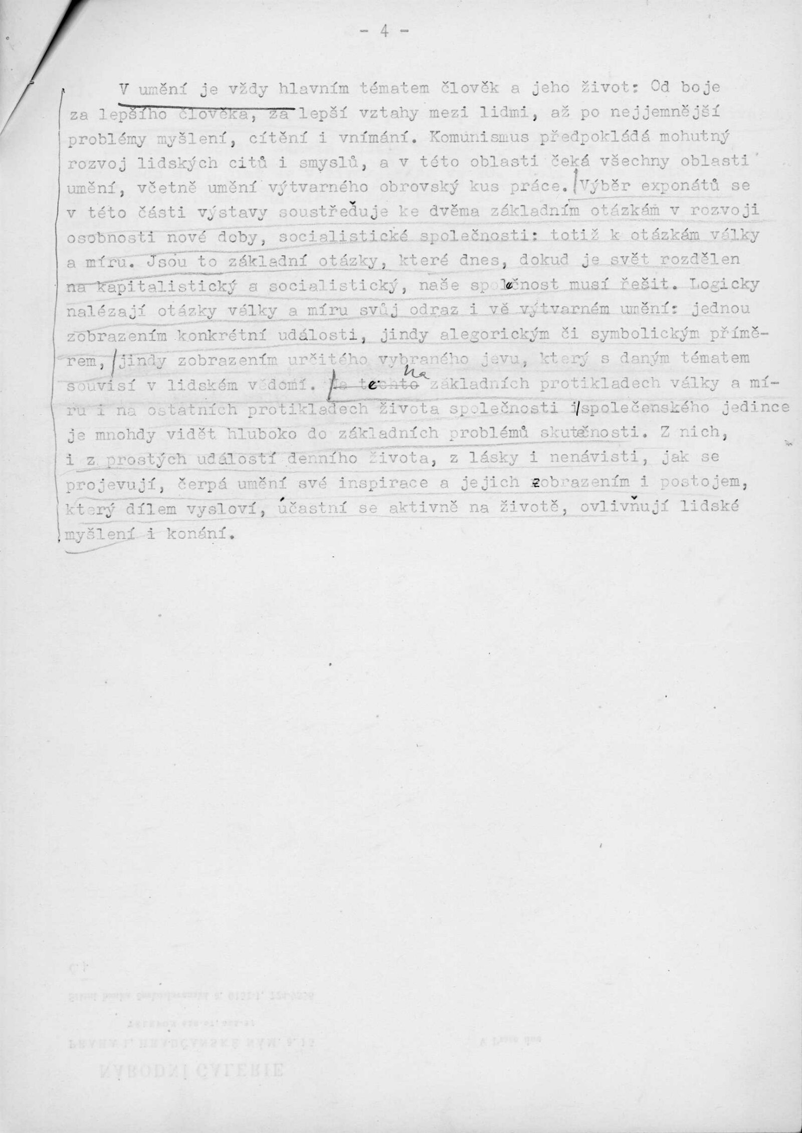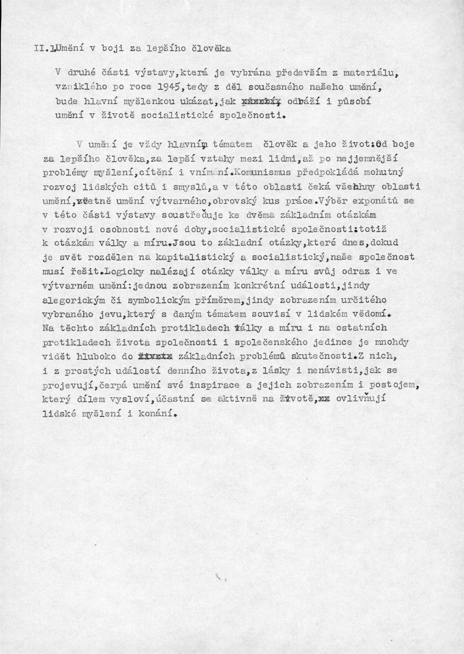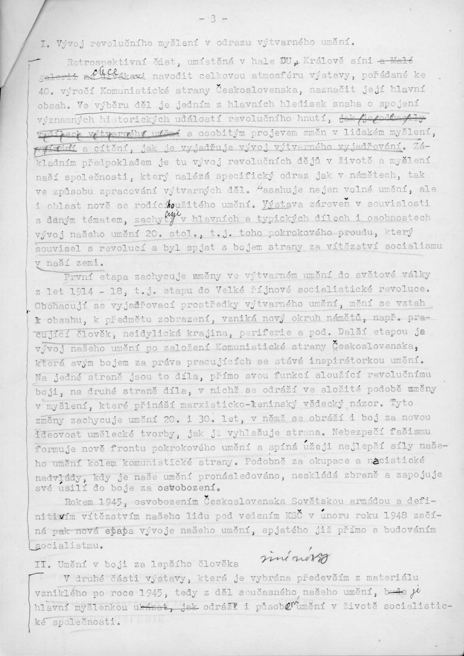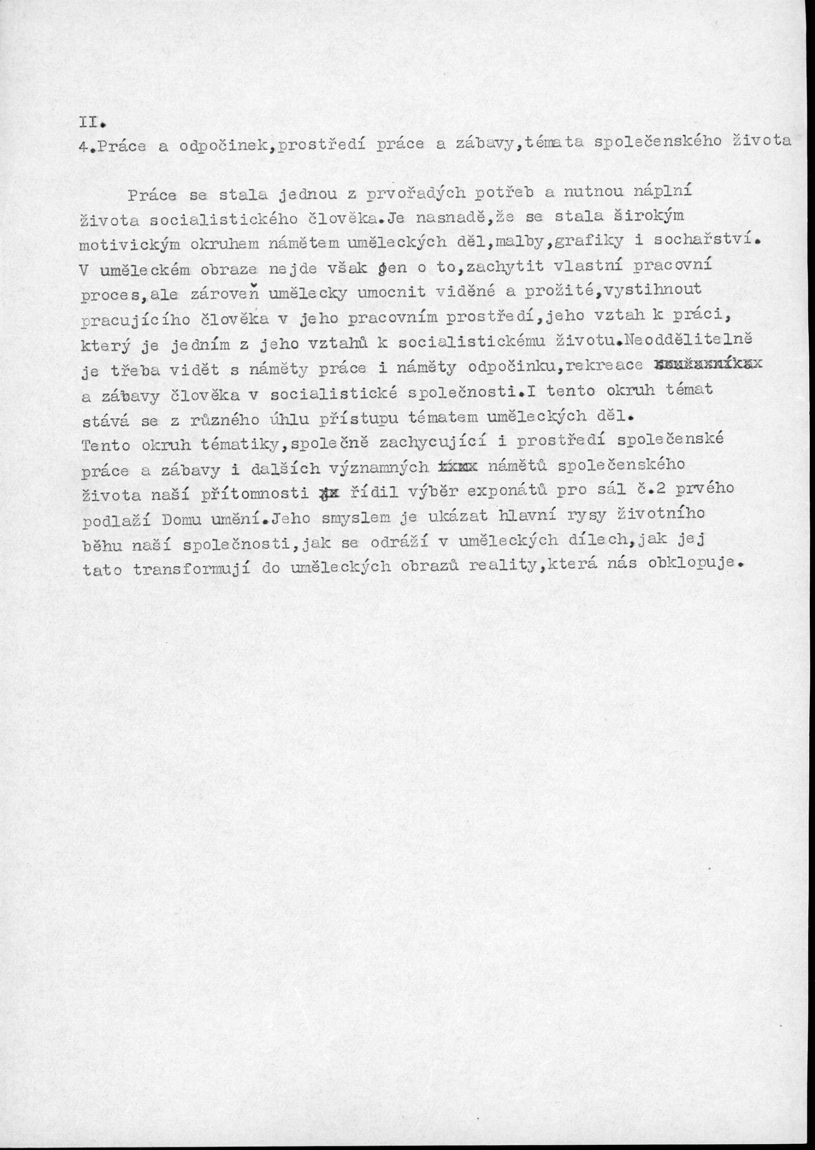 pozvánka (DU a Alšova jihočeská galerie v Hluboké), katalog, strojopis textu (Jaromír Zemina, V. Pelíšek), podklady pro katalog (foto + autotypie), návrh libreta výstavy a def. verze, návrh hesel do výstavy, definitivní seznam děl, cyklostyl. text – pozvání na výstavu, prezenční listina (tisk, konference), seznam prací jednotlivých tematických a ideových celků výstavy, fotografie z instalace výstavy v DU, korespondence (dopis ředitele NG J. Krofty k libretu, korespondence – záštita, Hložník, Durasová, zamítavý dopis Svolinského, K. Vaca, zvací dopisy – Barák, Hendrych, Kahuda aj., dopis NG – návrhy besed, arch. řešení výstavy), reverzy nevyzvednutých exponátů, reverzy Praha, Brno, Bratislava, žádosti o zapůjčení výstavy, potvrzení o vracení děl, rukopis žádosti o foto od S. Machonina, předání výstavy AJG, zpráva o akcích DU ke 40. výročí KSČ, pojištění exponátů, majitelé děl, seznamy vrácených děl, recenze v tisku