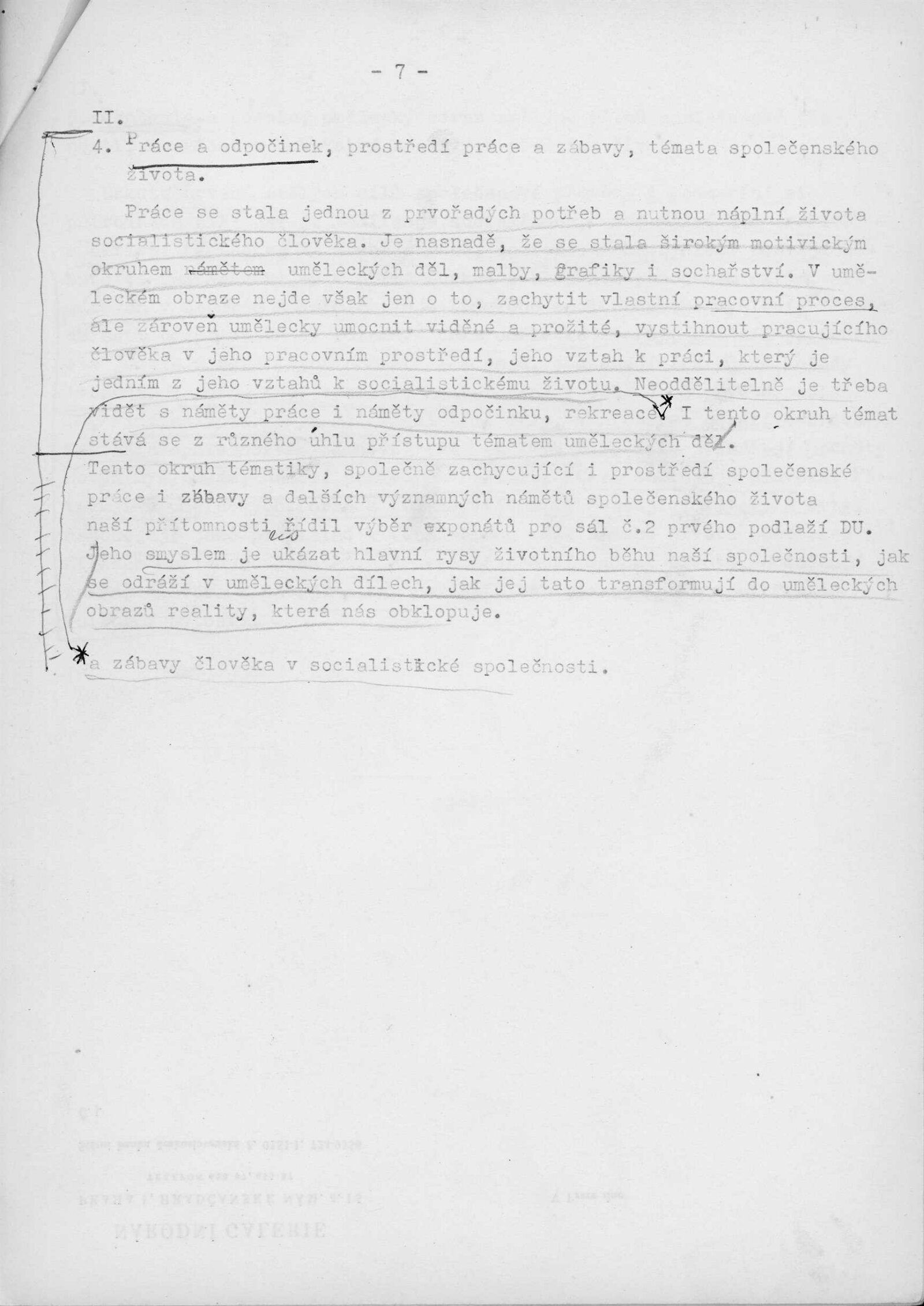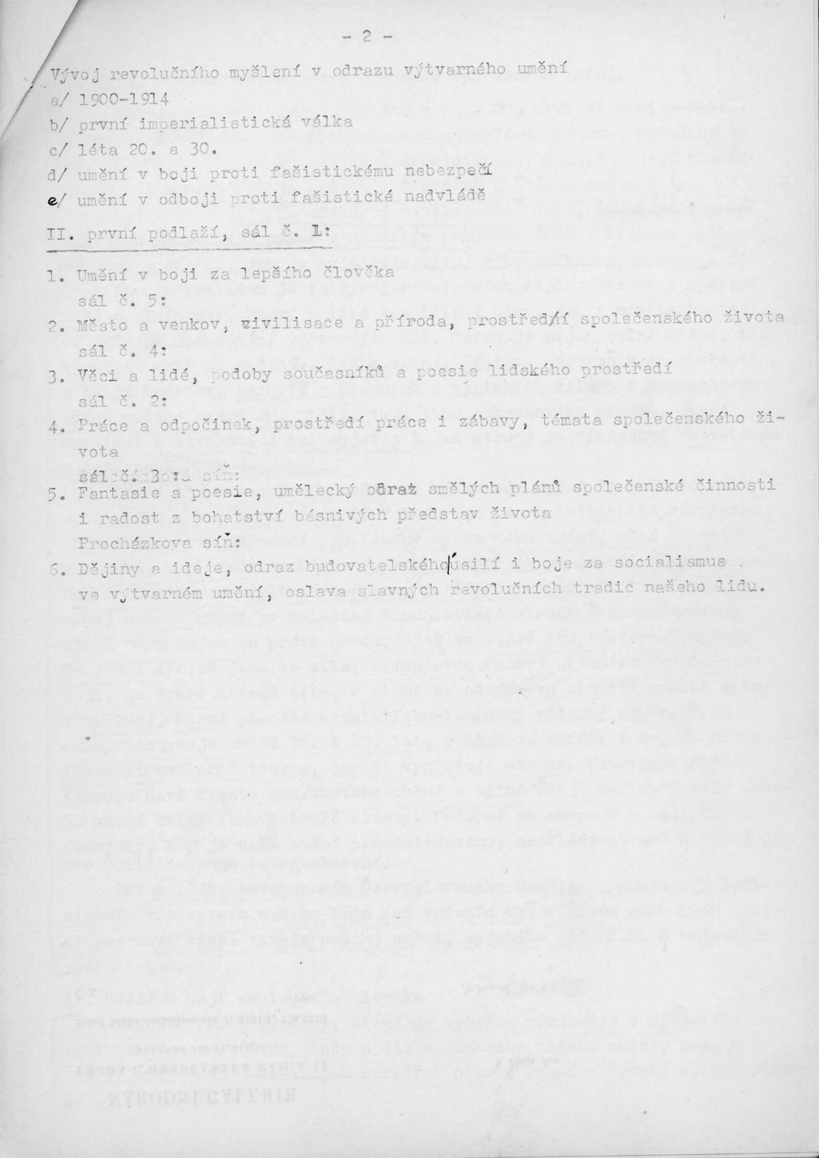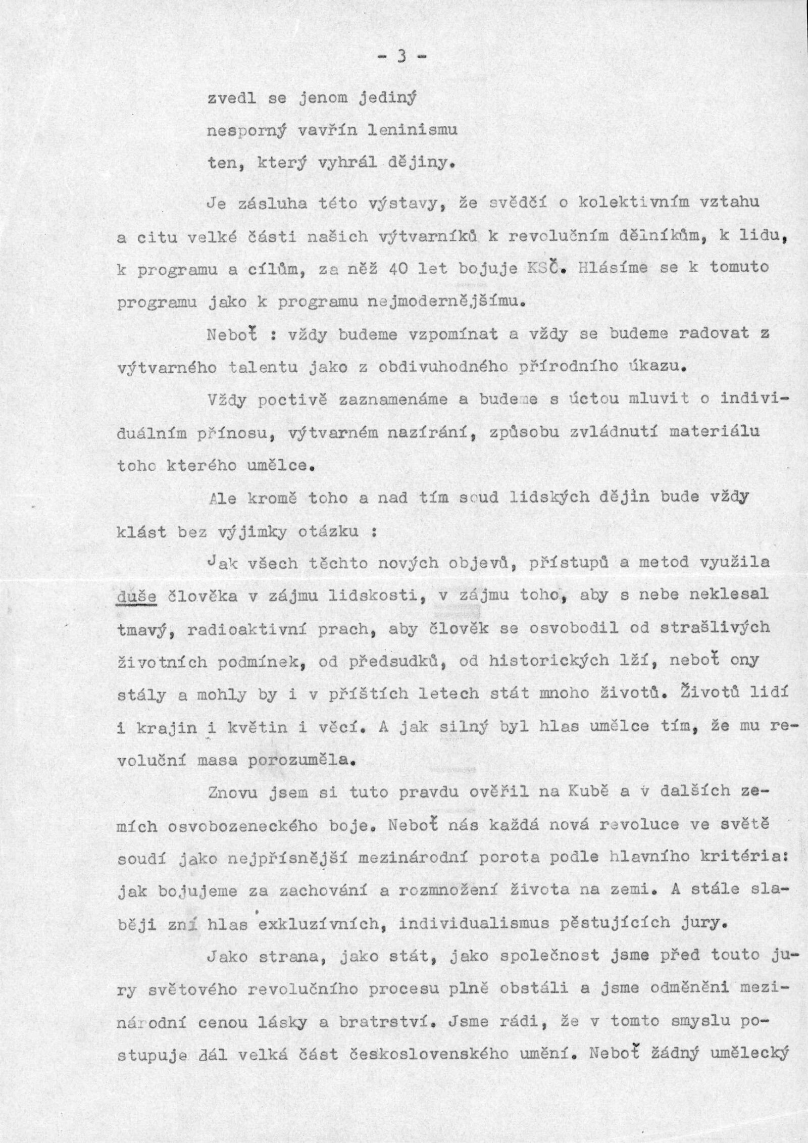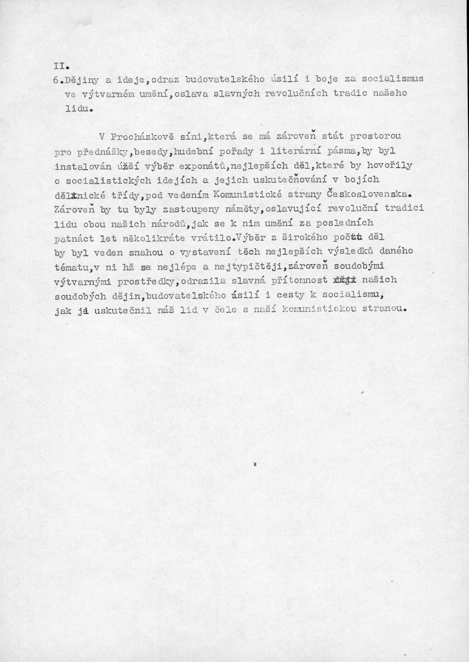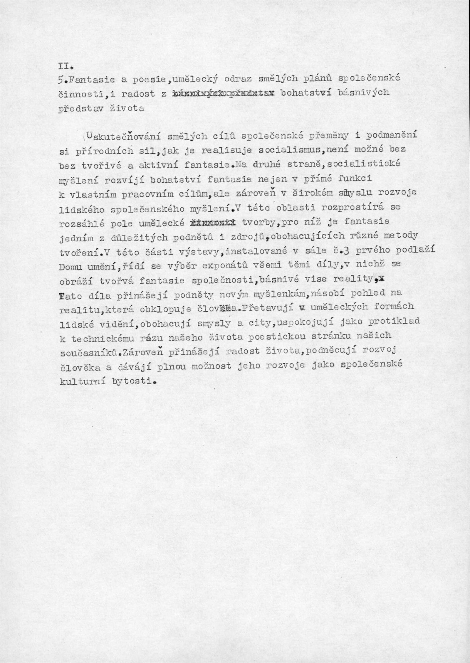 pozvánka (DU a Alšova jihočeská galerie v Hluboké), katalog, strojopis textu (Jaromír Zemina, V. Pelíšek), podklady pro katalog (foto + autotypie), návrh libreta výstavy a def. verze, návrh hesel do výstavy, definitivní seznam děl, cyklostyl. text – pozvání na výstavu, prezenční listina (tisk, konference), seznam prací jednotlivých tematických a ideových celků výstavy, fotografie z instalace výstavy v DU, korespondence (dopis ředitele NG J. Krofty k libretu, korespondence – záštita, Hložník, Durasová, zamítavý dopis Svolinského, K. Vaca, zvací dopisy – Barák, Hendrych, Kahuda aj., dopis NG – návrhy besed, arch. řešení výstavy), reverzy nevyzvednutých exponátů, reverzy Praha, Brno, Bratislava, žádosti o zapůjčení výstavy, potvrzení o vracení děl, rukopis žádosti o foto od S. Machonina, předání výstavy AJG, zpráva o akcích DU ke 40. výročí KSČ, pojištění exponátů, majitelé děl, seznamy vrácených děl, recenze v tisku