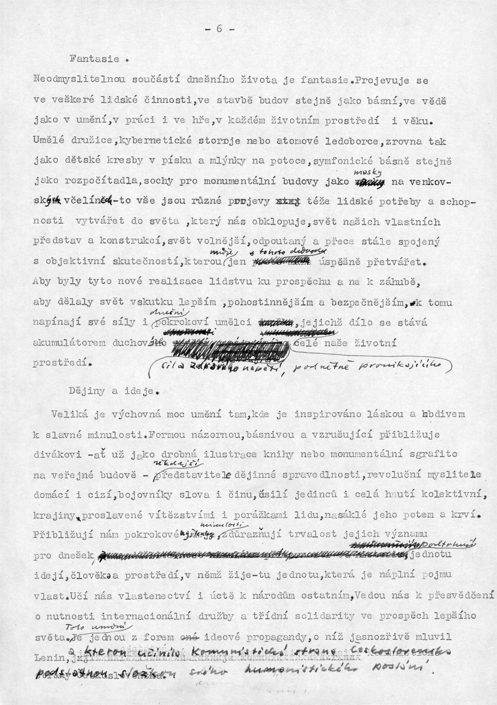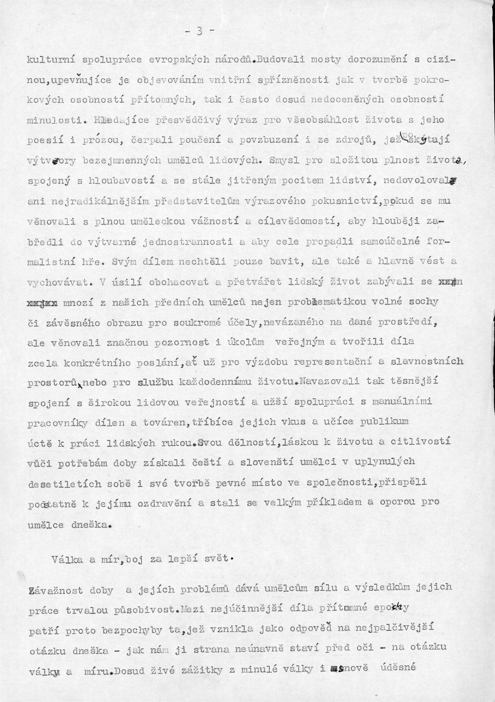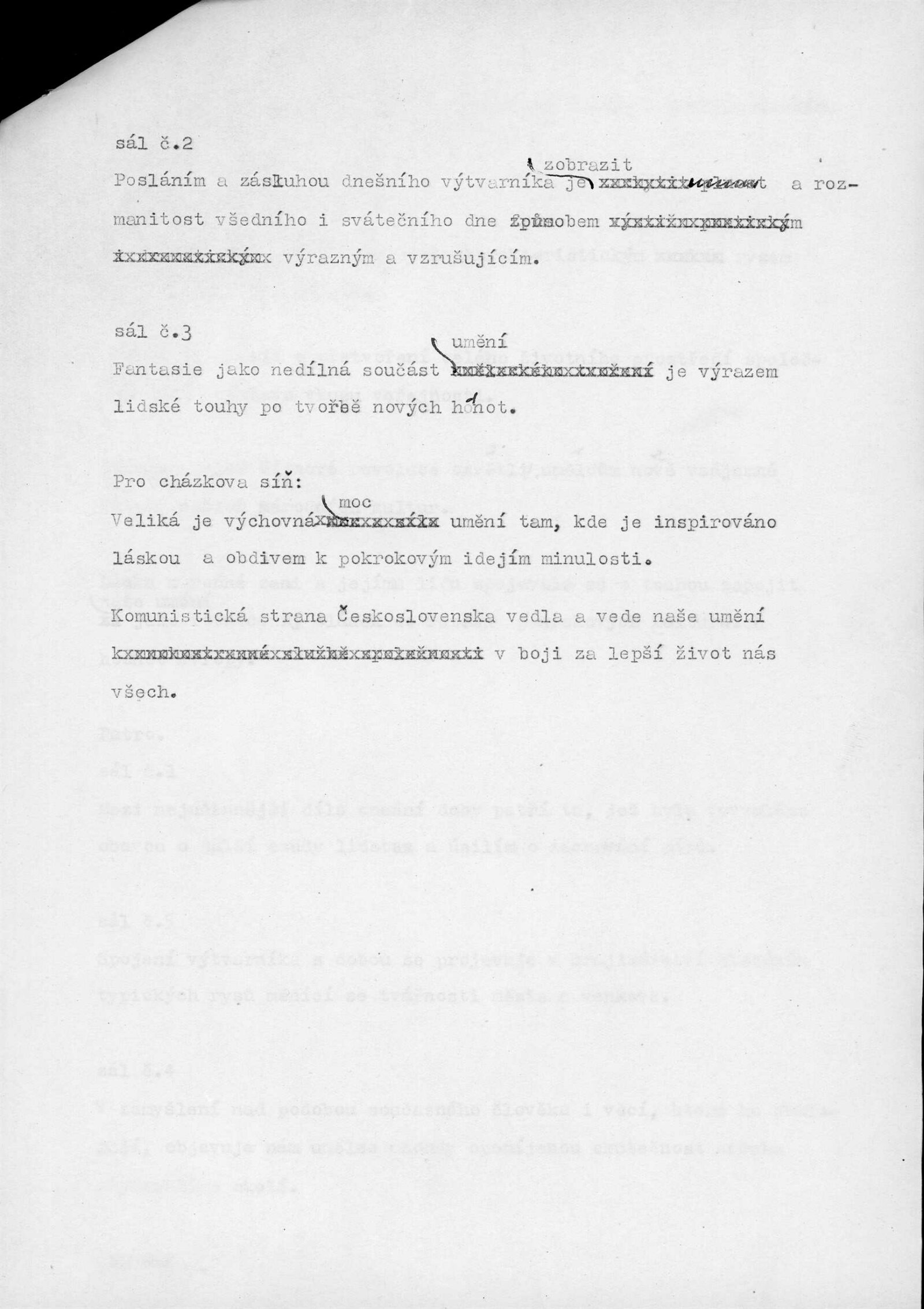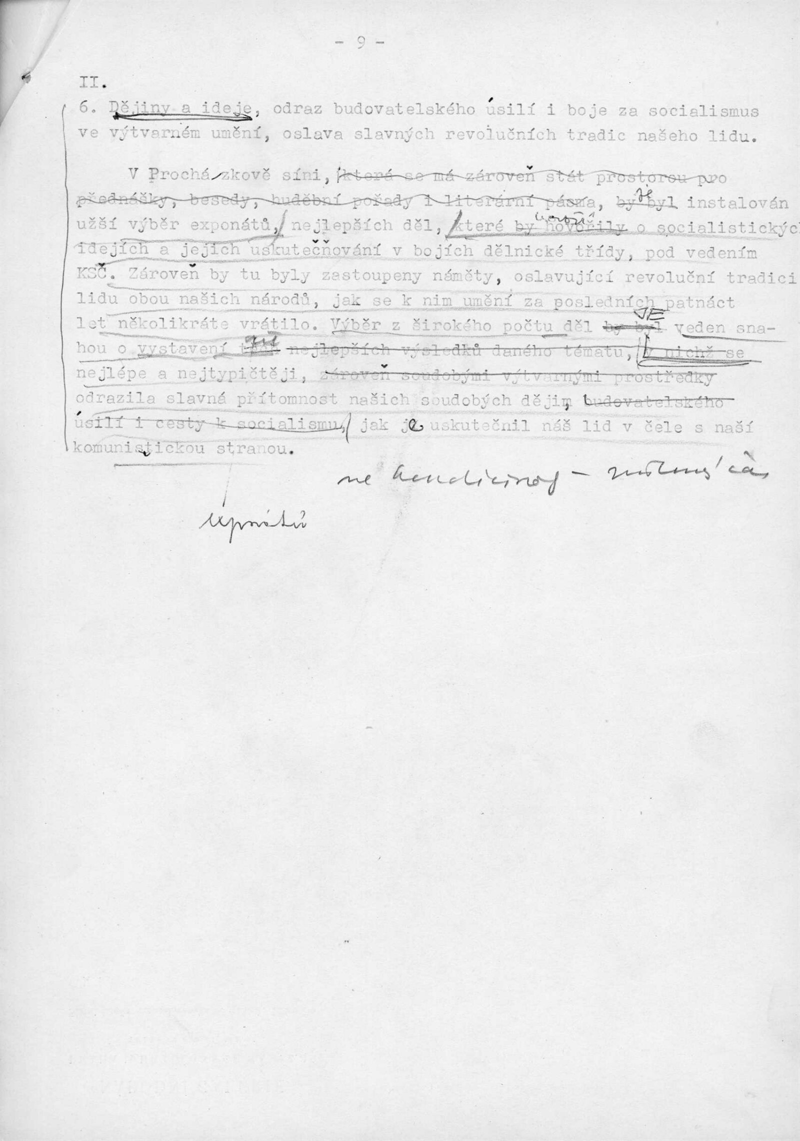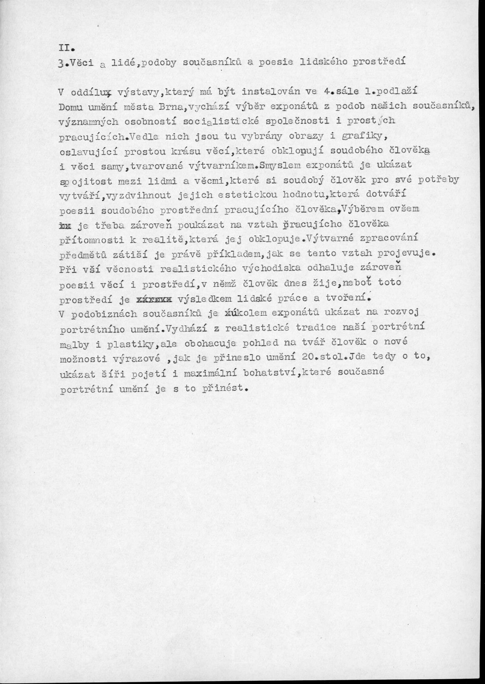 pozvánka (DU a Alšova jihočeská galerie v Hluboké), katalog, strojopis textu (Jaromír Zemina, V. Pelíšek), podklady pro katalog (foto + autotypie), návrh libreta výstavy a def. verze, návrh hesel do výstavy, definitivní seznam děl, cyklostyl. text – pozvání na výstavu, prezenční listina (tisk, konference), seznam prací jednotlivých tematických a ideových celků výstavy, fotografie z instalace výstavy v DU, korespondence (dopis ředitele NG J. Krofty k libretu, korespondence – záštita, Hložník, Durasová, zamítavý dopis Svolinského, K. Vaca, zvací dopisy – Barák, Hendrych, Kahuda aj., dopis NG – návrhy besed, arch. řešení výstavy), reverzy nevyzvednutých exponátů, reverzy Praha, Brno, Bratislava, žádosti o zapůjčení výstavy, potvrzení o vracení děl, rukopis žádosti o foto od S. Machonina, předání výstavy AJG, zpráva o akcích DU ke 40. výročí KSČ, pojištění exponátů, majitelé děl, seznamy vrácených děl, recenze v tisku