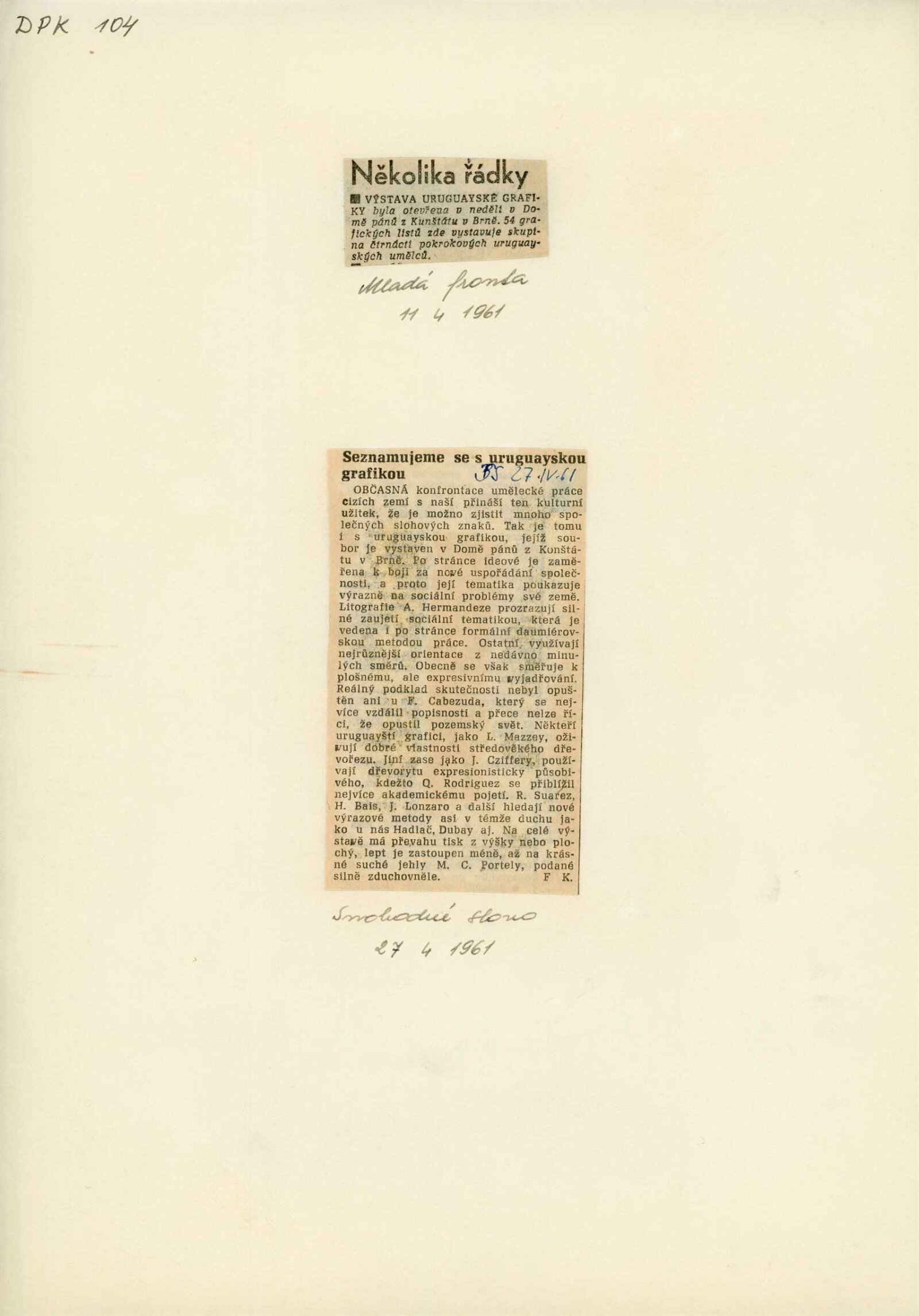strojopis pozvánky, seznam vystavených děl, korespondence (MŠK, provozní korespondence), recenze v tisku