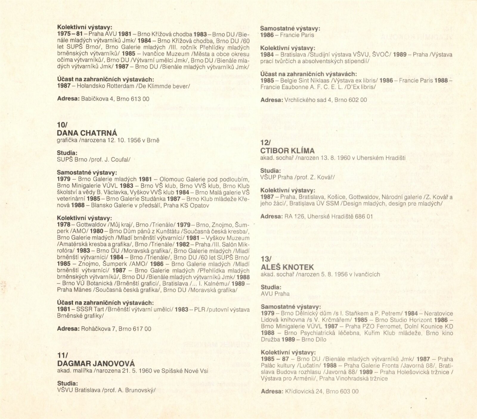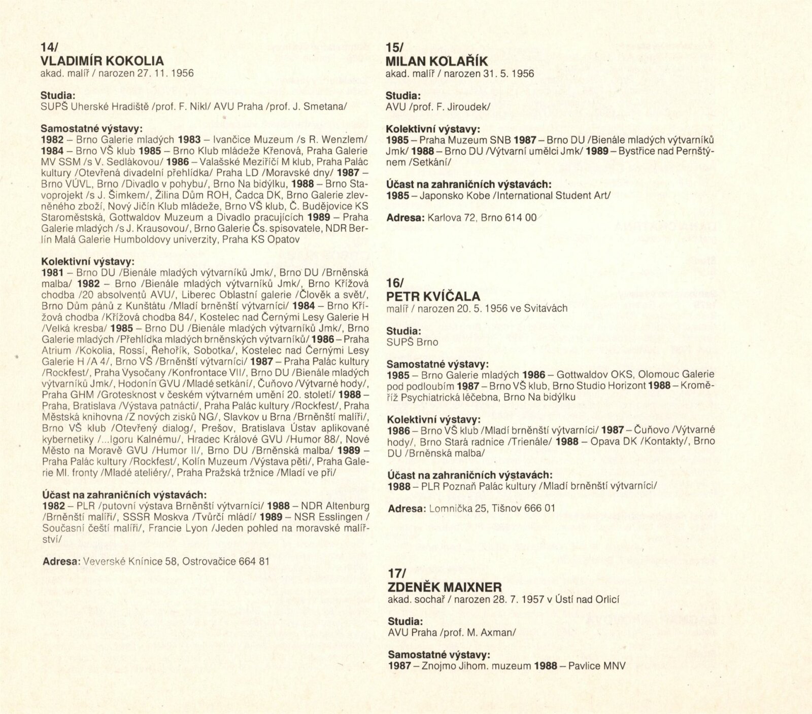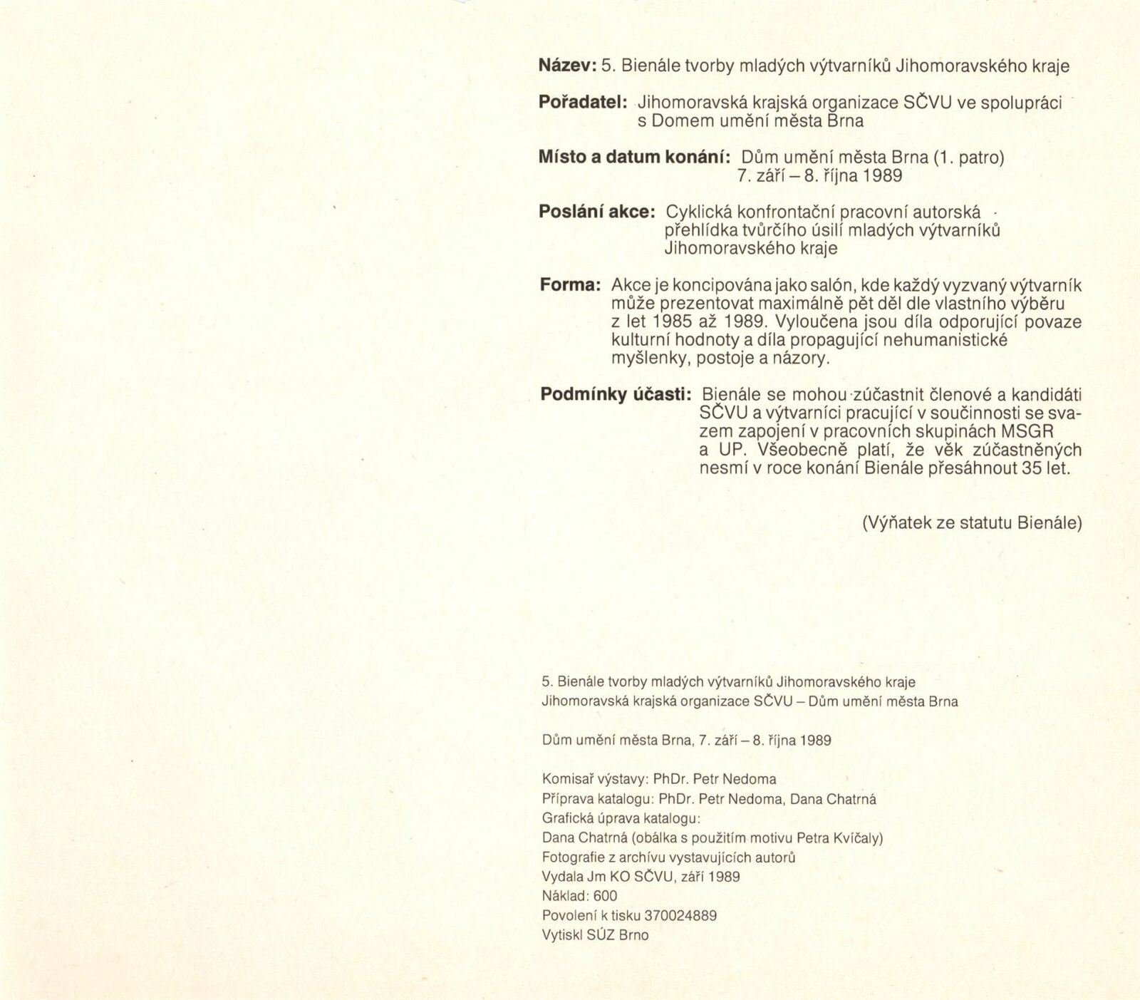Páté bienále mladých výtvarníků Jihomoravského kraje: Dům umění města Brna, 1. patro, 7. 9. – 8. 10. 1989 / Brno: SČVU, 1989. – [12] s., obr., na obalu životní data vystavujících, DU 872