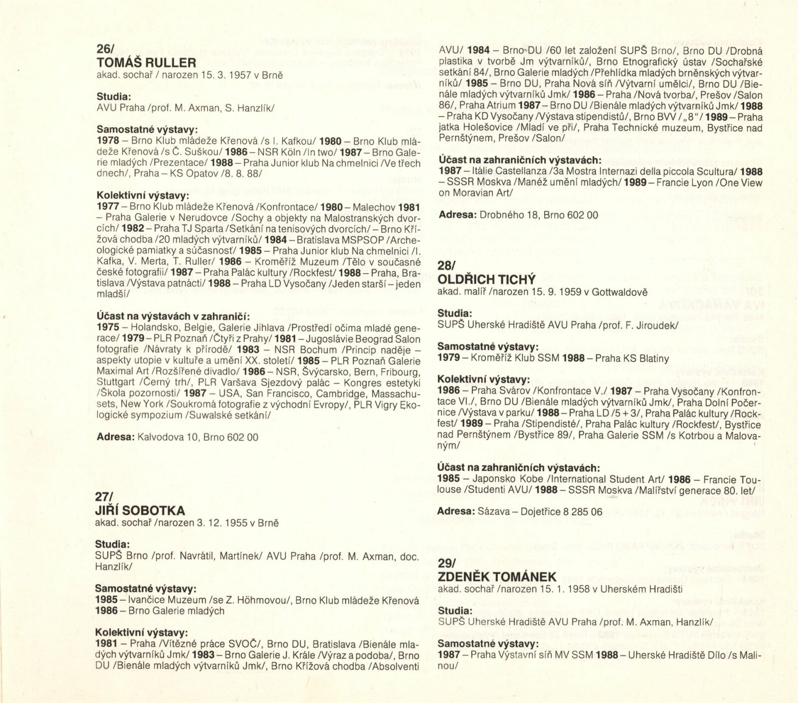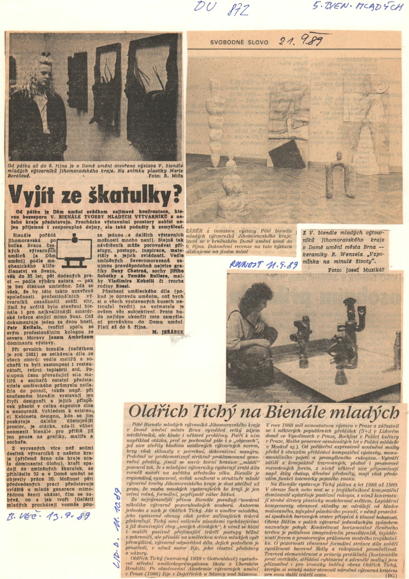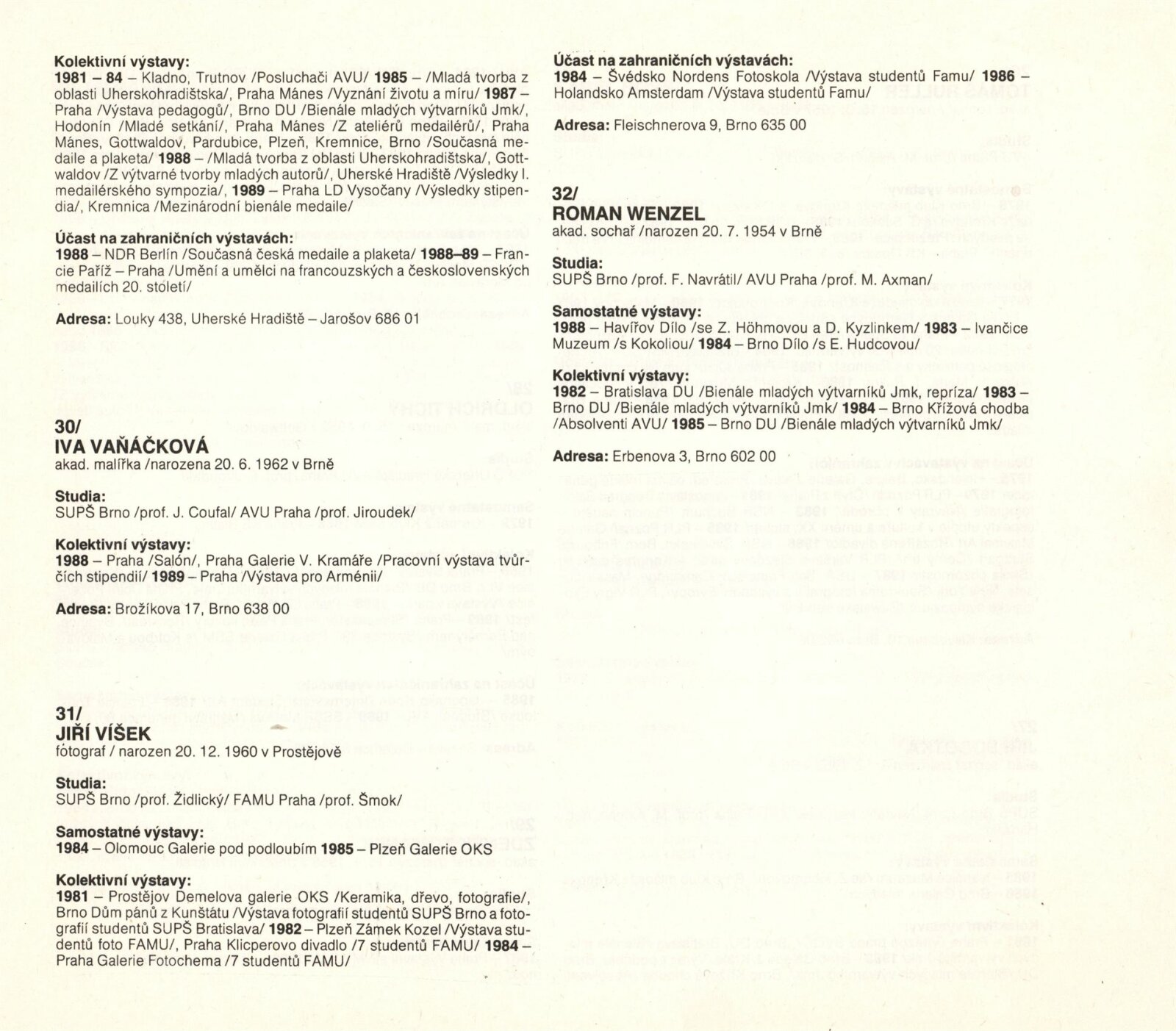 Páté bienále mladých výtvarníků Jihomoravského kraje: Dům umění města Brna, 1. patro, 7. 9. – 8. 10. 1989 / Brno: SČVU, 1989. – [12] s., obr., na obalu životní data vystavujících, DU 872