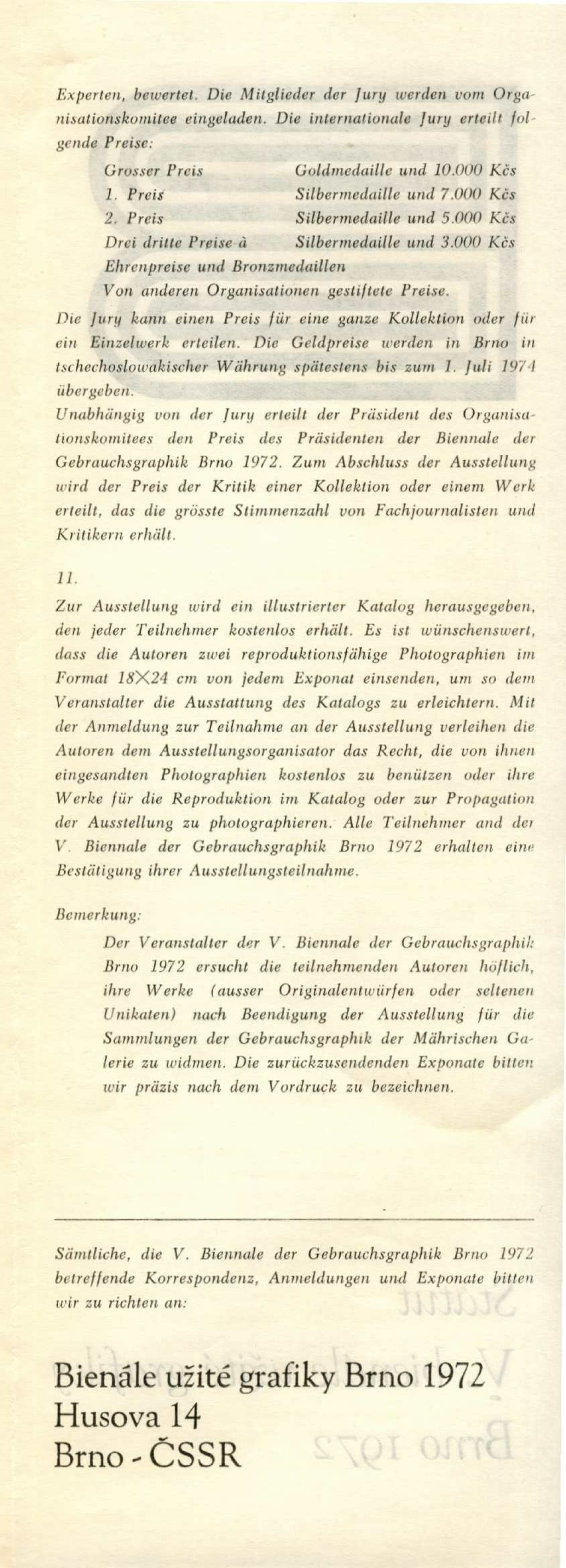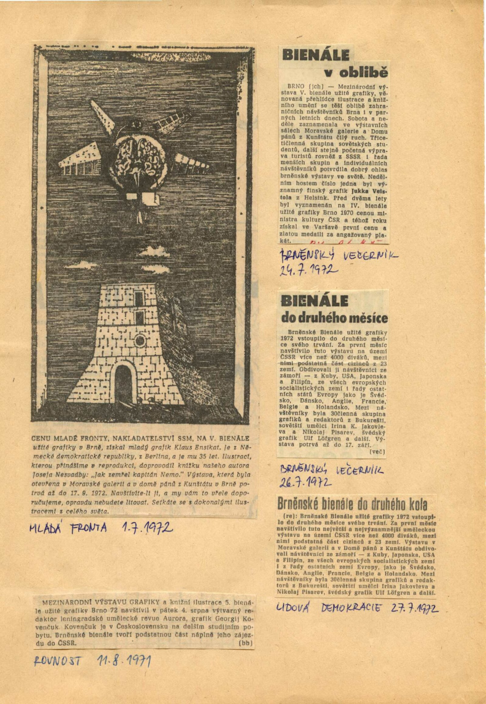 Mezinárodní výstava ilustrace a knižní grafiky. V. bienále užité grafiky Brno 1972: Dům umění města Brna / Dům pánů z Kunštátu a Moravská galerie v Brně, 14. 6. – 24. 9. 1972 / Text: Jiří Hlušička. – Brno: Moravská galerie, – 326 s., obr., životní data vystavujících (též francouzsky). Obsahuje přehled oceněných autorů předchozích výstav. DPK 512. – MZK