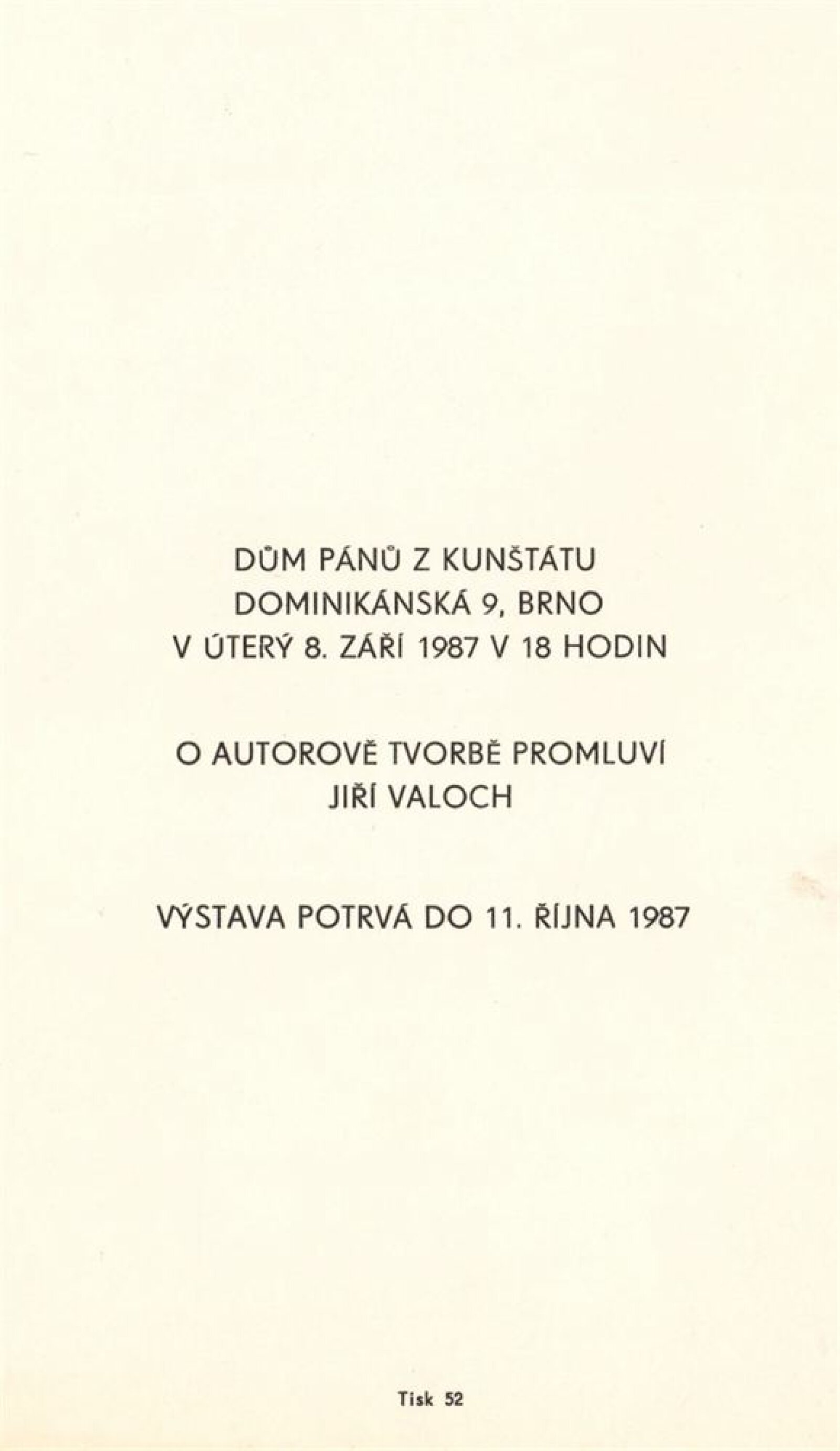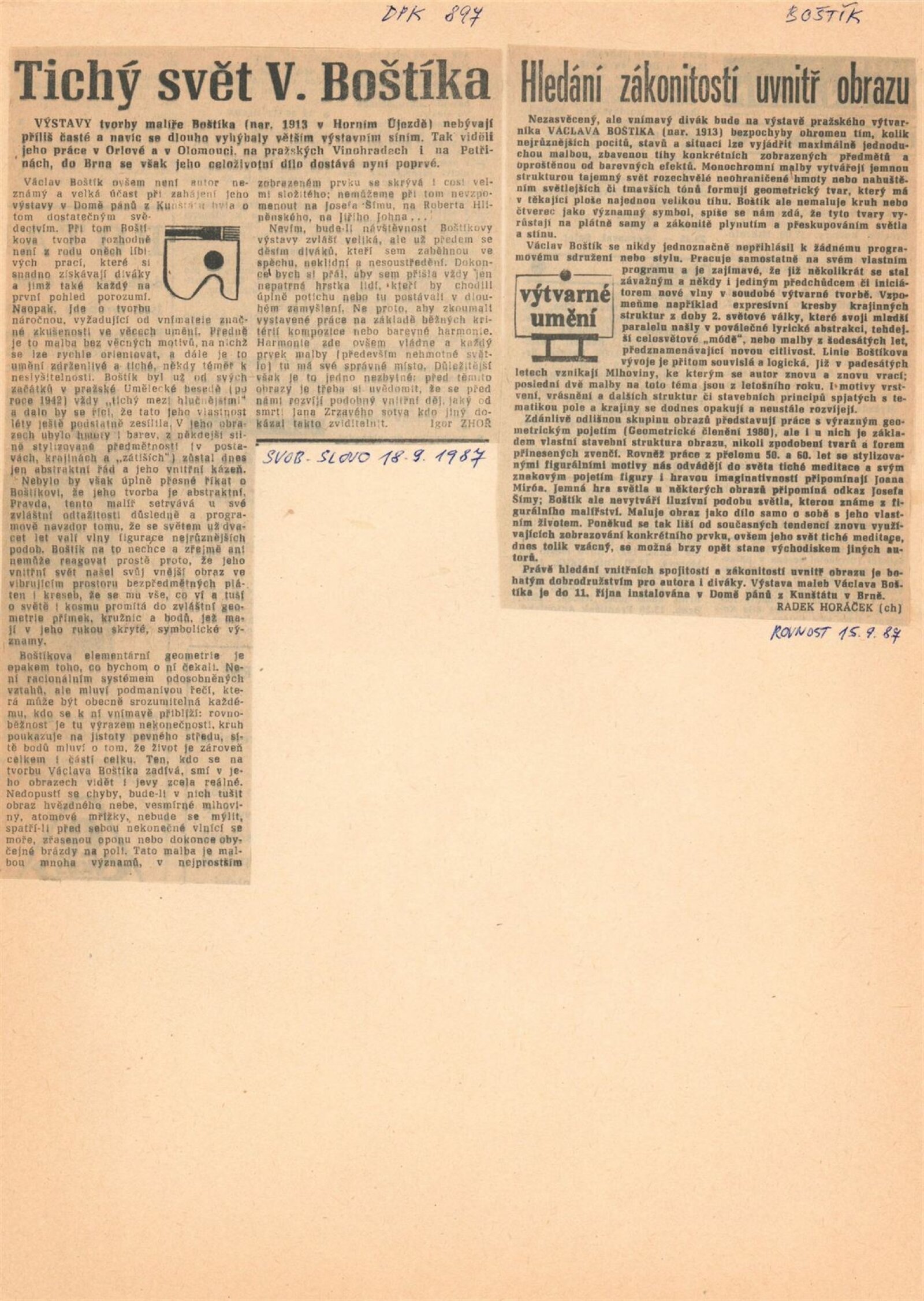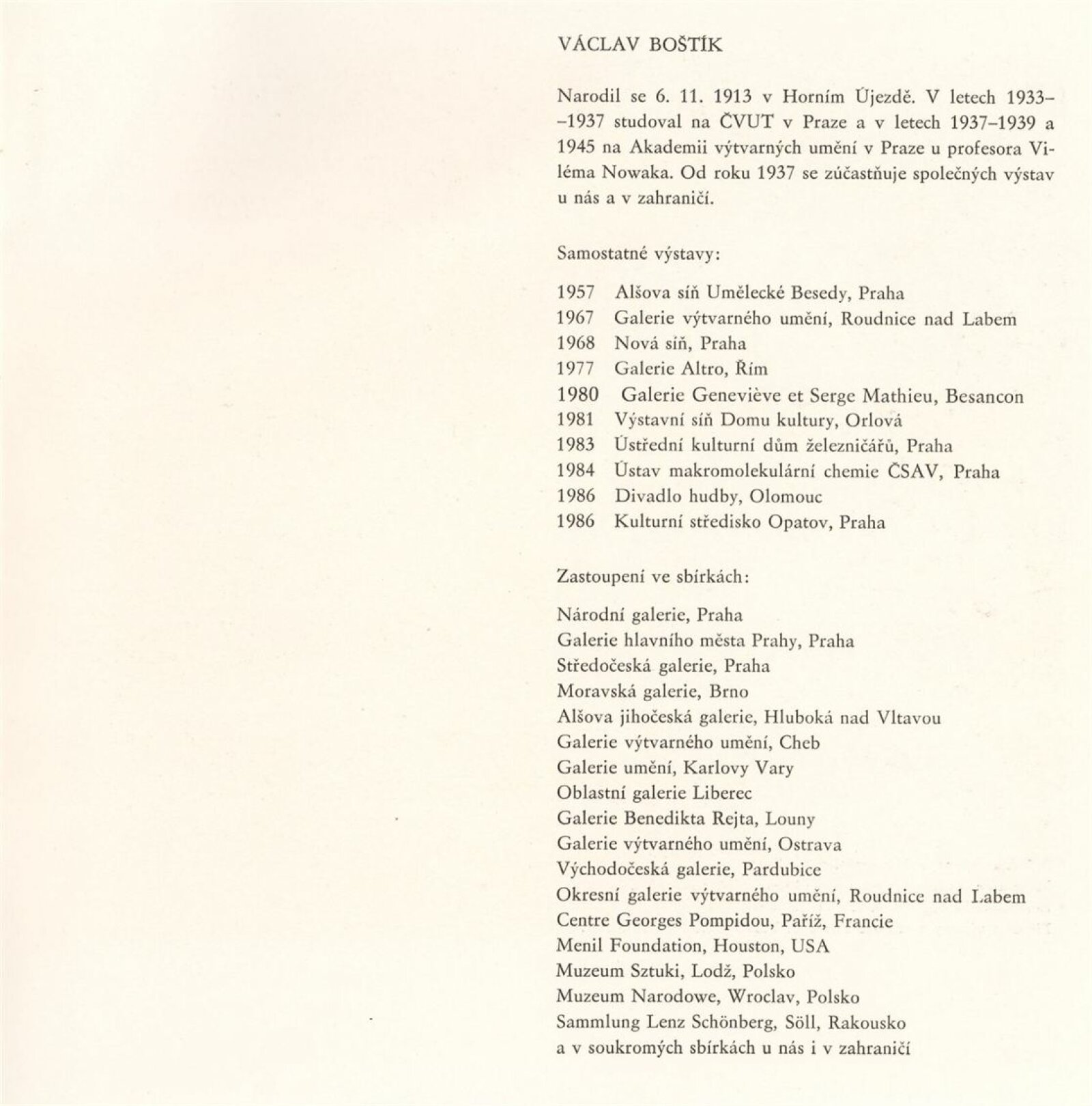 Václav Boštík: Dům umění / Dům pánů z Kunštátu, 8. 9. – 11. 10. 1987 / Text: Jiří Valoch. – Brno: DUmB, 1987. – [28] s., obr., životní data, výstavy, zastoupení ve sbírkách, DPK 897. – MZK; MG; MMB