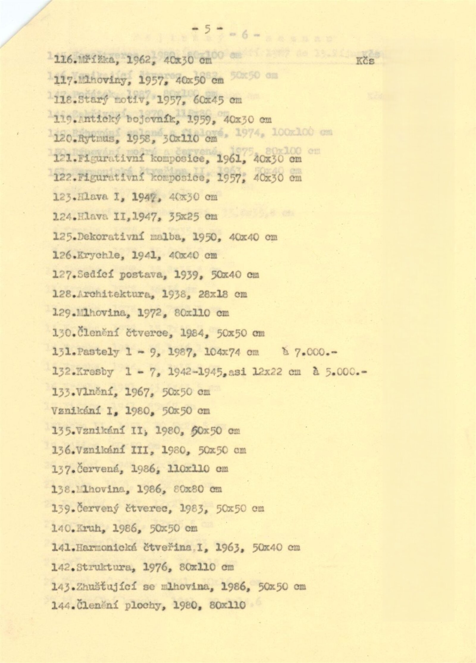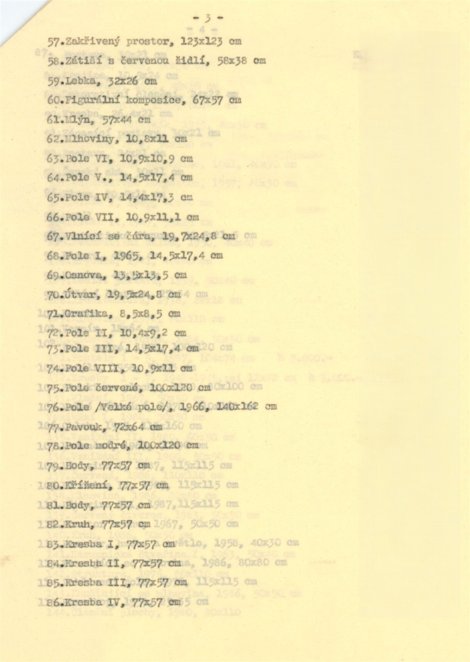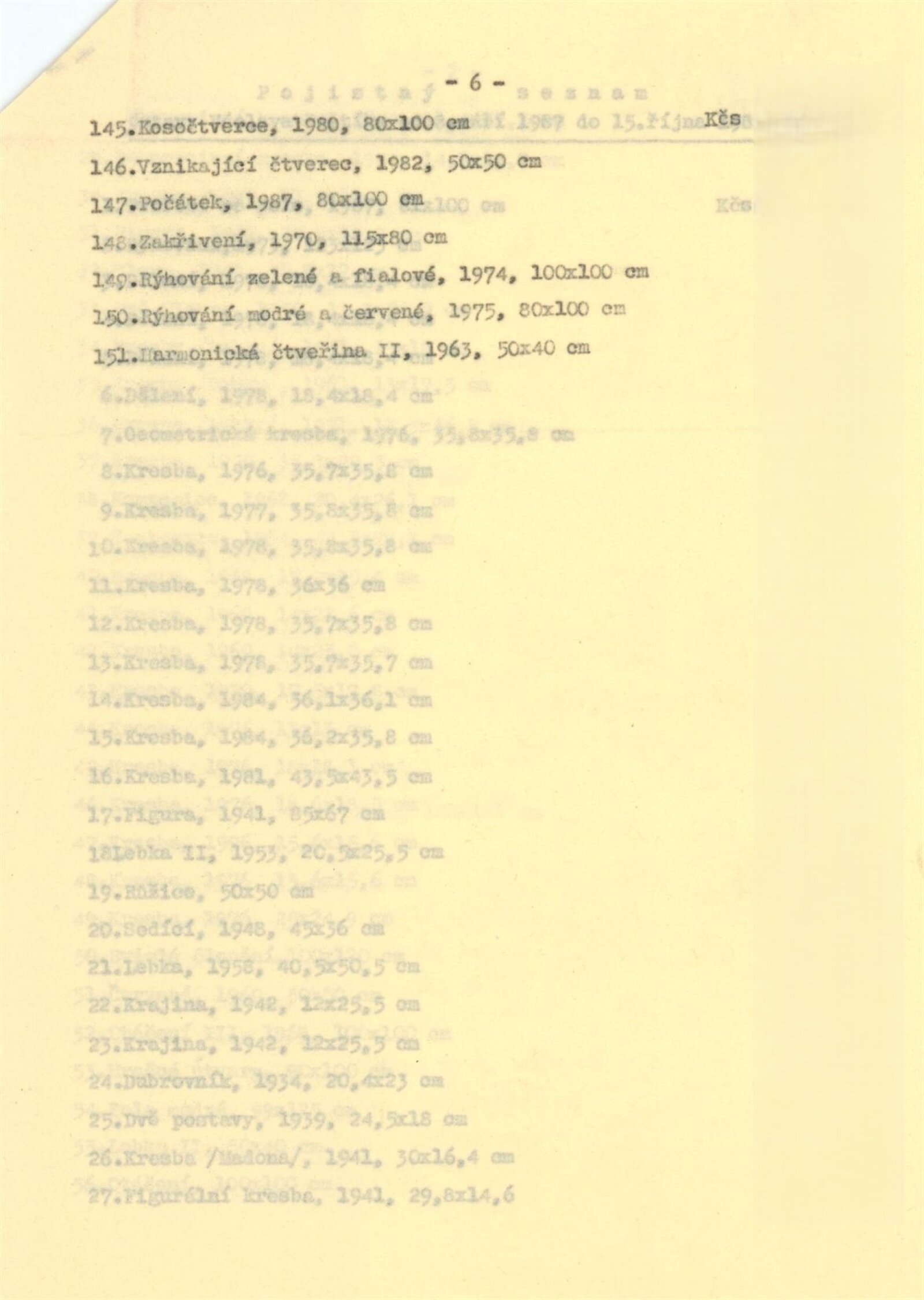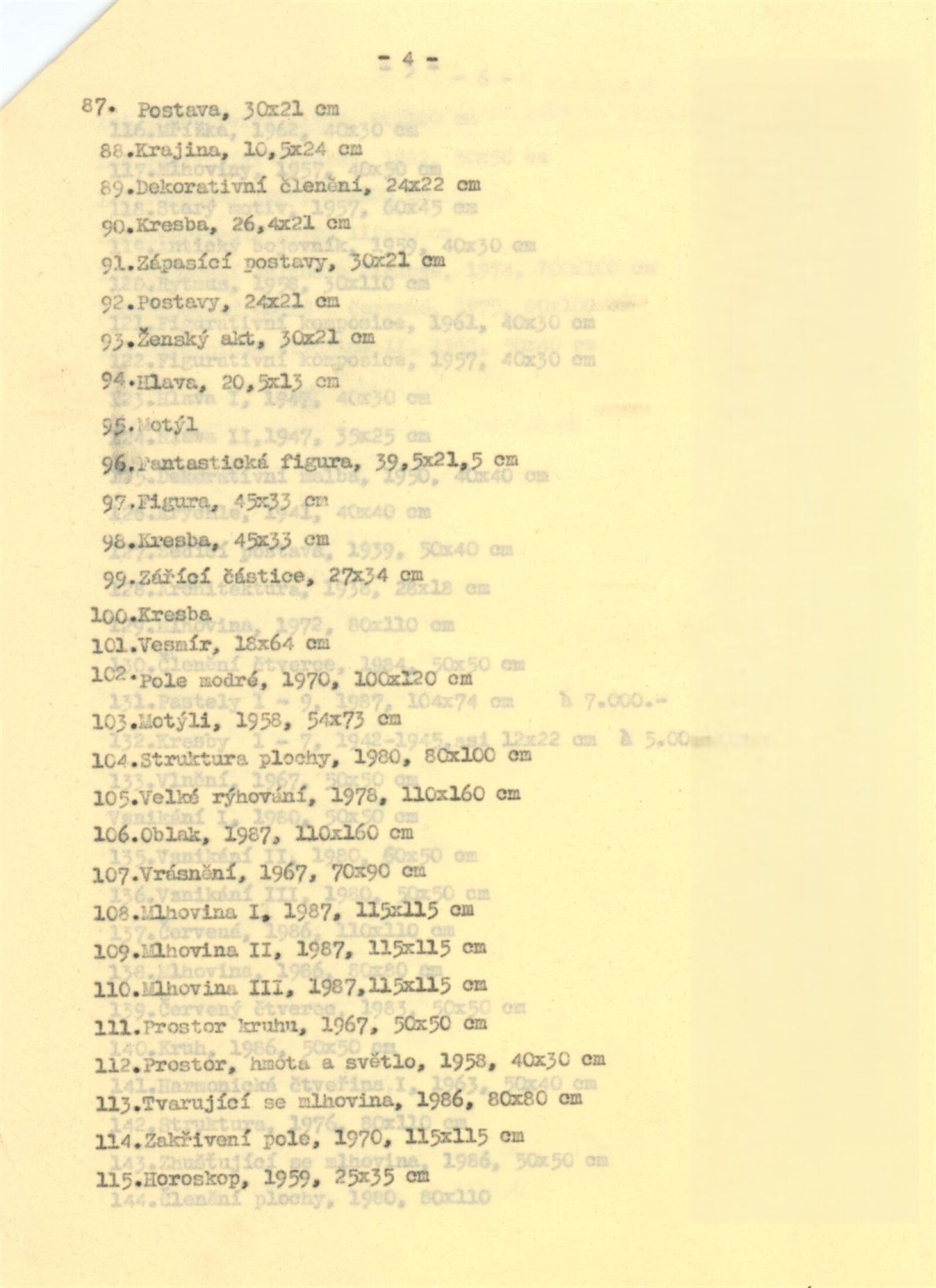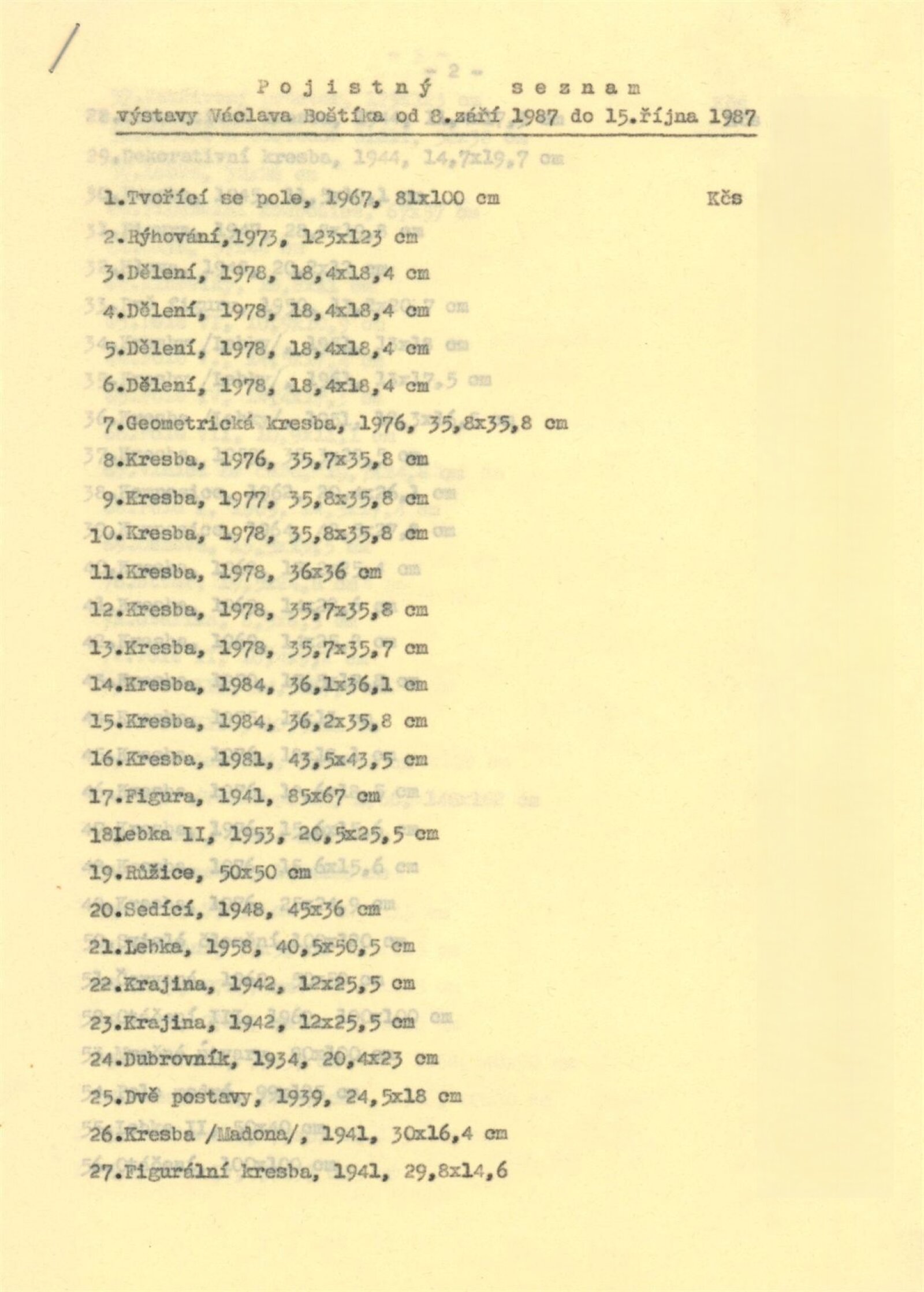 pozvánka, katalog, strojopis, poznámky, fotografie výstavy, seznam vystavených děl, pojistný seznam, provozní korespondence, smlouva o výpůjčce, potvrzení o převzetí, reversy, hospodářská smlouva, žádost o povolení výstavy, recenze v tisku