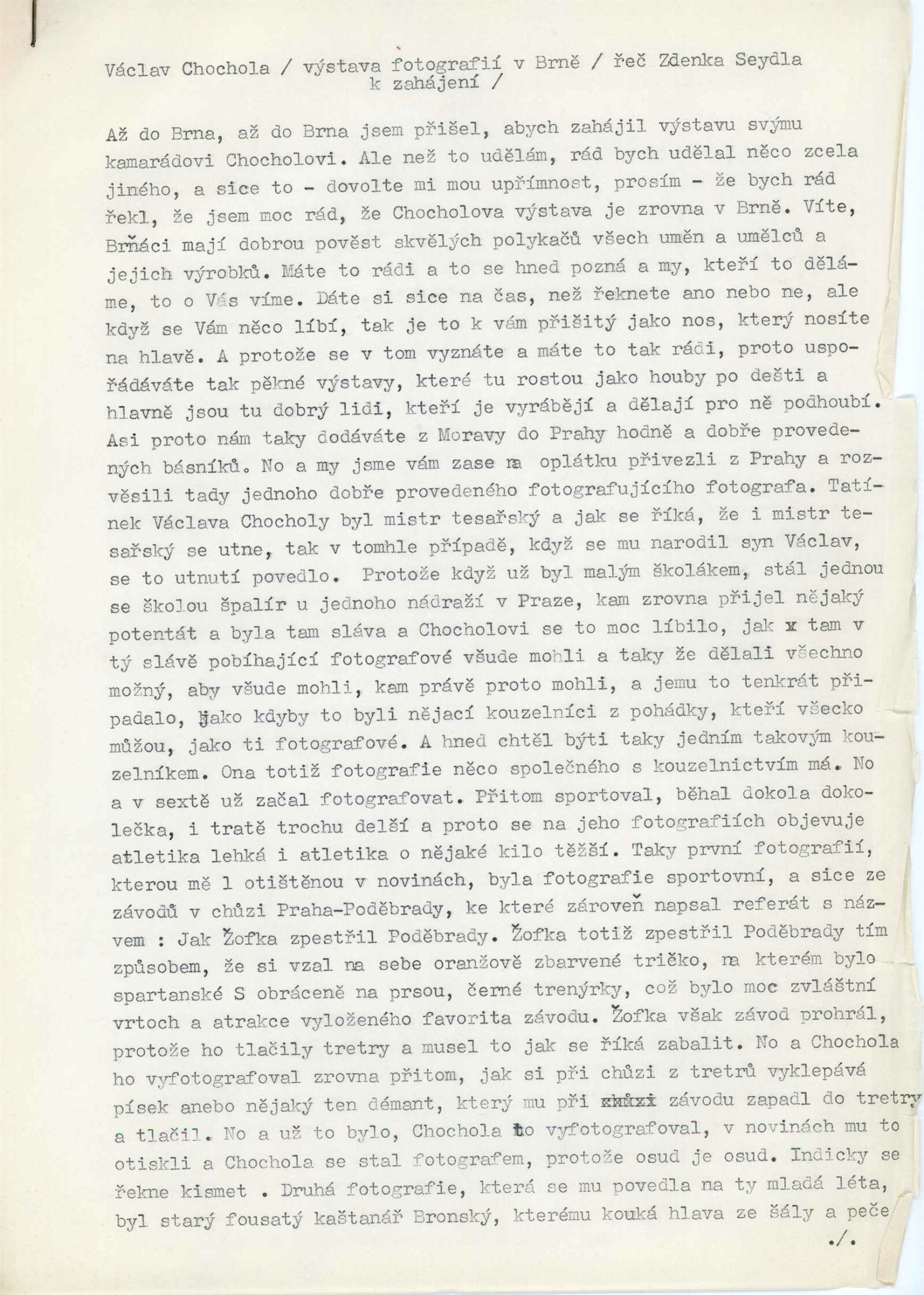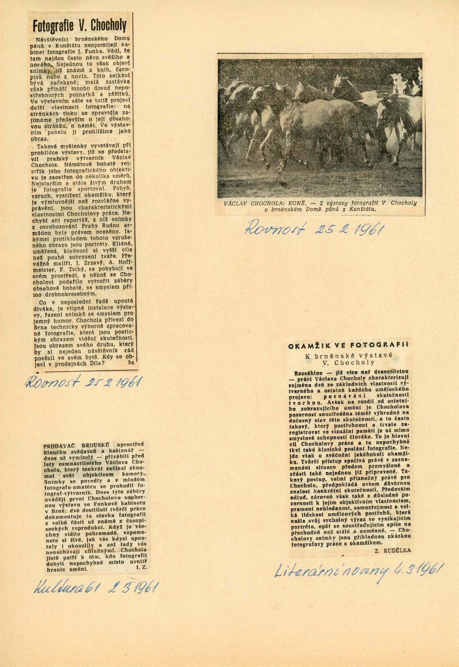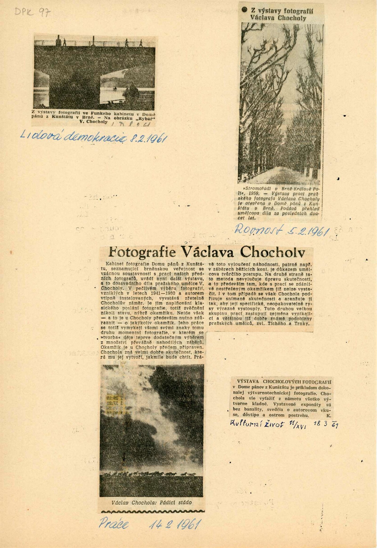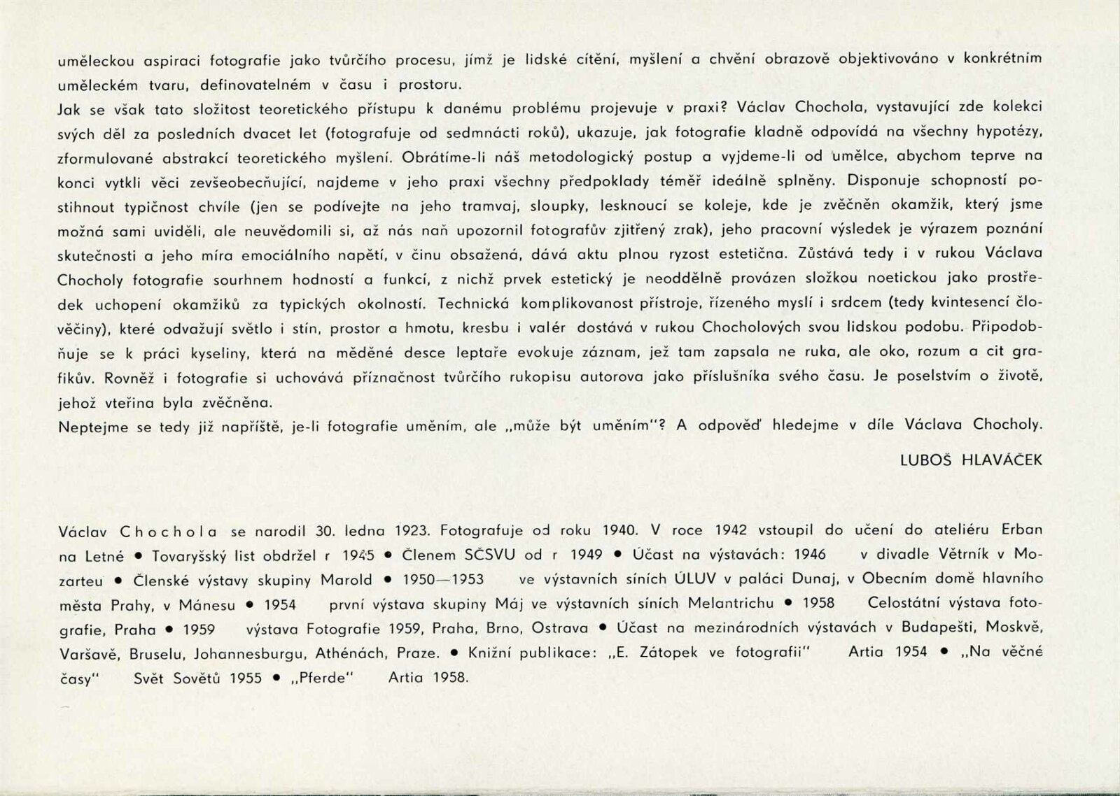 Václav Chochola: Dům umění města Brna / Dům pánů z Kunštátu, 20. výstava Kabinetu fotografie Jaromíra Funka, 2. 2. – 26. 2. 1961 / Text: Luboš Hlaváček. – Brno: DUmB, 1961. – skládačka, 6 s., obr., DPK 97. – MG