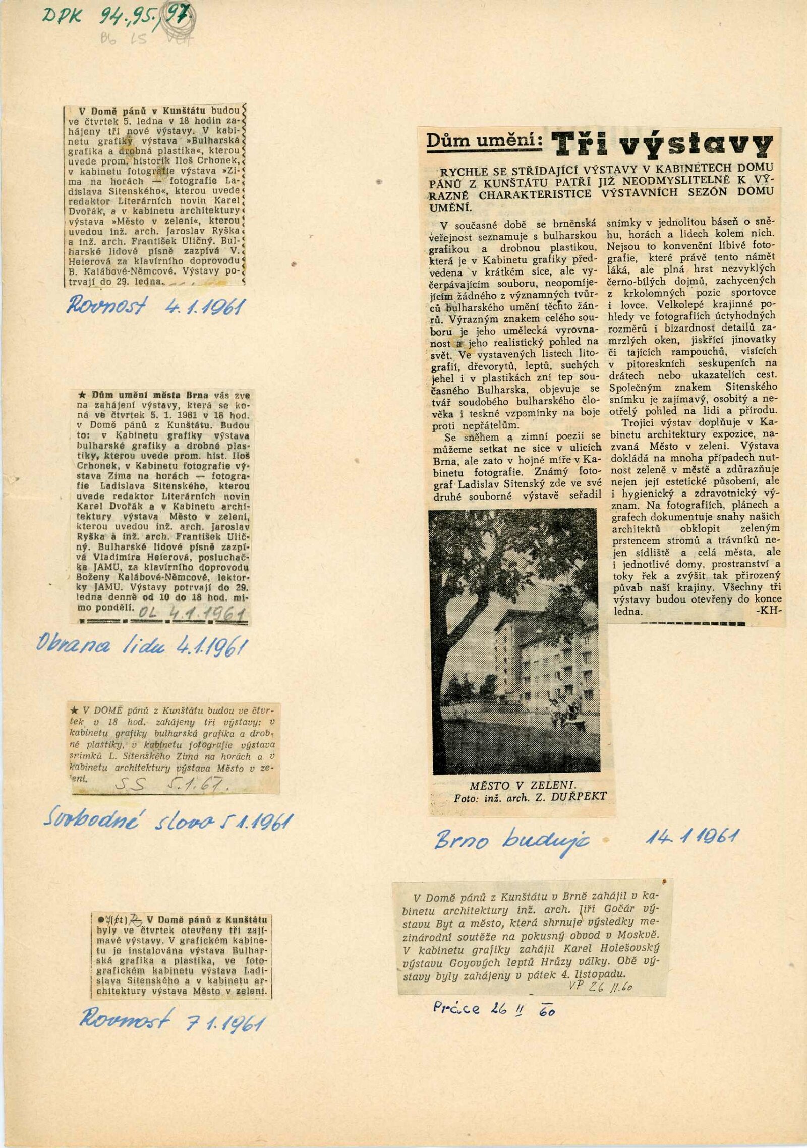 pozvánka, katalog, zahajovací řeč (Zdeněk Seydl), strojopis pozvánky a katalogu, autorova životopisná data, podmínky pro uspořádání výstavy, seznam děl, korespondence (převážně autor s DU), recenze v tisku