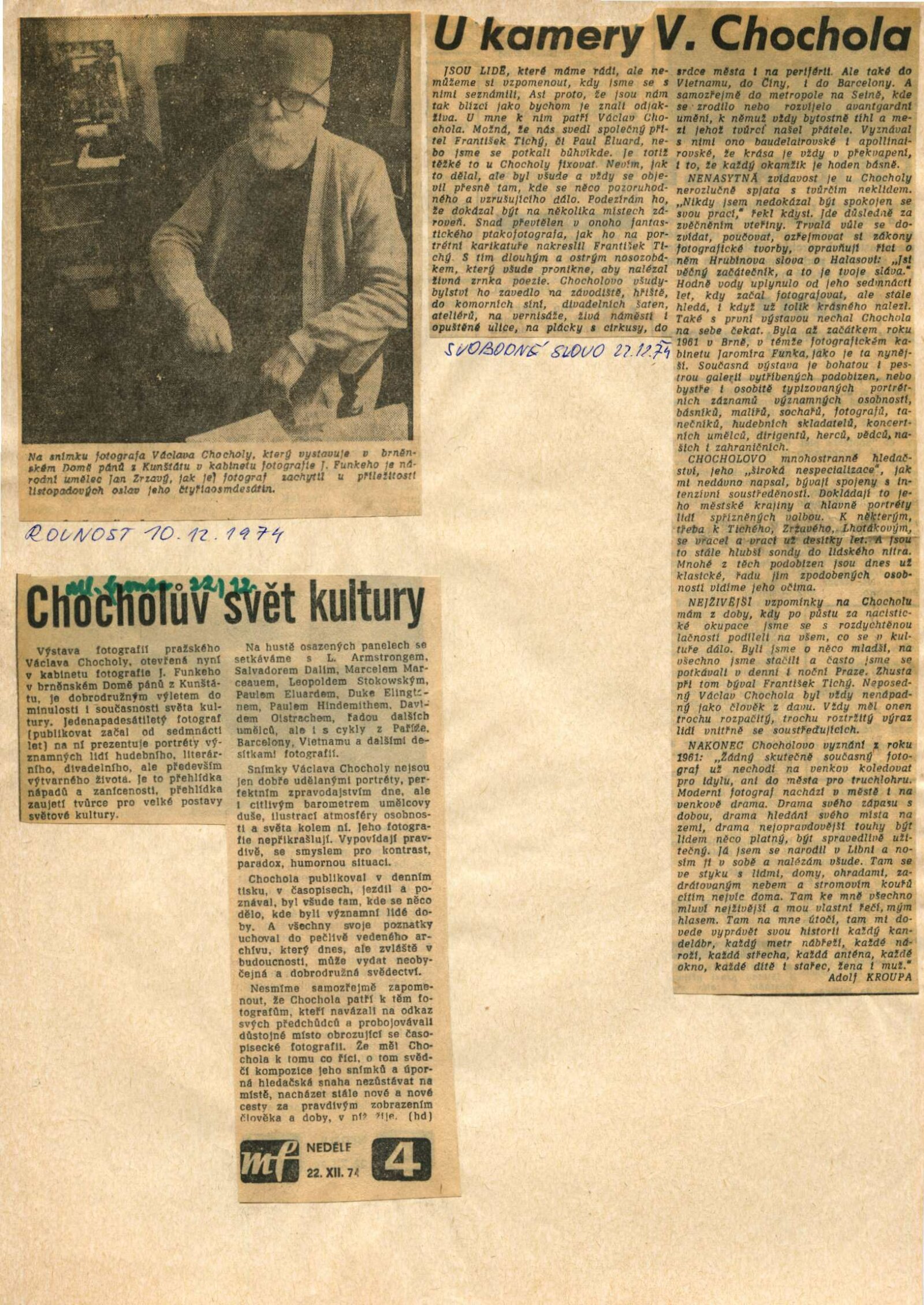 Václav Chochola. Osobnosti, fotografické mozaiky a passiance, fotoarchiv: Dům umění / Dům pánů z Kunštátu, Kabinet fotografie Jaromíra Funka, prosinec 1974 / Text: Antonín Dufek. – Brno: DUmB, 1974. – 16 s., obr., seznam portrétovaných 2 s., životní data, výstavy, DPK 584a. – MZK