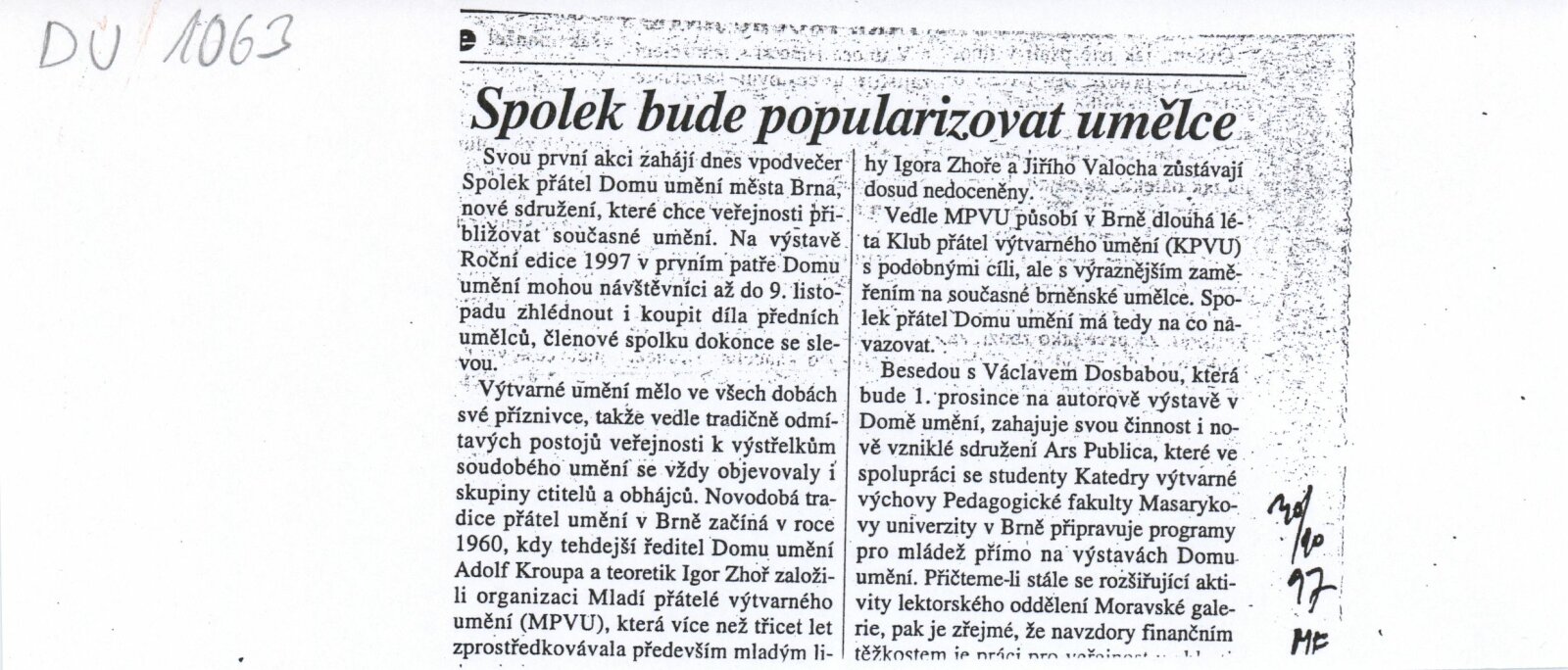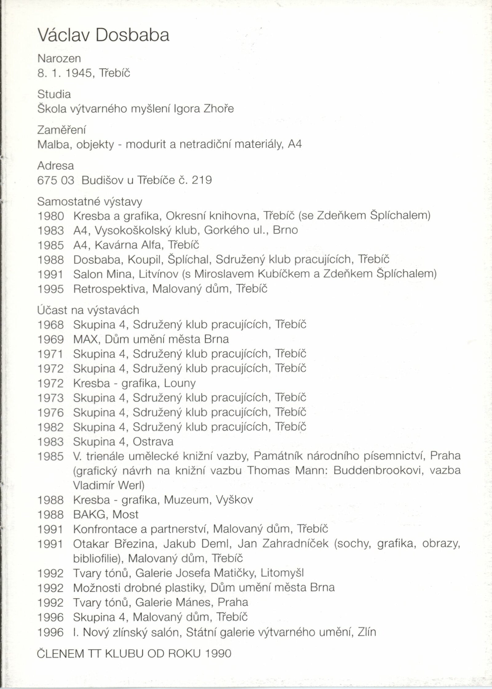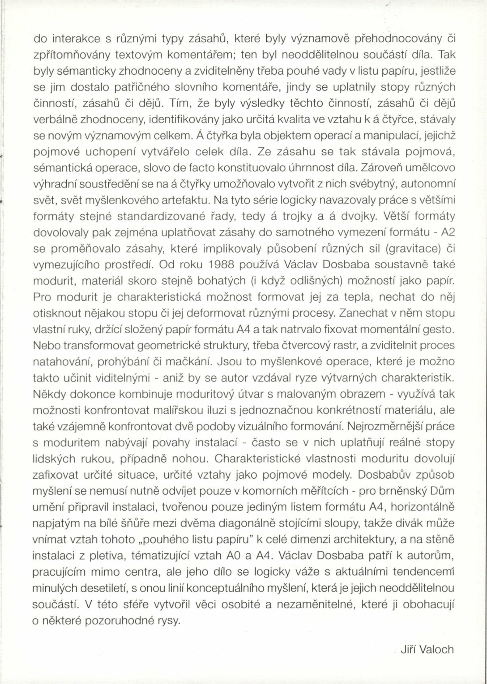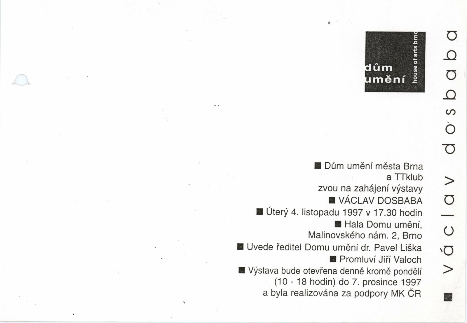 Václav Dosbaba: Dům umění města Brna, hala, 4. 11. – 7. 12. 1997 / Text: Jiří Valoch. – Brno: DUmB, 1997. – [8] s., obr., životní data, výstavy, DU 1063