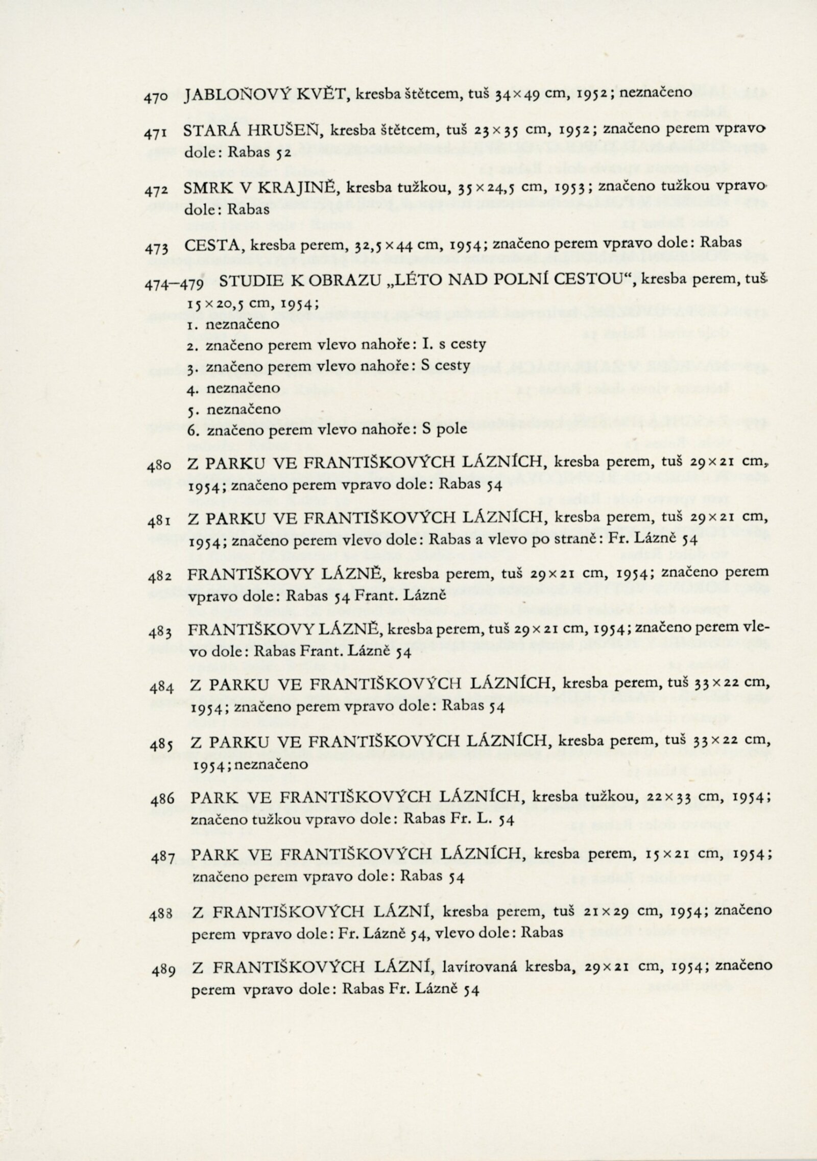 Václav Rabas: Dům umění, 13. 12. 1956 – 20. 1. 1957 / Převzatý katalog. Národní umělec Václav Rabas. Soubor díla. 1885–1954: Jízdárna Pražského hradu, 1956 / Text: Jiří Kotalík. – Praha: SČSVU, 1956. – 45 s., 32 s. obr. příl., báseň Josef Hora, lyrický text Václav Rabas, DU 270. – MZK; MG
